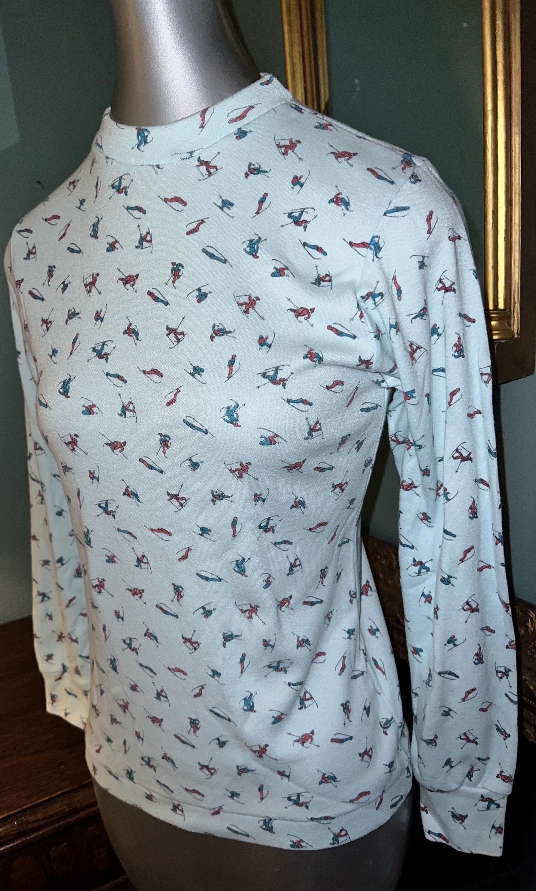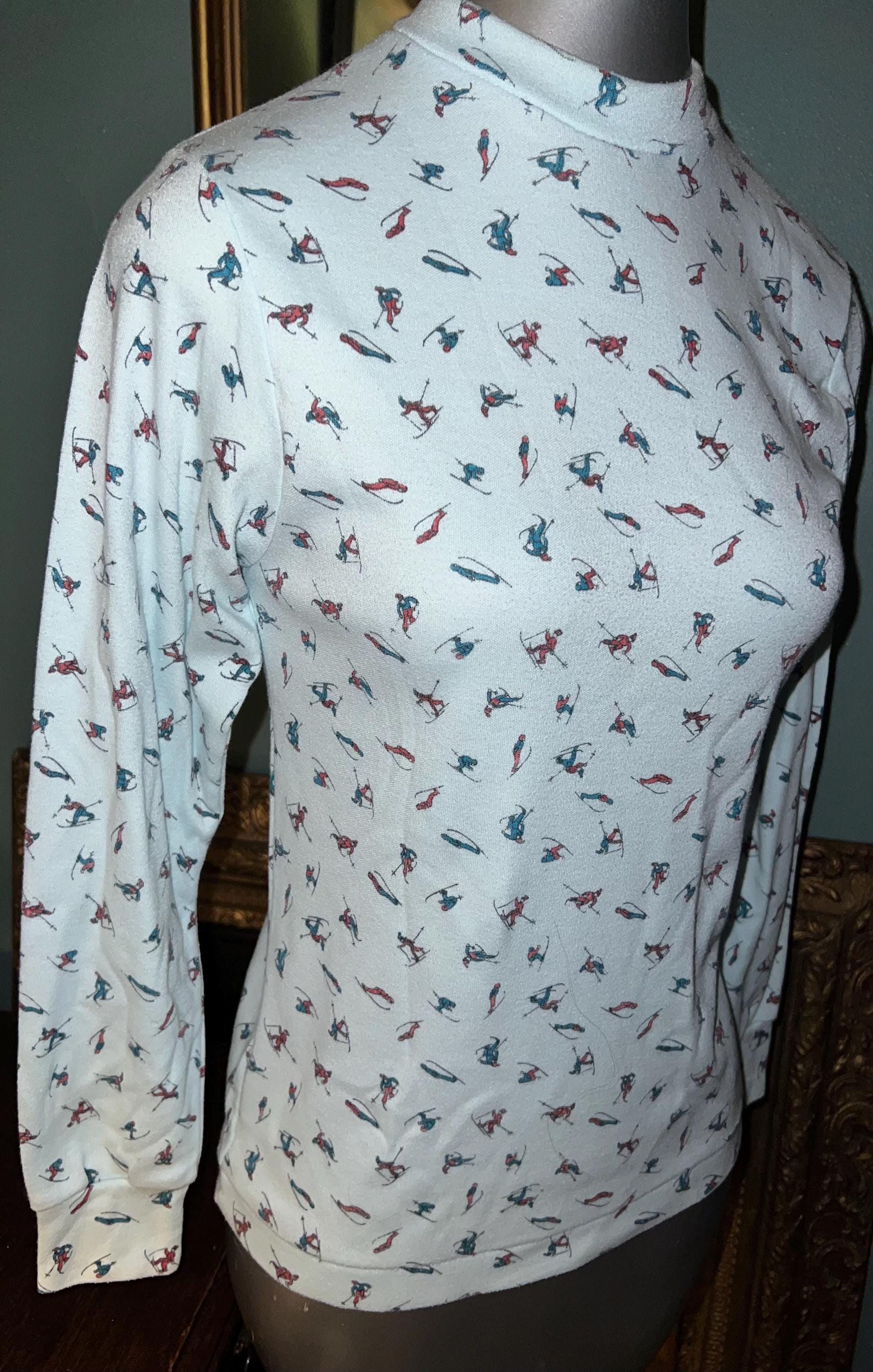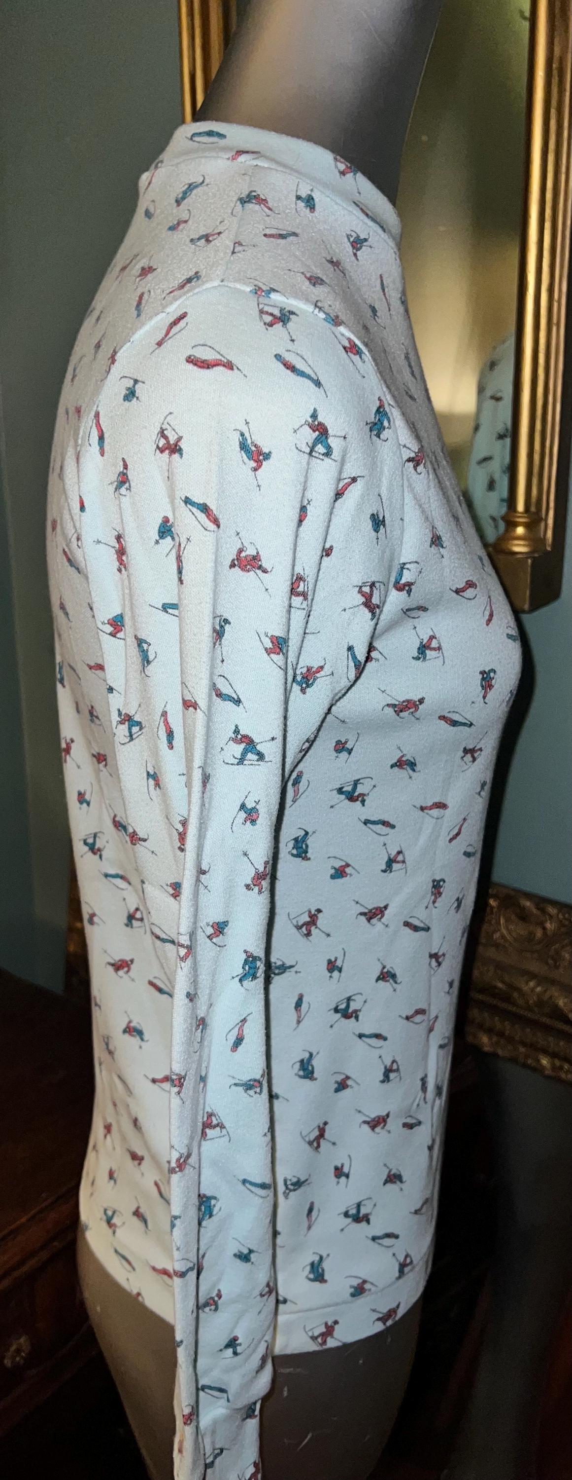 This is a very cute 70’s or 80’s shirt. I love the little skiers, in all sorts of ski poses, even falling! It’s got a little kneading of the material on the shirt but that’s just indicative of it’s age. Other than that it’s in good vintage condition.
