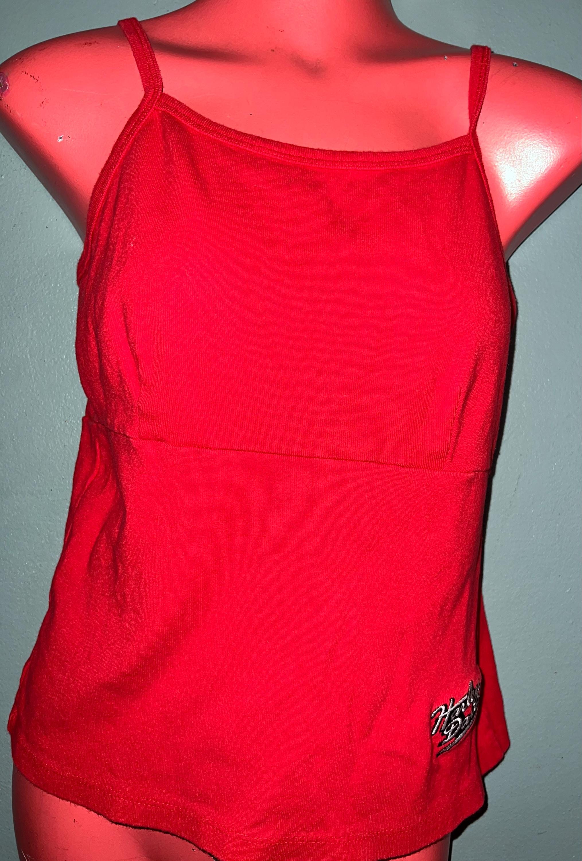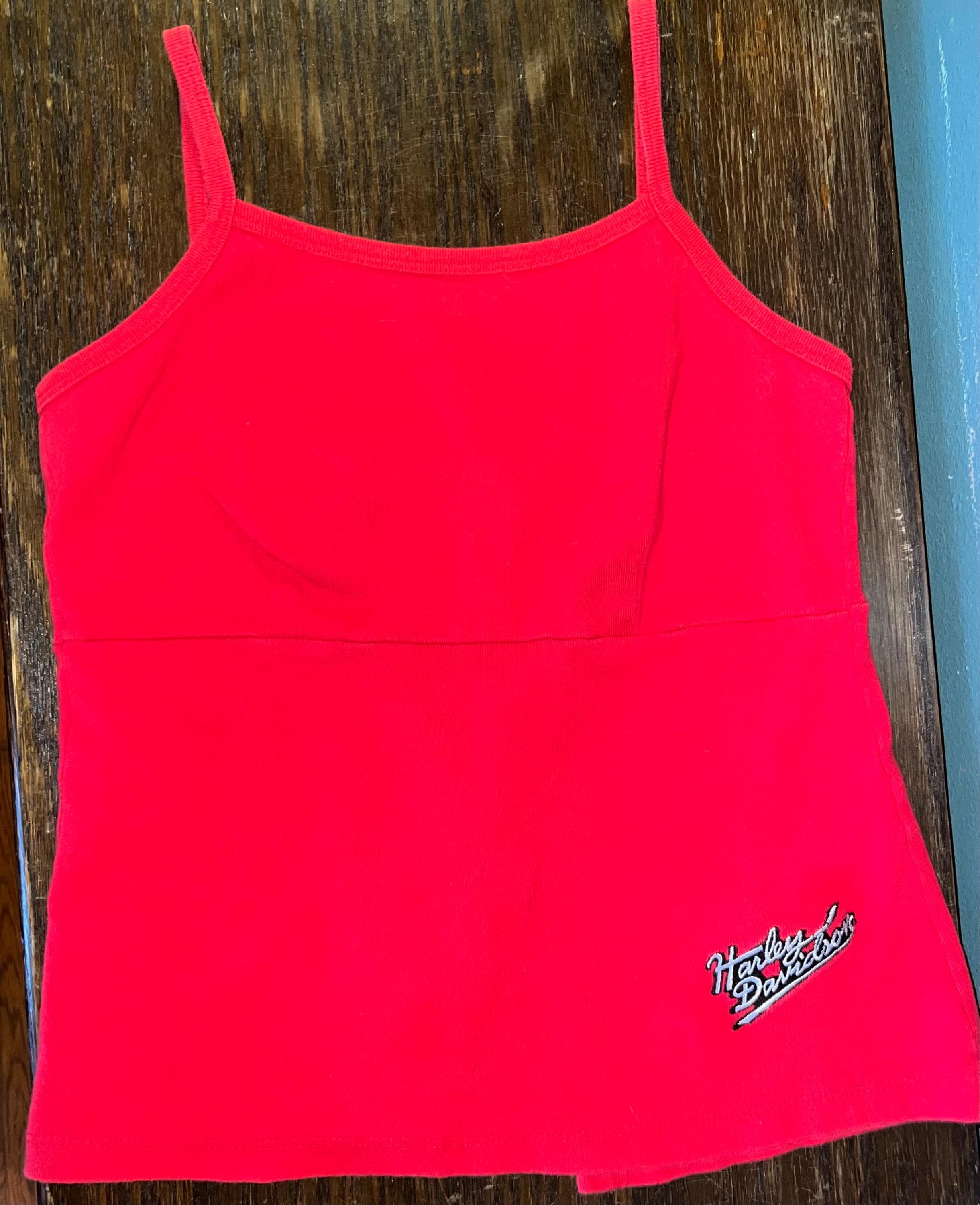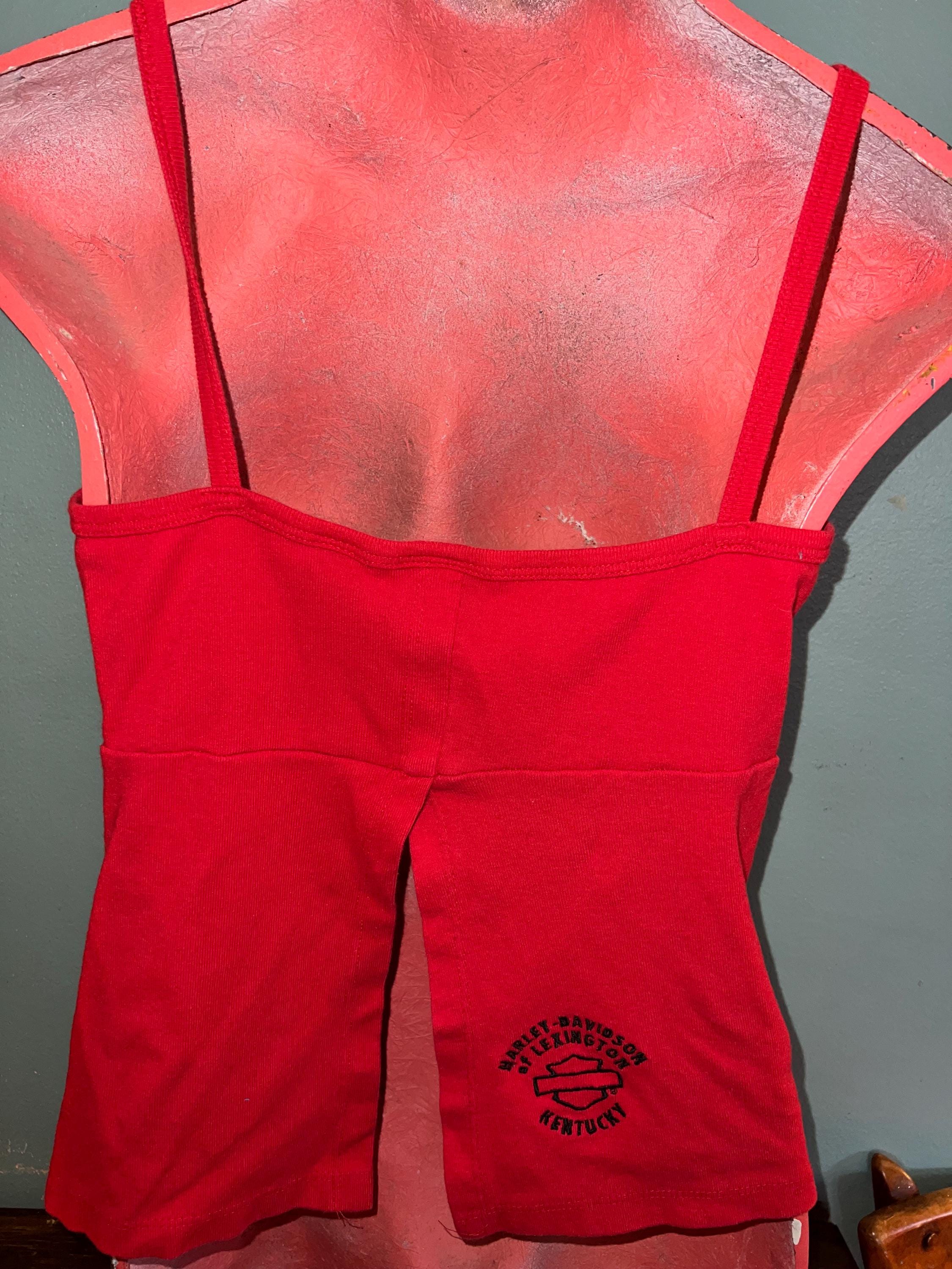 A super cute Harley Davidson red tank top from the Lexington, Kentucky Harley store. The back is split down the center so it’s open. It’s in good vintage condition.
