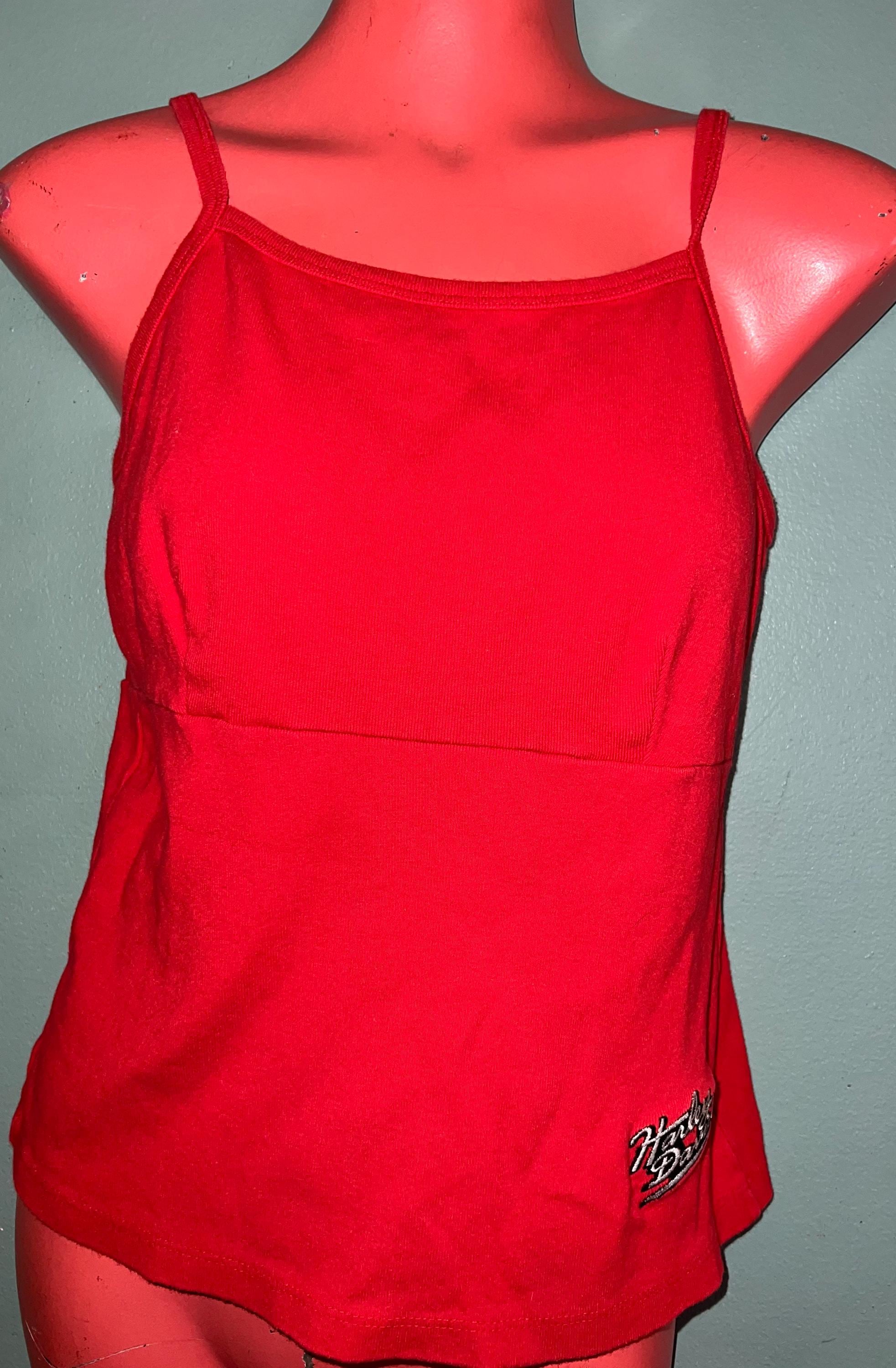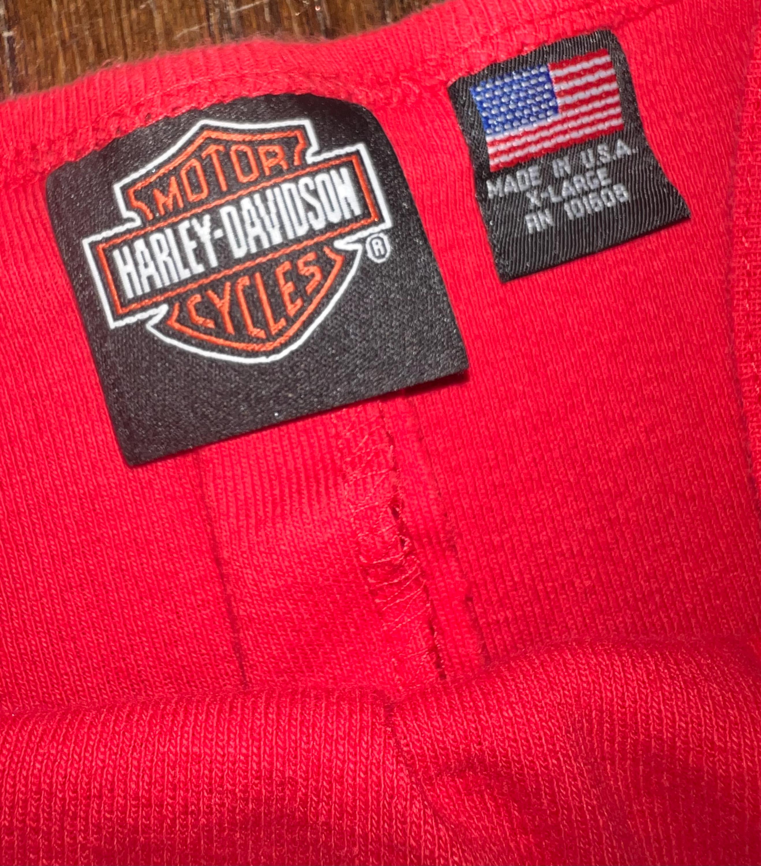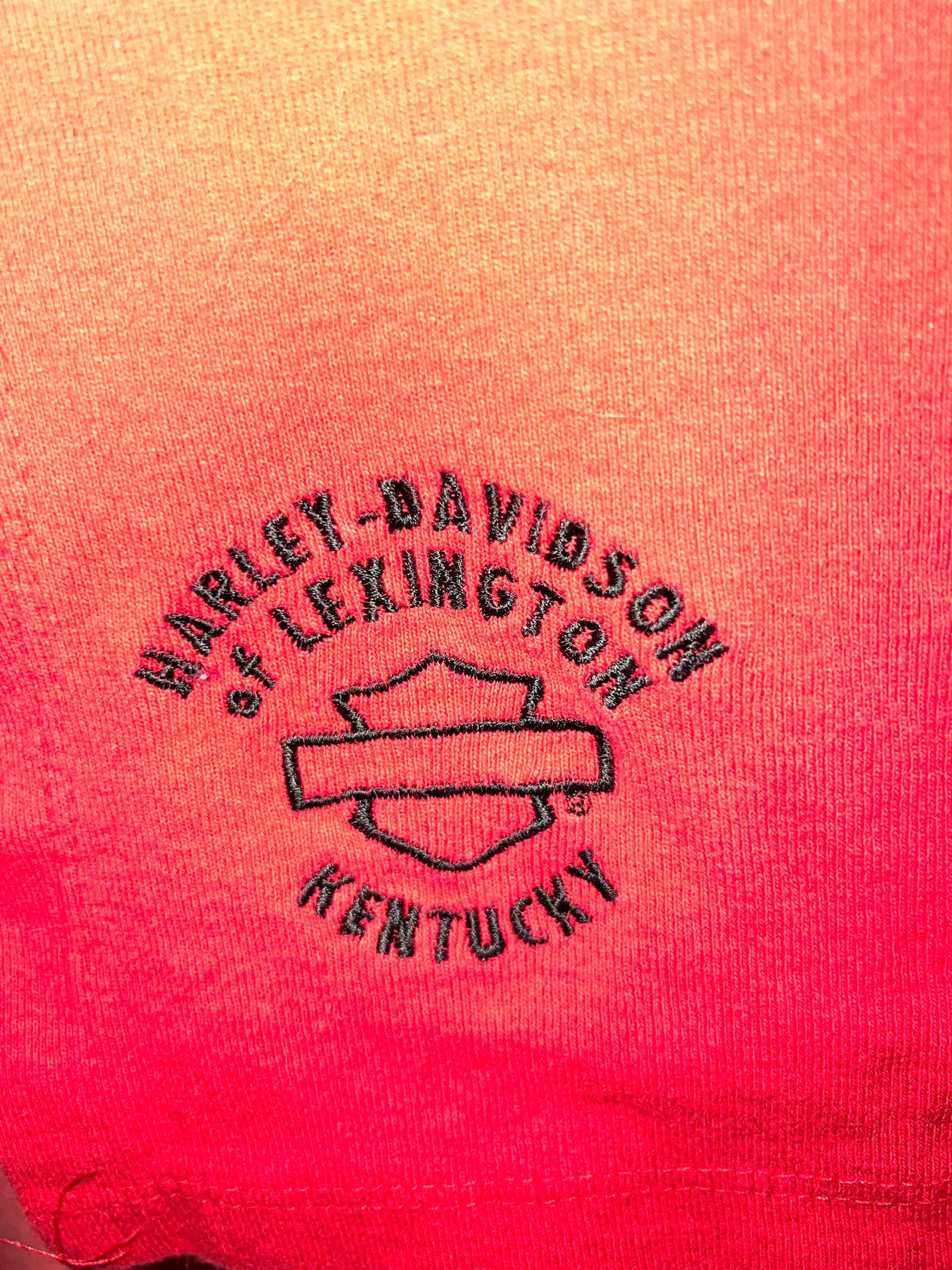 A super cute Harley Davidson red tank top from the Lexington, Kentucky Harley store. The back is split down the center so it’s open. It’s in good vintage condition.