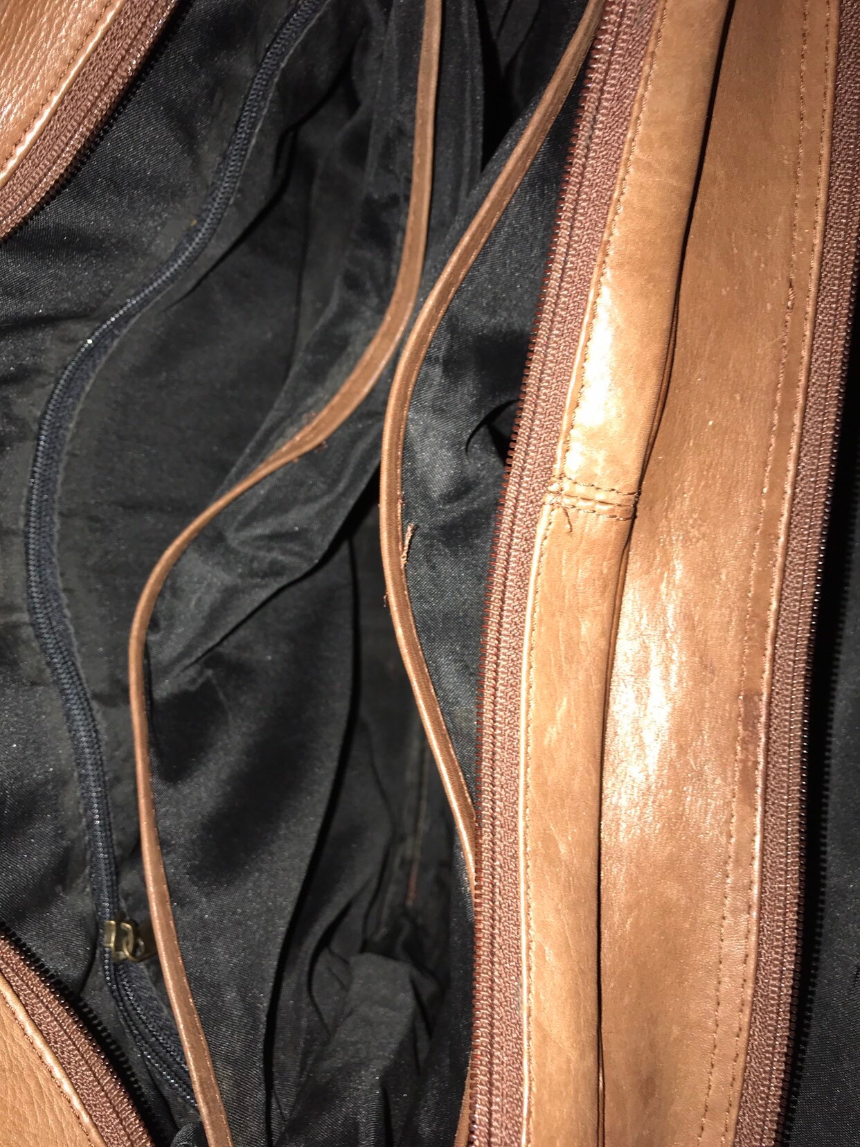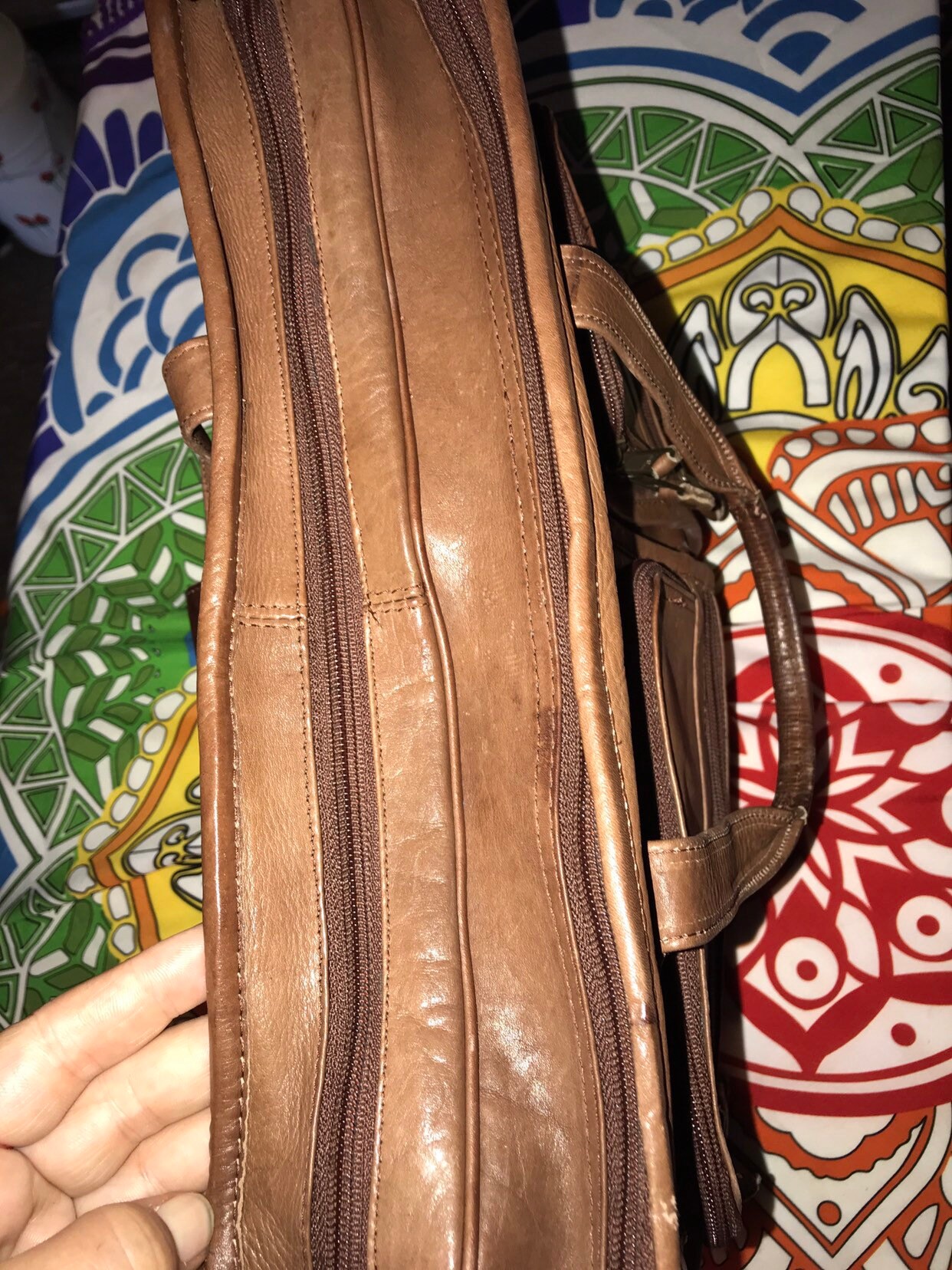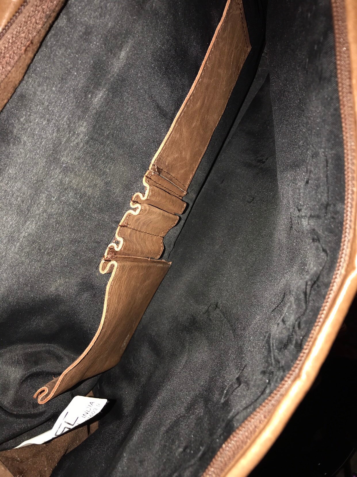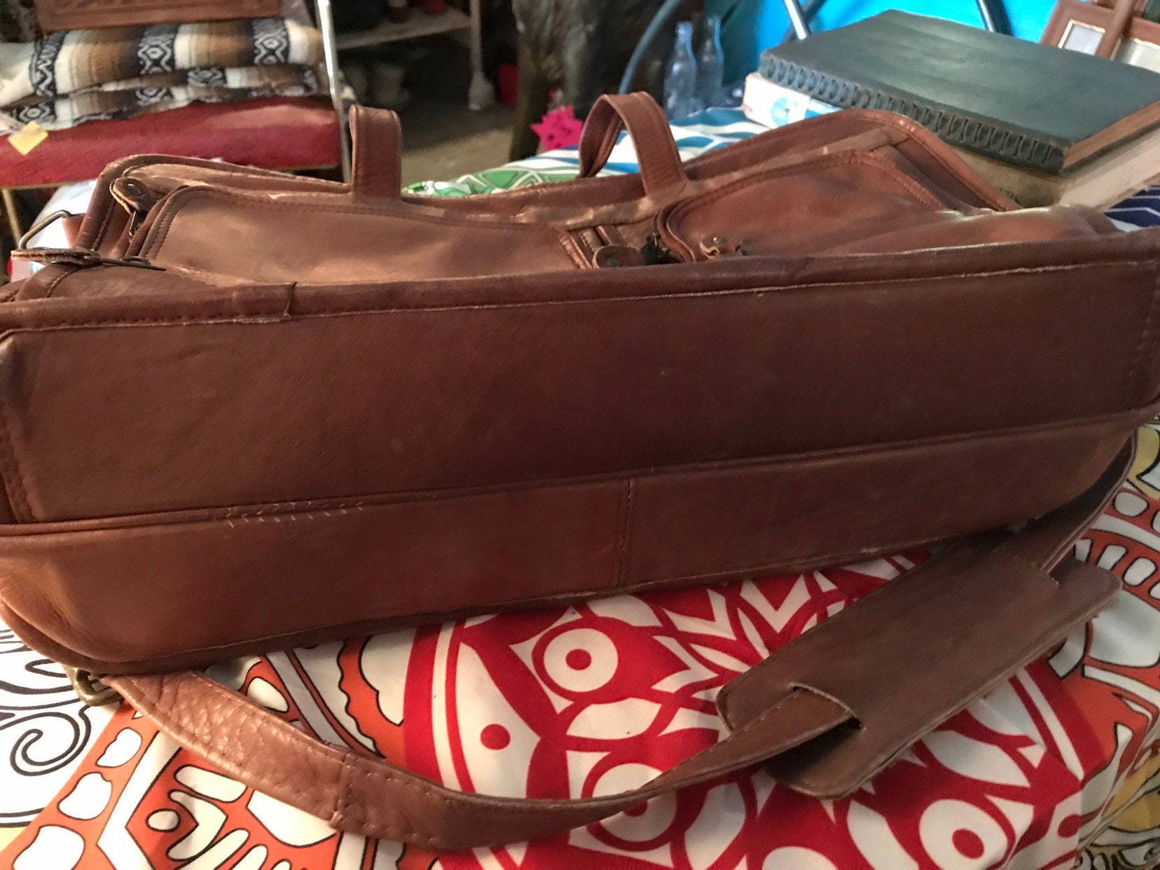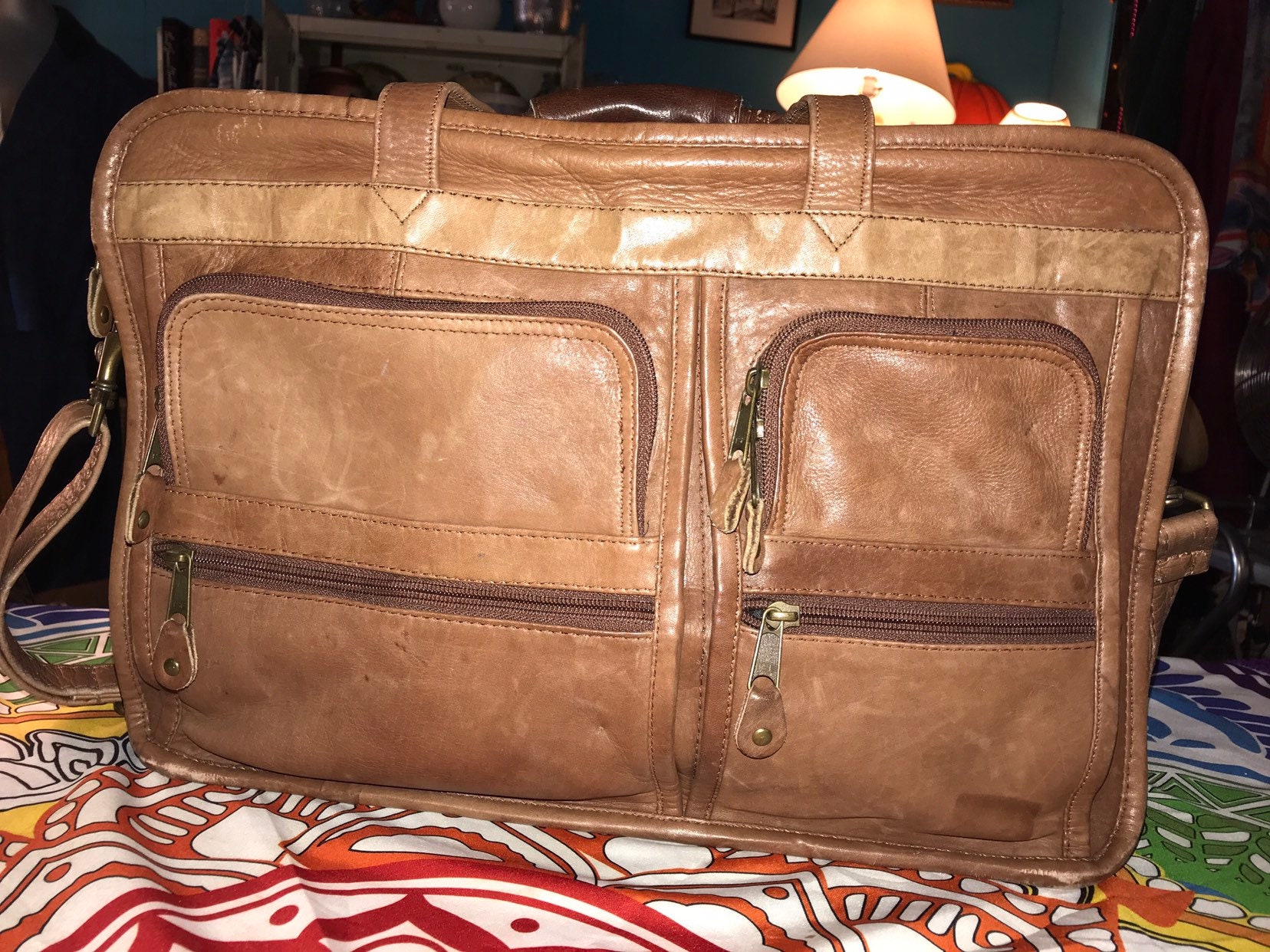 This is a well loved, much loved soft leather satchel probably from the 90s. It is definitely distressed and the leather has become so soft with age. It has a few compartments inside and places for pens and things as well as outside zippered pockets.
