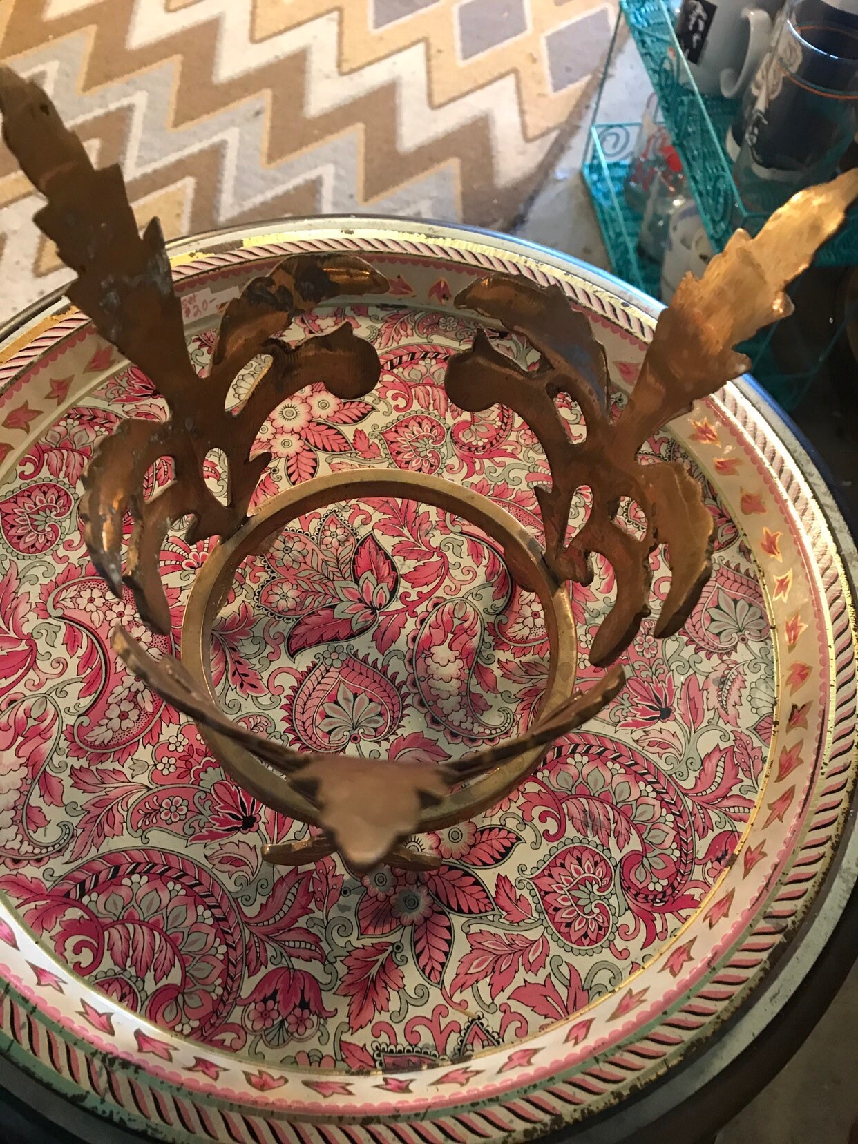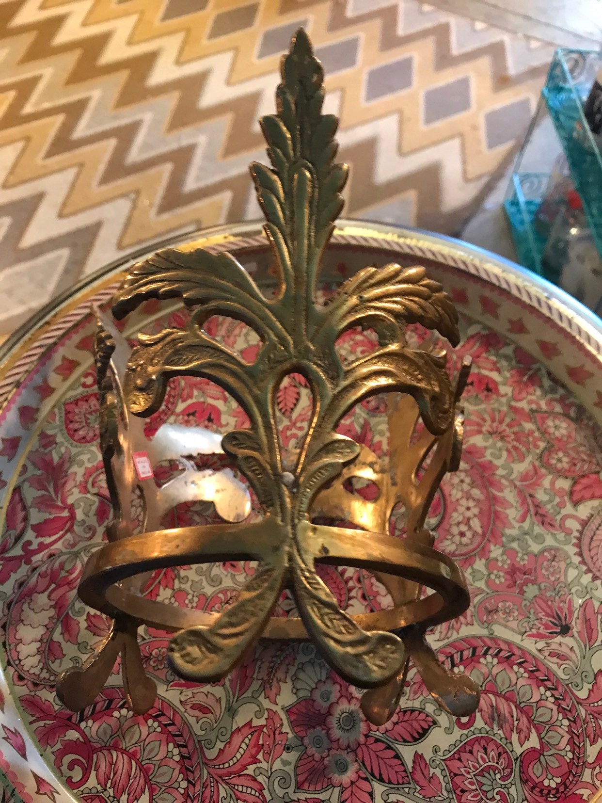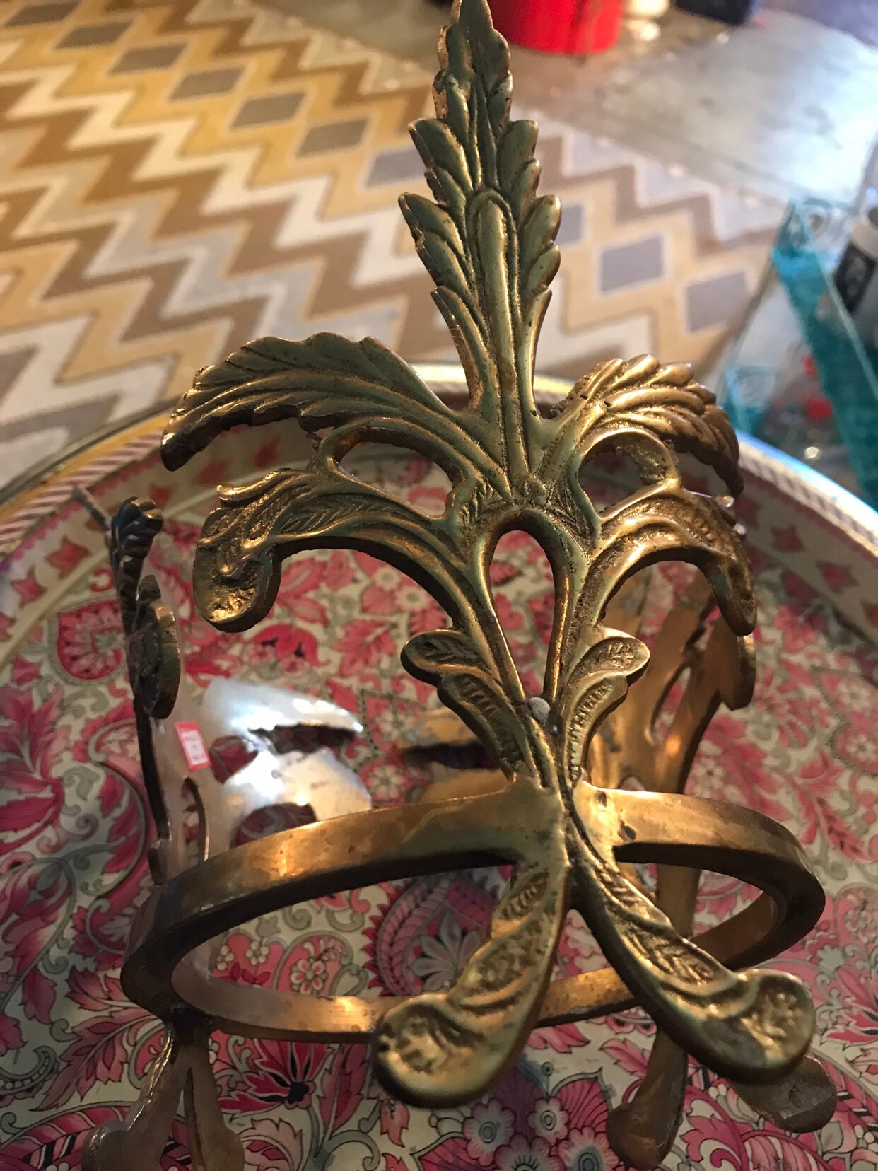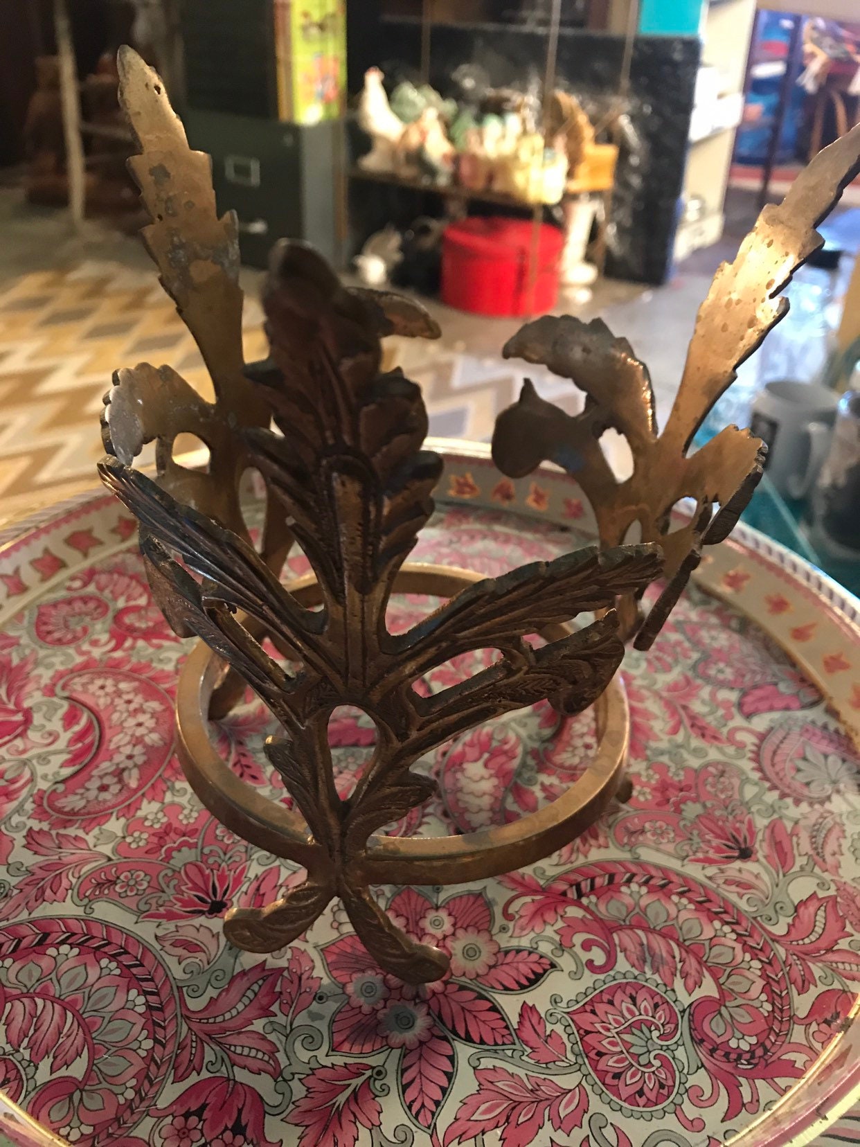 This is a very pretty intricate flowers and feather brass stand. Which can hold a gazing ball or a small crystal ball, or whatever else. The stand has a great design of feathers and flowers and would be gorgeous shined to a brilliant gold. It’s in good vintage condition.