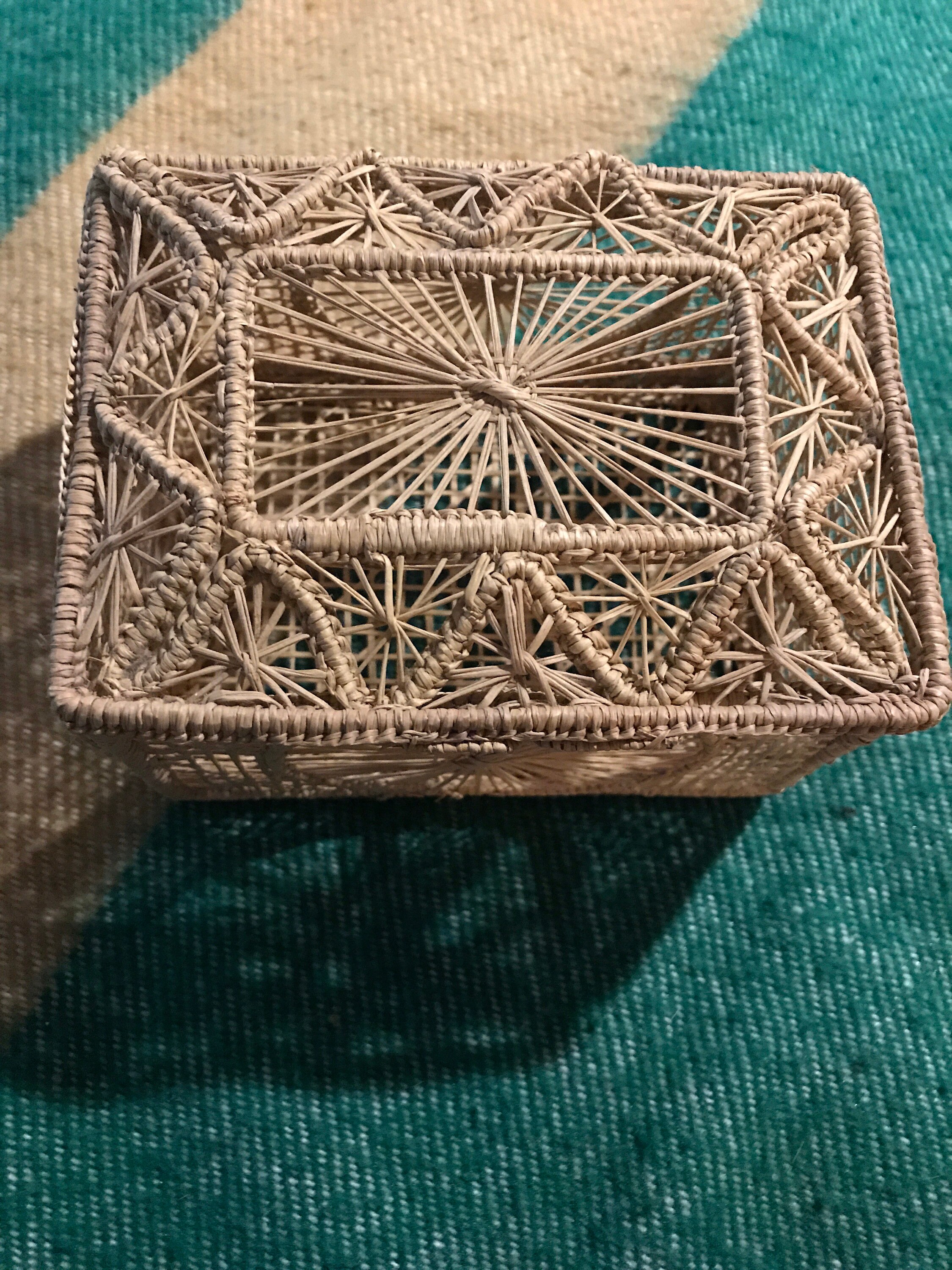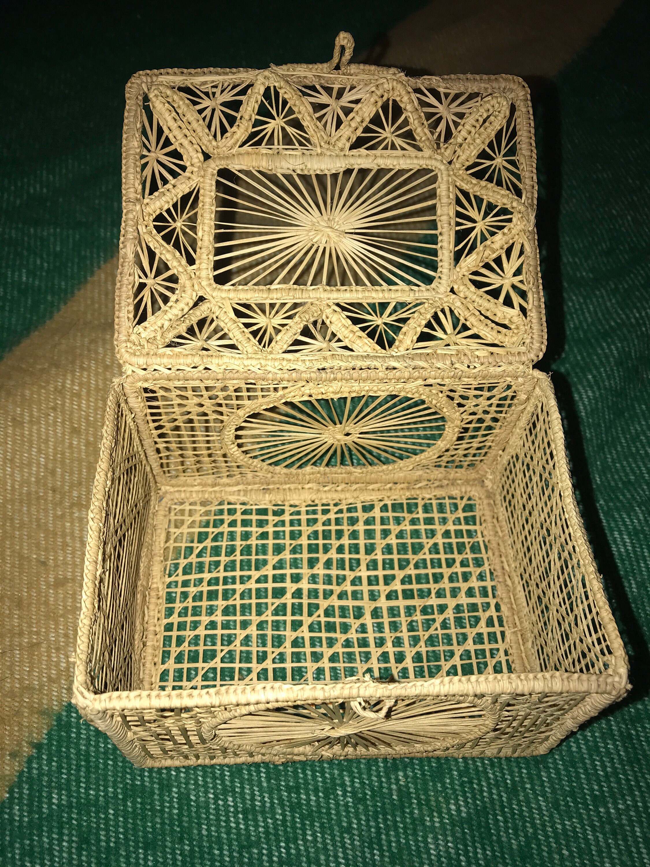This is a small rectangular shaped woven basket with hinged lid. It’s in good vintage condition.
