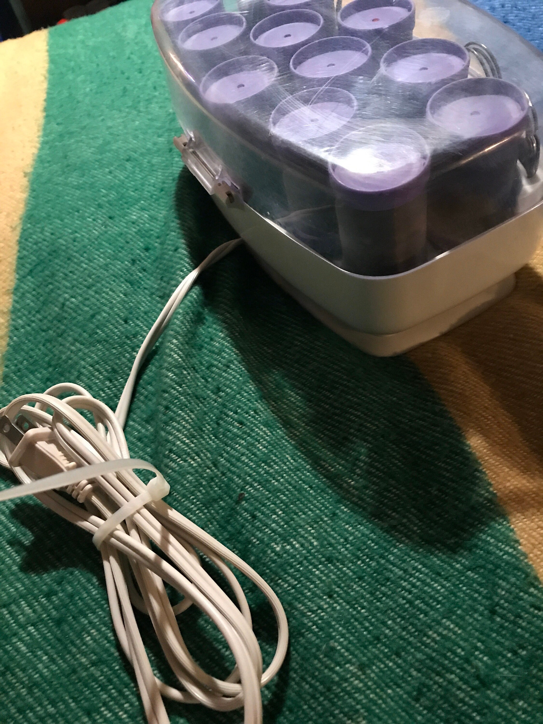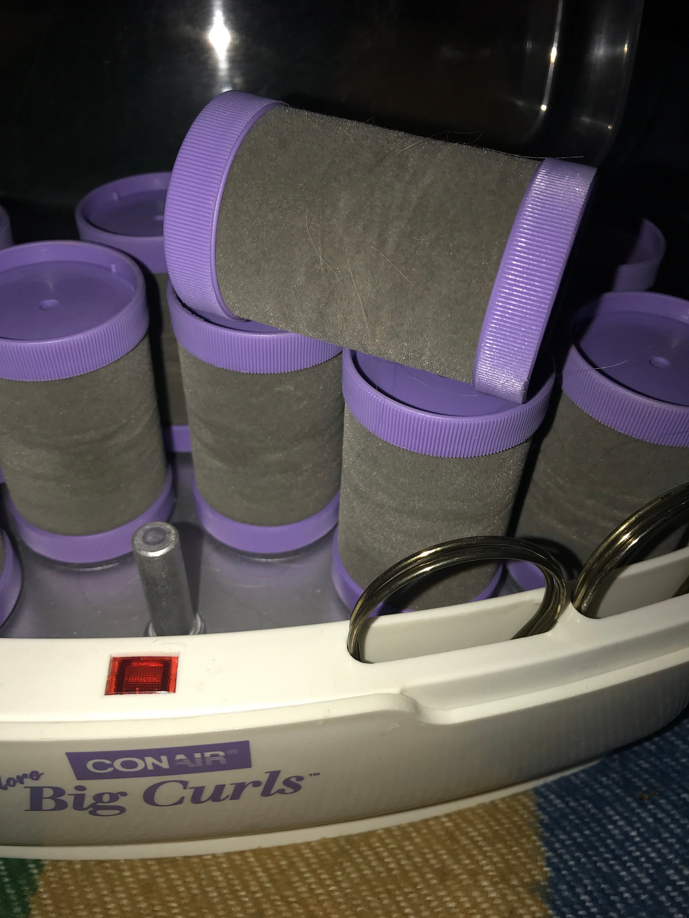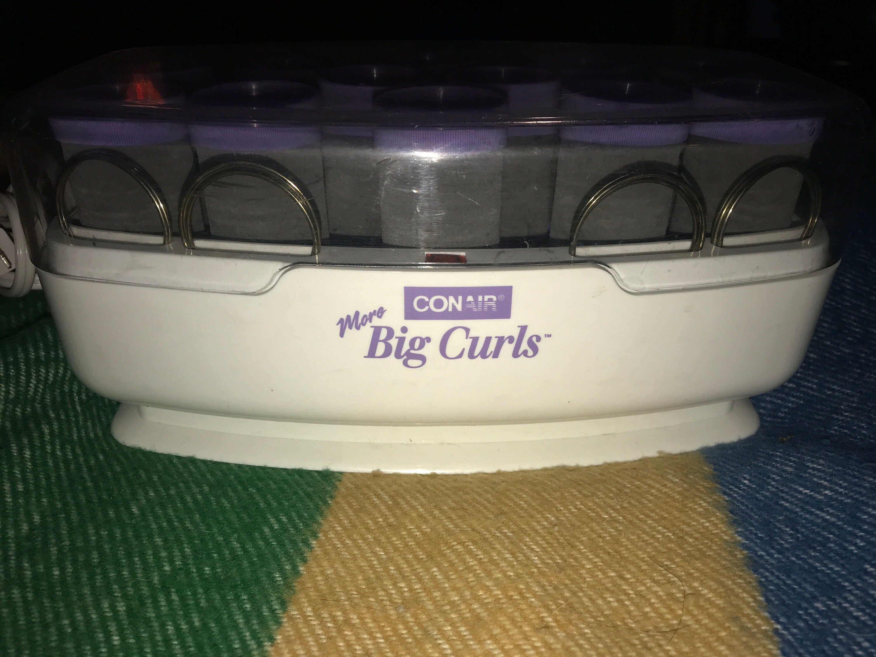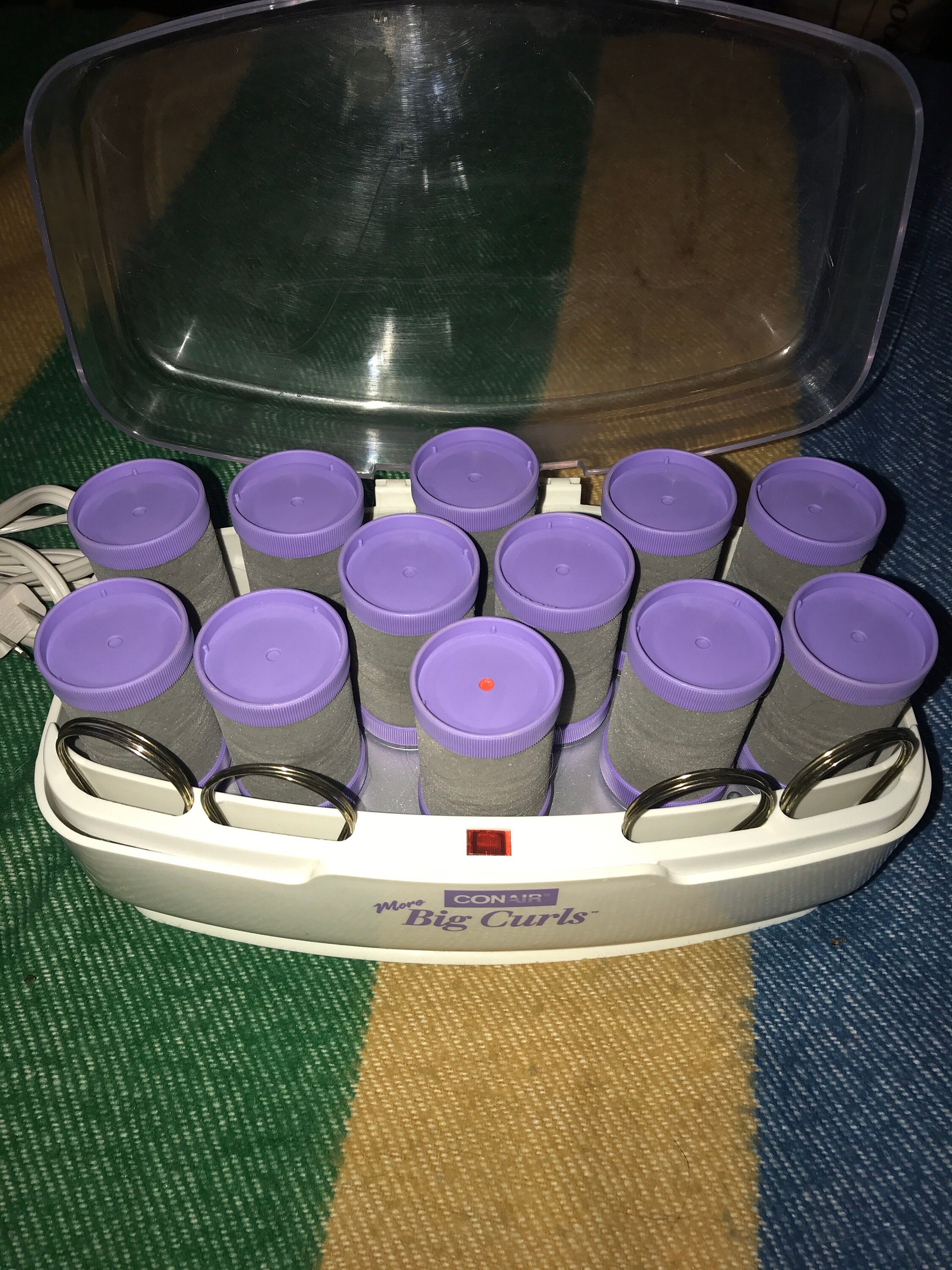 Nice! Early 90’a Conair More Big Curls set of hot rollers for your hair! These rock, there’s twelve to the set with 12 clips. They are all one size “Big Curls”. These are in good vintage condition.