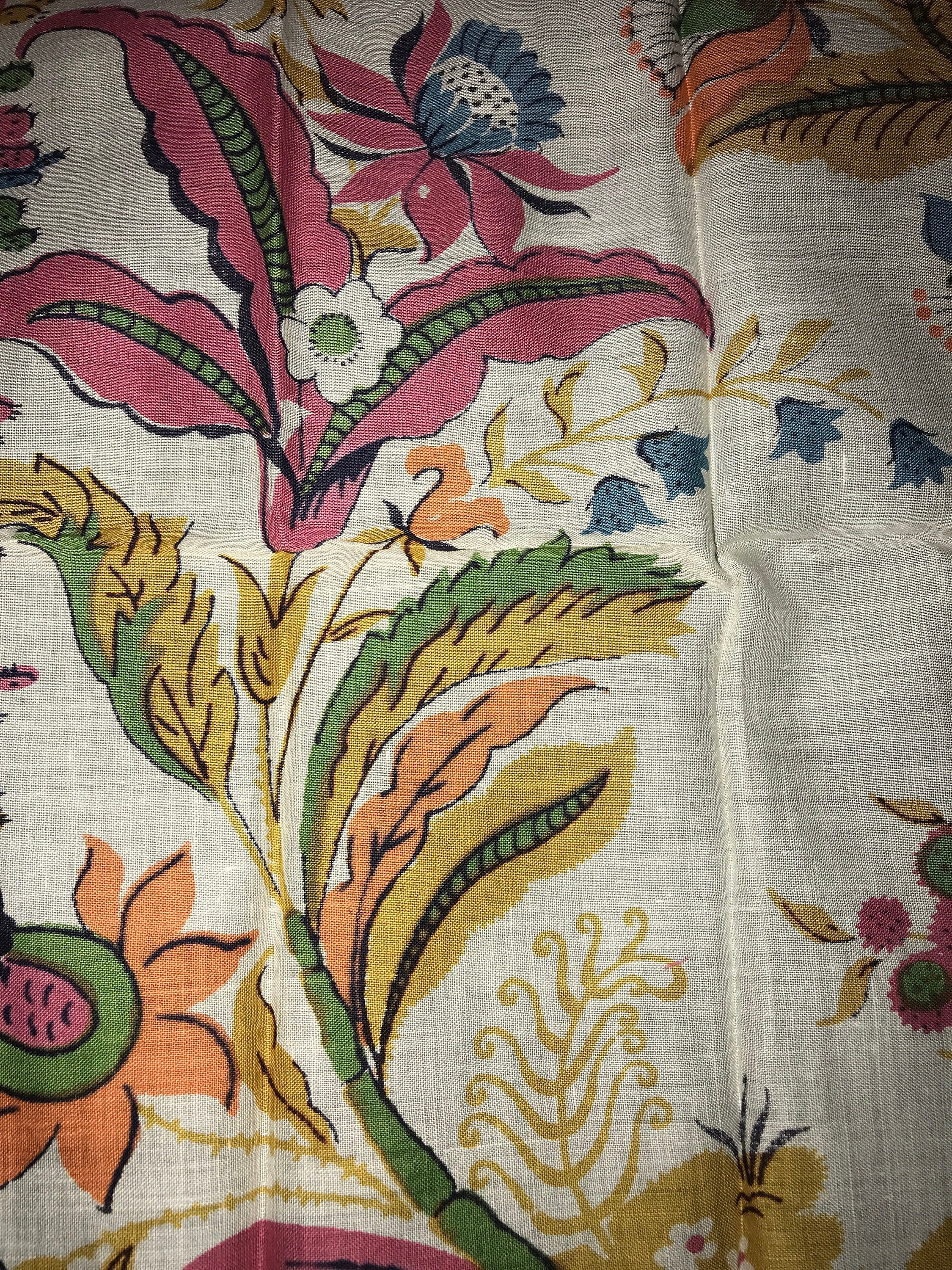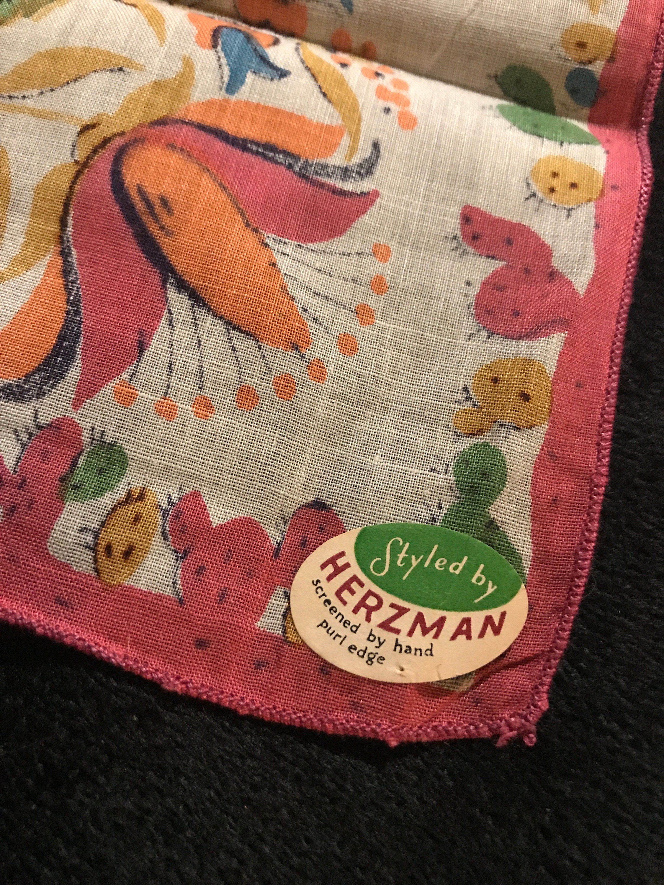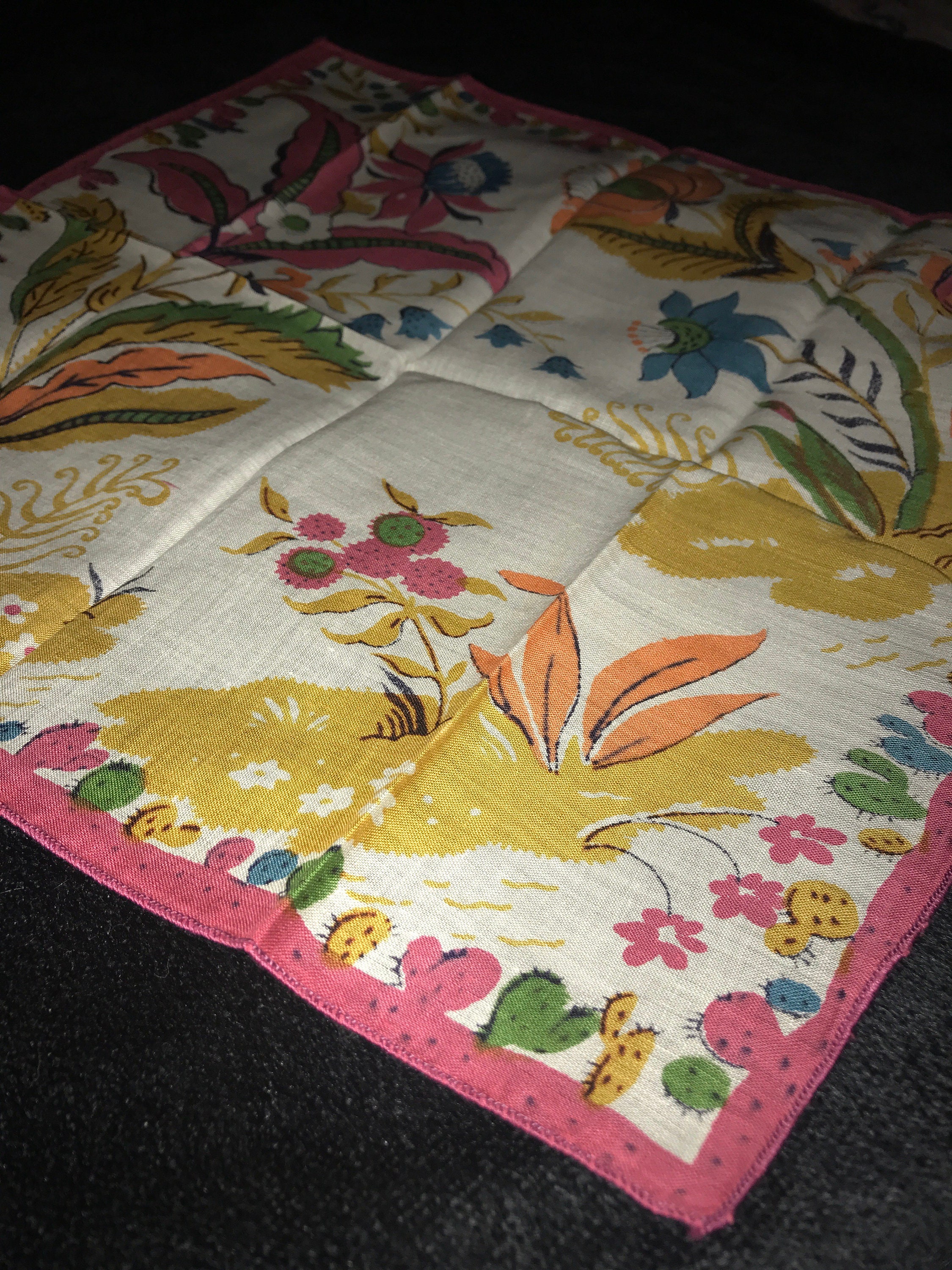 Gorgeous 1950's Hand screened and rolled Herzman handkerchief! This is so very pretty, the flowers and cacti are so cool! And in great vintage condition with sticker tag still attached.