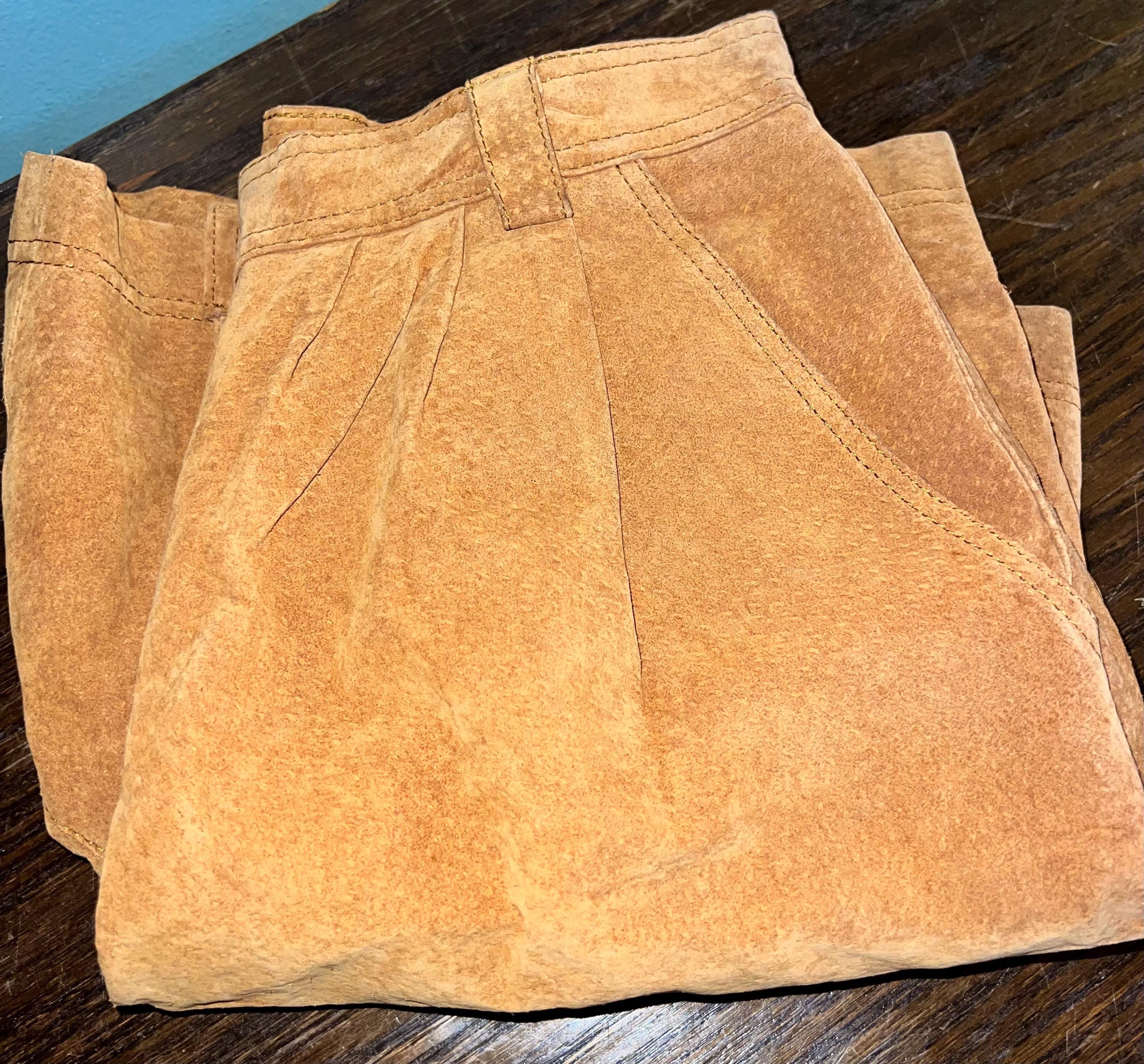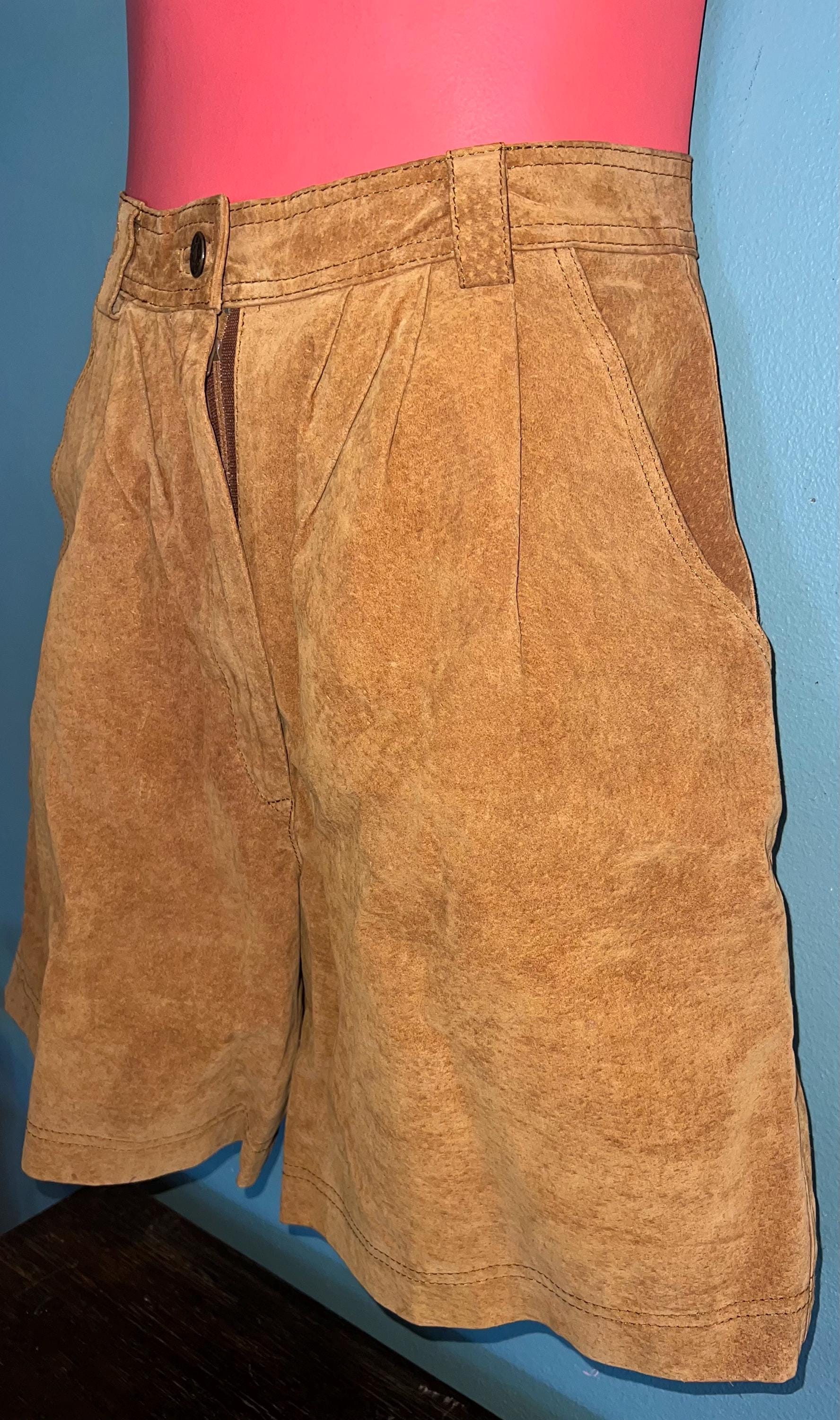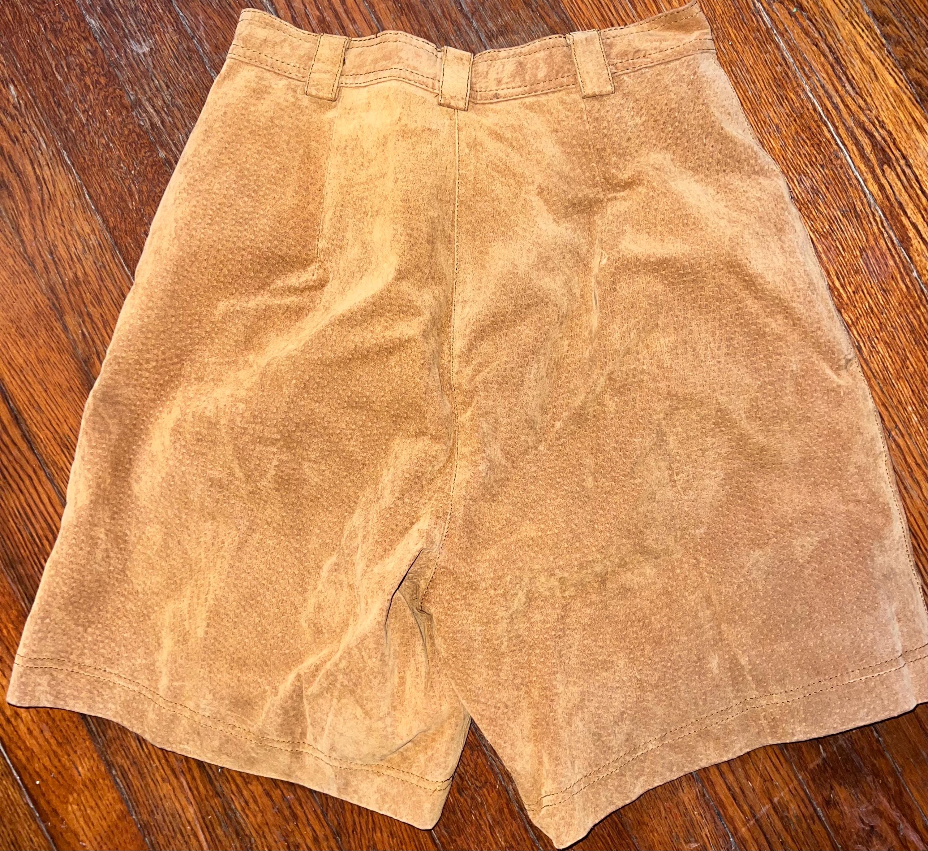 These are a really nice pair of camel brown long high waisted suede leather shorts. They have side pockets and a couple pleats, along with belt loops. there is one very small spot where the leather is darker on the back, (see last photo). A belt would cover it up. Otherwise, they are in good vintage condition!