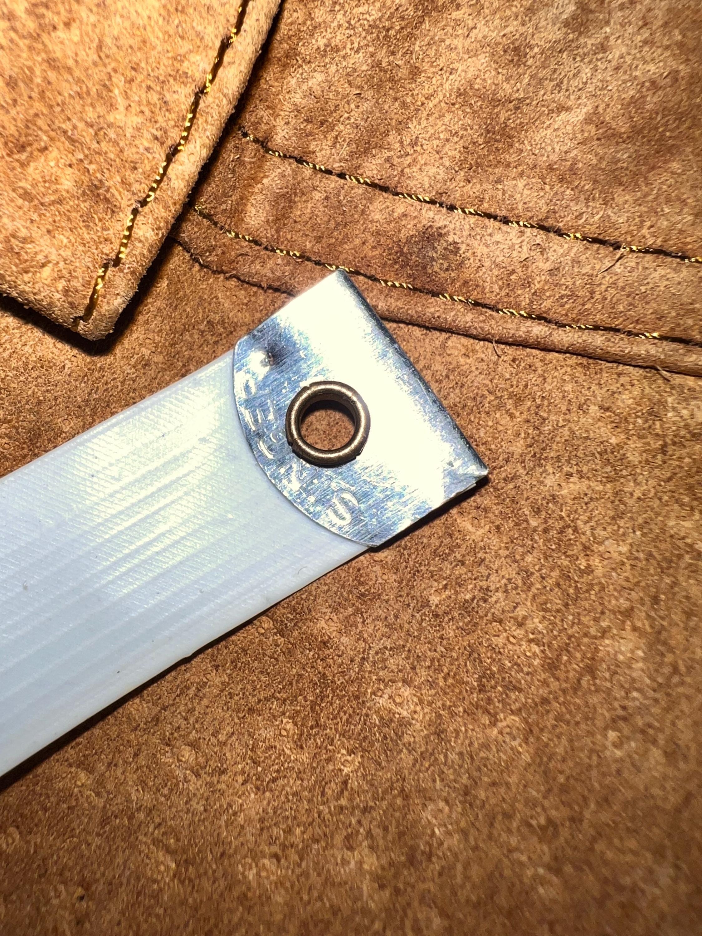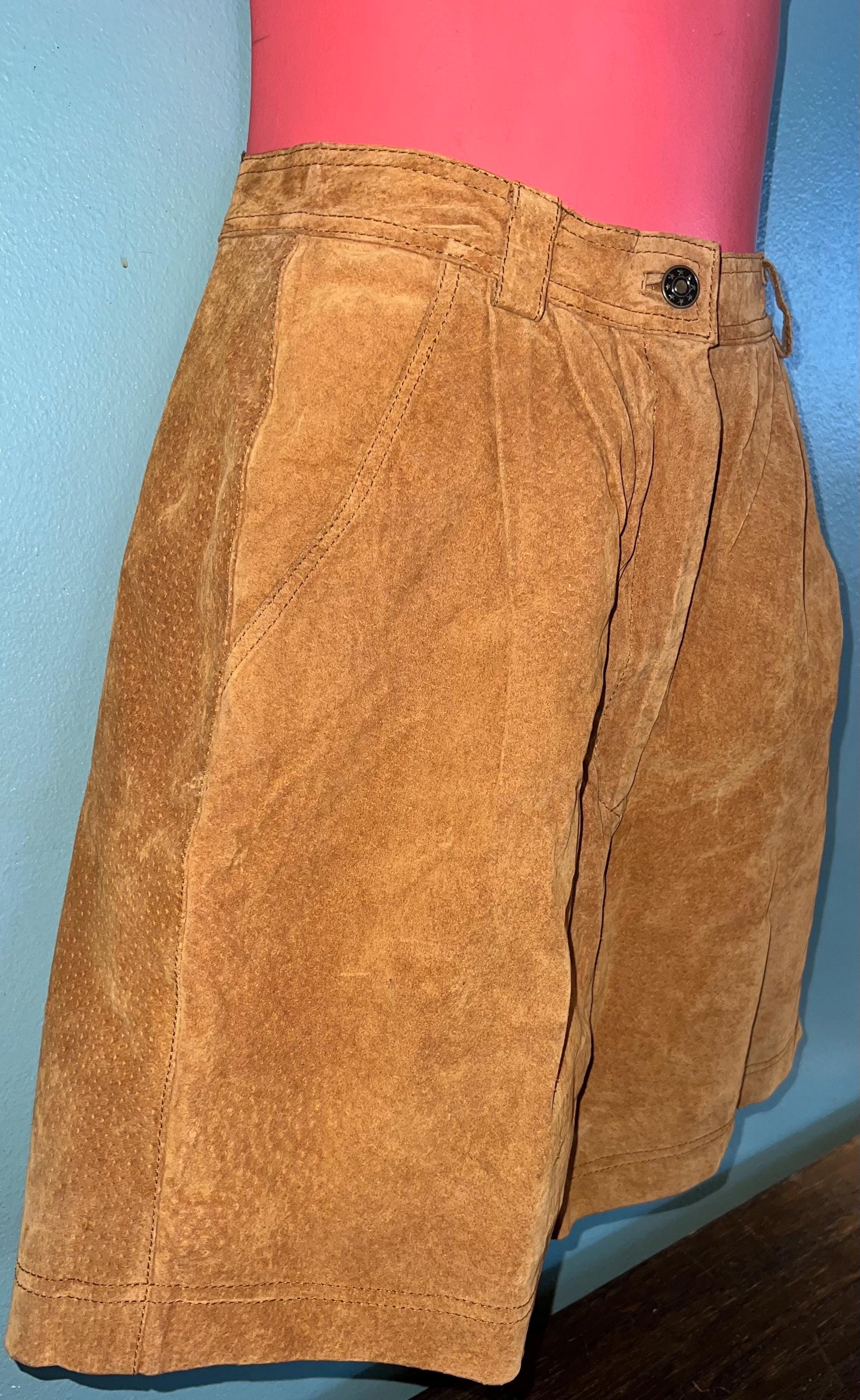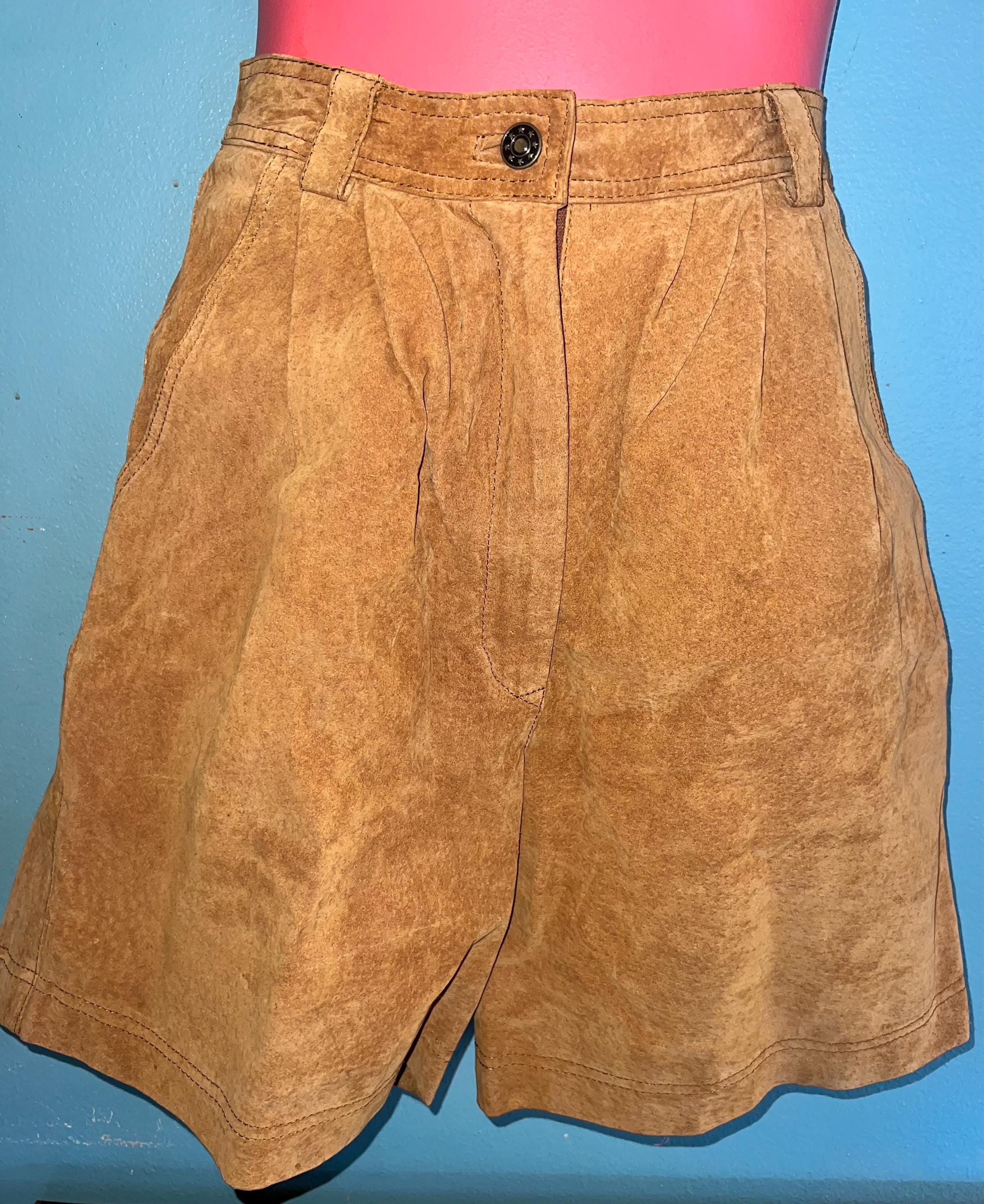 These are a really nice pair of camel brown long high waisted suede leather shorts. They have side pockets and a couple pleats, along with belt loops. there is one very small spot where the leather is darker on the back, (see last photo). A belt would cover it up. Otherwise, they are in good vintage condition!