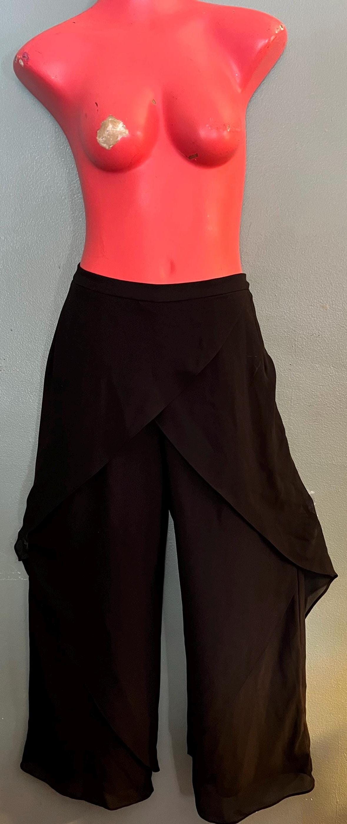 These are gorgeous, amazing, and slightly even wonderful black 90’s pants… They are like a sheer material and kind of have half a layered look. They have wide legs and it almost looks like a skirt if your legs are together while wearing them.