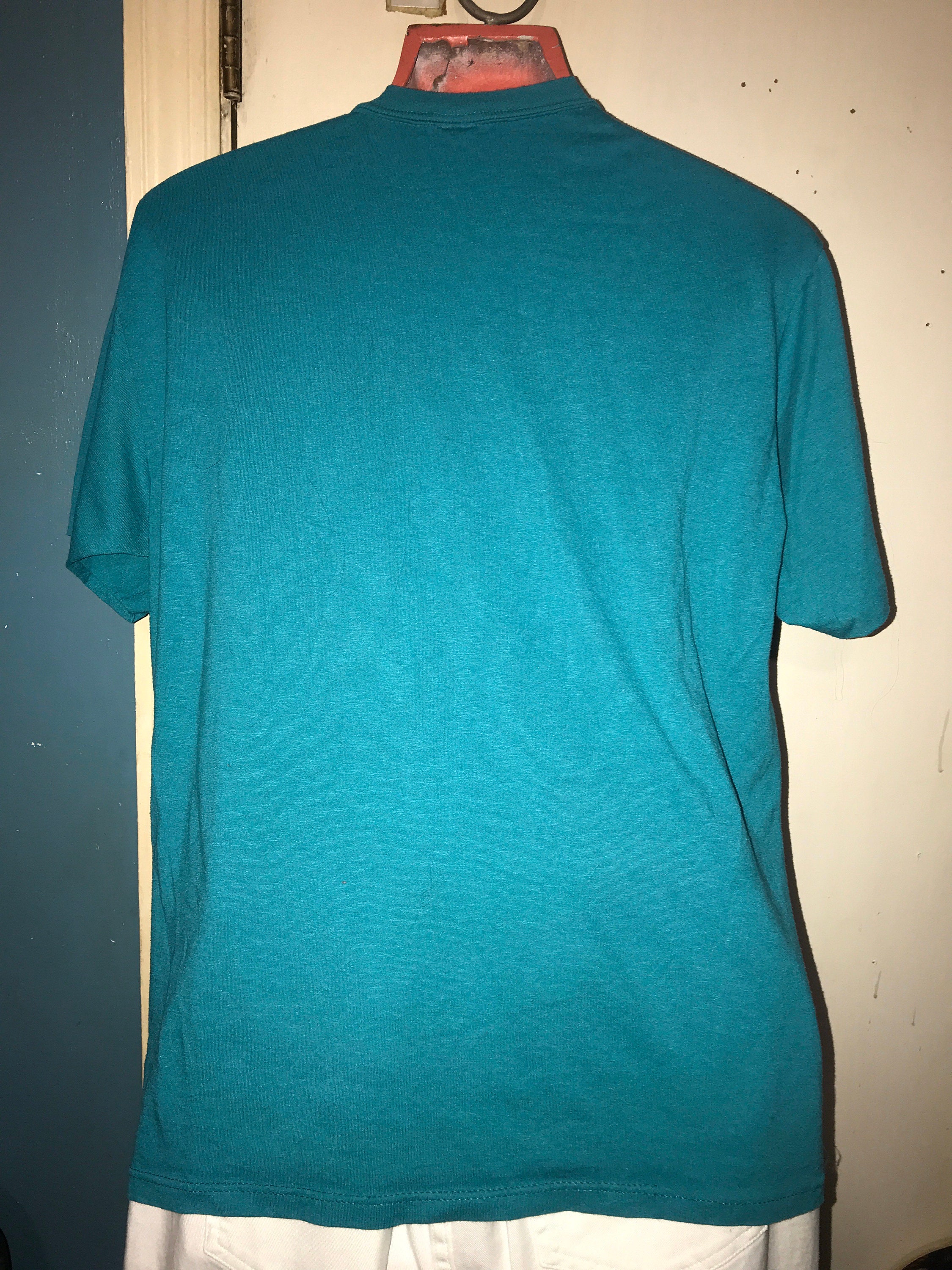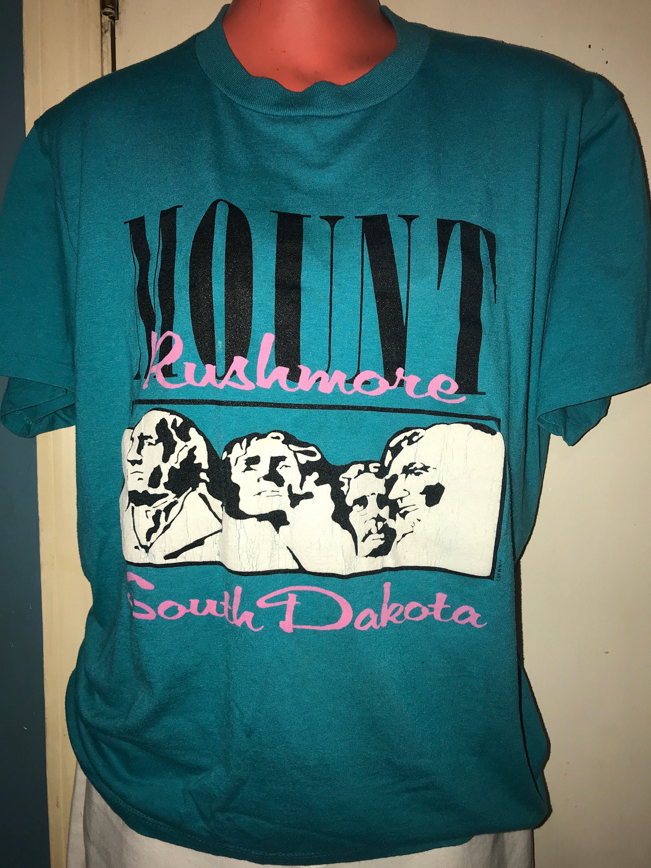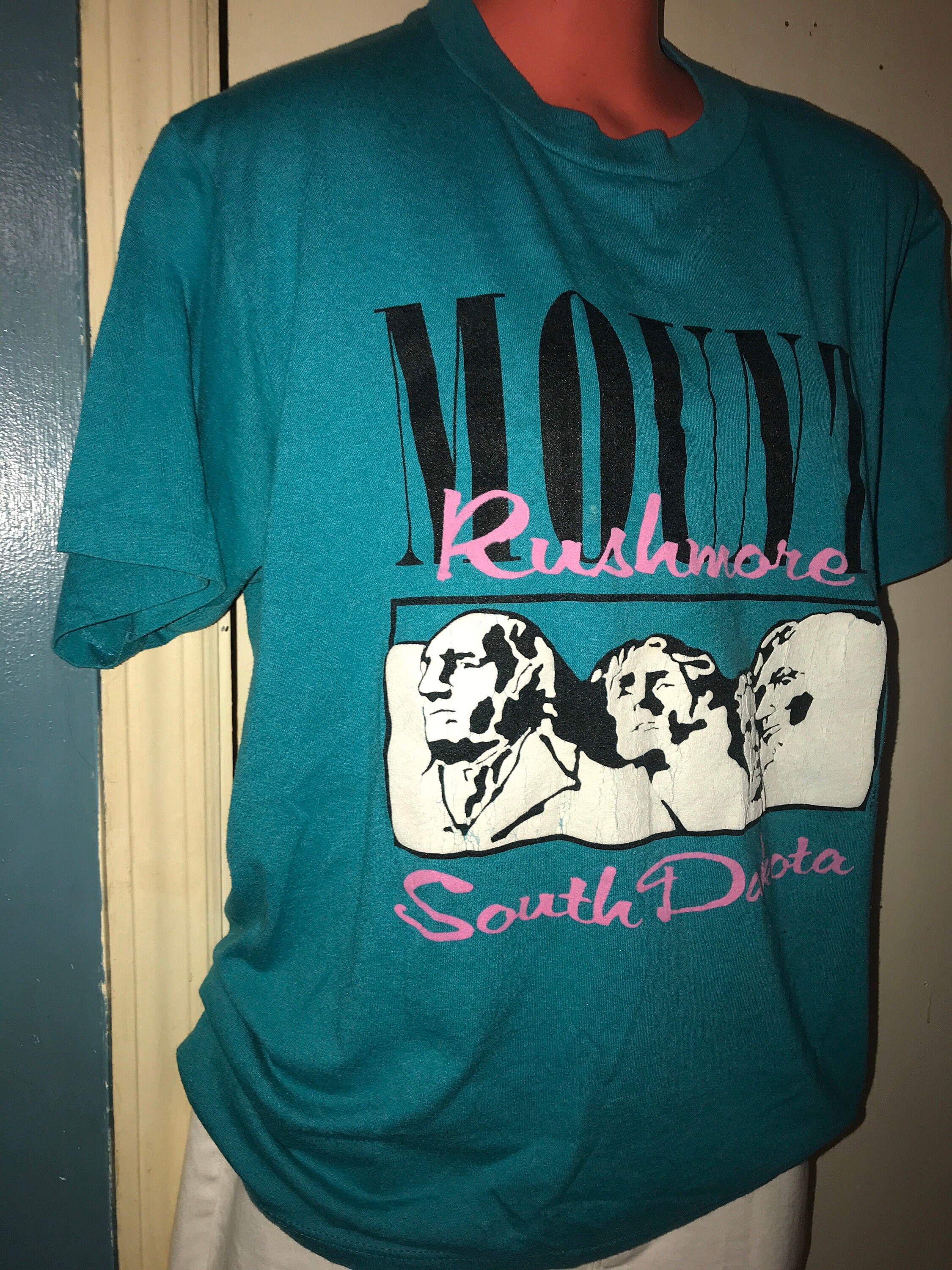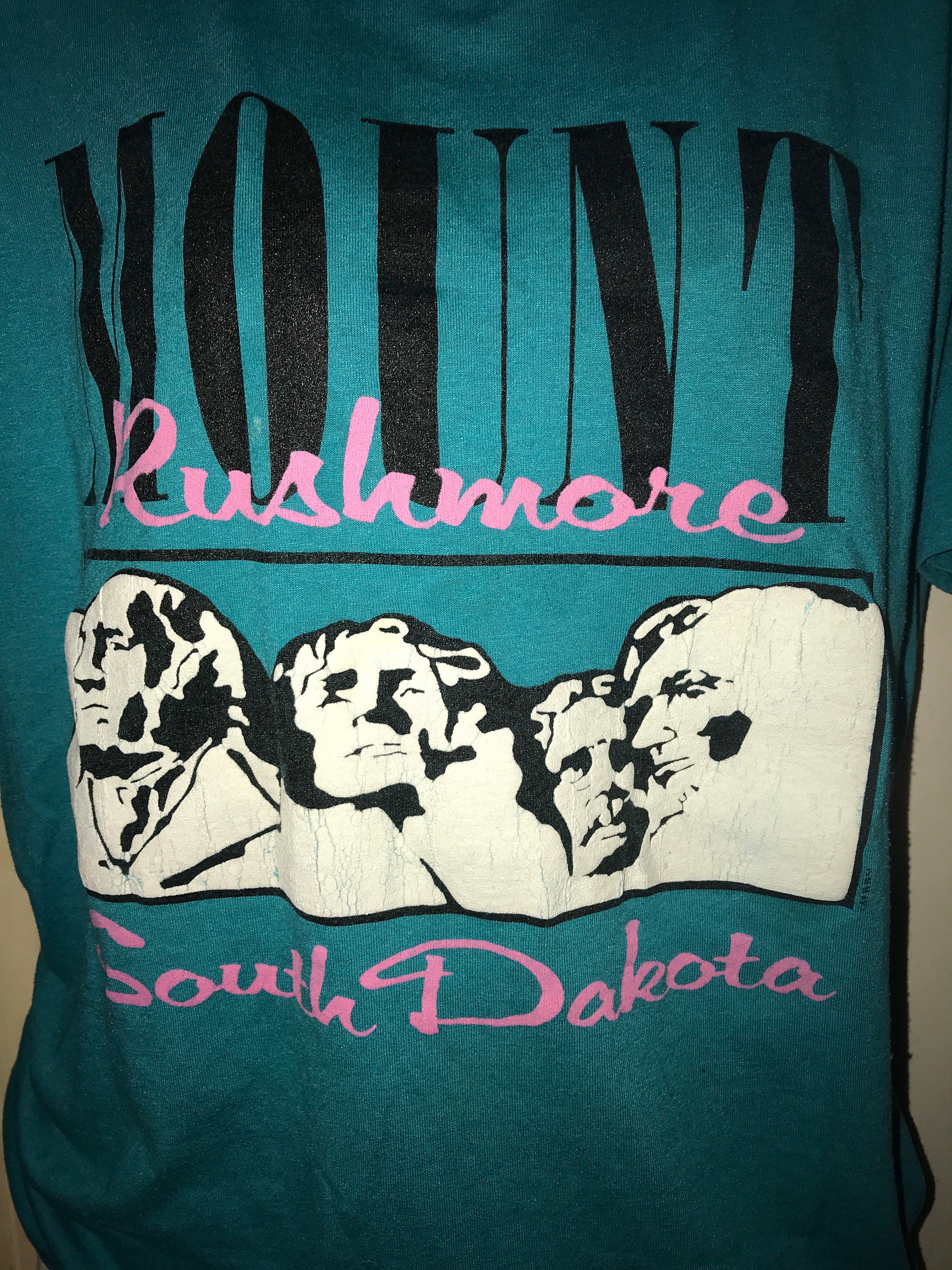 Another very awesomely vintage Tee! It’s an excellent aqua color with pink, black, and white accents. It’s Mount Rushmore and the white vinyl is a little cracked but it seems fine to me!