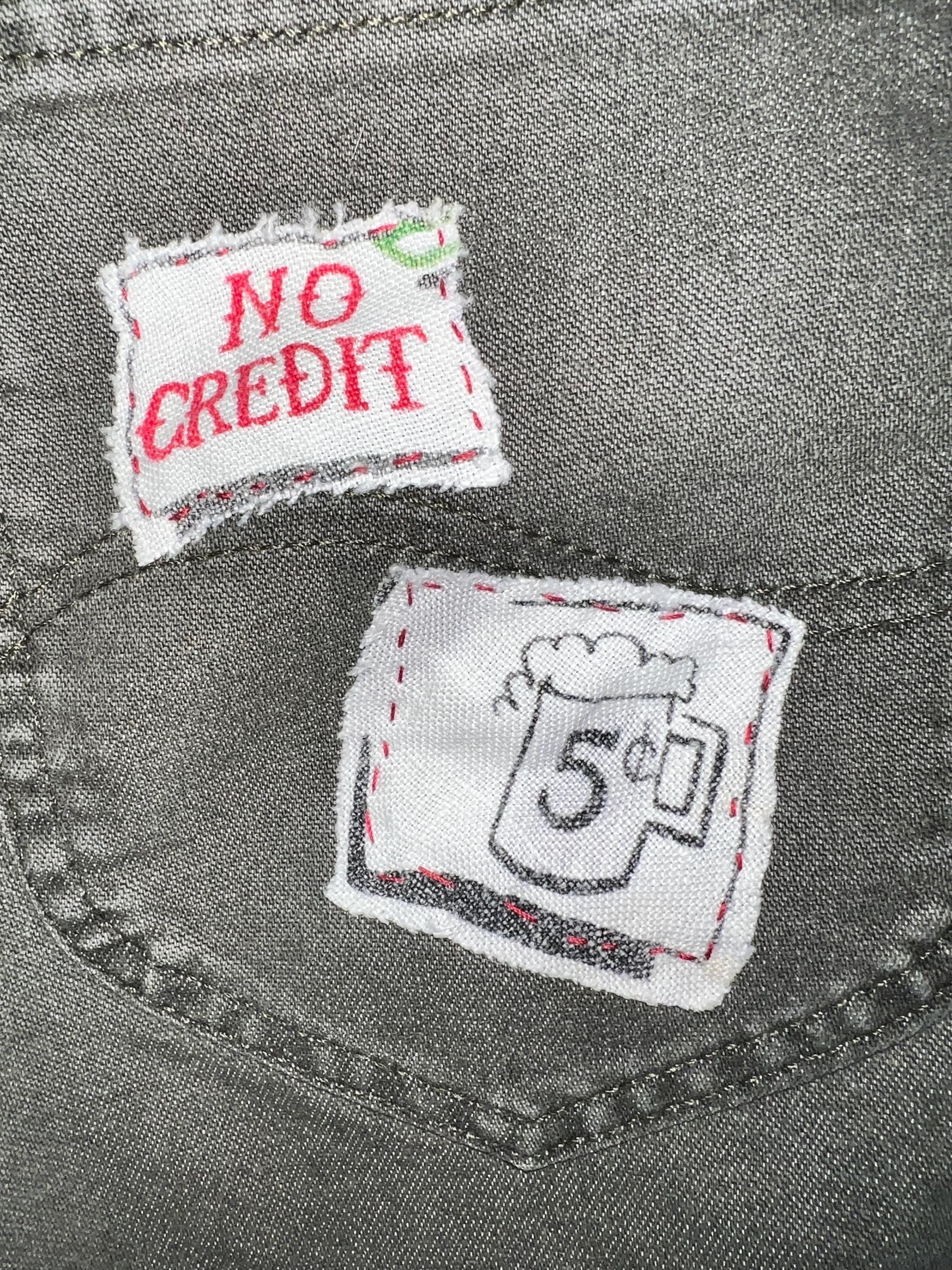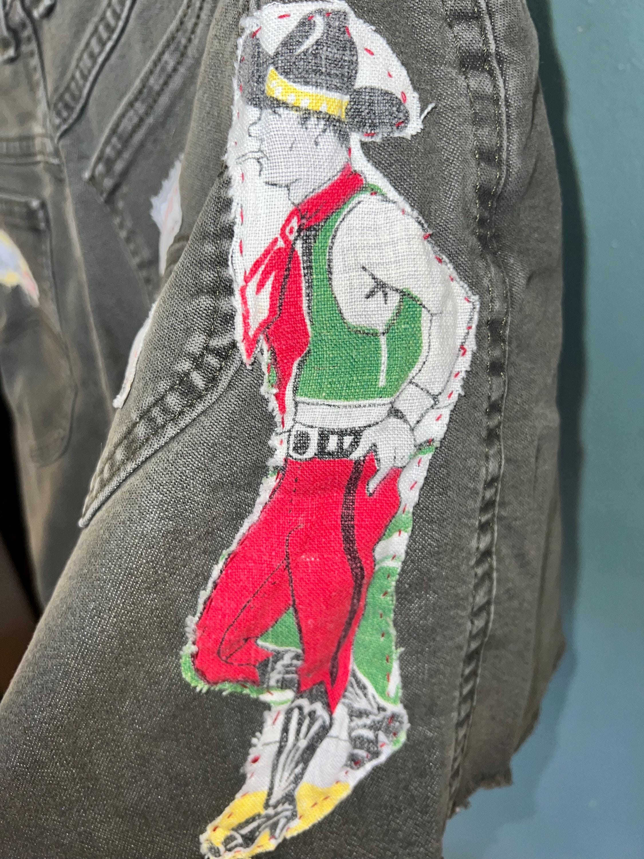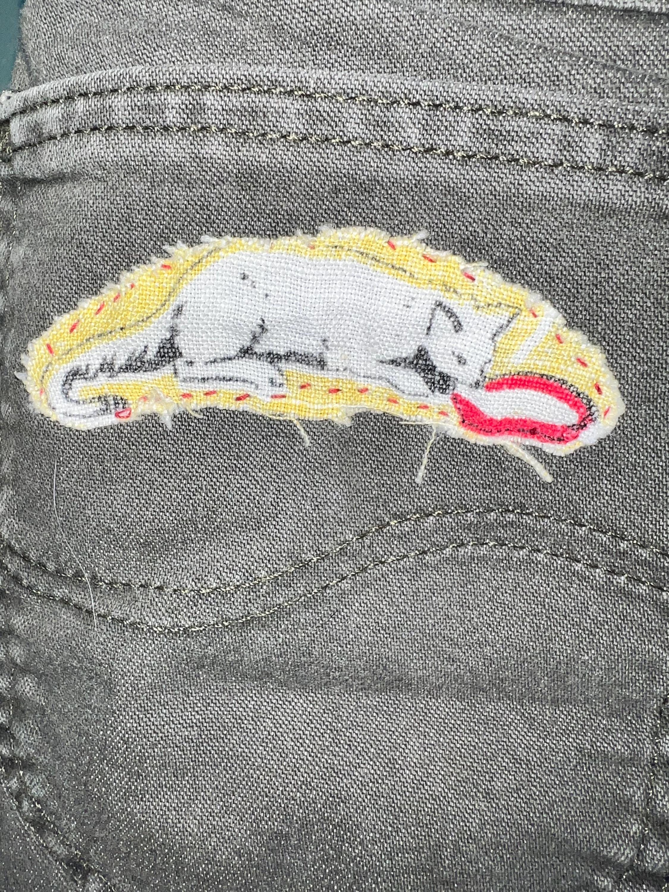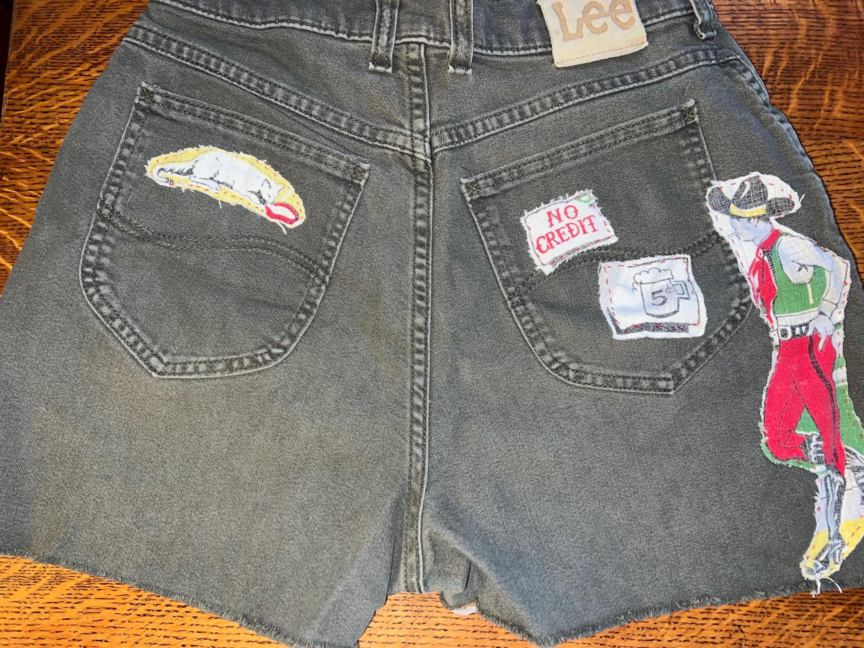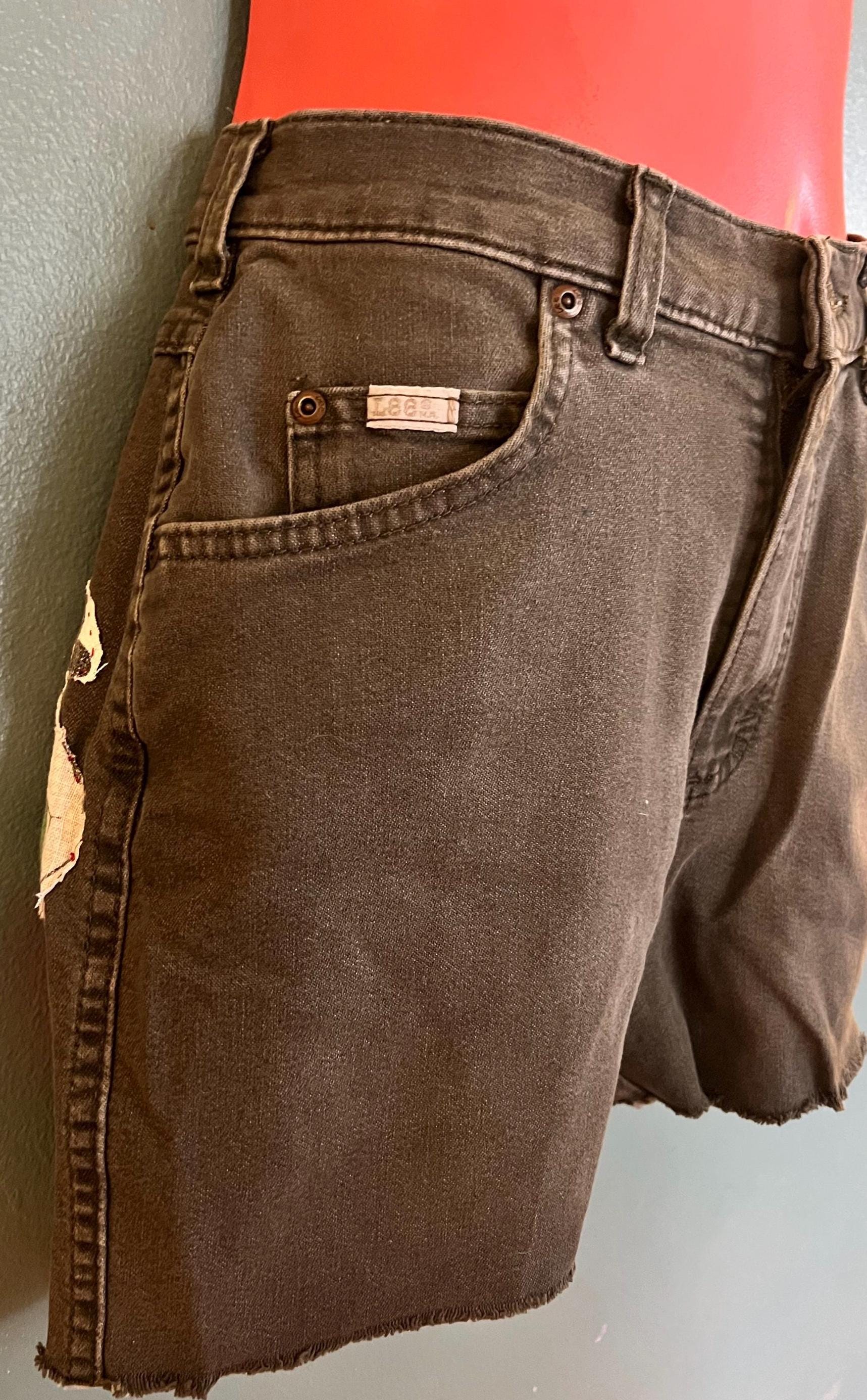 This was a nice pair Lee jeans, But i think it’s an even cooler pair of shorts. I’m NOT a professional seamstress, so far I do all this by hand but that’s the look I wanted with these. I just have ideas sometimes so i decided to start implementing them! These are a gray denim with maybe a slight greenish tint. i used a very old Irish linen, it was pretty much destroyed but I was able to salvage some of it, the cat licking from the bowl of milk being the best if you ask me!