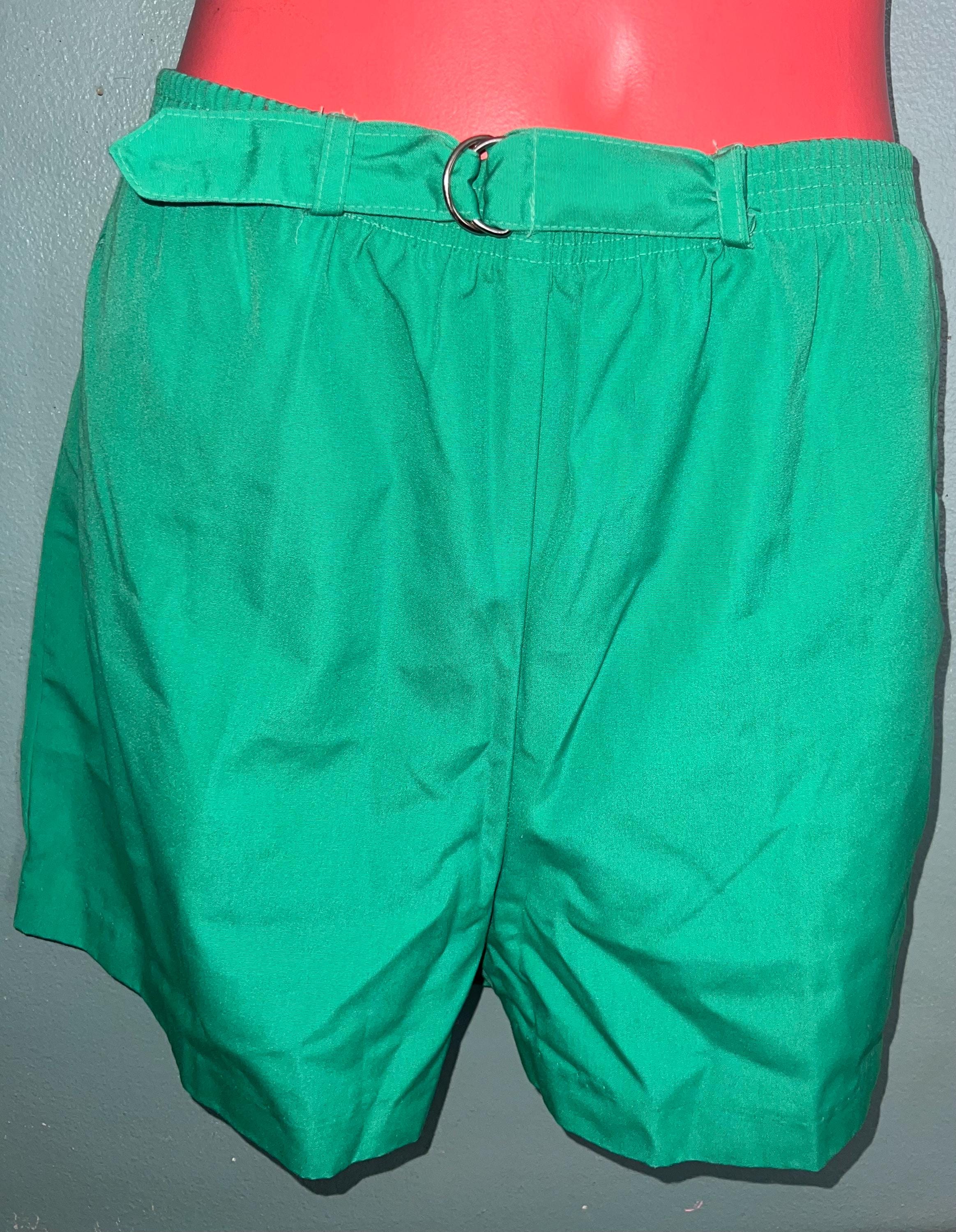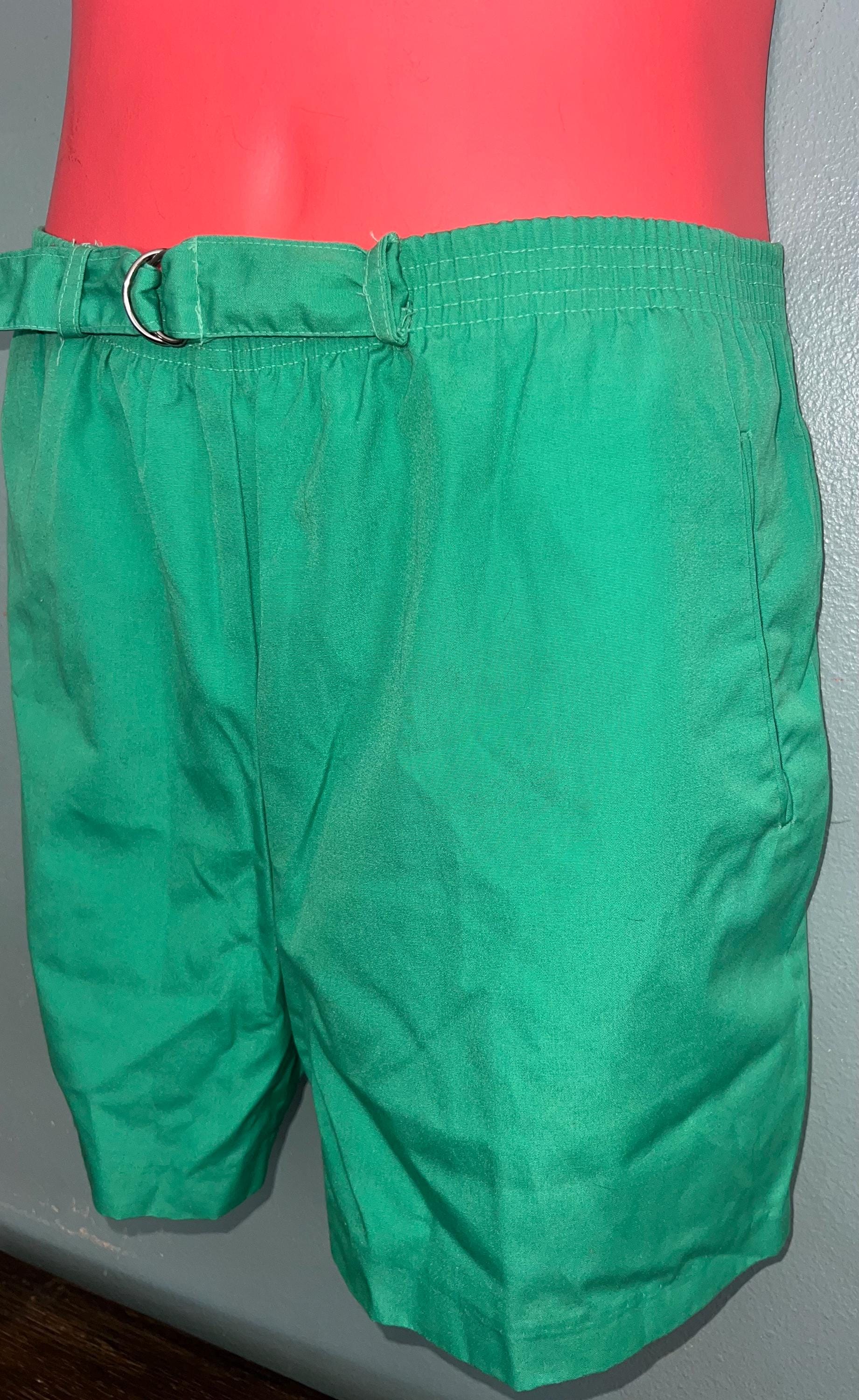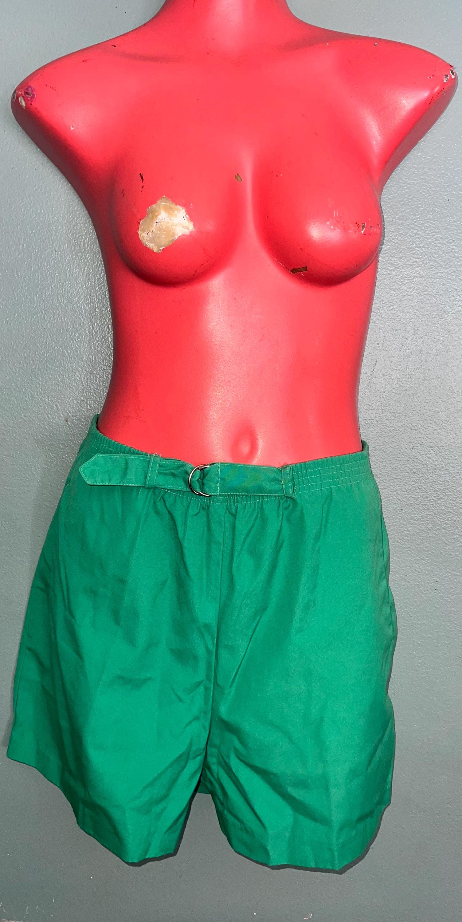 These are cute little green shorts from the 80’s, with an elastic waist and a little faux belt to tighten them up a little. They have side pockets and no back pockets. They are in good vintage condition
