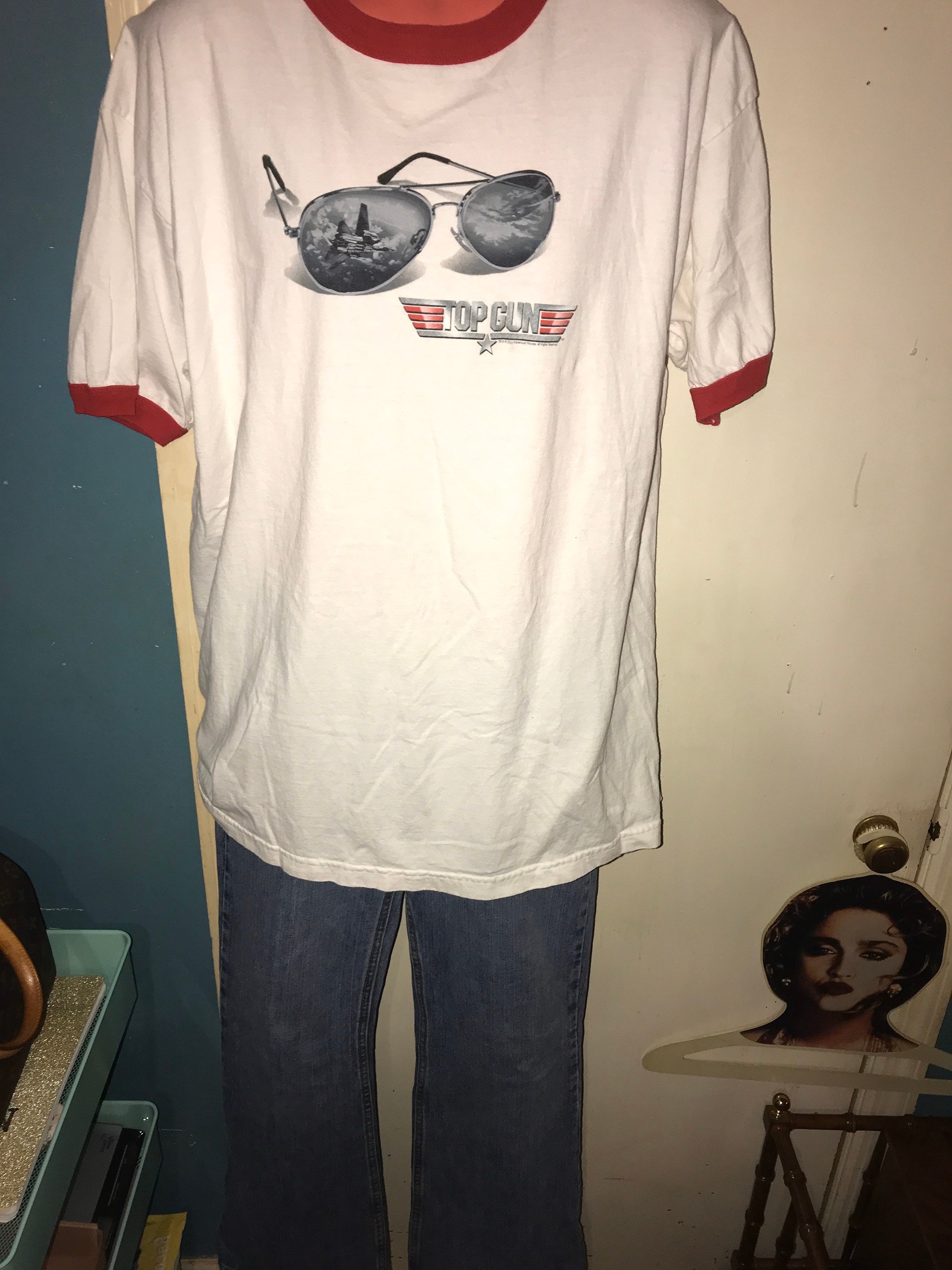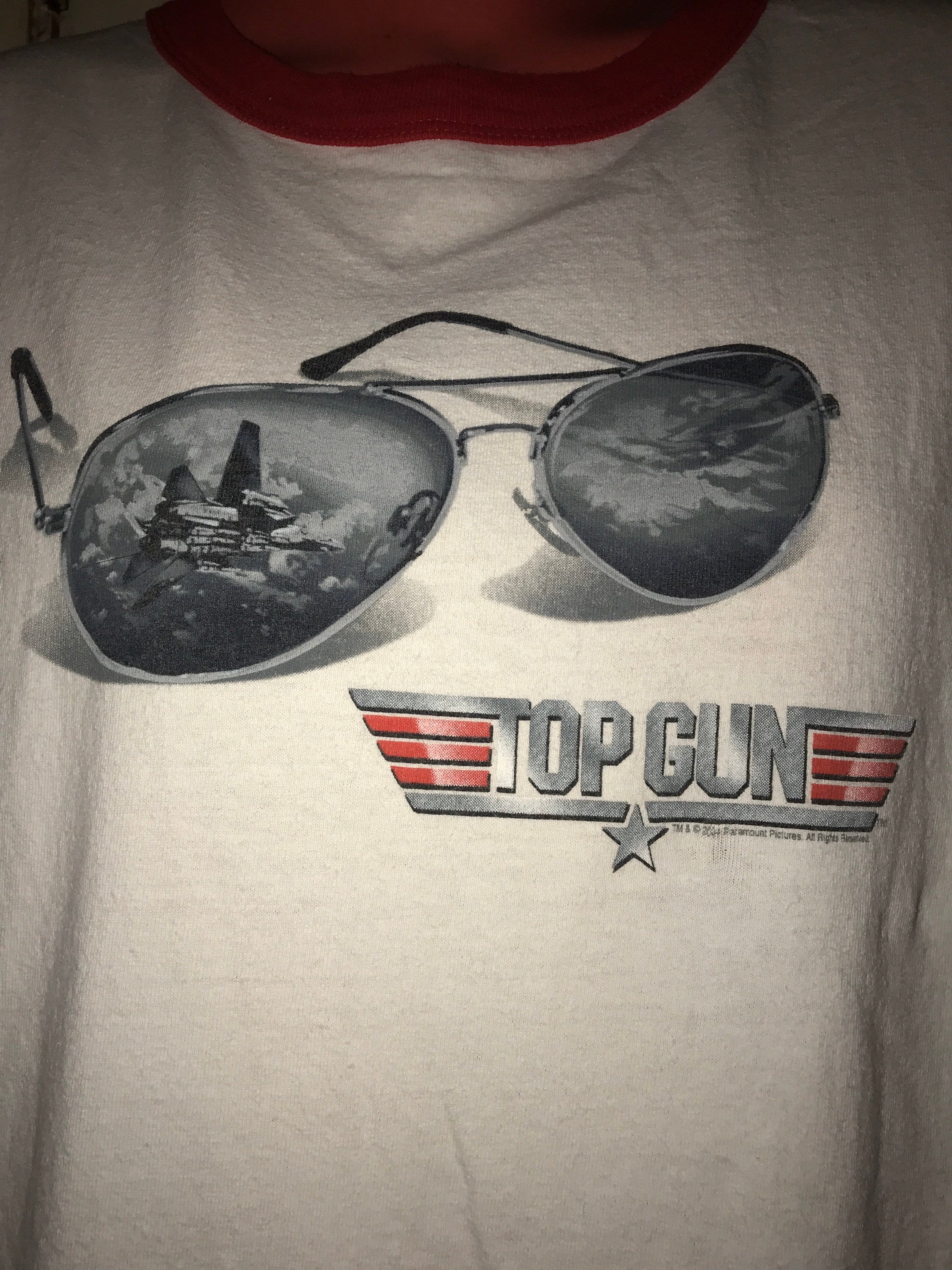 Another very awesomely vintage Tee! This is an excellent Top Gun ringer tee. It has the iconic aviator sunglasses on the front and Maverick big and red on the back. It’s in good condition.