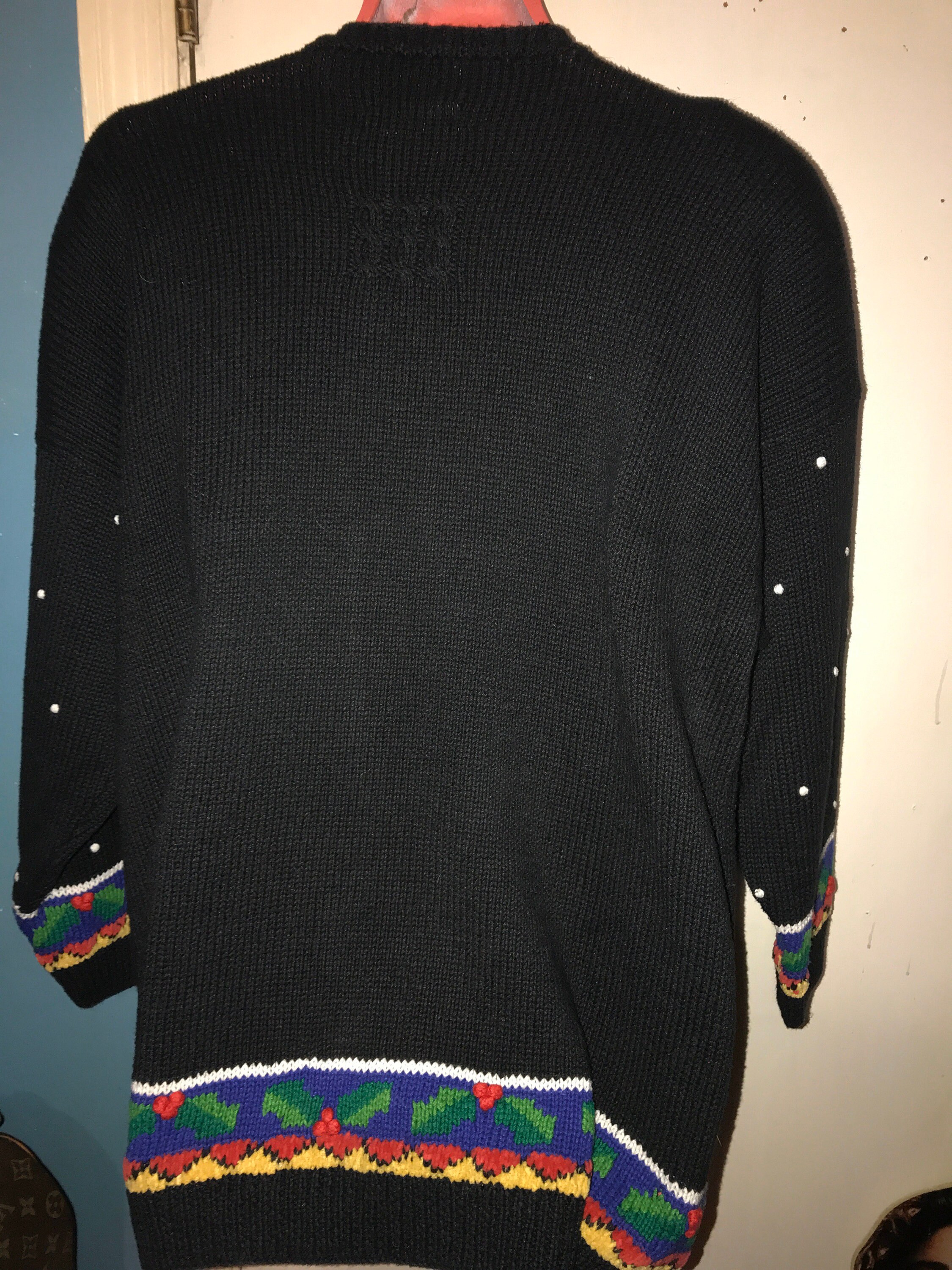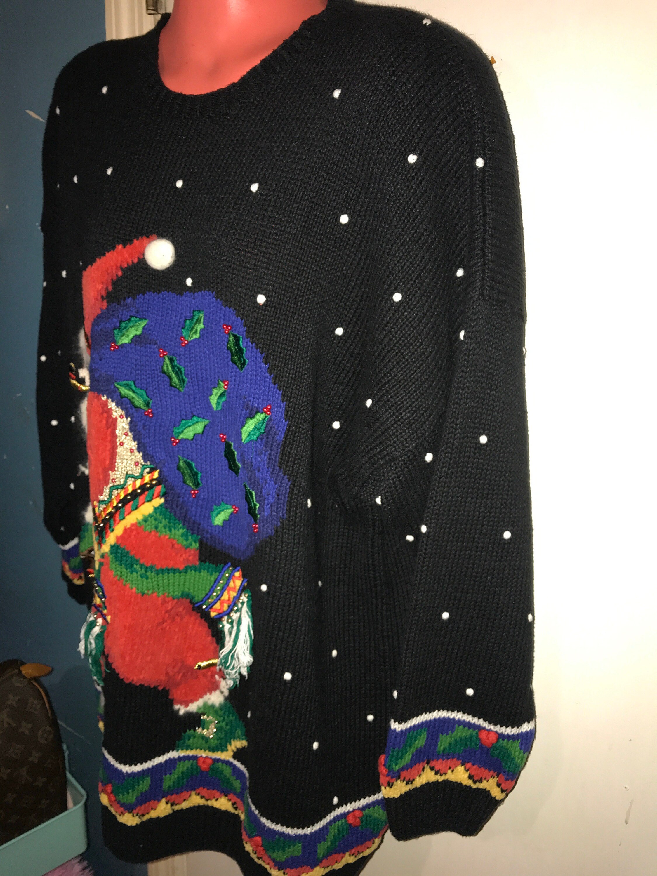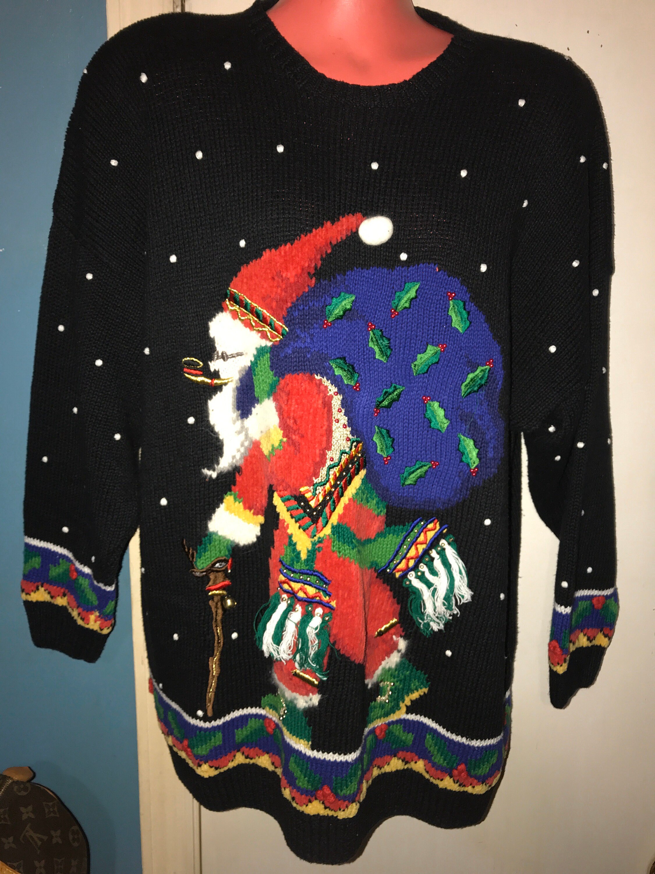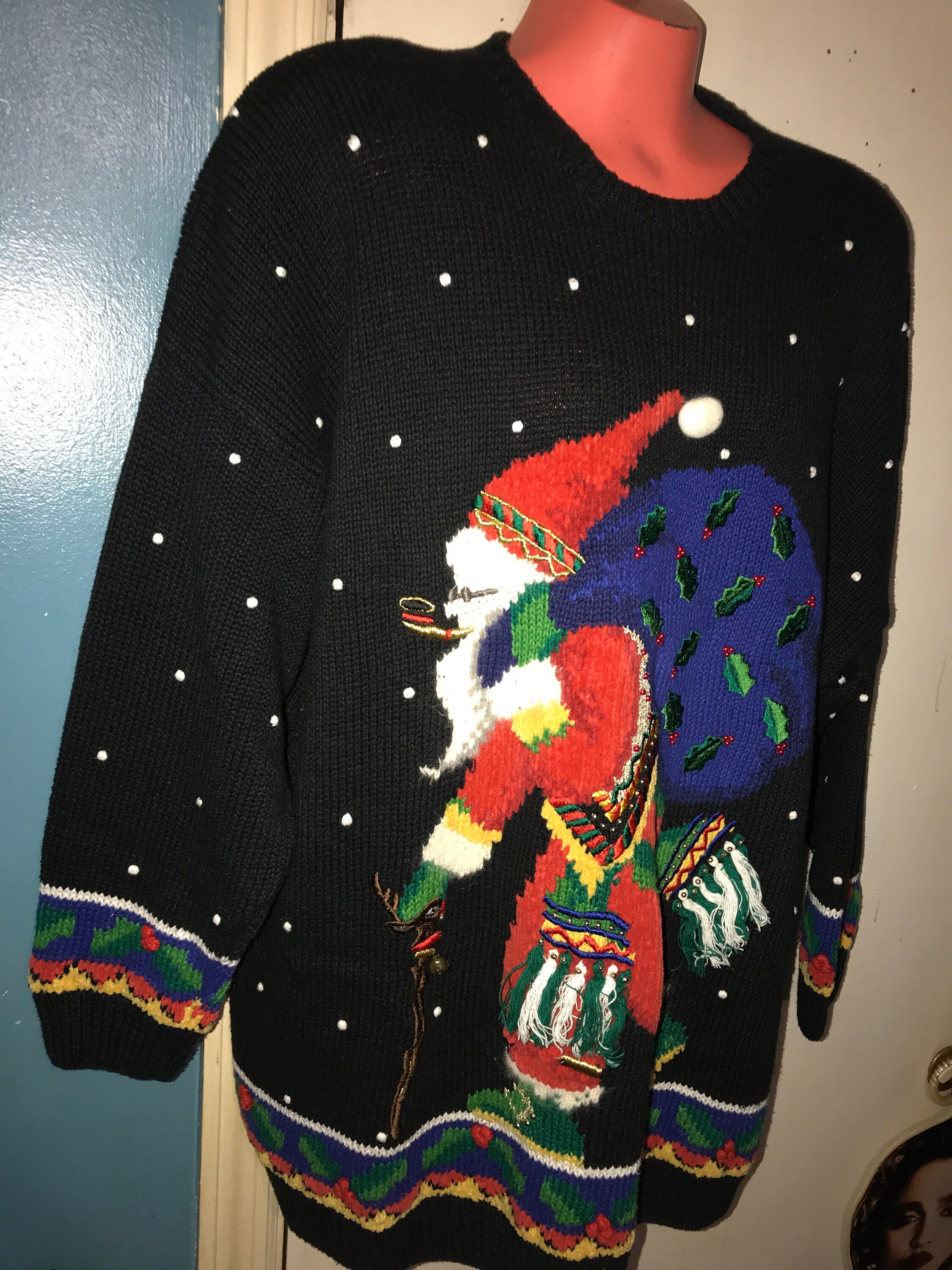 This ugly sweater is nice with an Old Saint Nick walking with a reindeer cane and his big bag of gifts. He’s also got some really cool snow boots on! It’s a really great sweater, super long and would be great with leggings and boots.