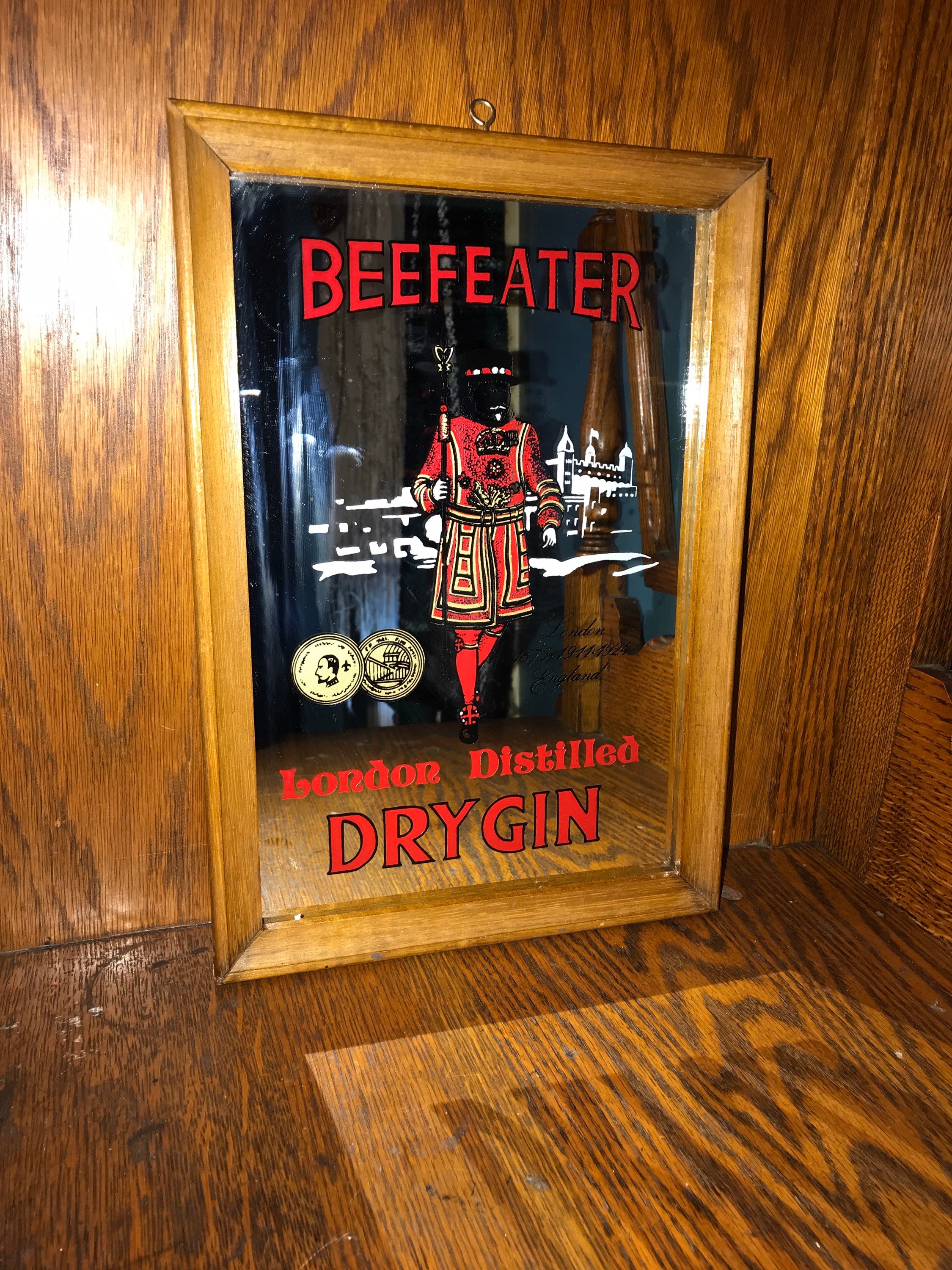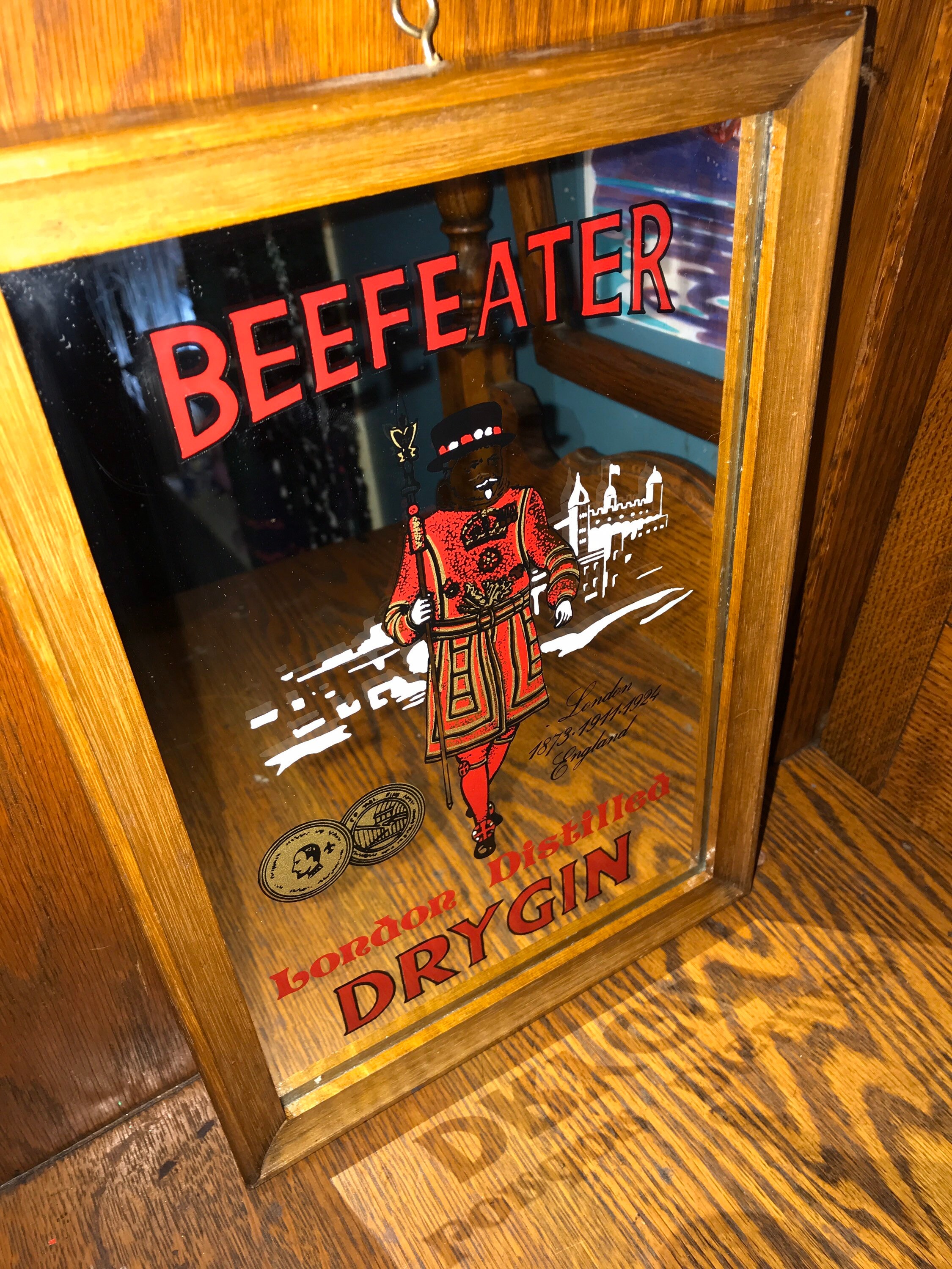 This is super cool! 70's Beefeater Dry Gin mirror sign. Could be used as bar sign or excellent decor for a man cave or hey maybe even a women’s cave! However you like it and however you like your gin, this is a cool mirror sign. It’s in good vintage condition.