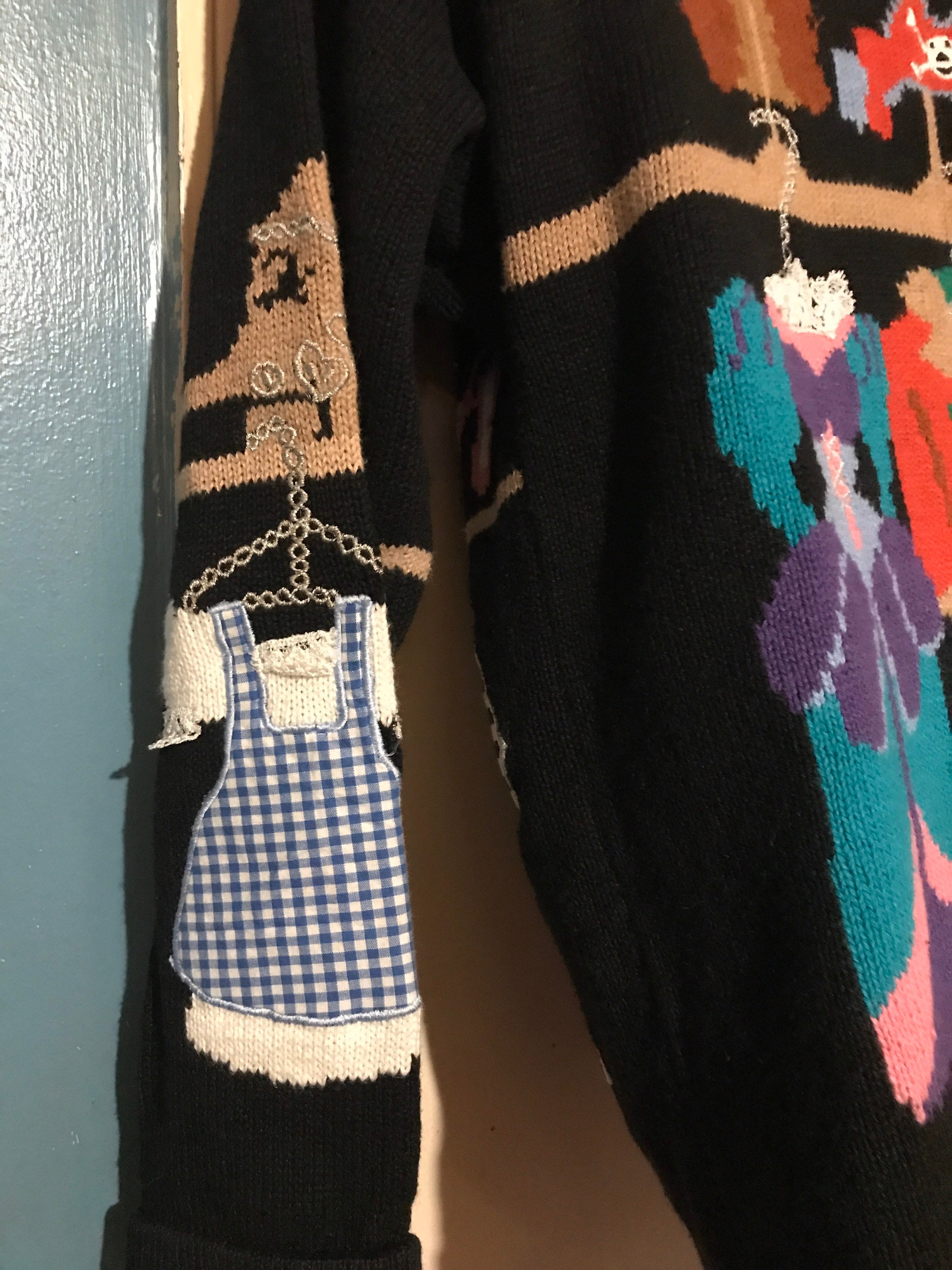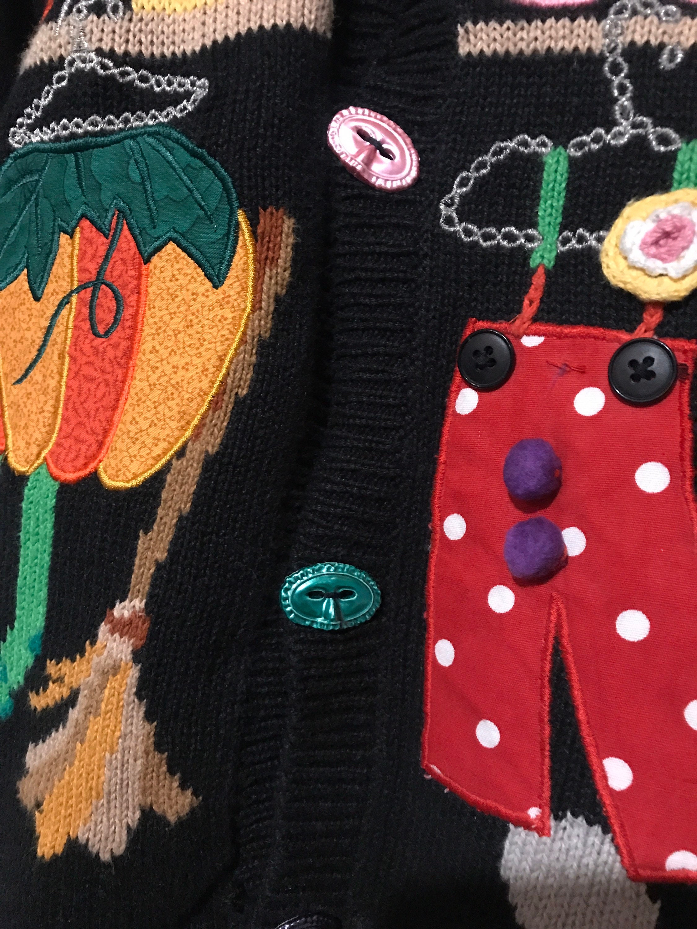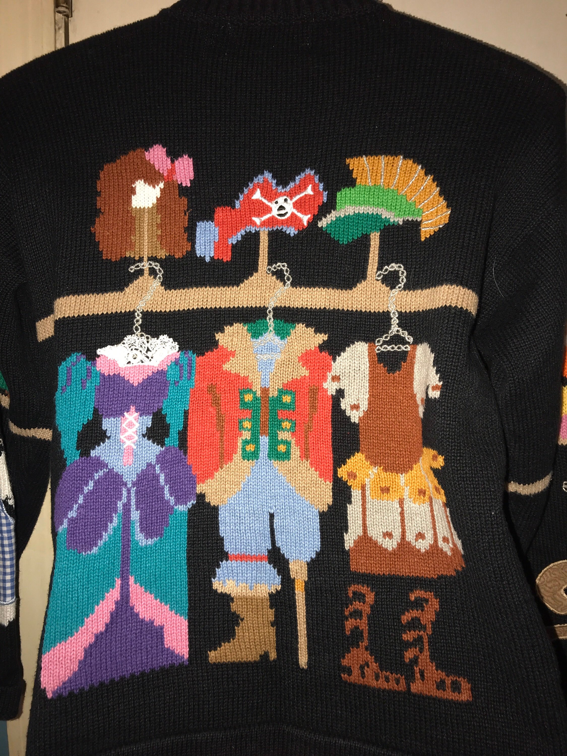 This is the best Halloween “ugly" Halloween sweater. I wanted to go ahead and list it months early because it’s so great! It has all sorts of costume ideas all over it, some of them include; a witch, princess, clown, Dorothy, jailbird, and a ghost! It's got everything you need for a fun Halloween! Oh and don’t forget to check out the awesome little masquerade mask buttons. Too cute!