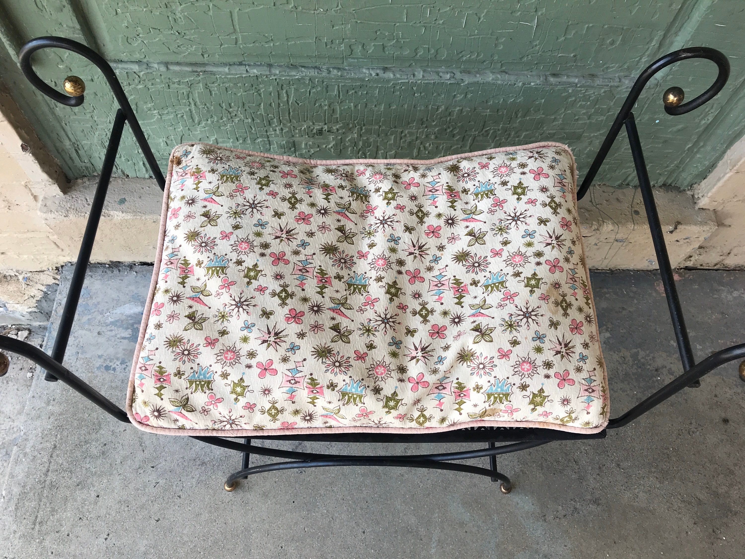 This is a very nice Hollywood Regency style curved metal with a lattice work bench, and gold accents. The stool is comfortable without a pillow but I do have this feather pillow that fits it perfectly but doesn’t really go with it if you ask me! The stool shows some normal wear and tear. Please review all photos. The pillow is in good condition but has one little stain on the corner of one side.