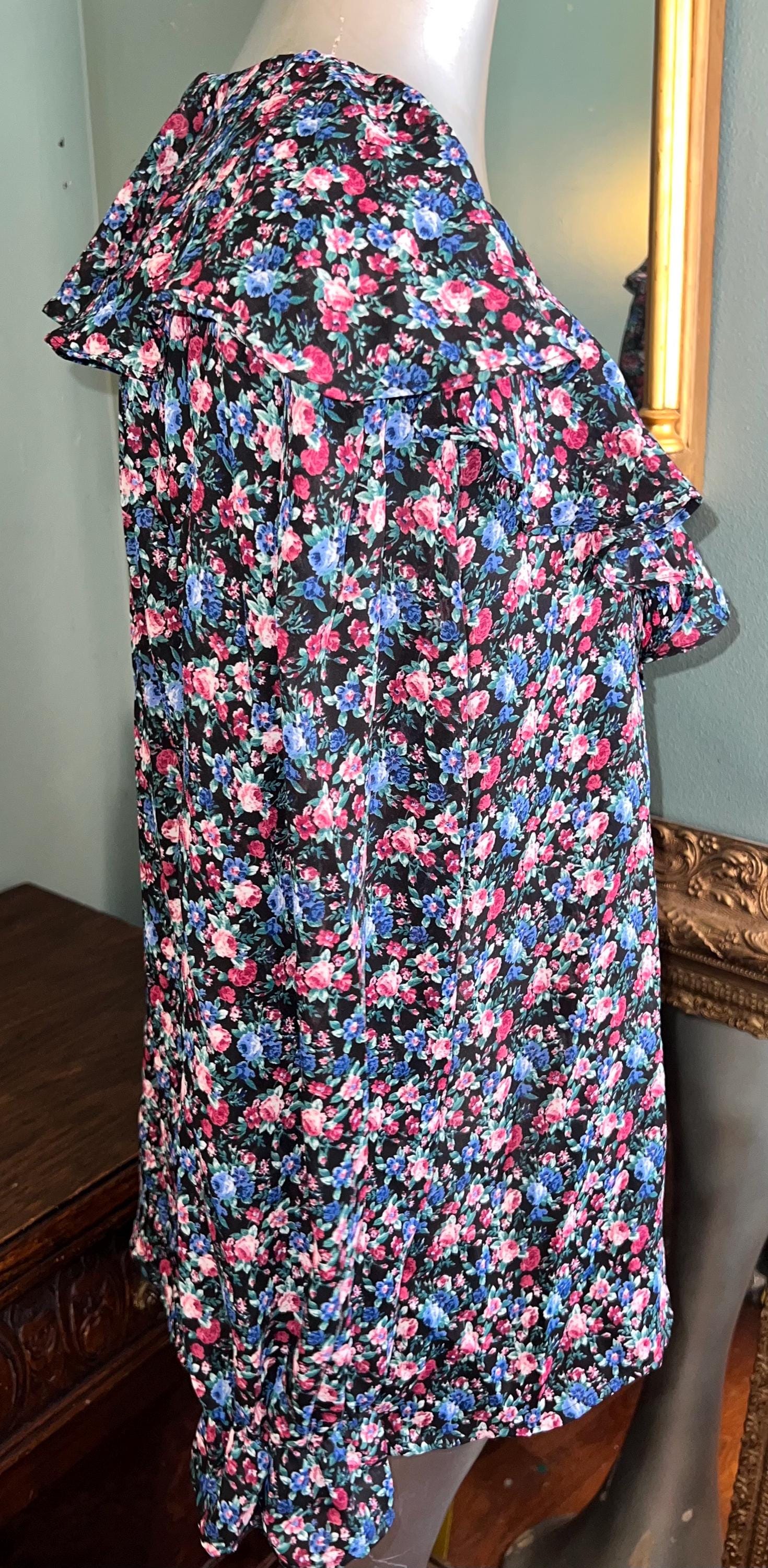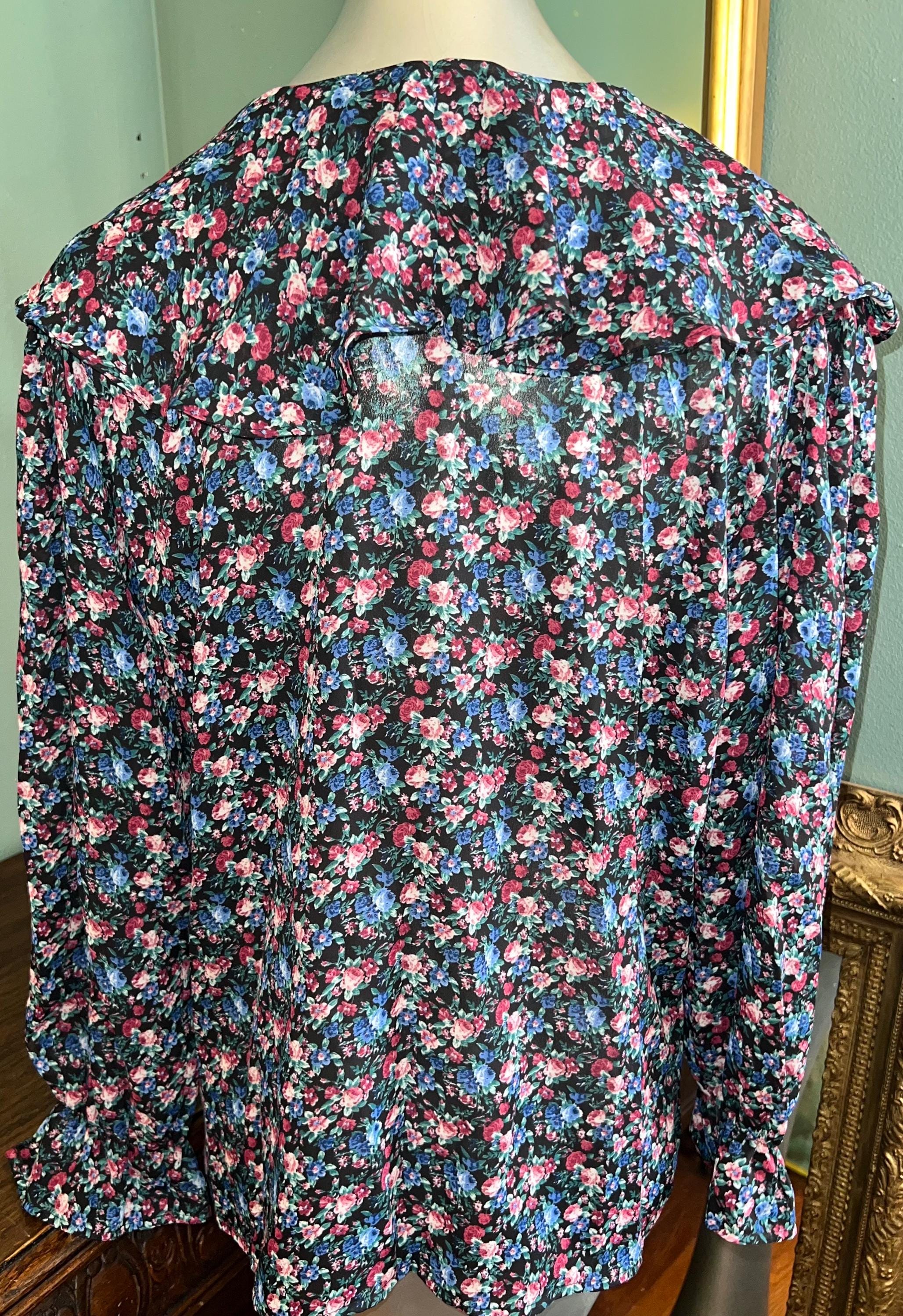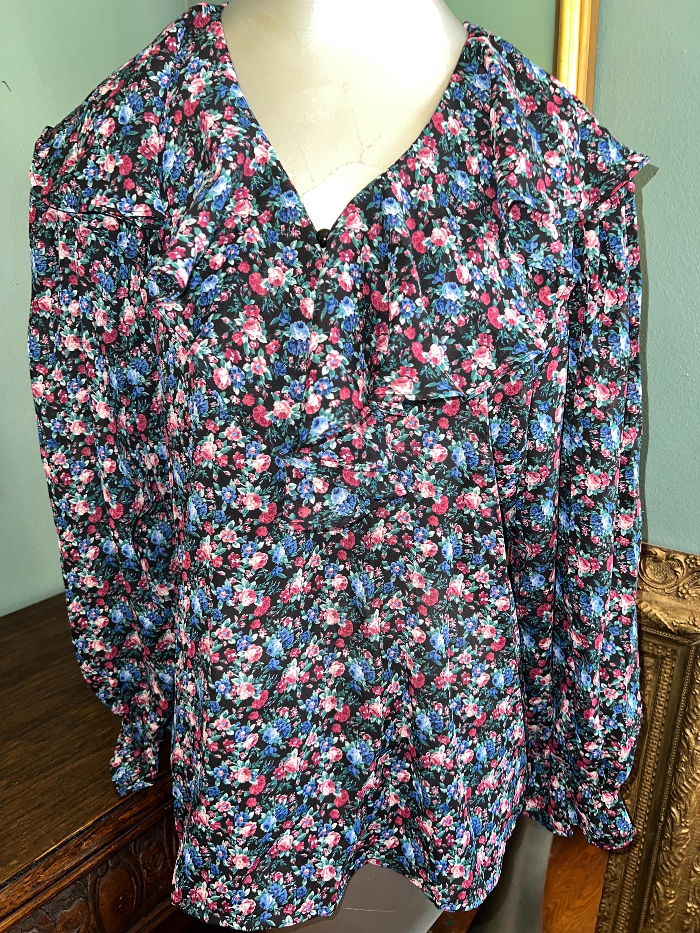 This takes me back to middle school. It’s a sheer black with flowers all over, puffy sleeves, bells at the wrists, big collar shirt from the 90’s.