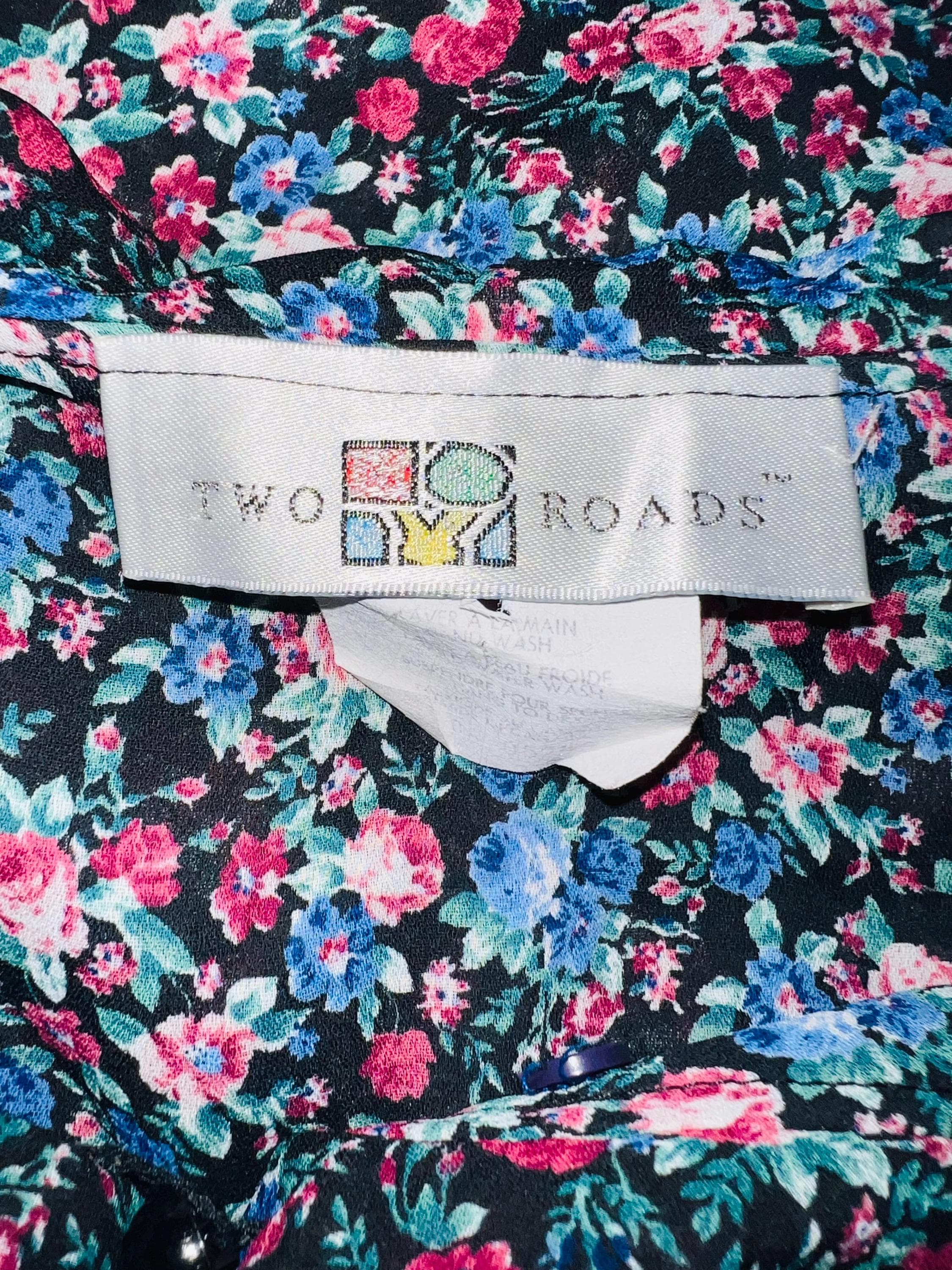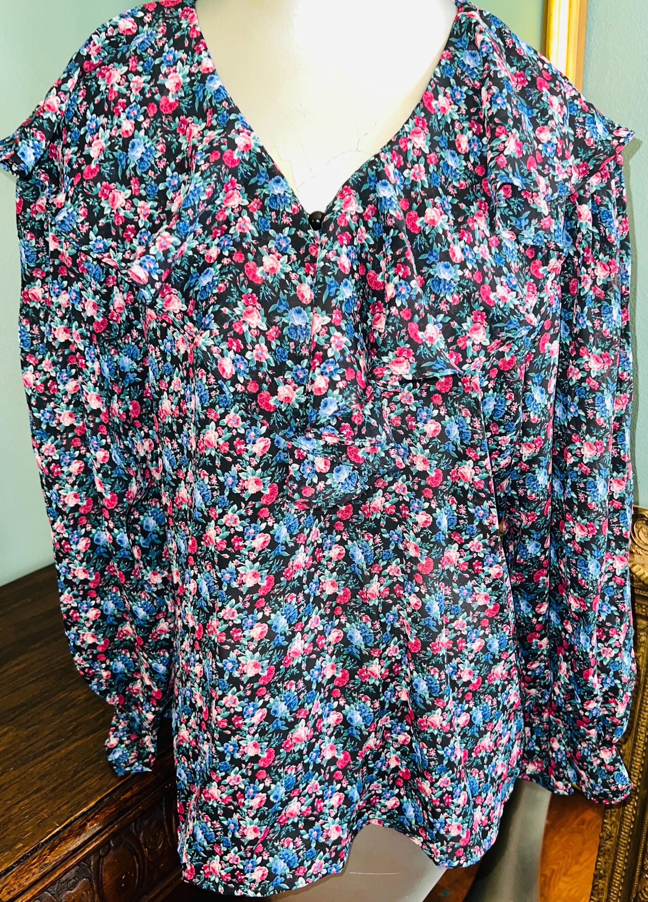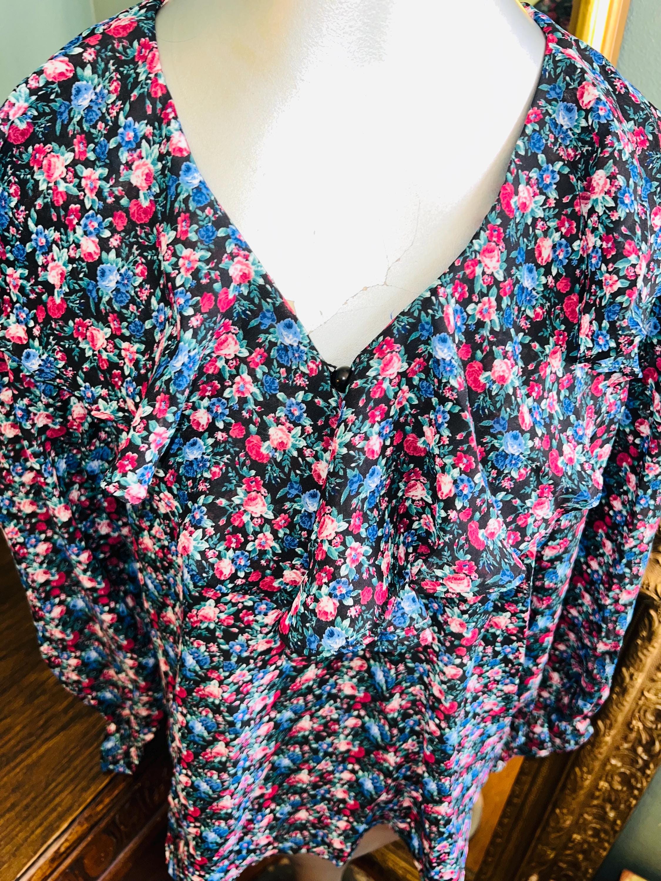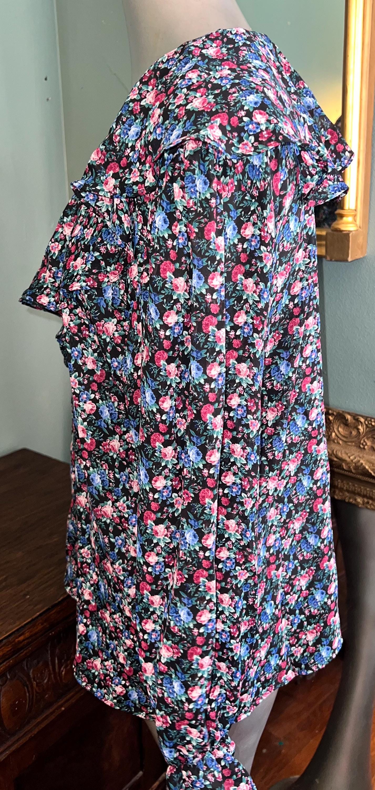 This takes me back to middle school. It’s a sheer black with flowers all over, puffy sleeves, bells at the wrists, big collar shirt from the 90’s.