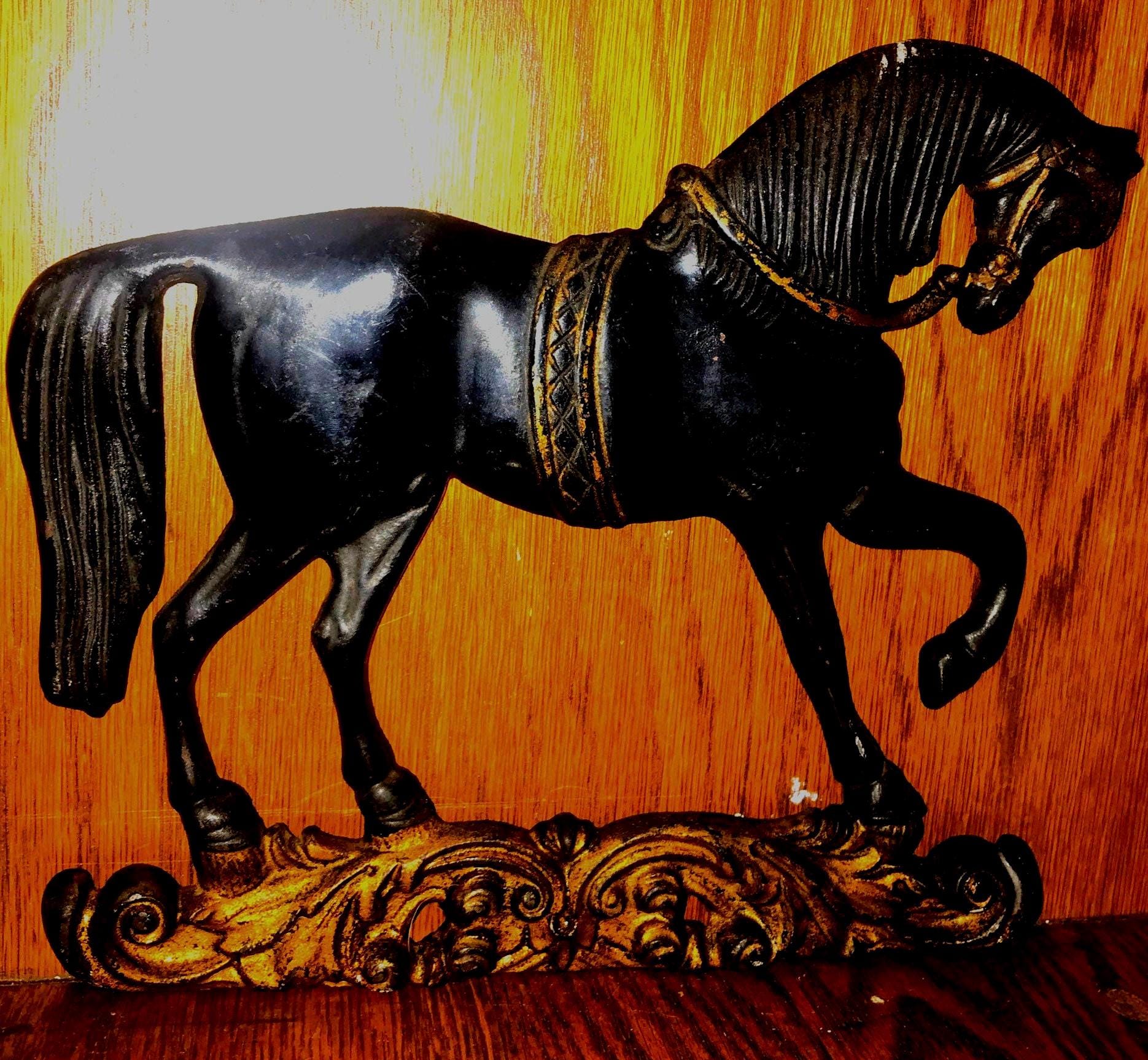This is a very nice solid cast iron metal walking horse. It’s details are done in black and gold. It has some scratches and marks as expected for its age. I believe it was once used on the outside of the house, maybe on a mailbox. Once a piece of a treasured home. Whatever you use it for it’ll look great! It’s in good vintage condition.