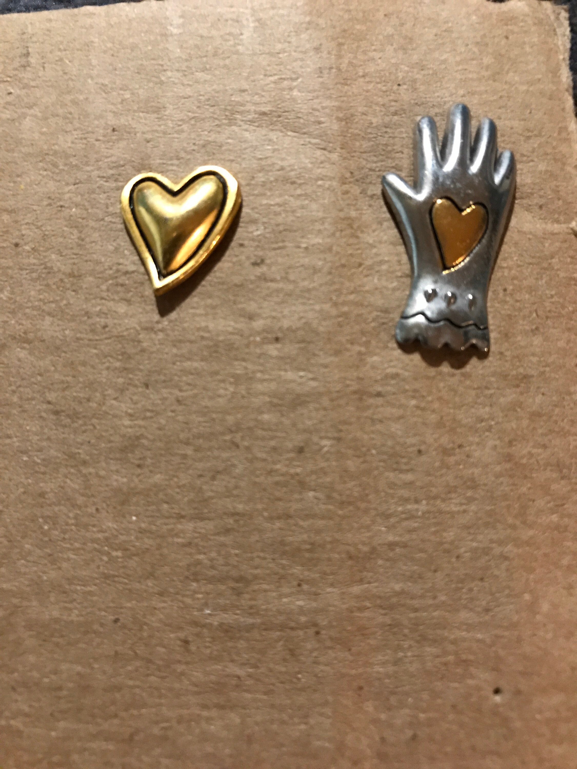 Love these! This is a set of two and I believe they were made for Chico’s. It’s a small gold heart and a small hand with a gold heart inside of it. Very cute little pins. They are in good vintage condition.