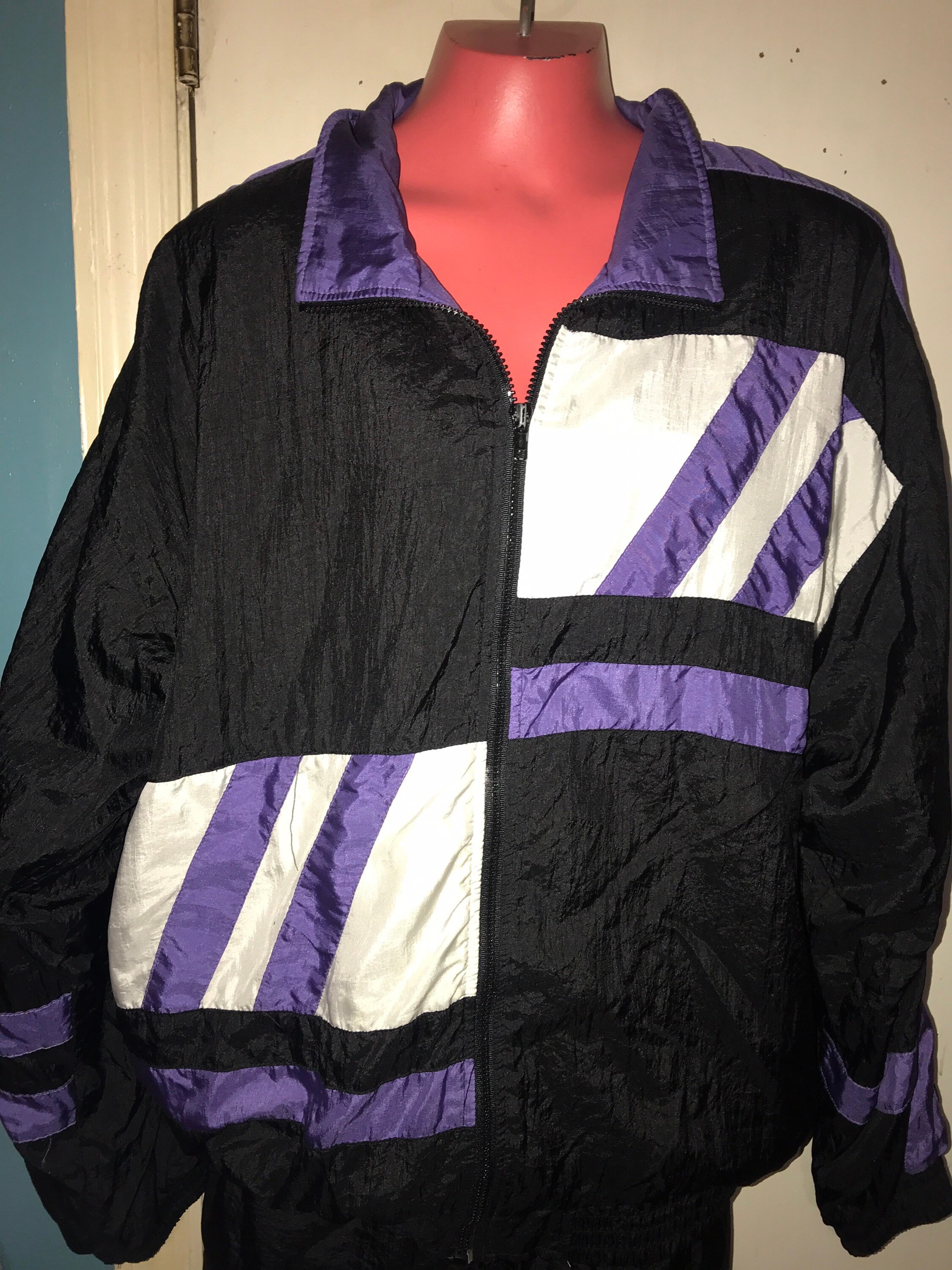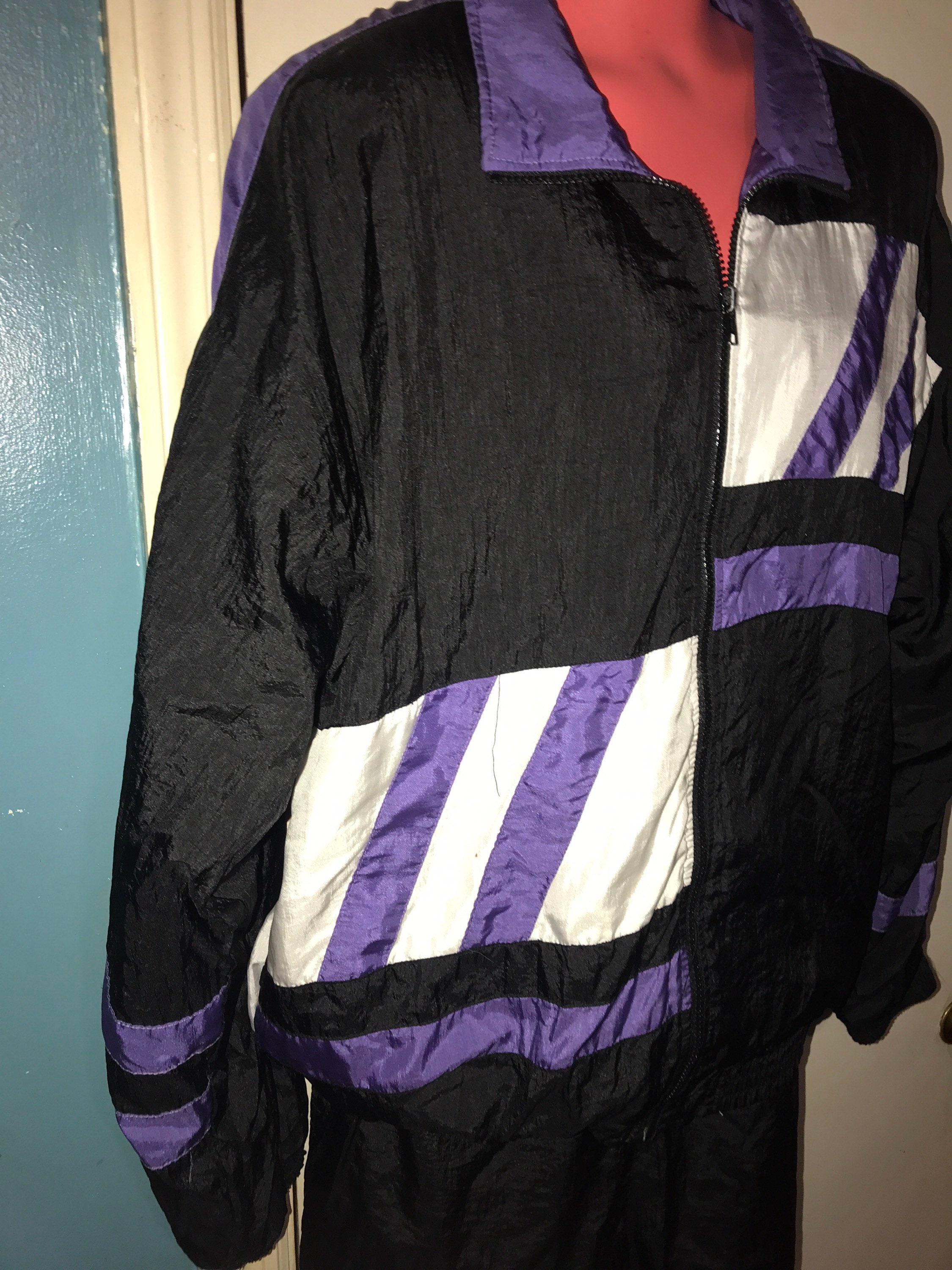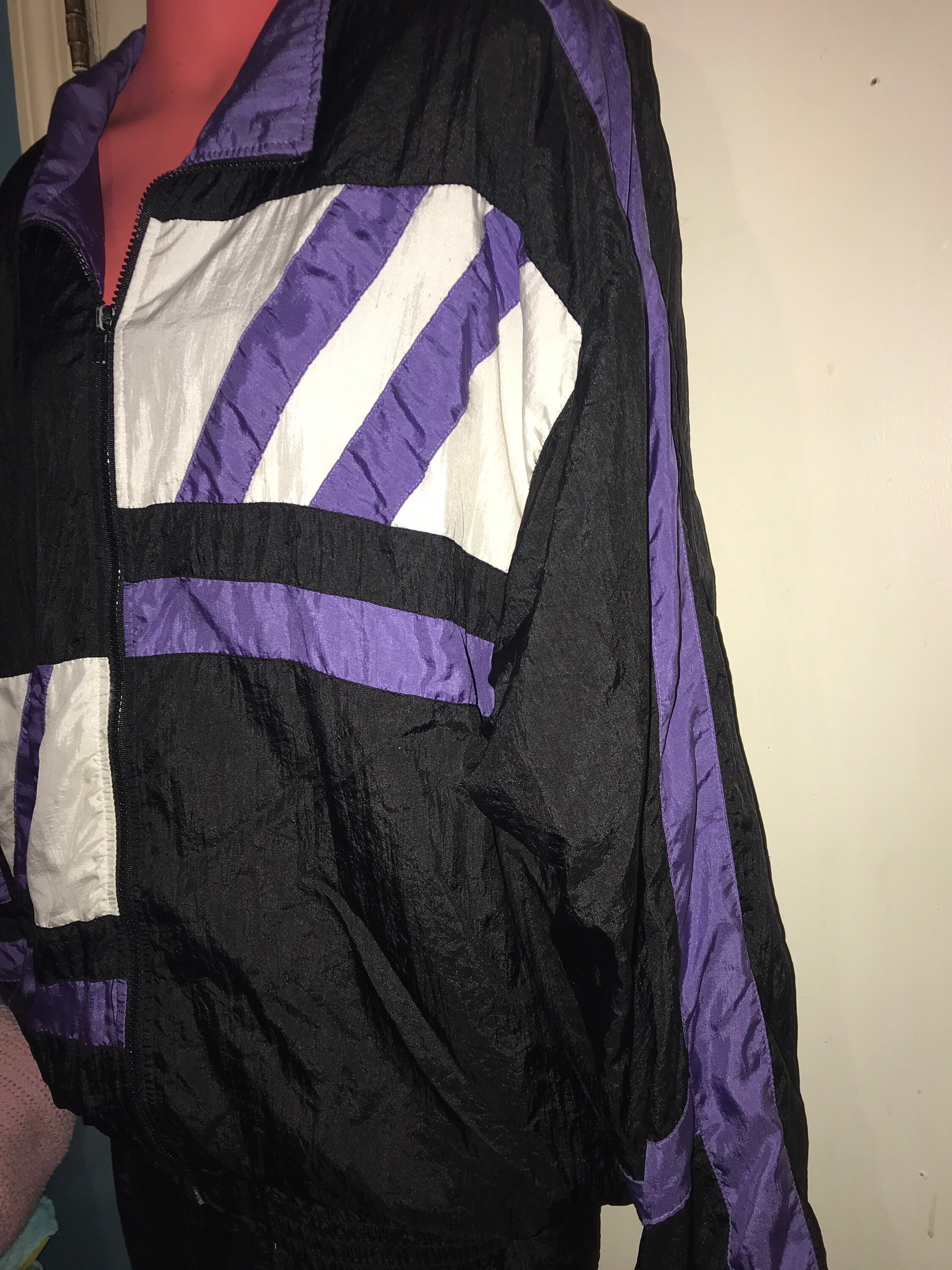 This is a very cool 80’s tracksuit! I love it. It’s black with all black pants and then a purple, white, and black design on the jacket. The pants and jacket both have pockets. The zipper works well on the jacket as well as the two zippers at the bottom of each leg.