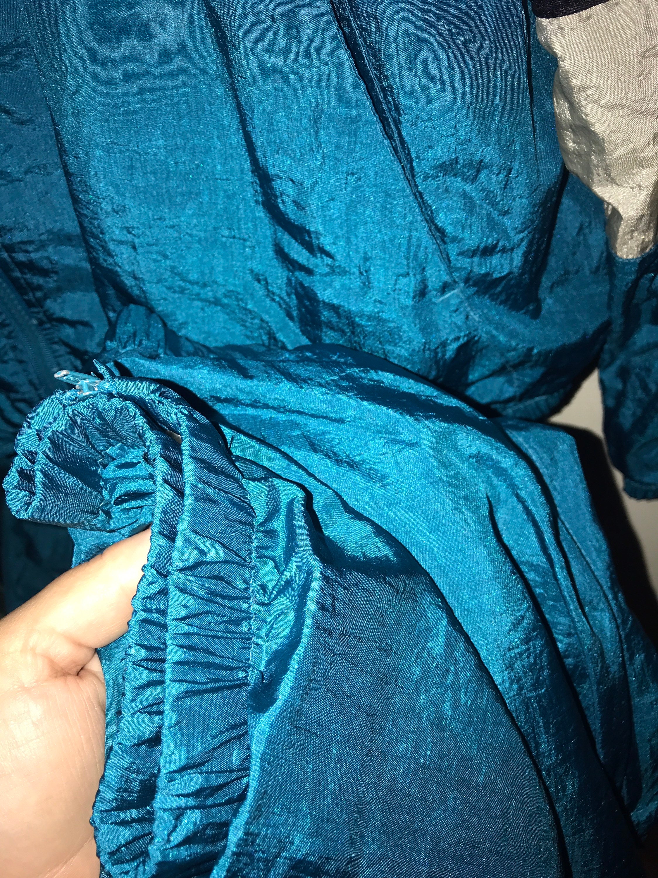 This is a very cool 80’s tracksuit! I love it. It’s a night blue with all blue pants and then with navy and grey accent colors on the jacket. The pants and jacket both have pockets. The zipper works well on the jacket as well as the two zippers at the bottom of each leg.