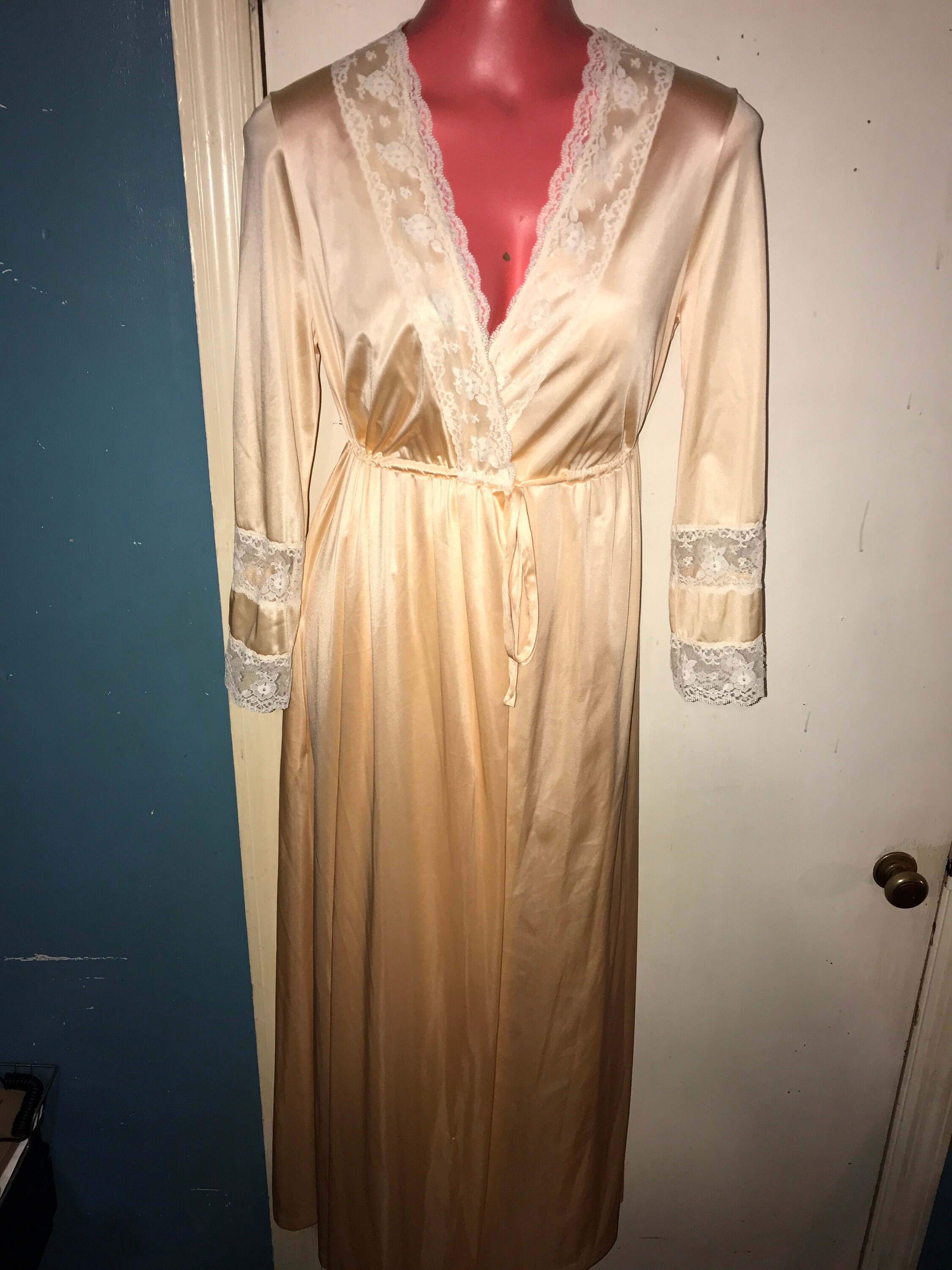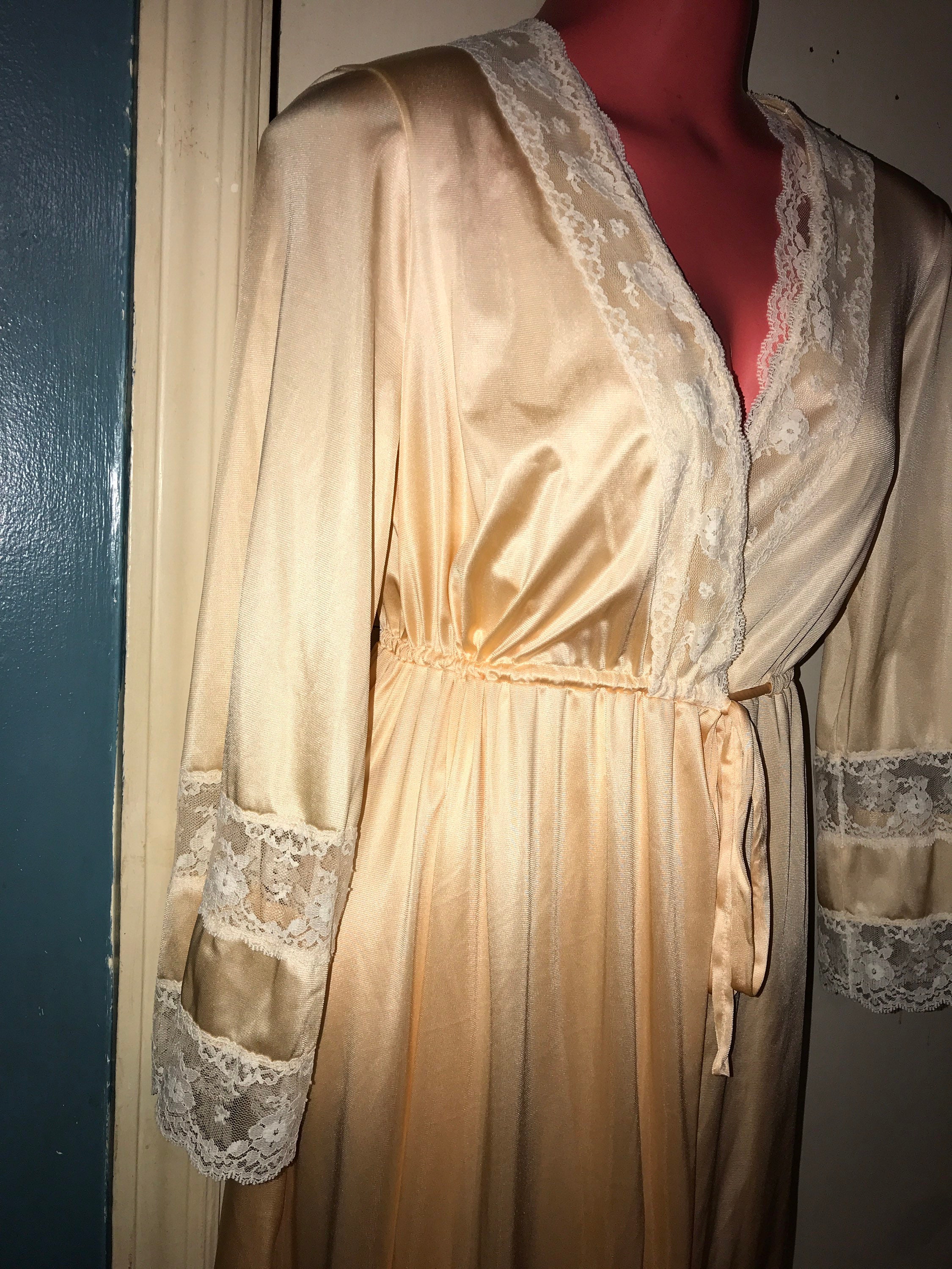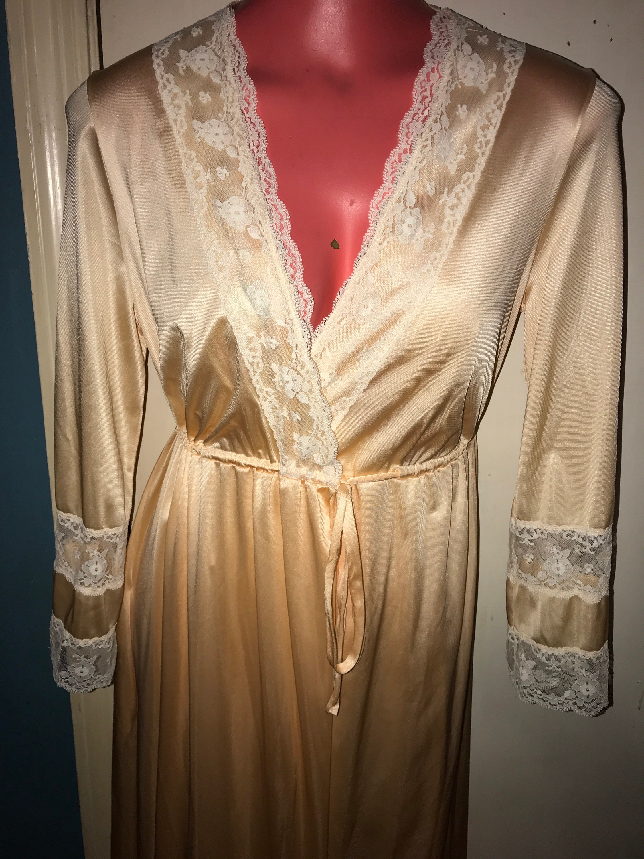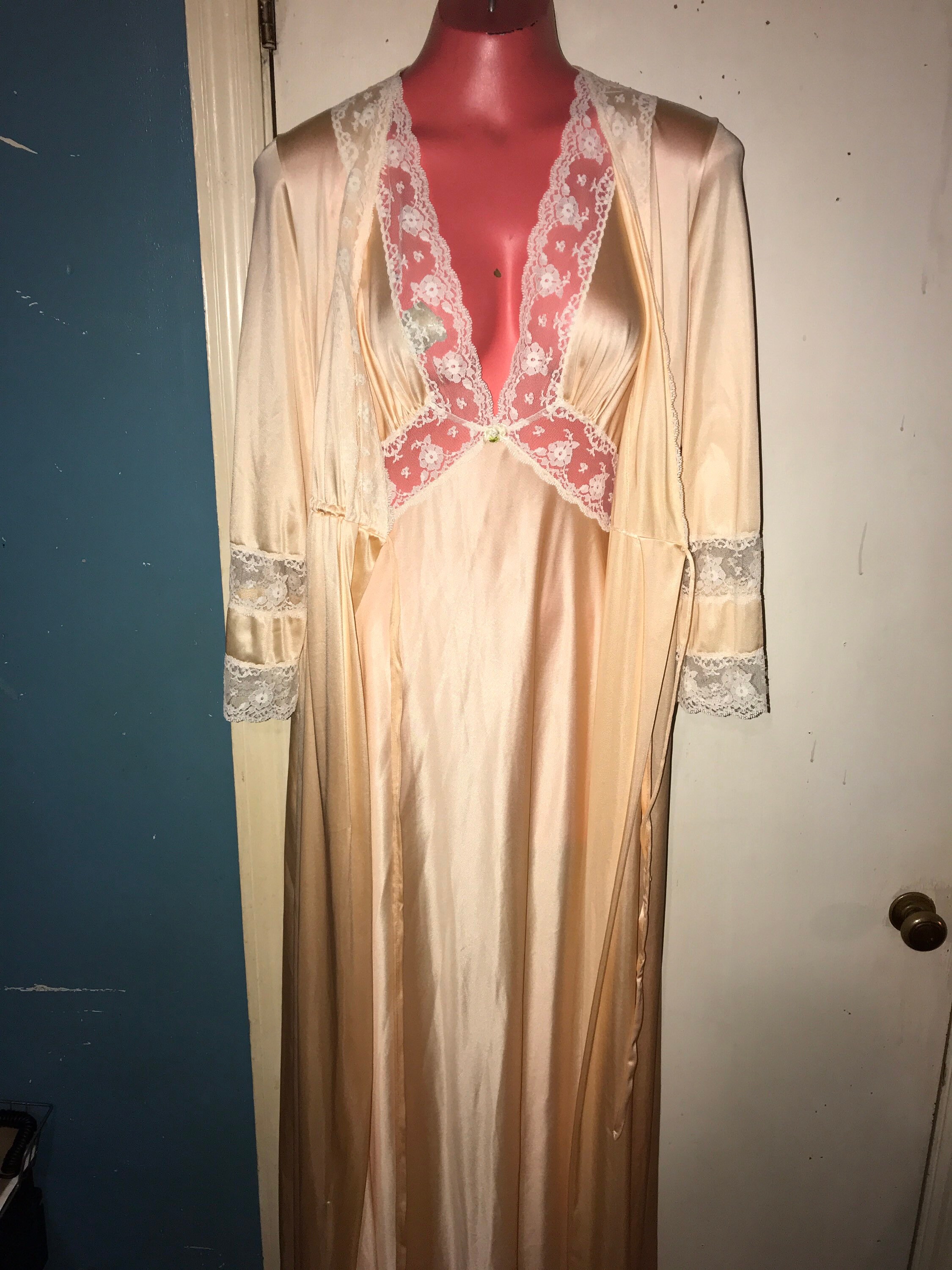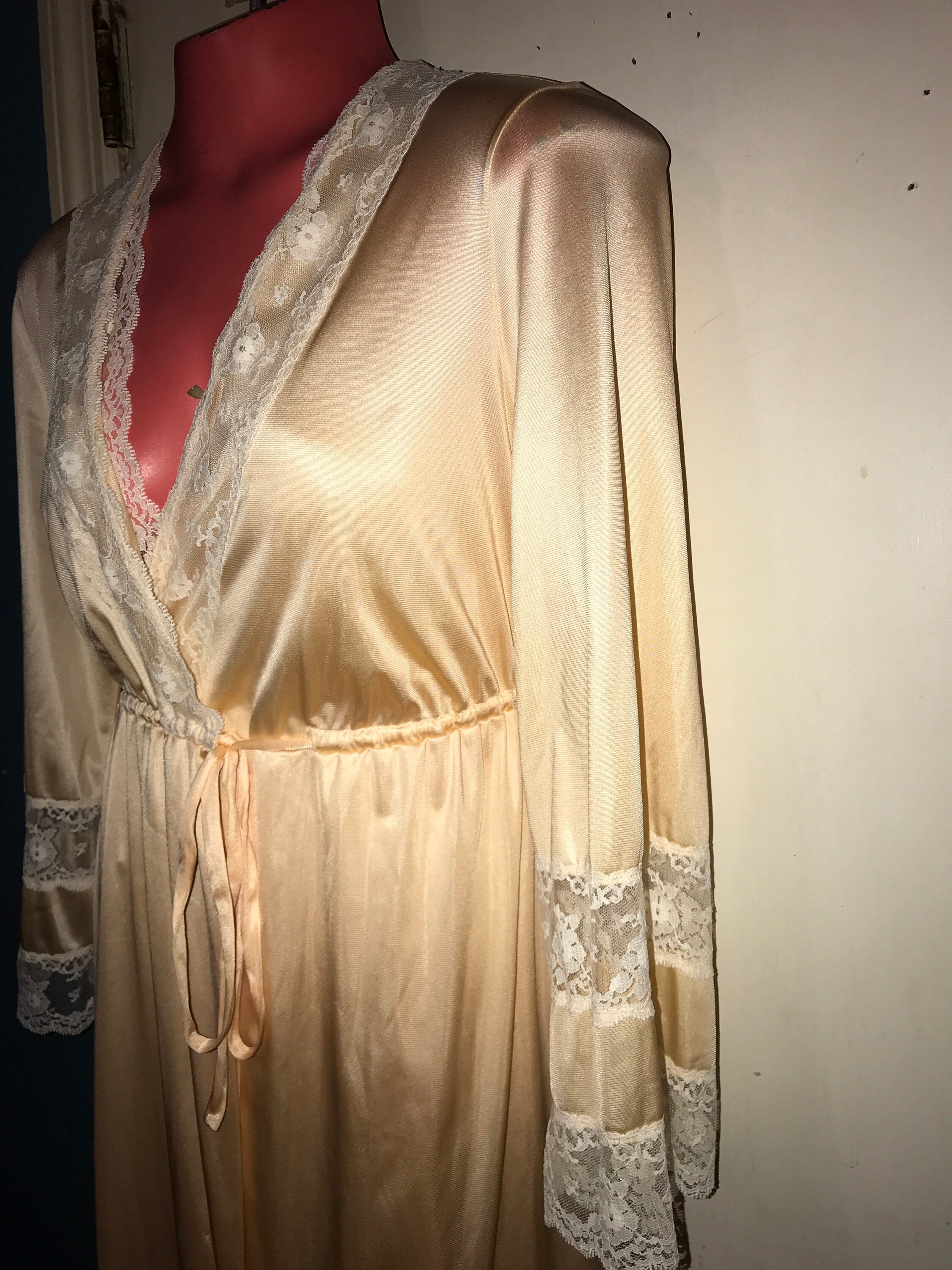 This is a really pretty 1970’s nylon peignoir set, made by JC Penny. It’s a long peachy-yellow lace nightgown with matching robe/dressing gown. It is an absolutely gorgeous set and in good vintage condition.