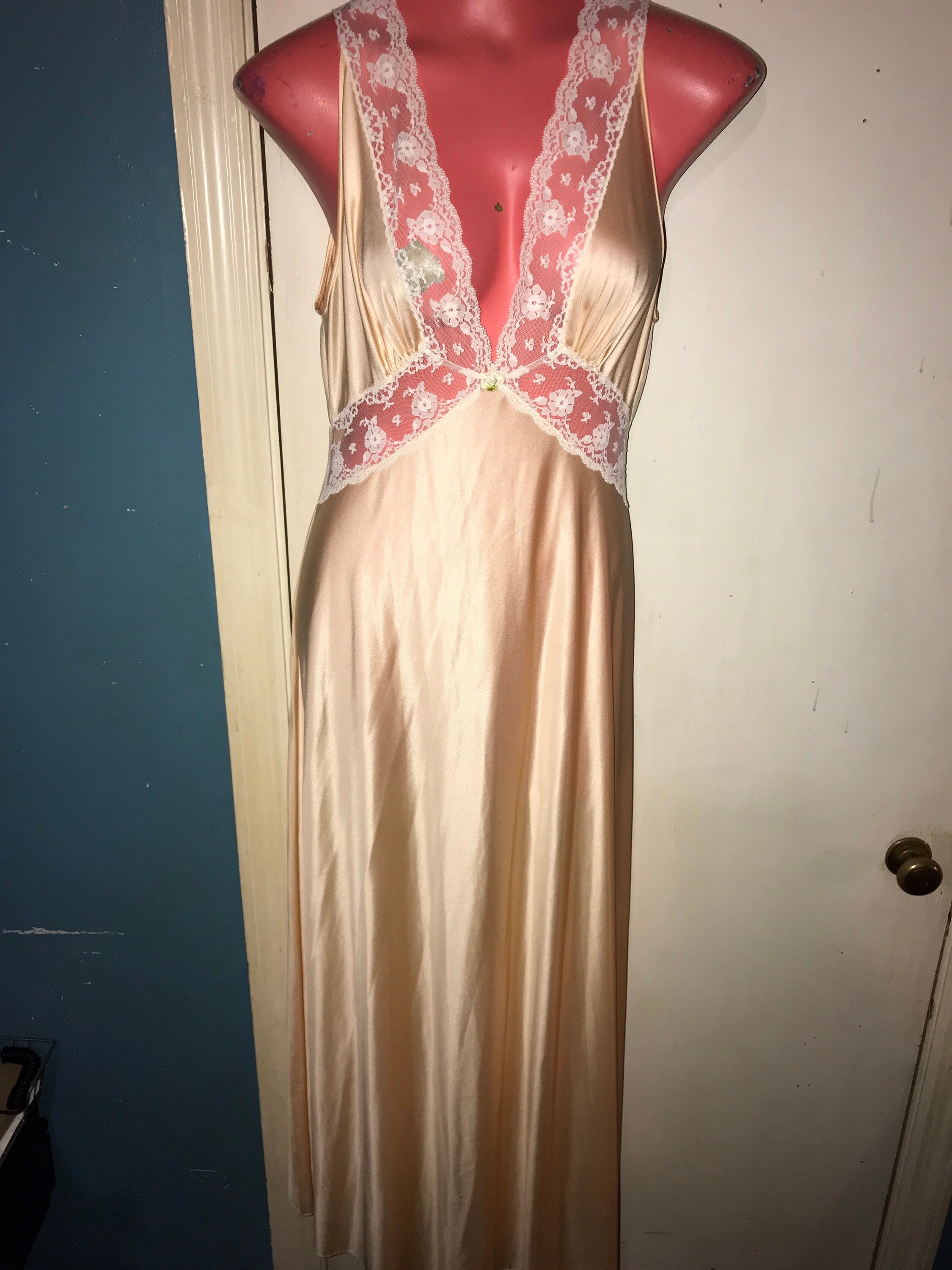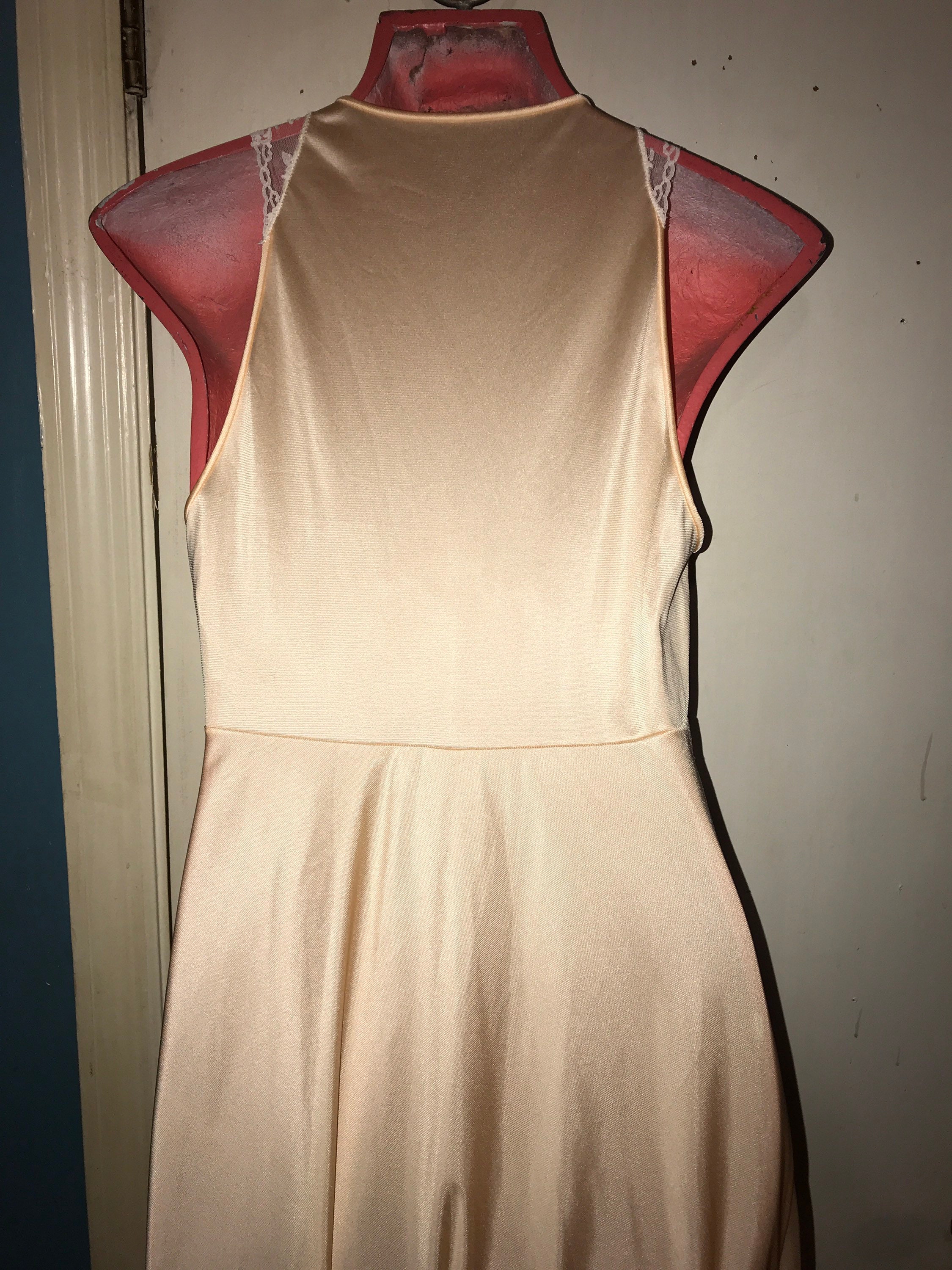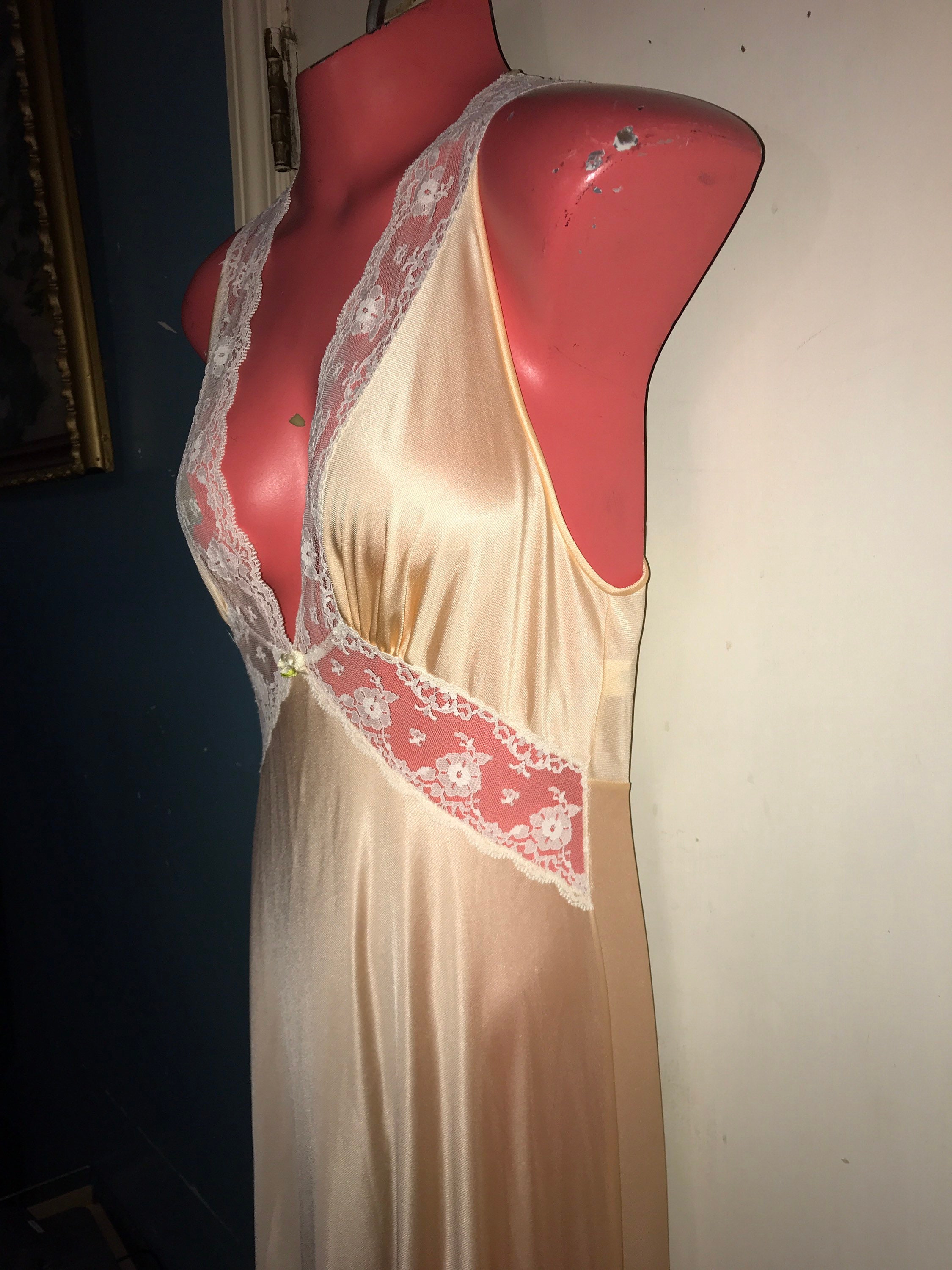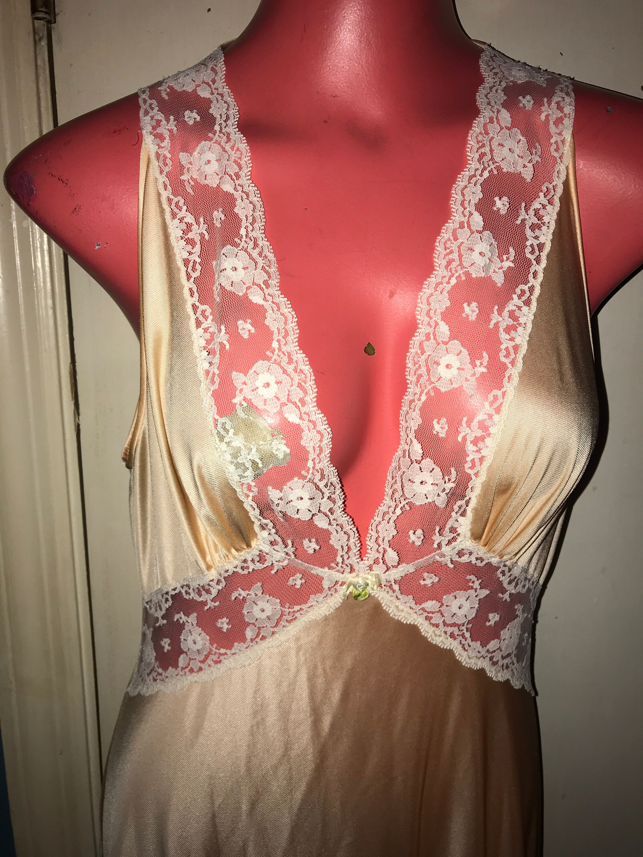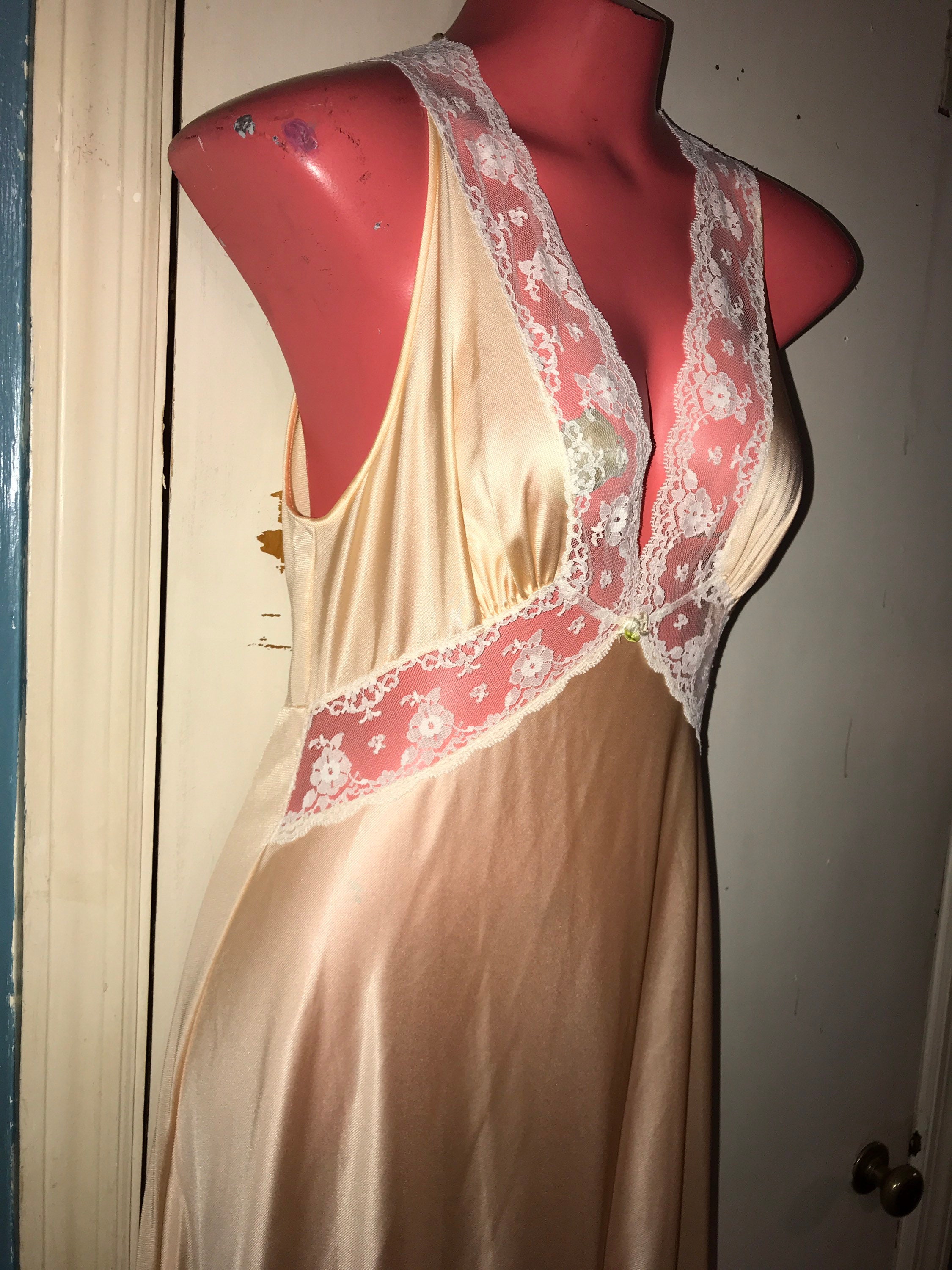 This is a really pretty 1970’s nylon peignoir set, made by JC Penny. It’s a long peachy-yellow lace nightgown with matching robe/dressing gown. It is an absolutely gorgeous set and in good vintage condition.