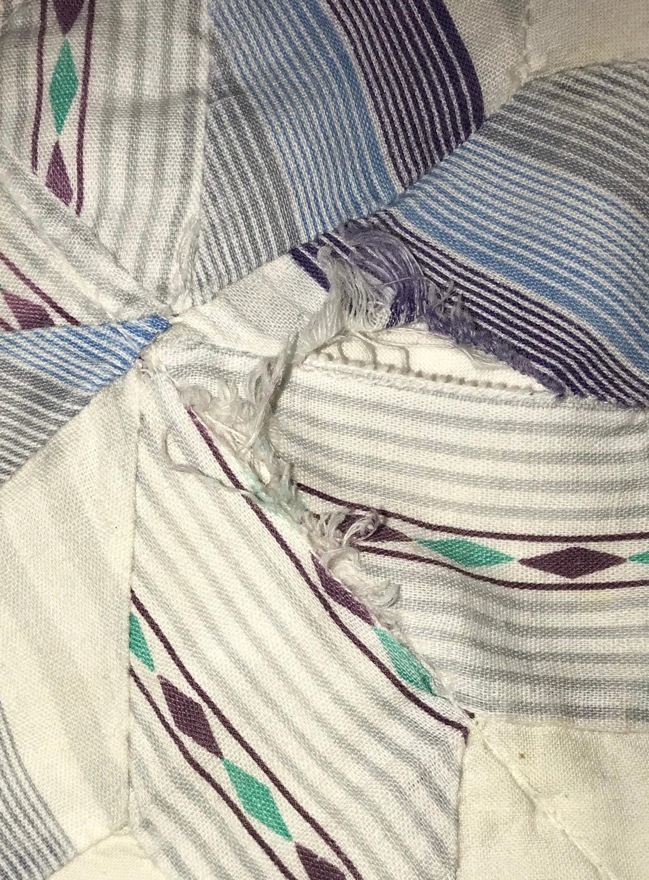 This is a really neat star quilt handmade sometime ago. My guess is the 50’s but I don’t know very much about quilts. This one has some staining and a couple of areas where the material has separated, (see photos).