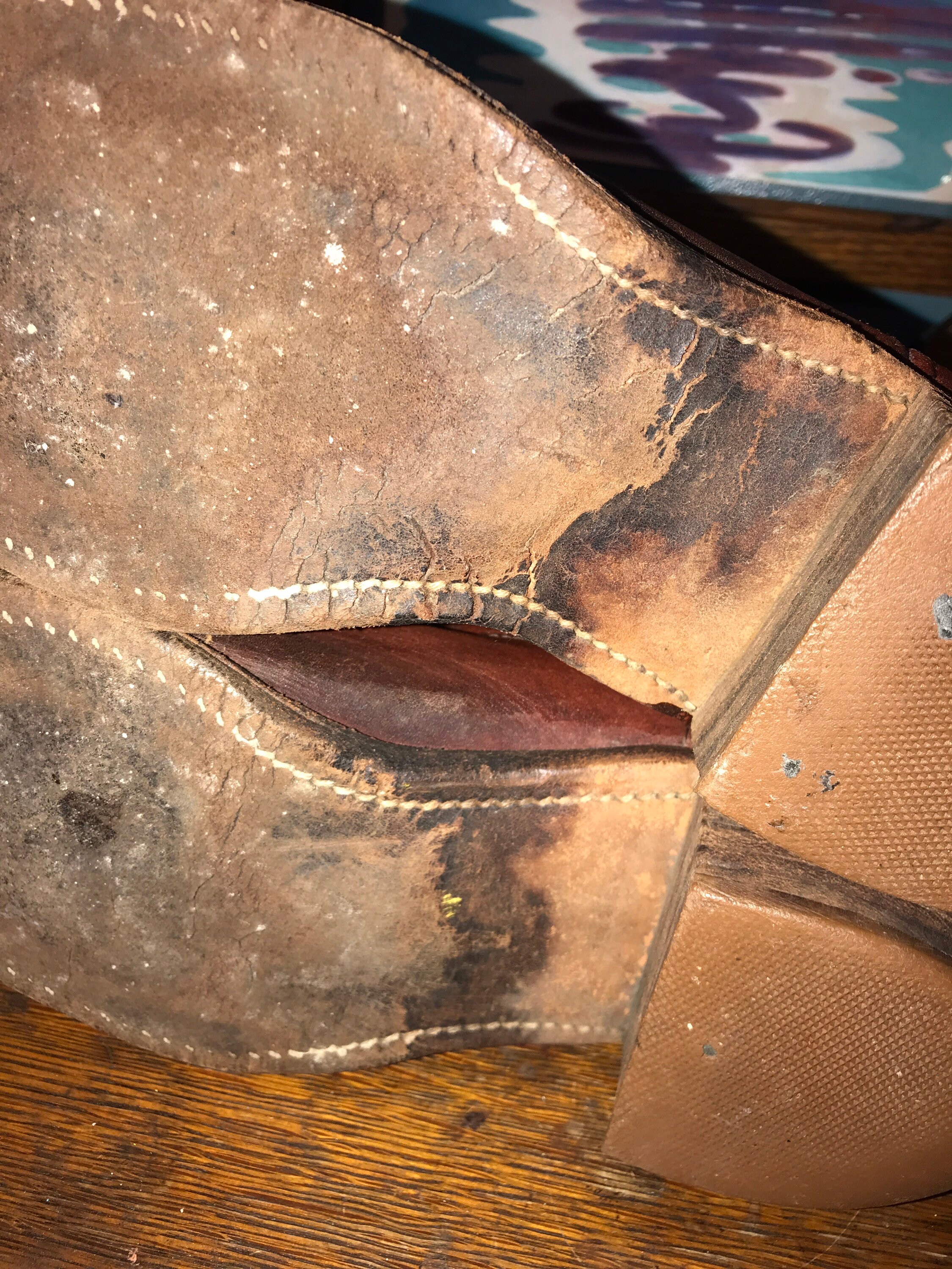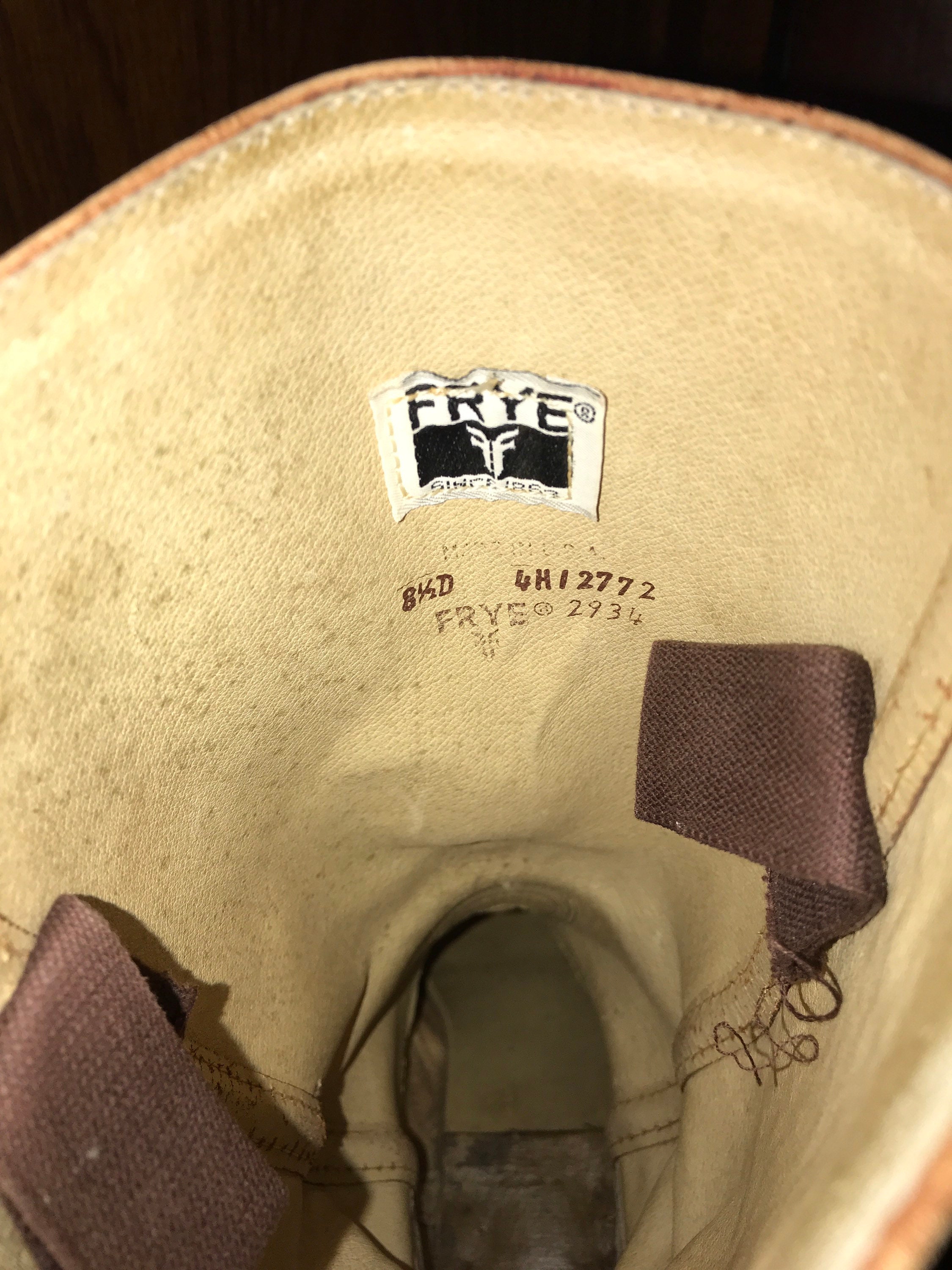 These are super nice all leather brown Frye boots. They look great to me because they have that well loved look of a good boot. But if your looking for brand new vintage Frye boots these aren’t them. These are brown and come up around mid shin or so, the only thing really wrong is the soles, please review all the soles. They are still Very nice boots!