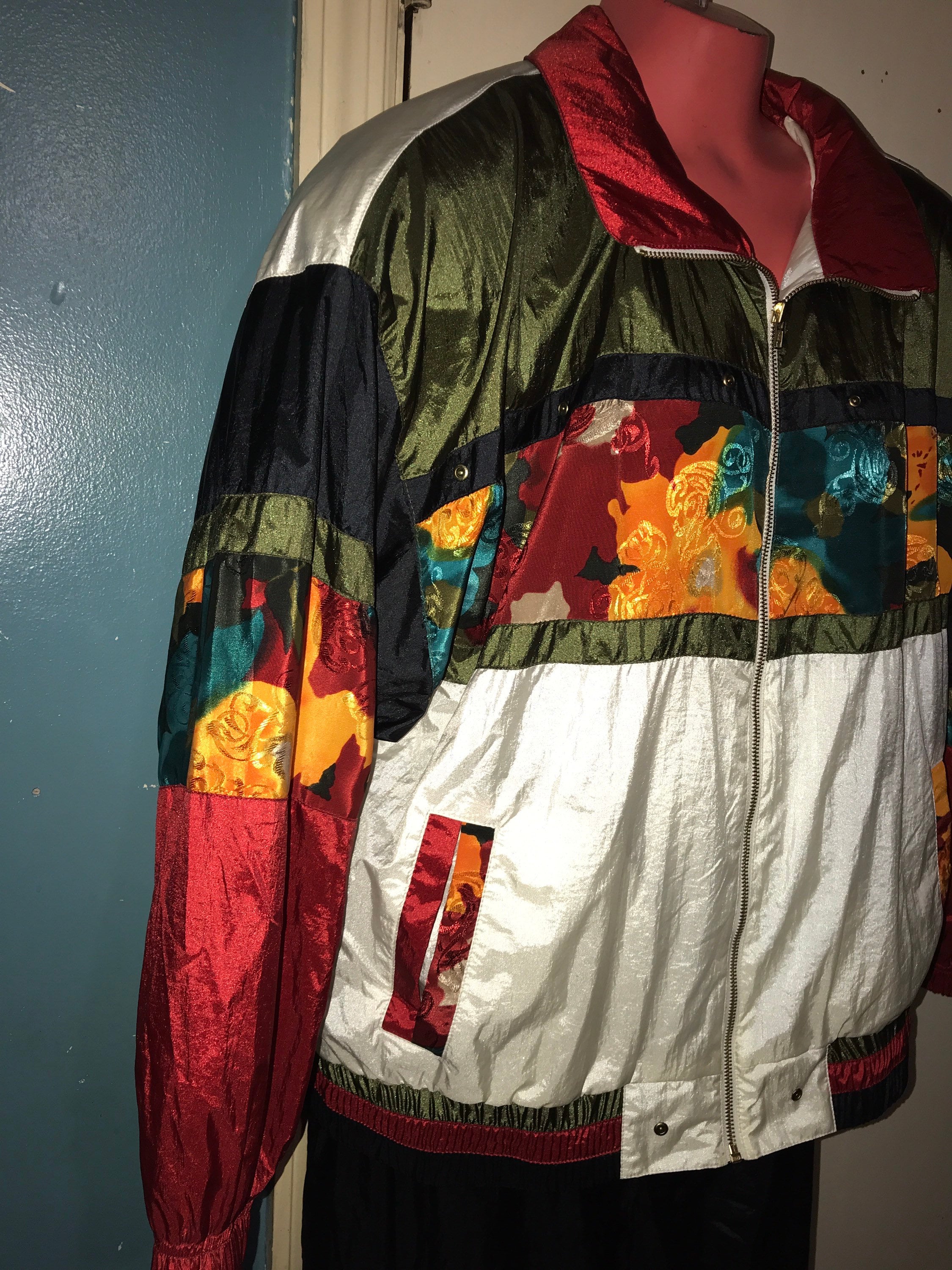 This is an absolutely fabulous 80's windbreaker tracksuit. It has an awesome look to the jacket with the main color being black and the gold bling and what not. The jacket is great and has two front pockets and is lined and also has built in shoulder pads. The lined pants have side pockets, and a drawstring waist and no zippers at the ankles.