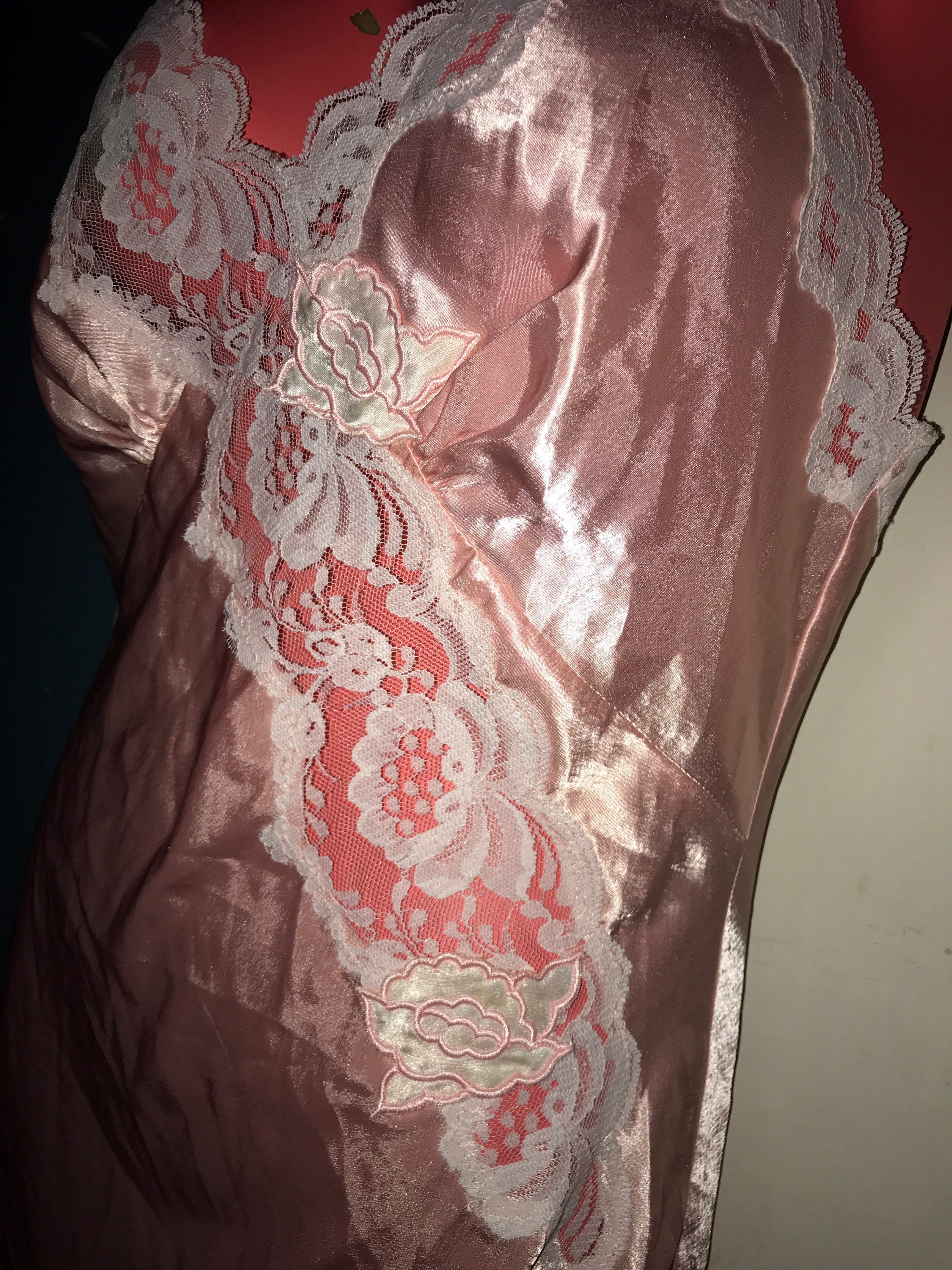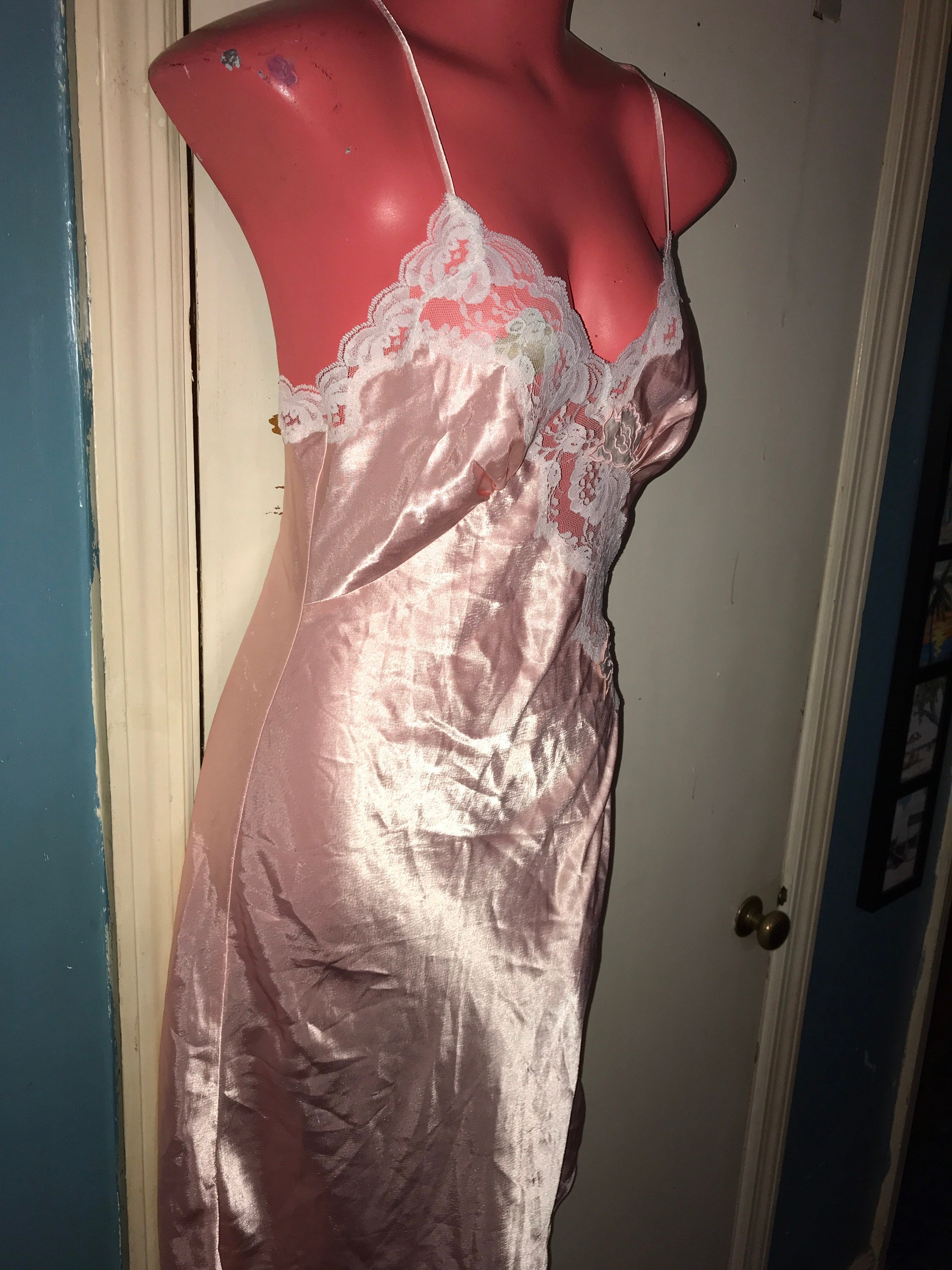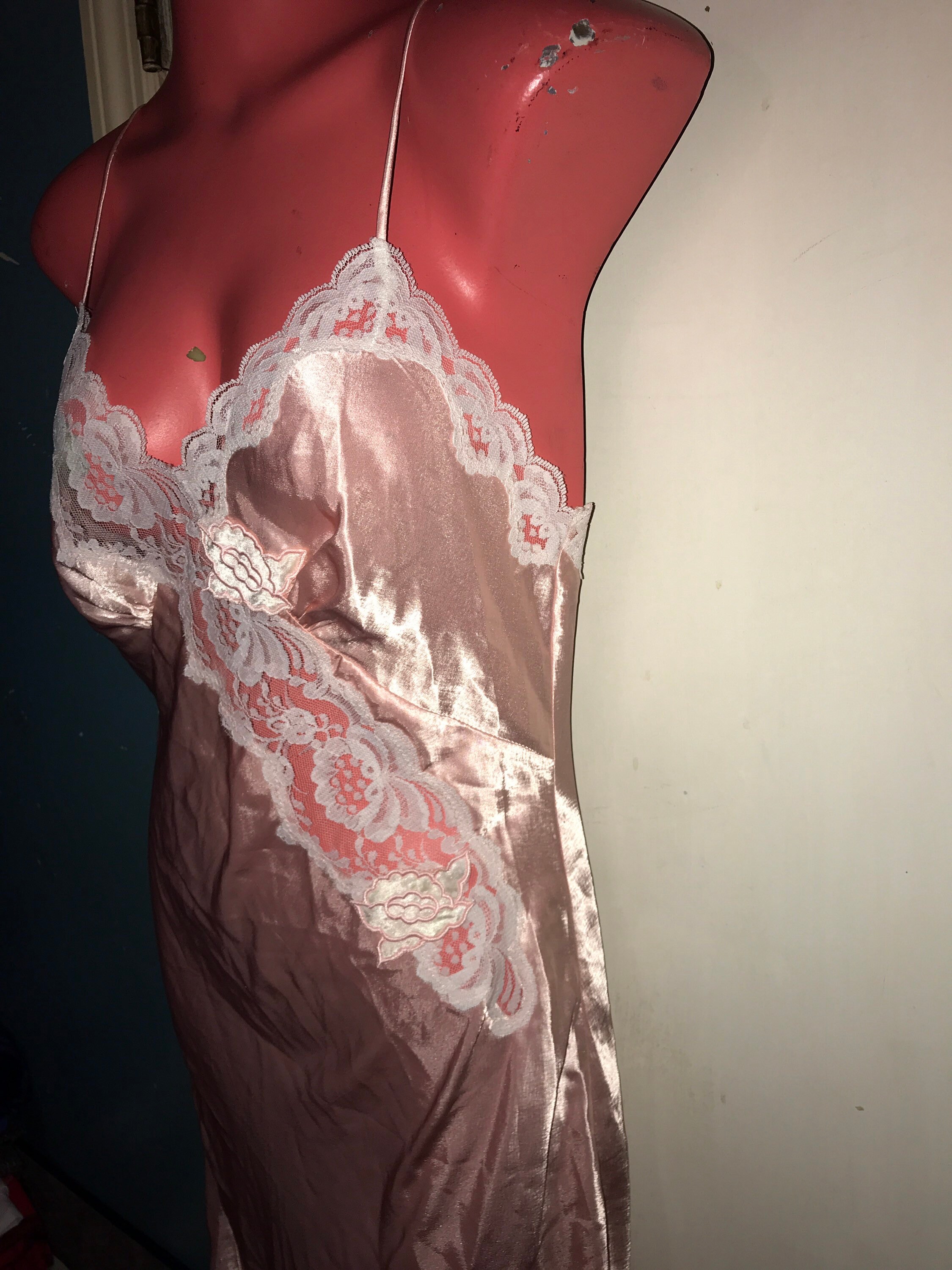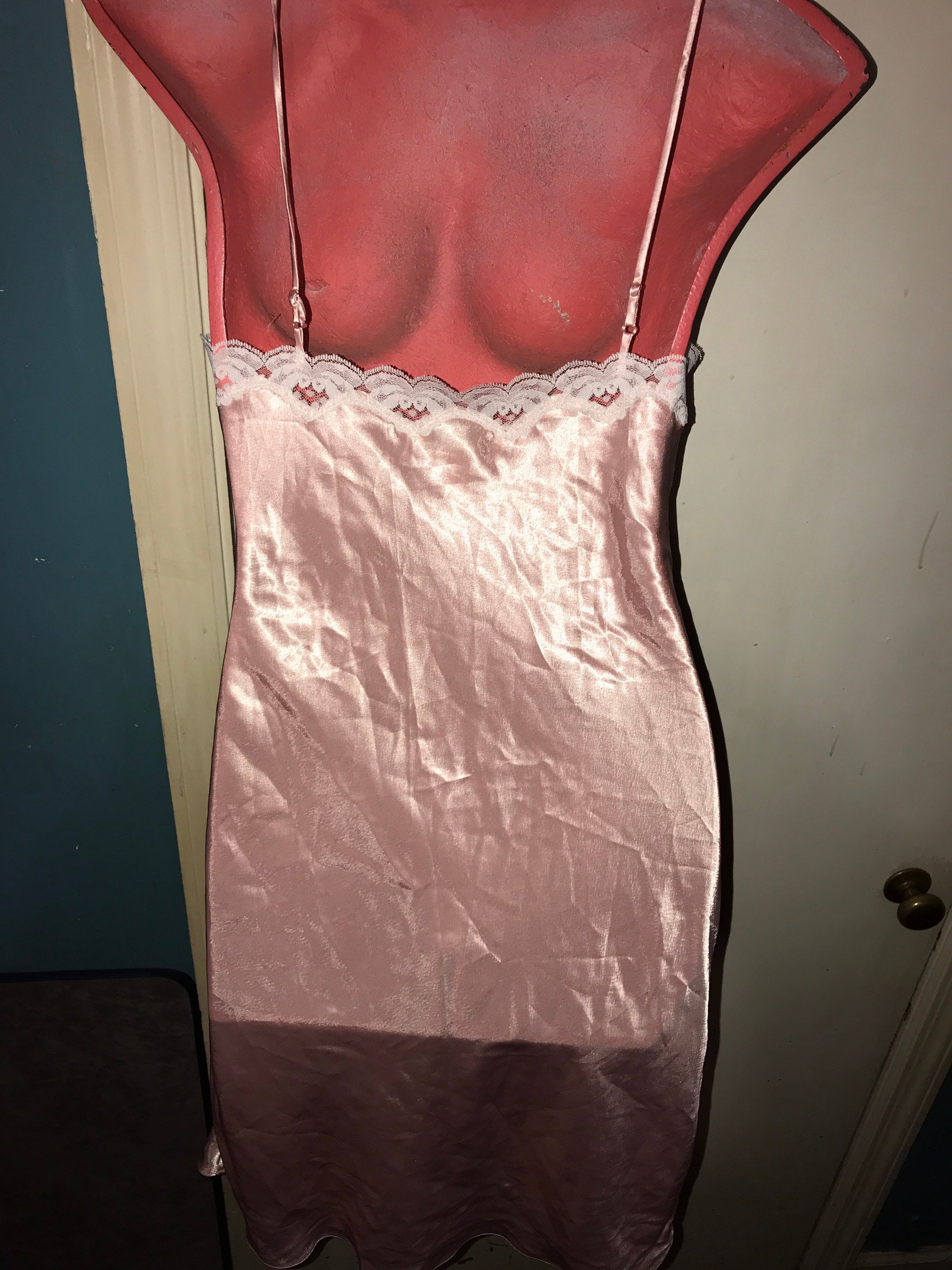 This is a very pretty mid length pink satin and lace nightie by Victoria’s Secret. It has adjustable straps. It’s really nice and sexy too! It’s in good condition.