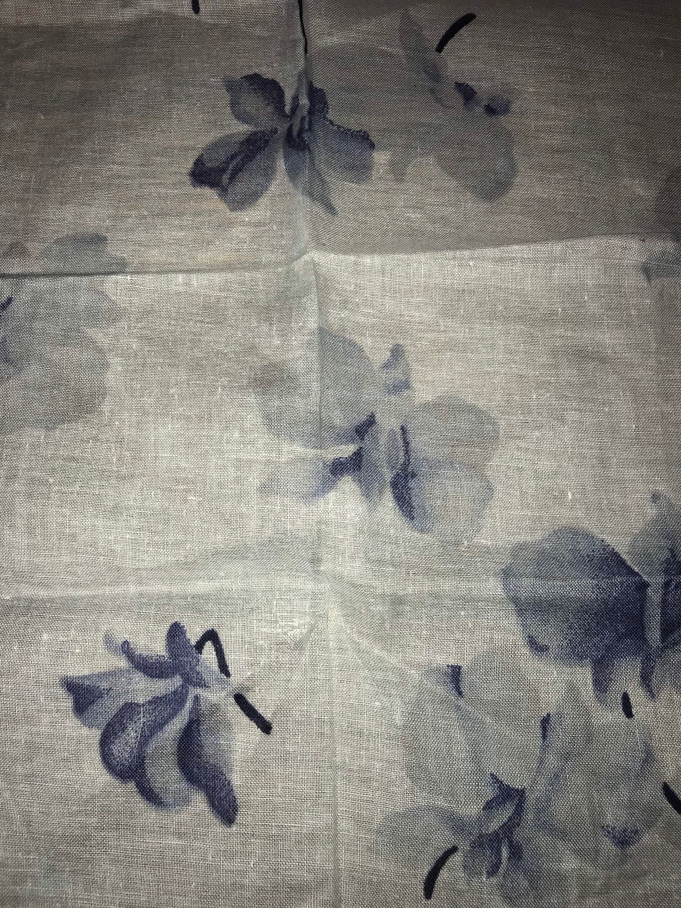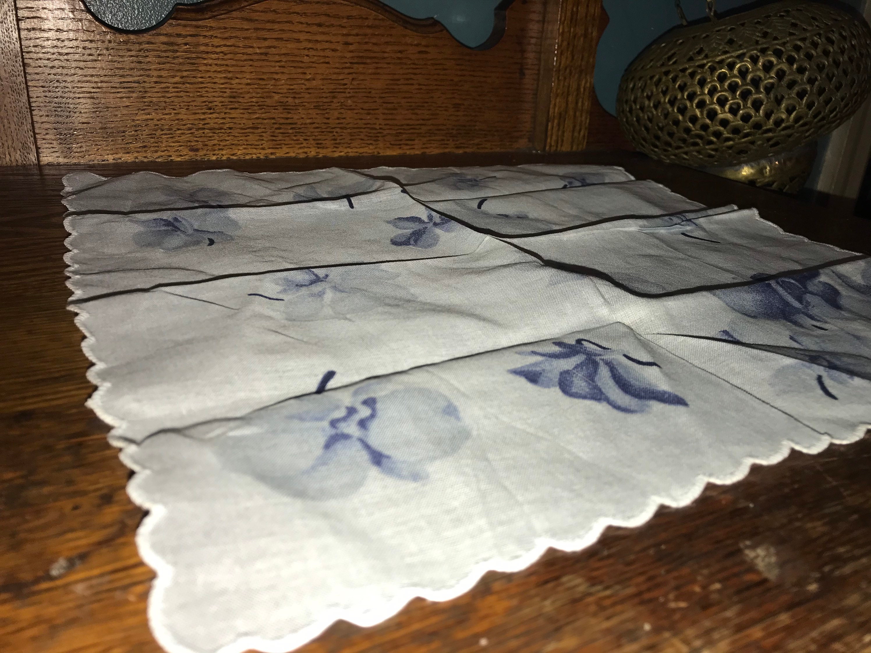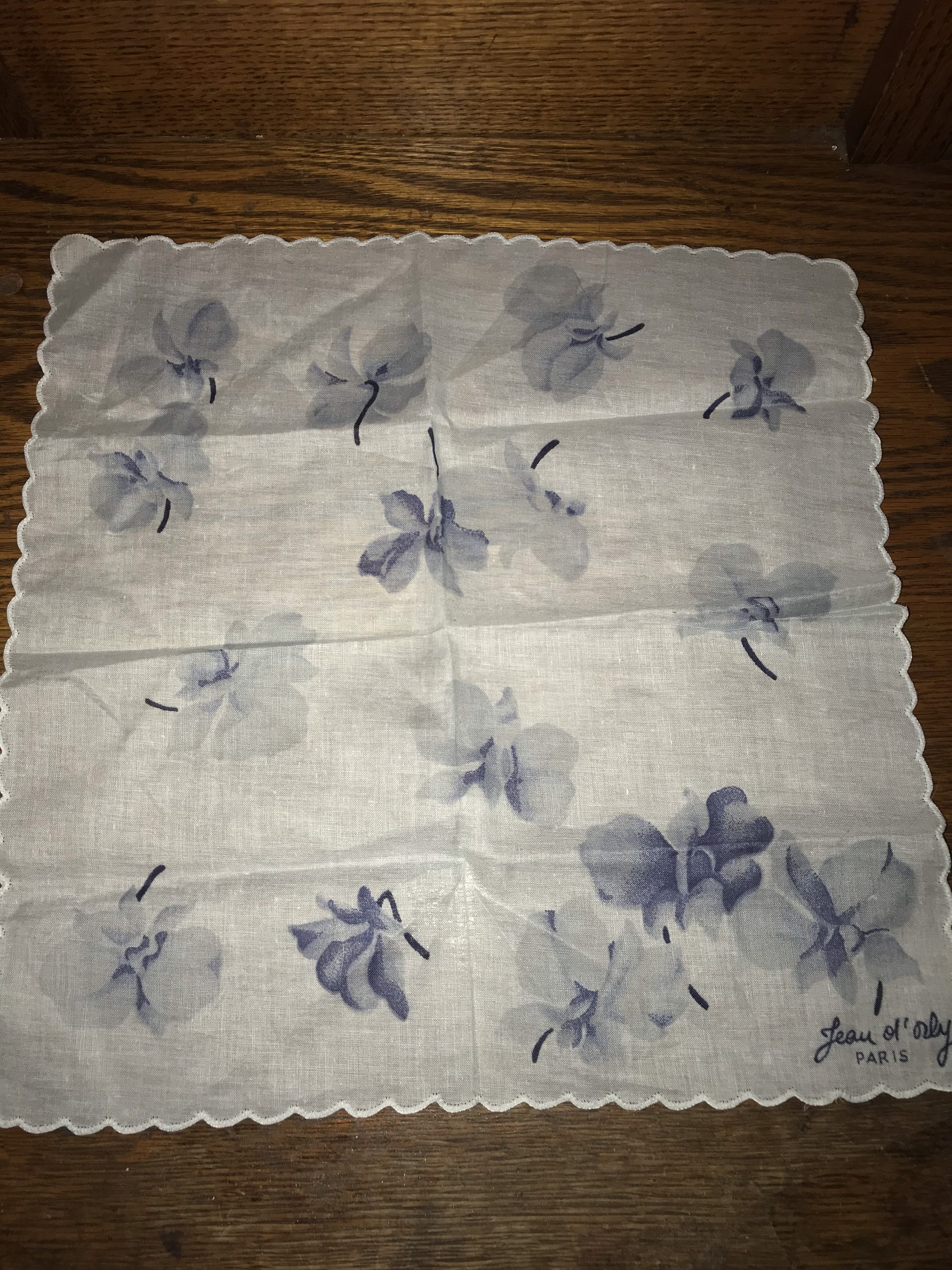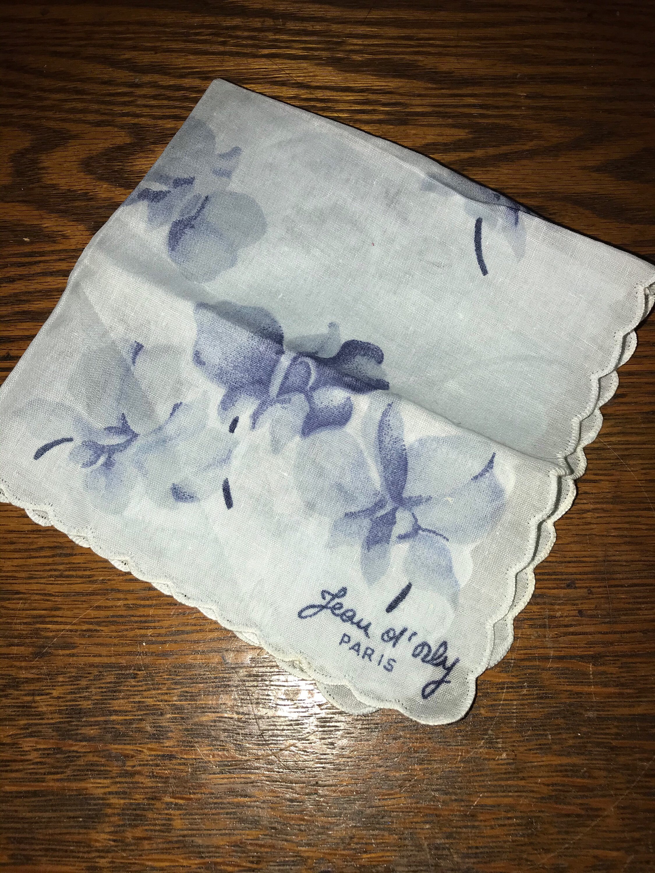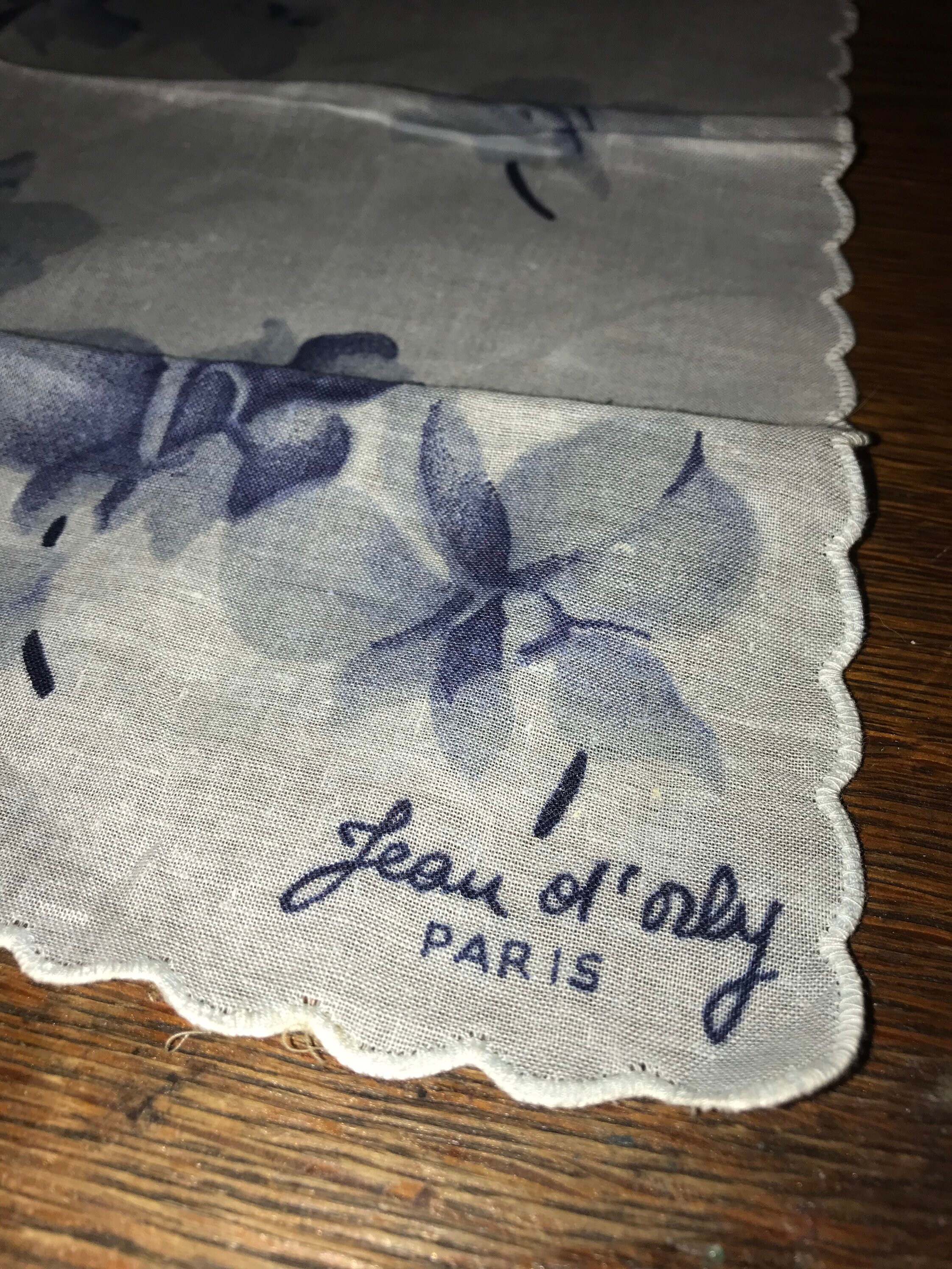 Gorgeous 1950's French handkerchief by a Jean Ol’ Orly! With a beautiful design of blue on blue flowers. The edges are scalloped. It's in good vintage condition. Its so lovely