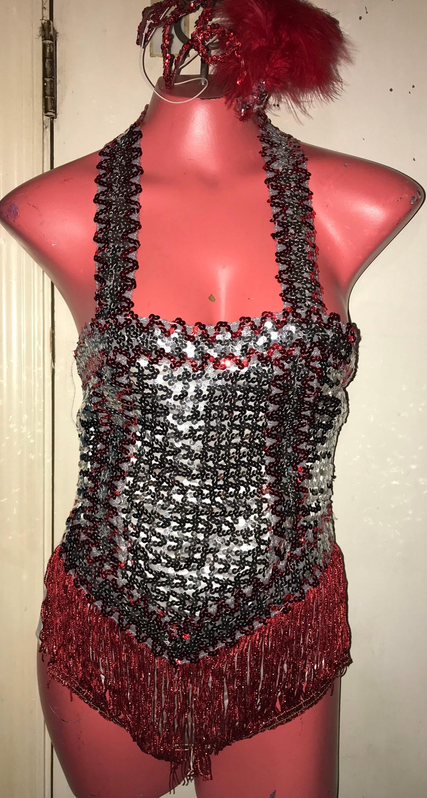 This is a pretty little 1960’s tap dance costume. It was originally used for a dance recital. It is all sequin and shows some wear and tear as probable for its age but all in all it’s in good vintage condition! It is to be dry cleaned and I have not done that. It includes, A sequin leotard that ties are the back and two arm pieces and a hat.