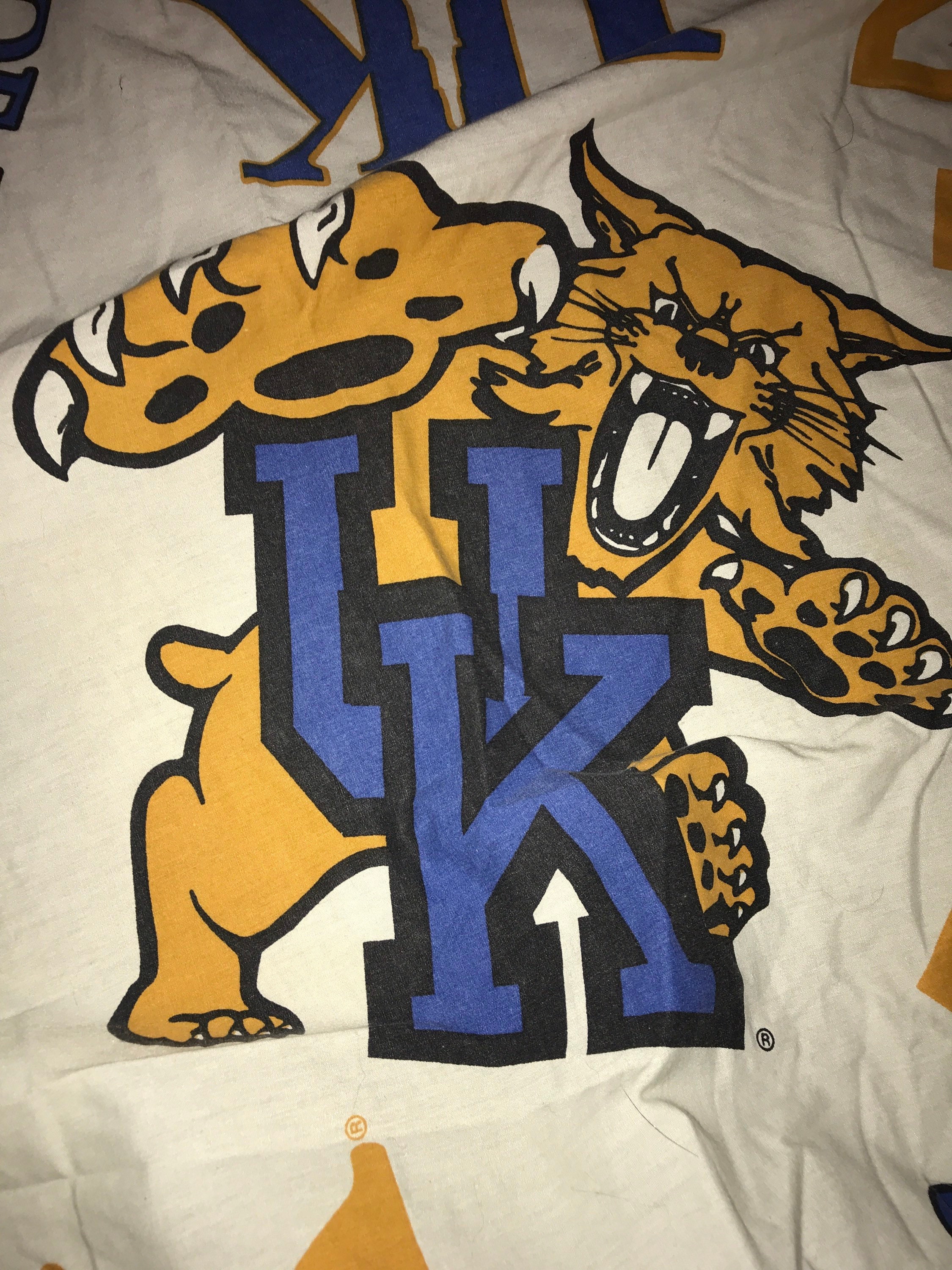 What a great Kentucky Wildcats fitted bed sheet! It’s cool, I’ve actually never seen one like this before. Its in good vintage condition.