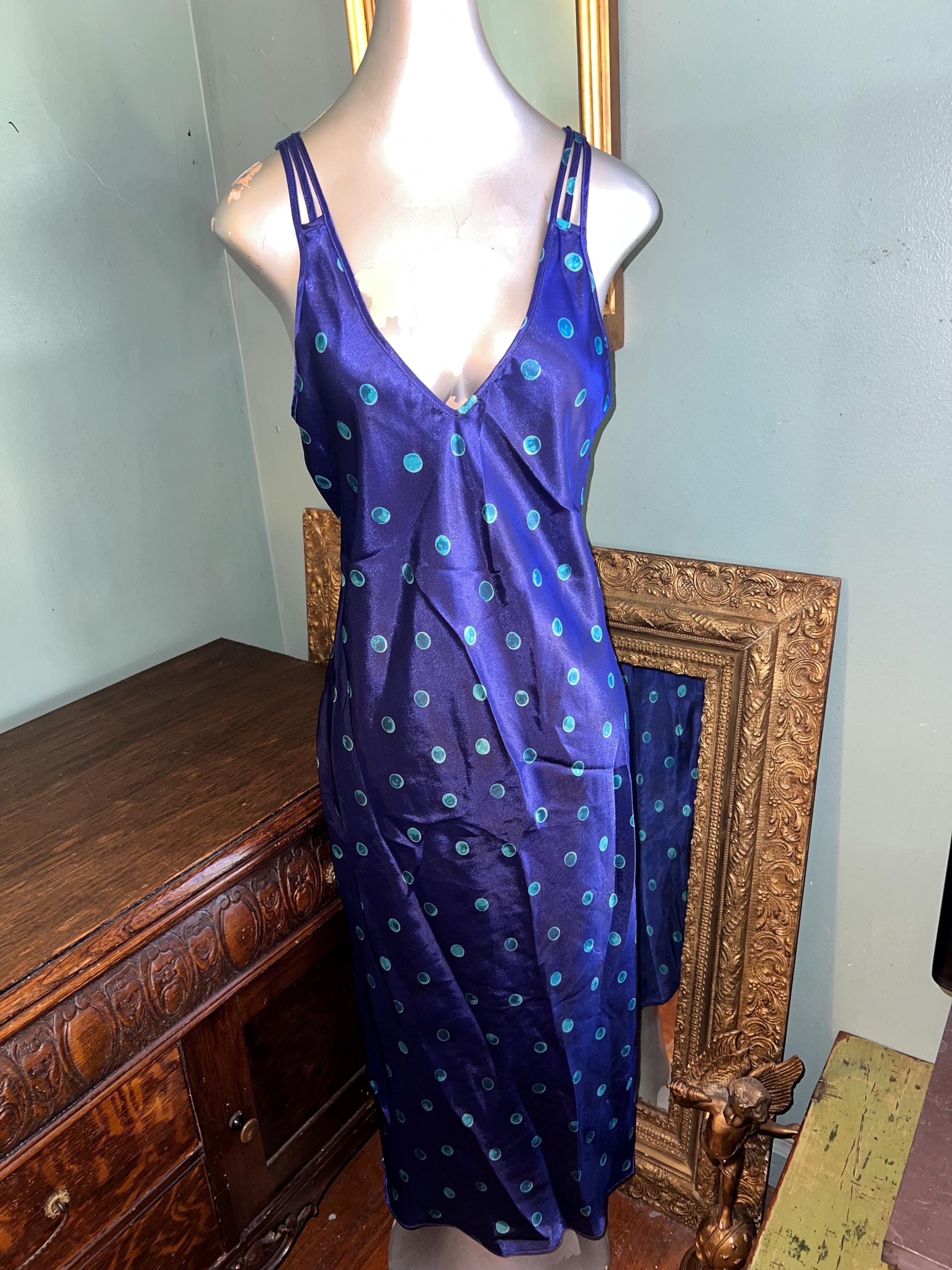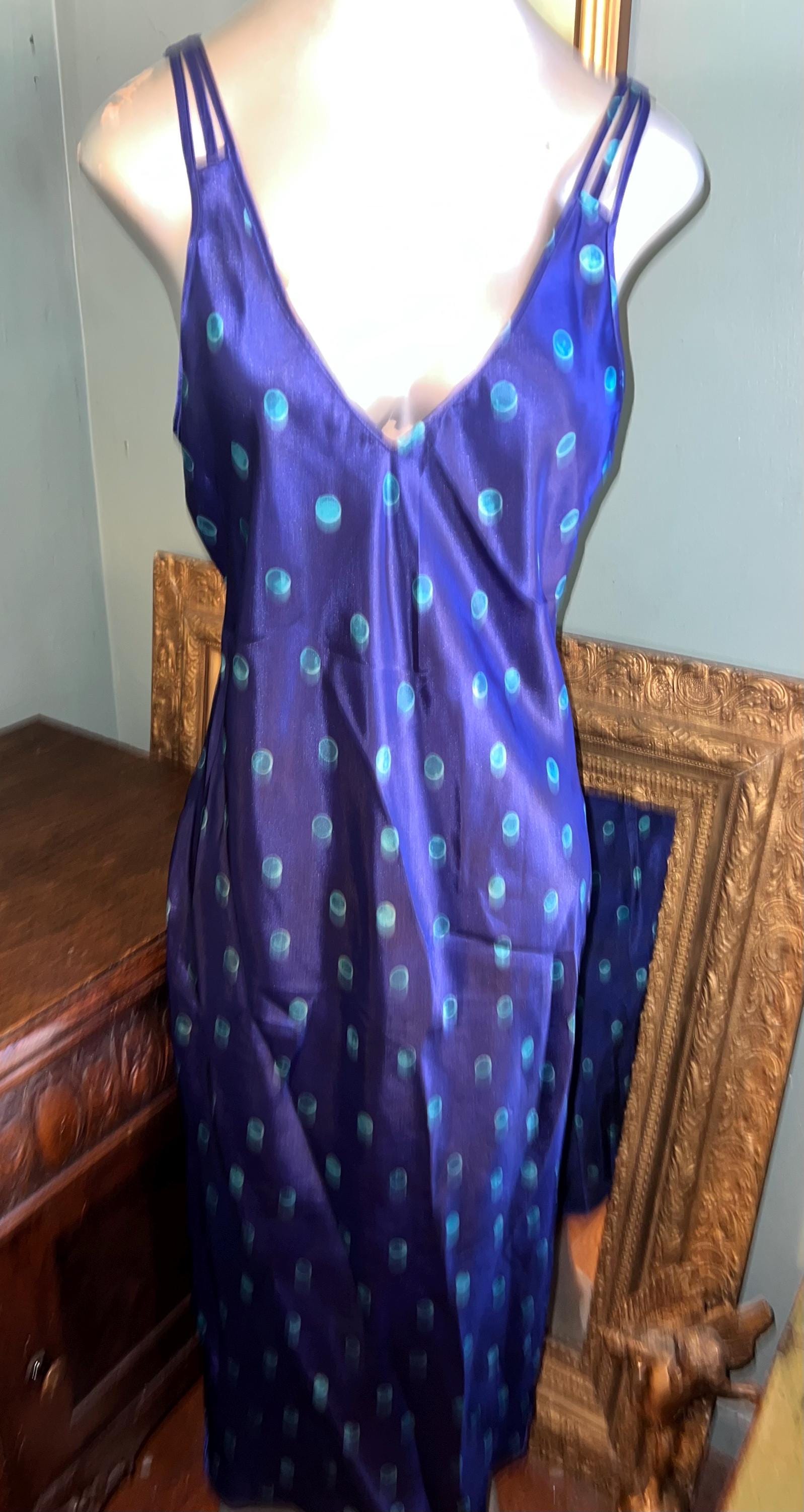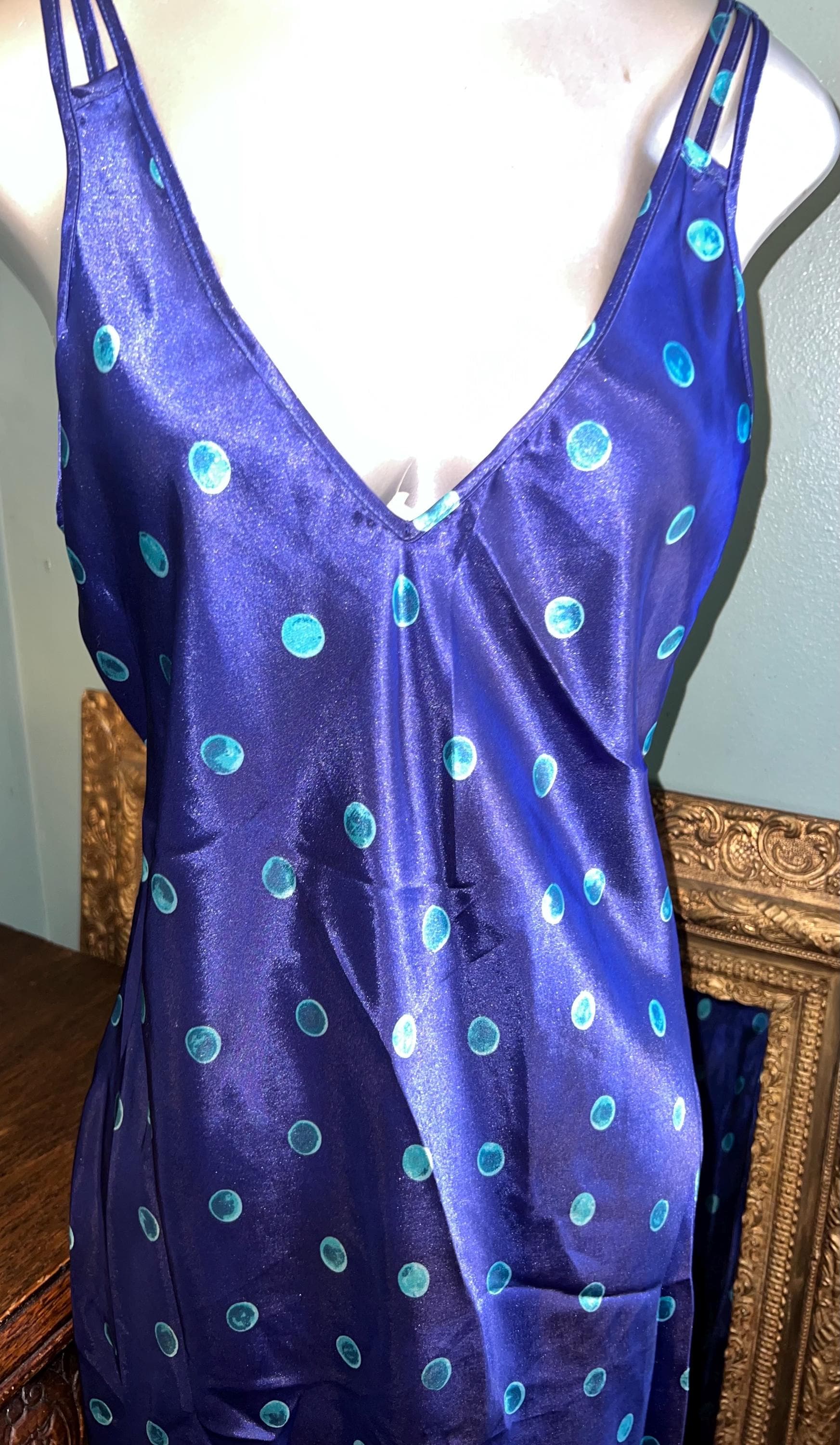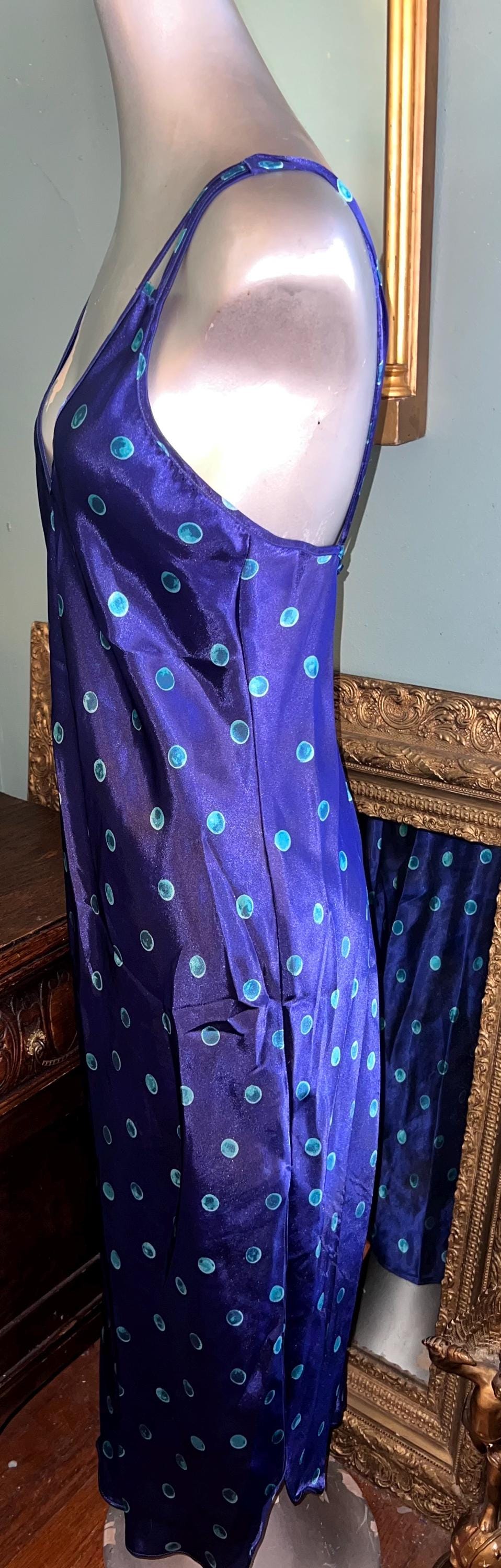 This is a very pretty long blue (blue is so deep it’s almost purple) with turquoise polka dots satin nightgown from the 90’s. It is a long nightgown with a slit up each side. The straps are NON adjustable which could be fixed if you felt like cutting and sewing but should fit most people. It’s in good vintage condition.
