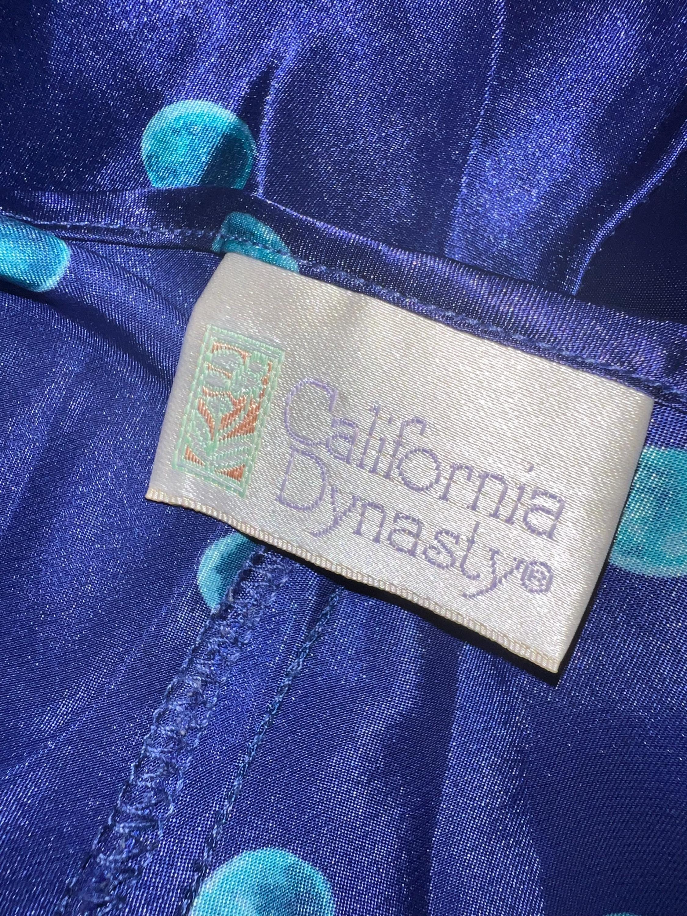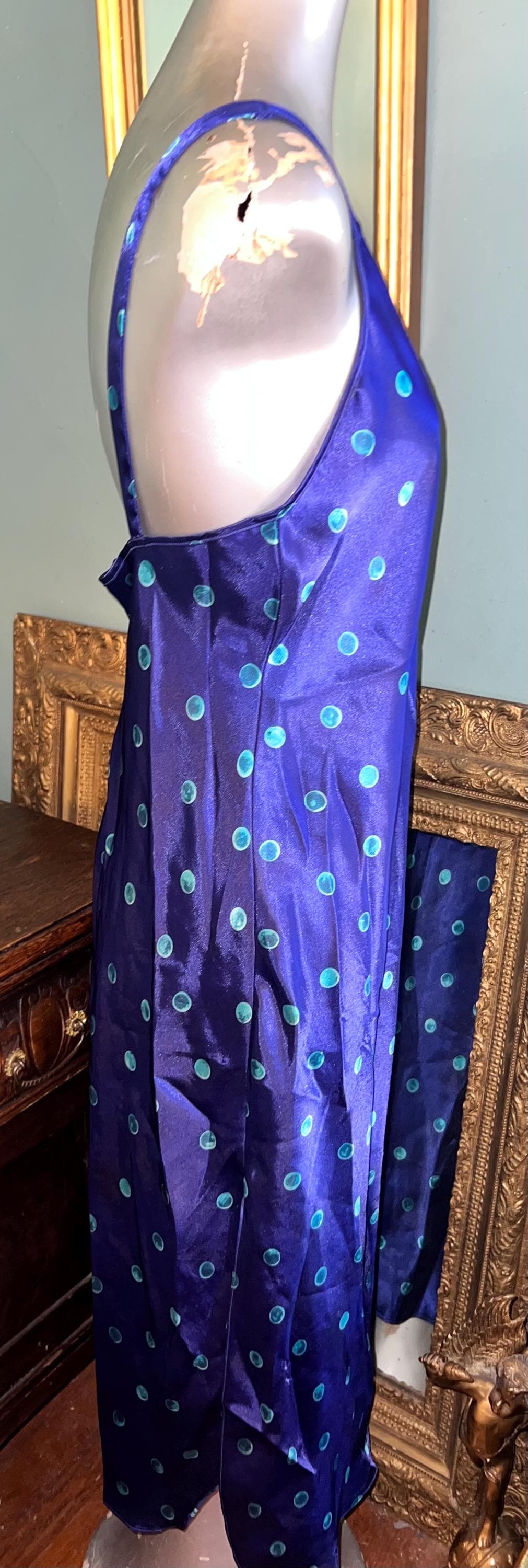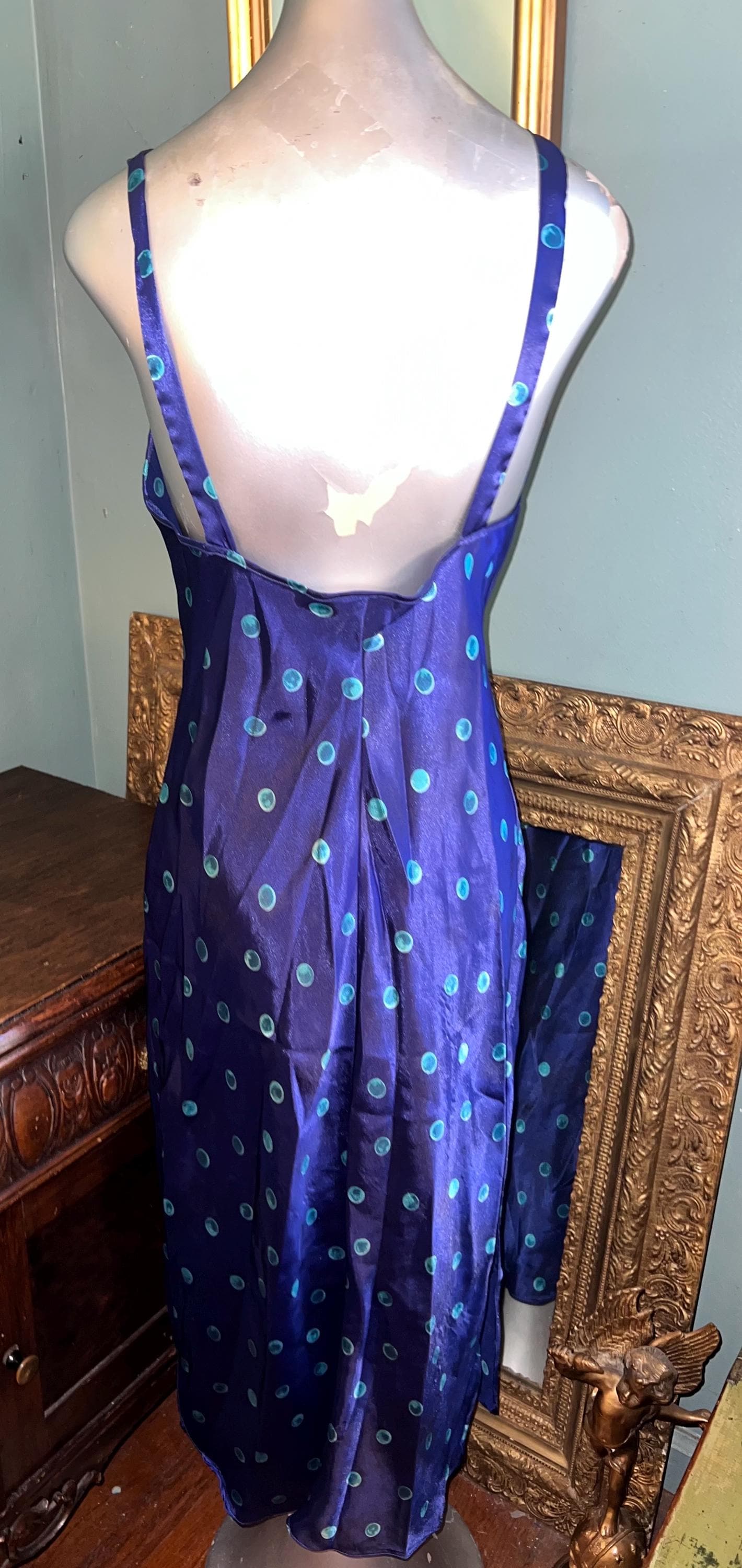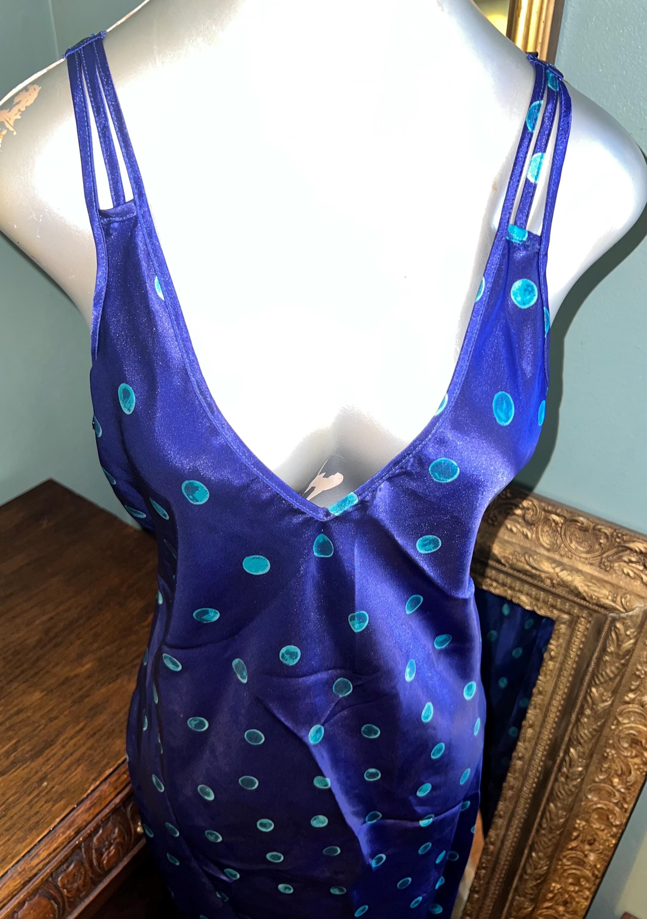 This is a very pretty long blue (blue is so deep it’s almost purple) with turquoise polka dots satin nightgown from the 90’s. It is a long nightgown with a slit up each side. The straps are NON adjustable which could be fixed if you felt like cutting and sewing but should fit most people. It’s in good vintage condition.