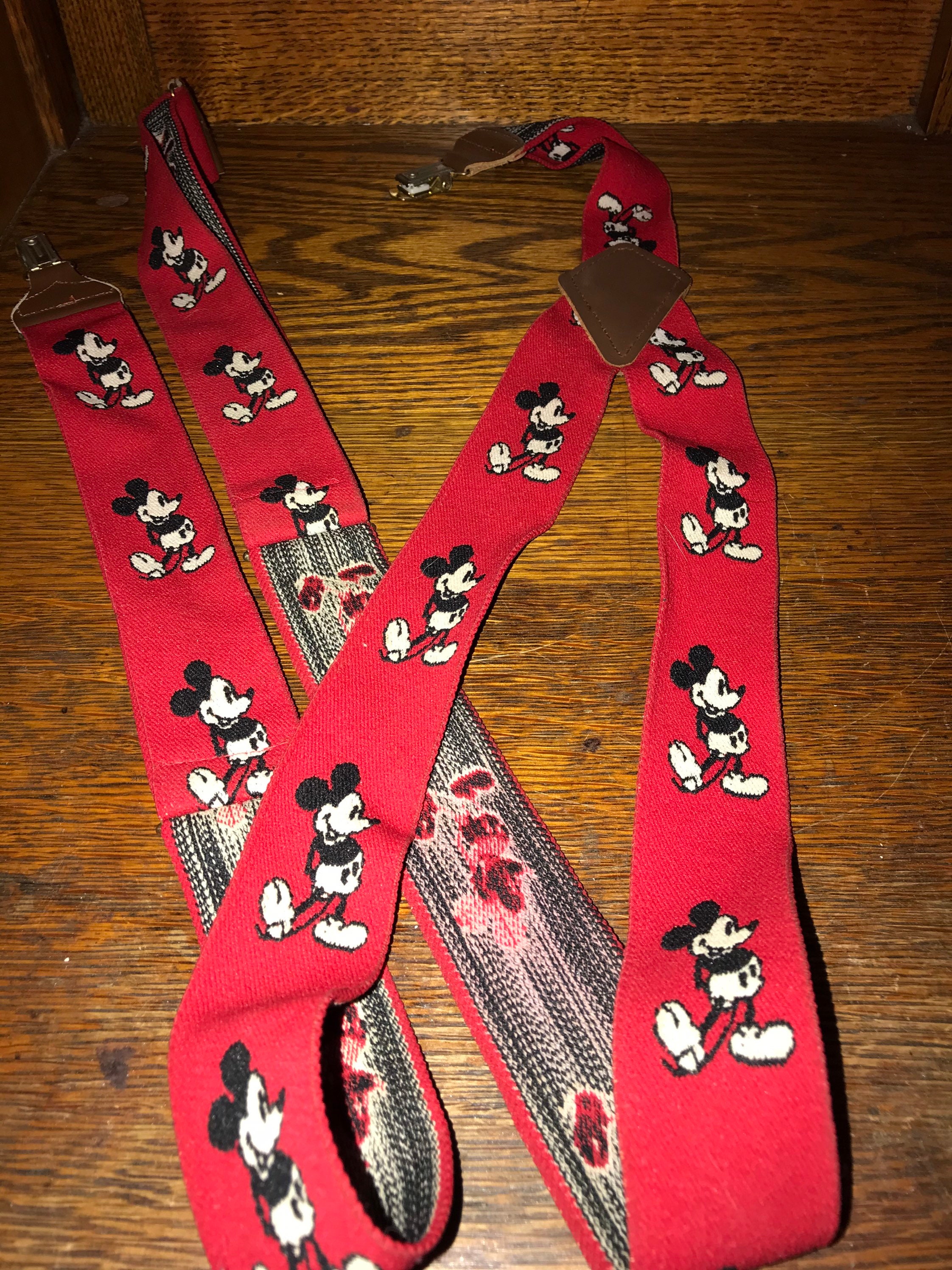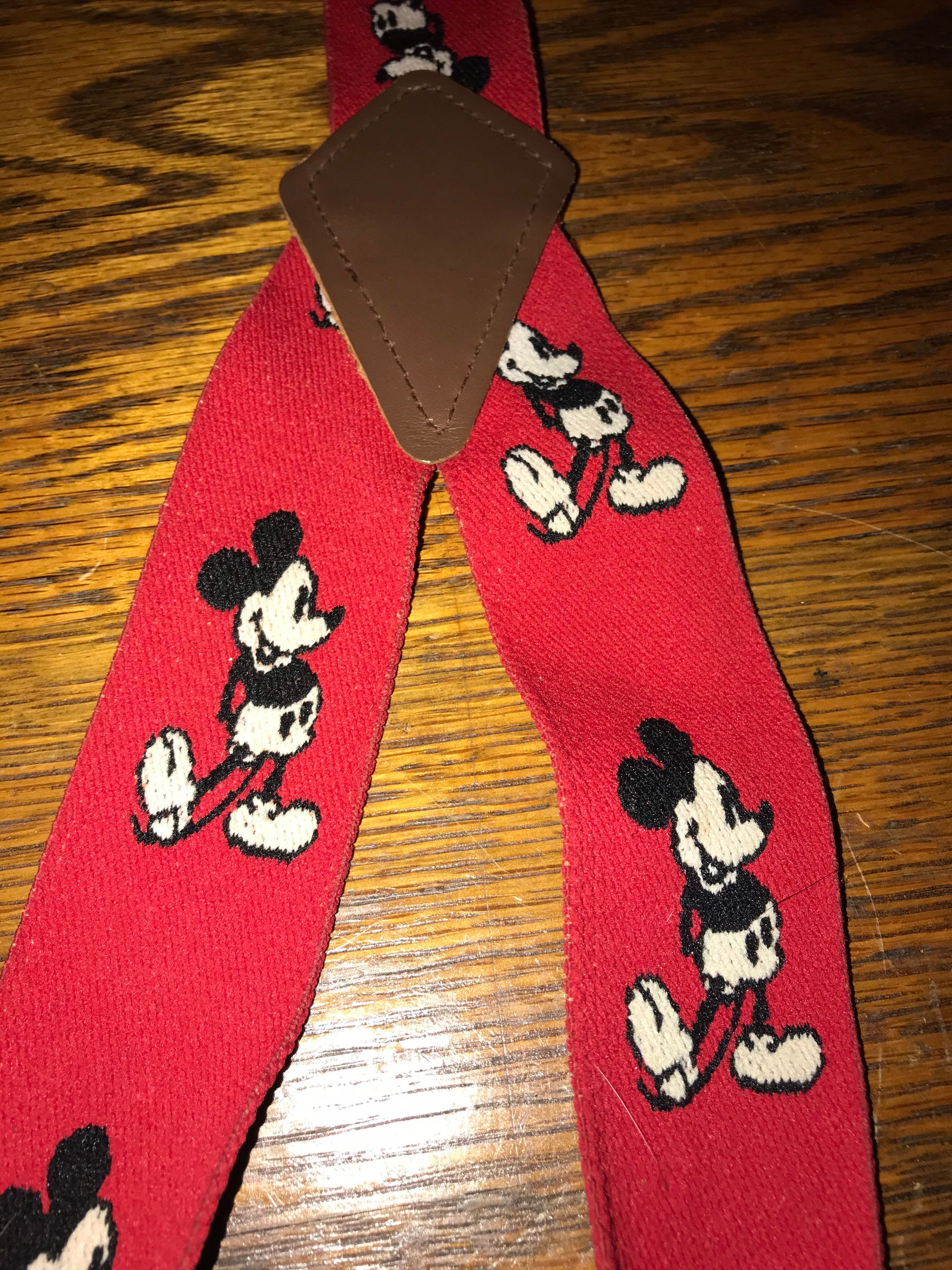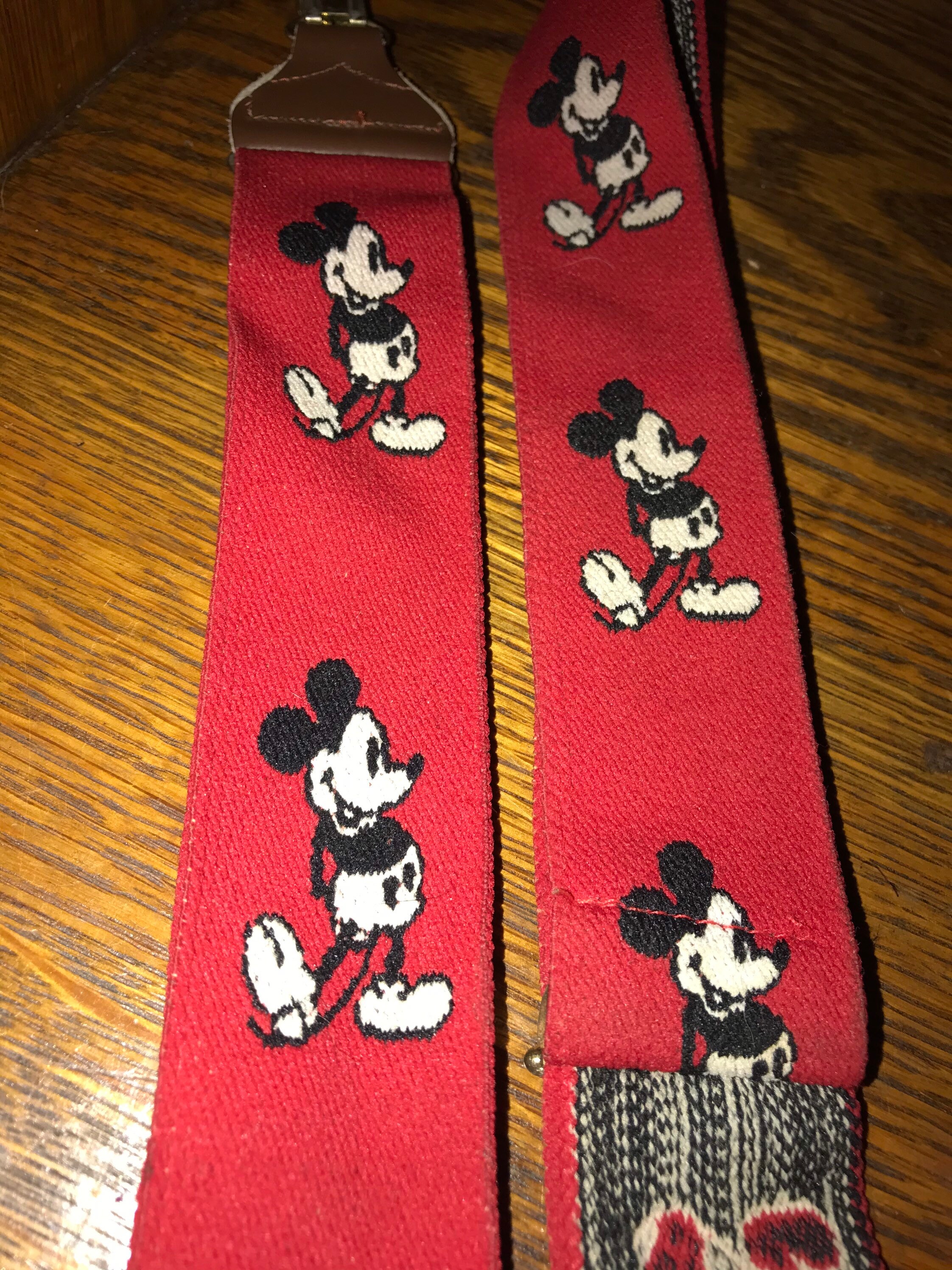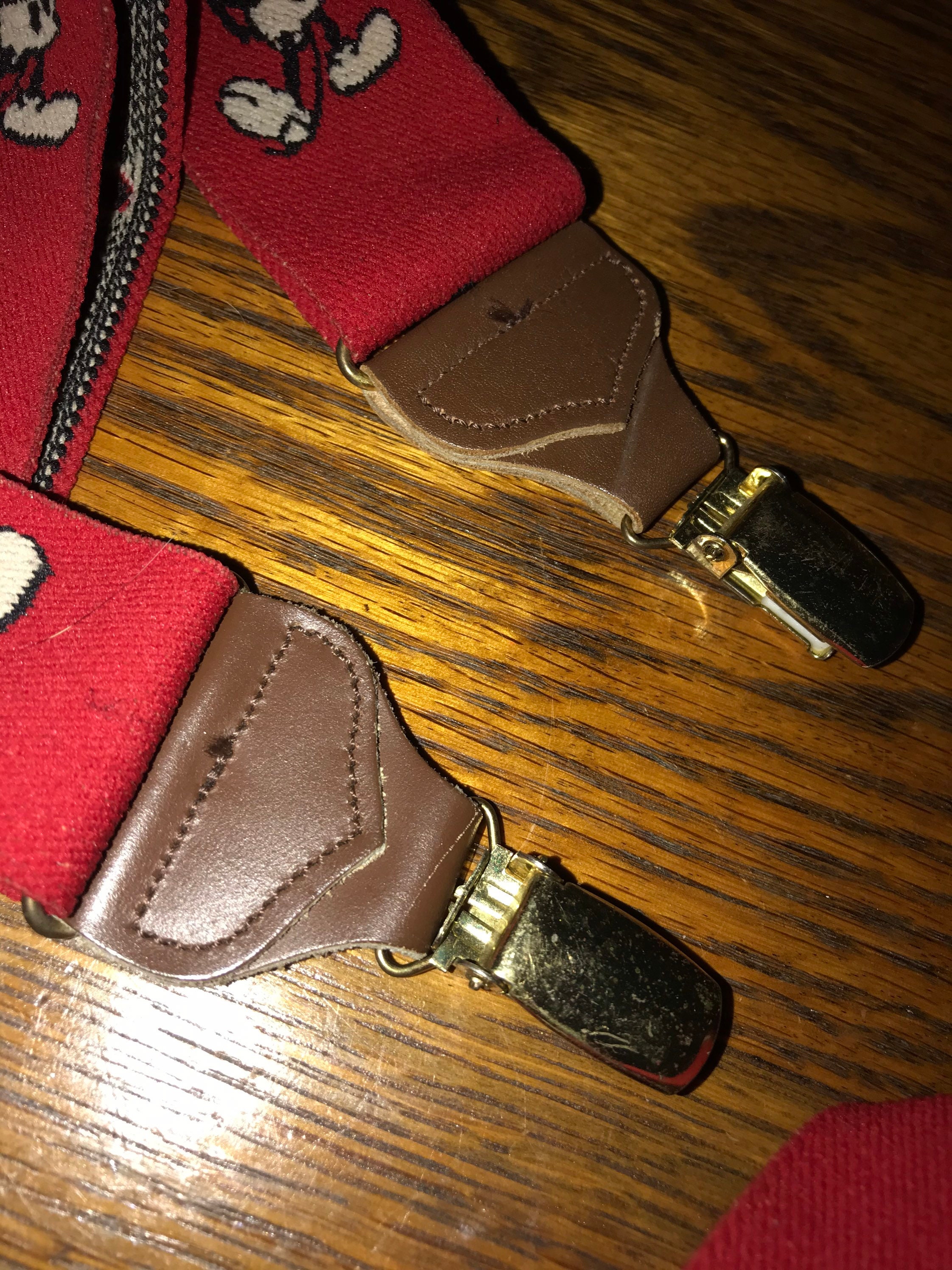 These are cute vintage Suspenders! They are red with Mickey Mouse all over them! They seem to have been stretched quite a bit but other than that they are in good vintage condition.