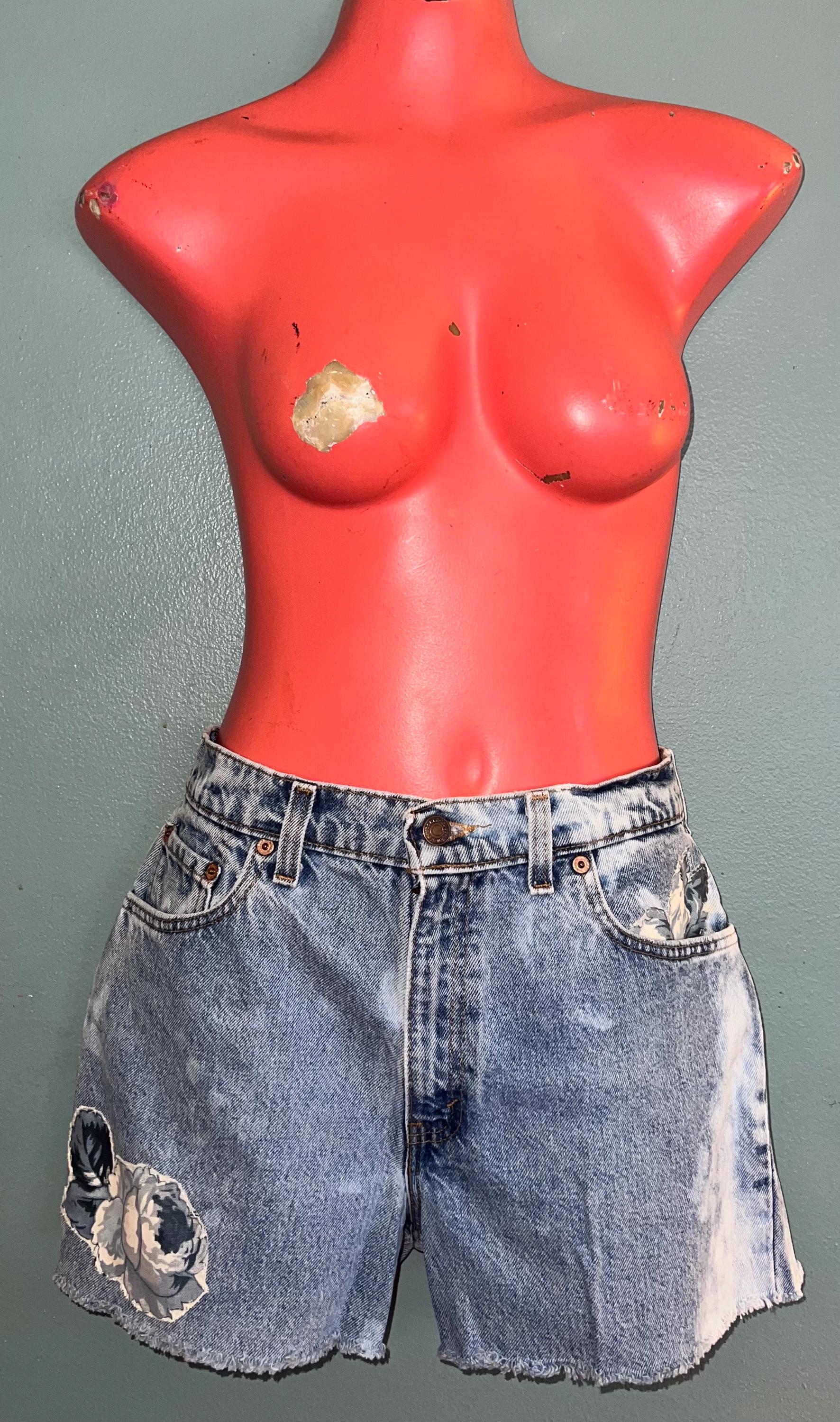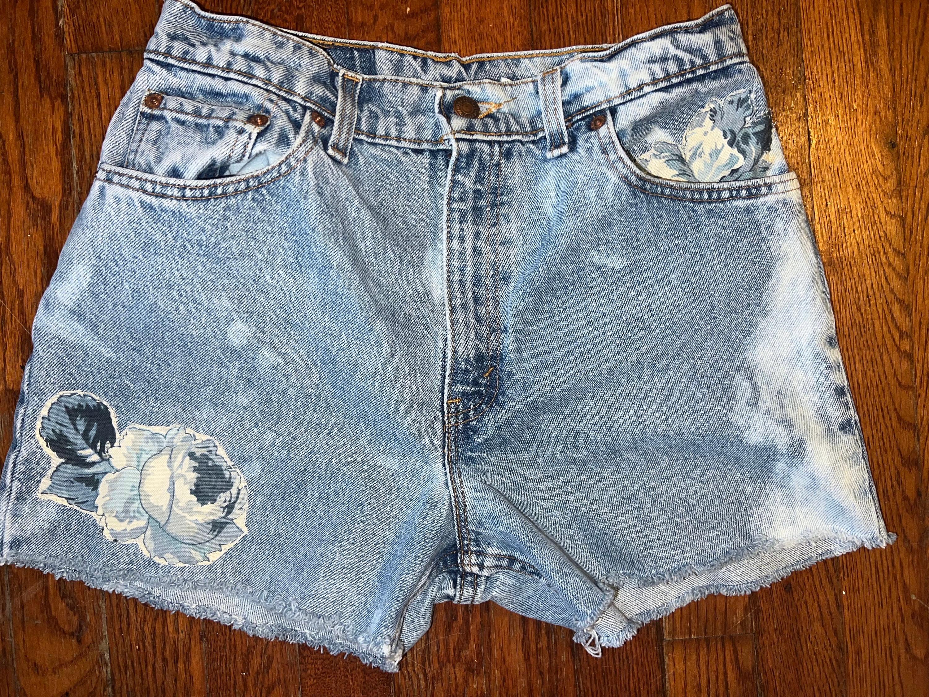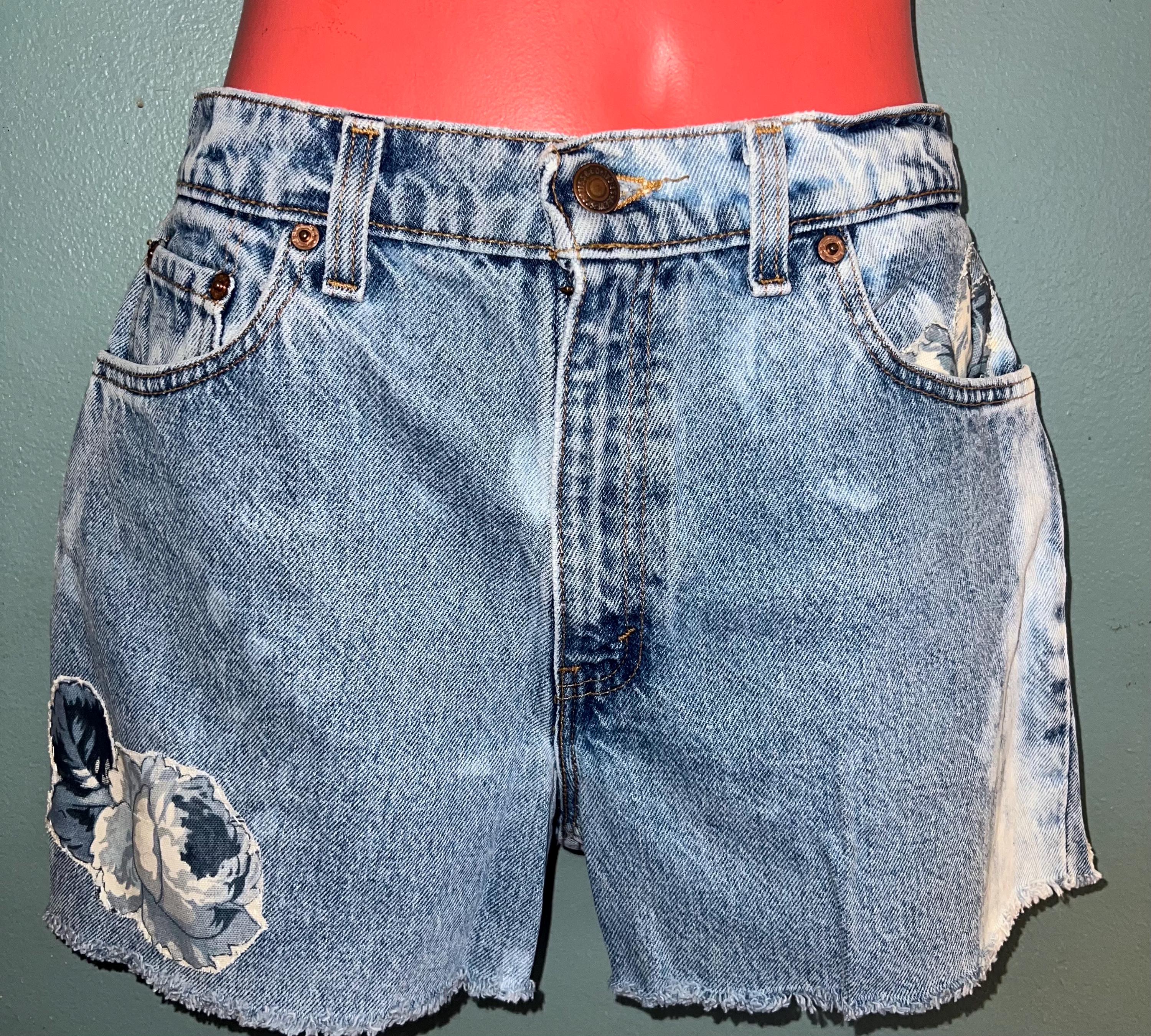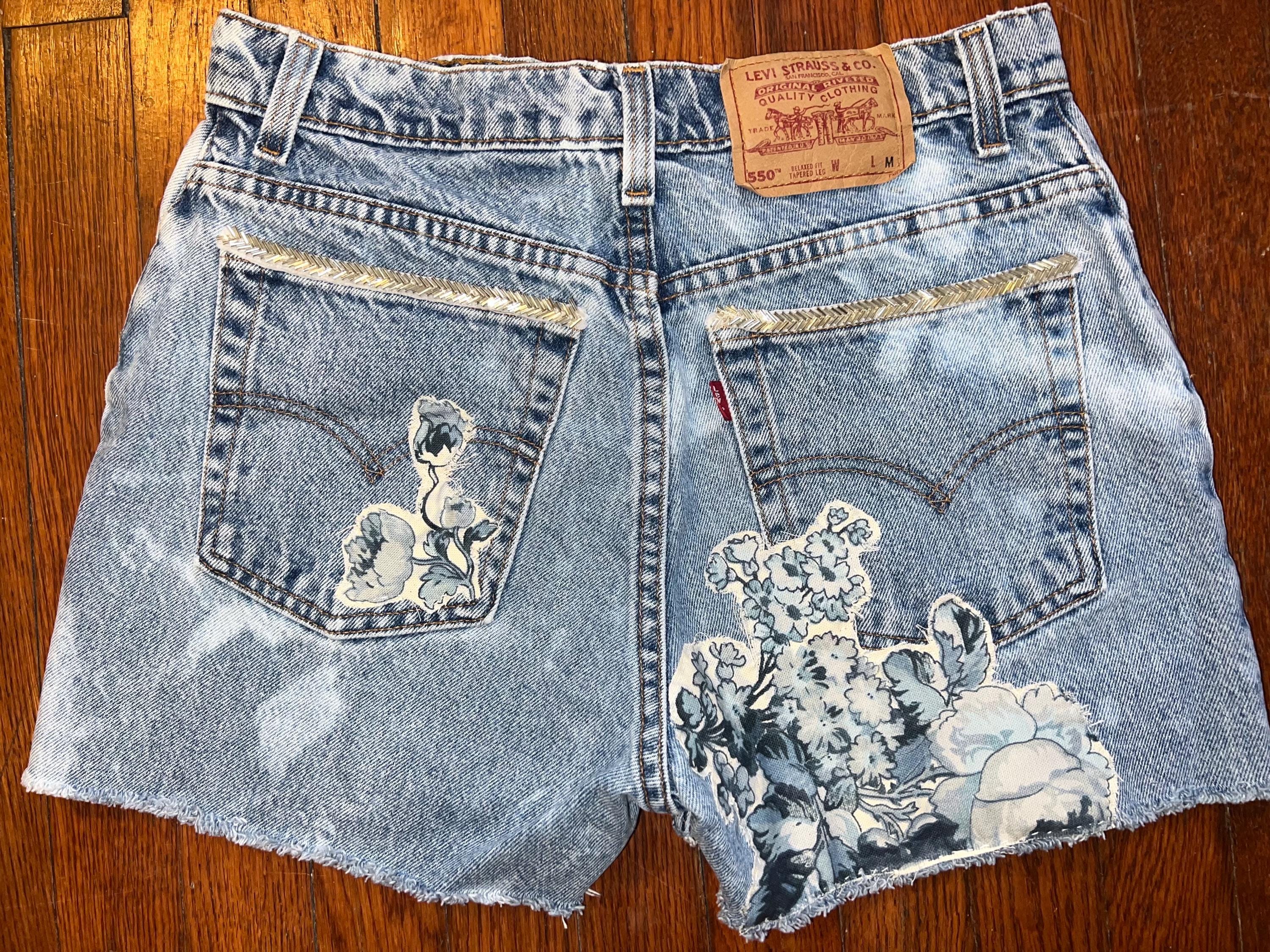 Here was a perfect pair of bleached Levi’s 550 red tab jeans. But I decided to make them into short shorts. They are reworked and I added blue and white flowers in random places and some pretty beading on the back pockets. They are in good condition.