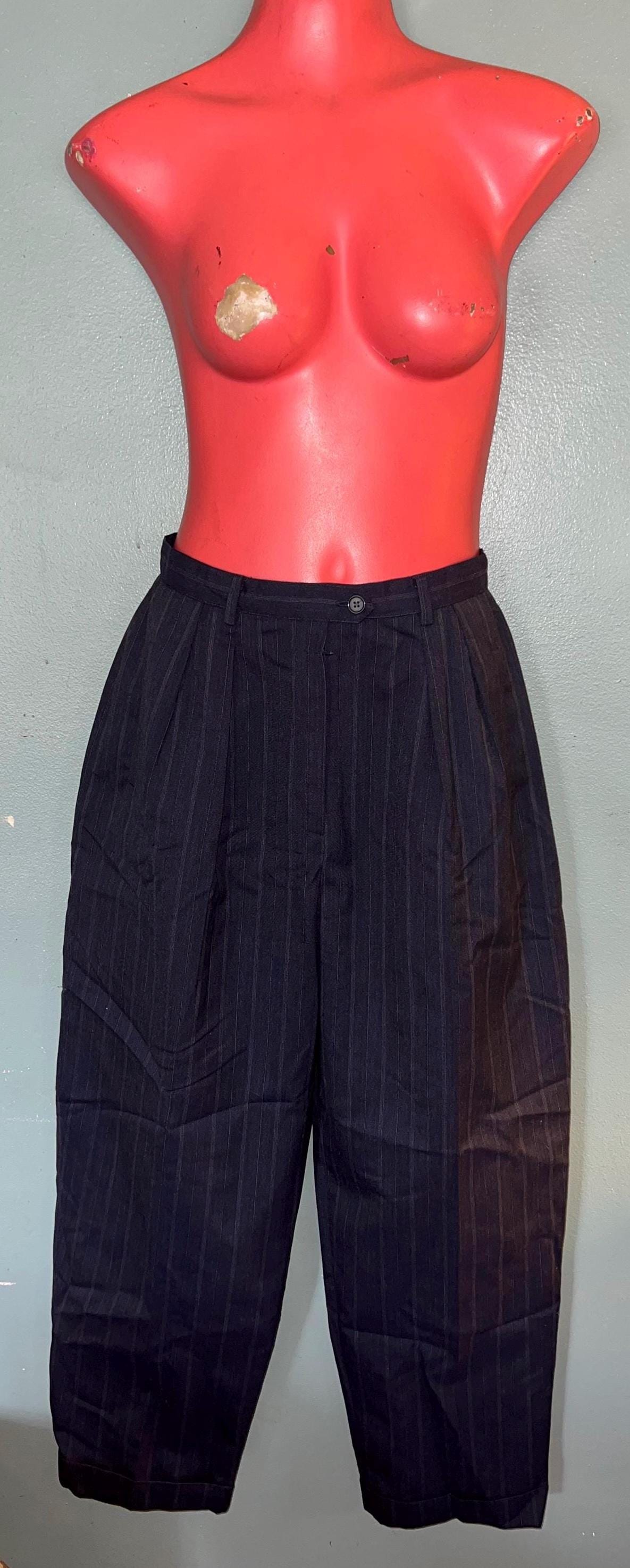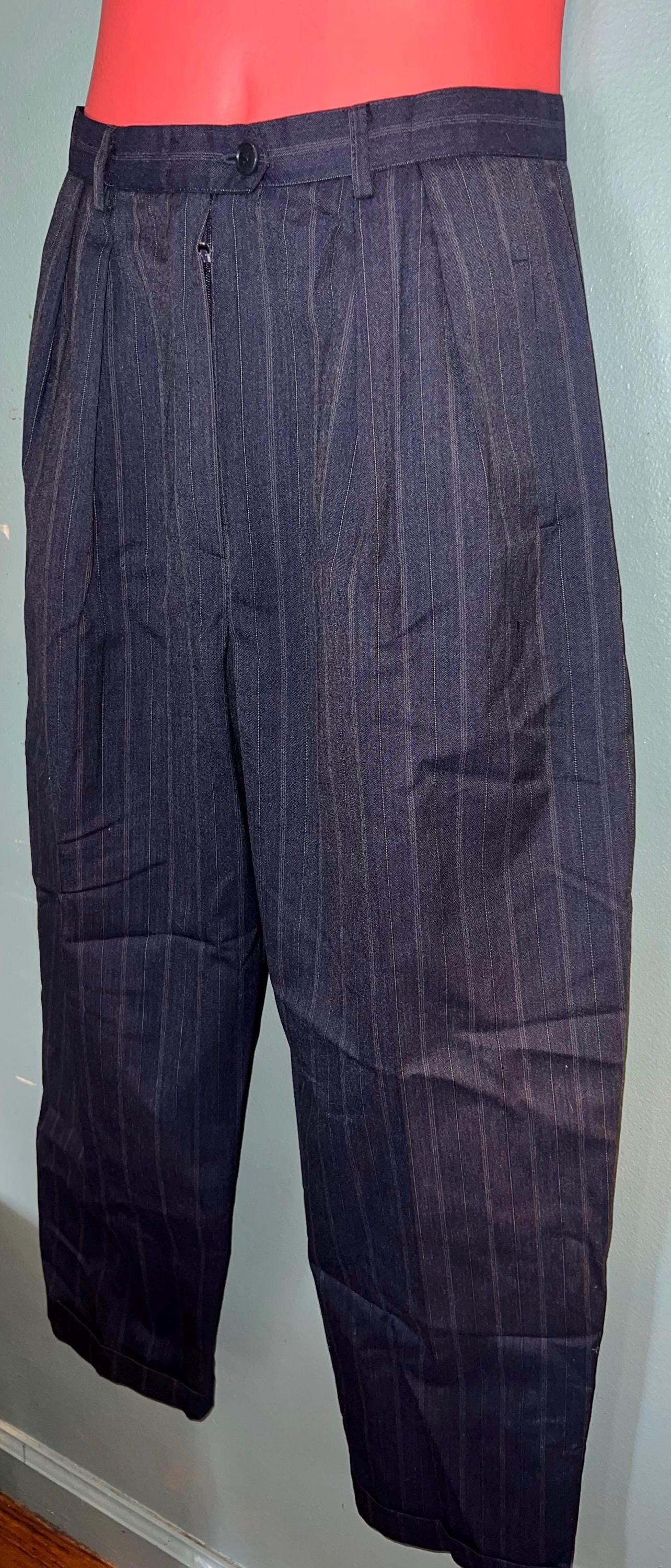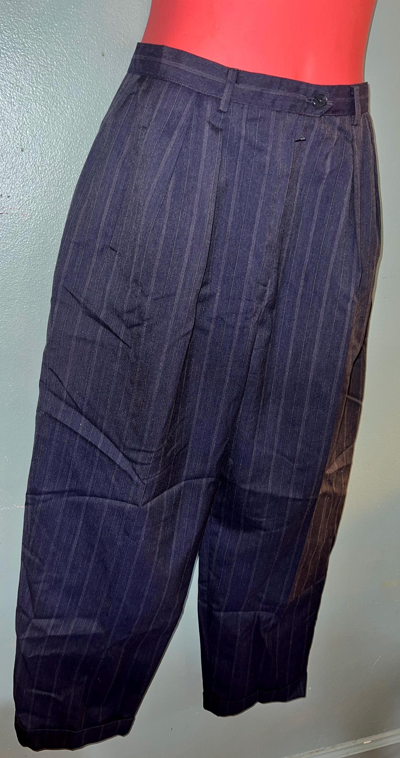This is a nice pair of Ralph Lauren, black suit pants. They have some stripes down the sides and they are cuffed at the bottom. They are in good vintage condition.
