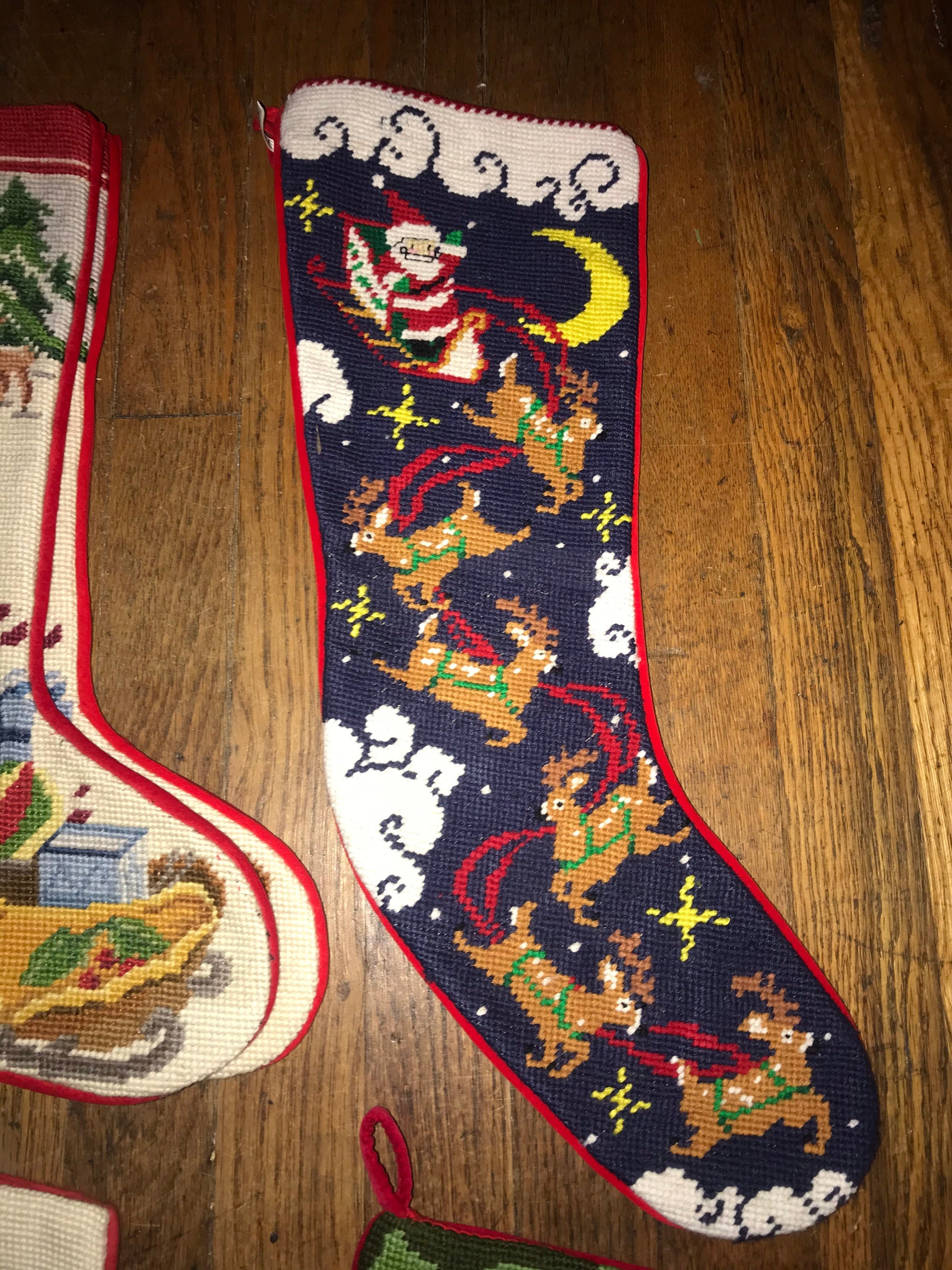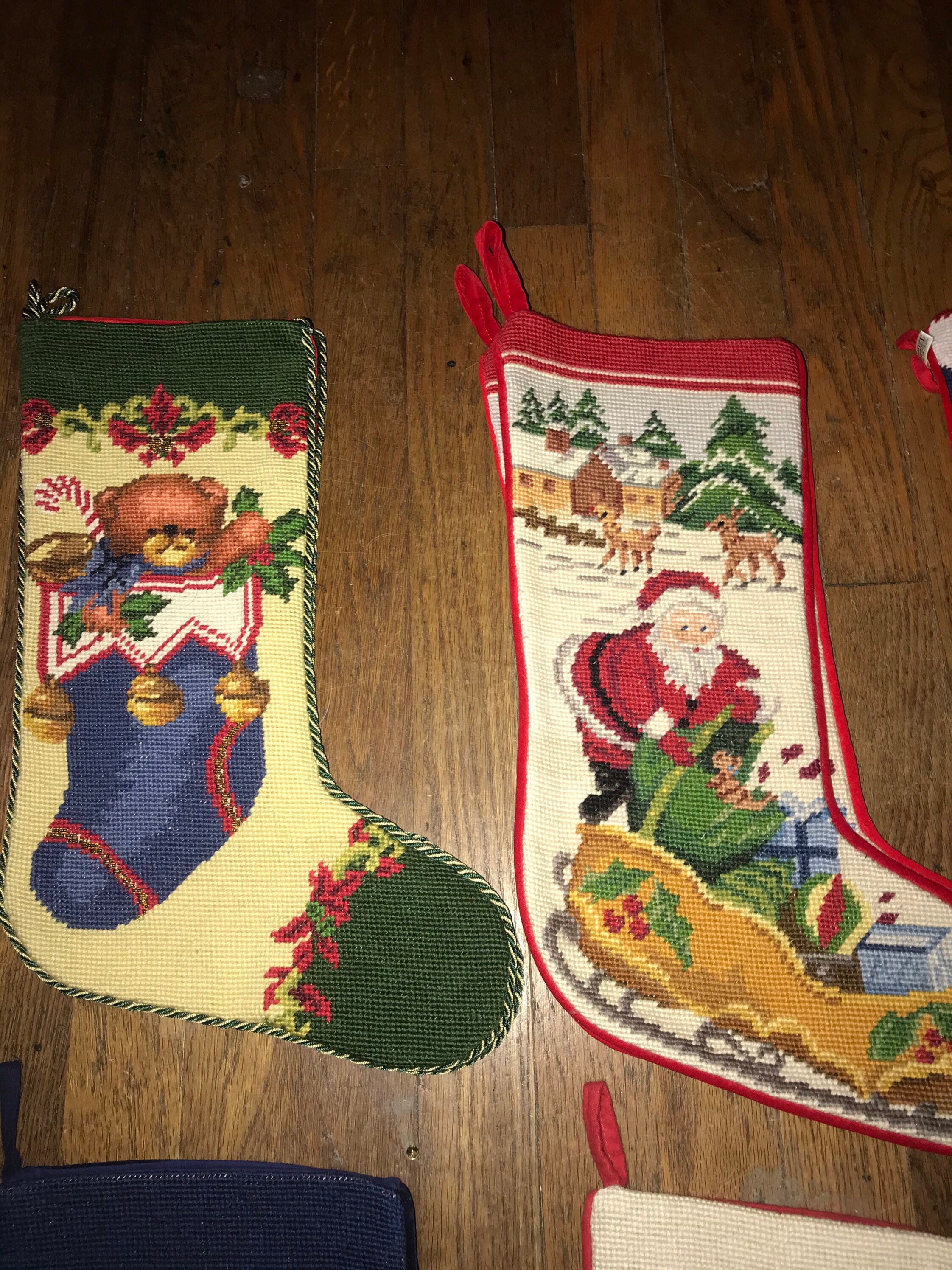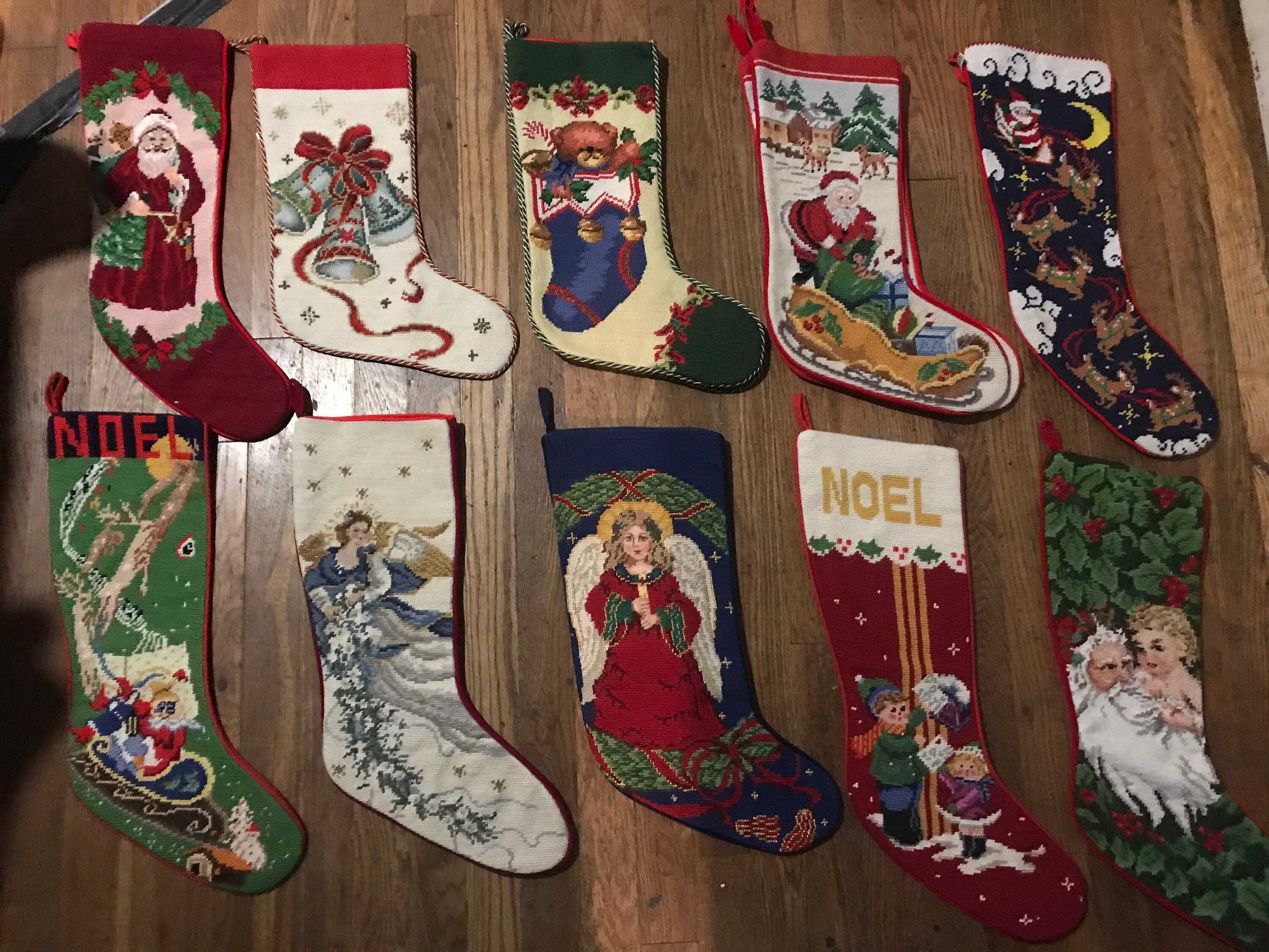 We have here 12 Lovely needlepoint Christmas stockings. Ten of them are different and we have two that each have a matching one.