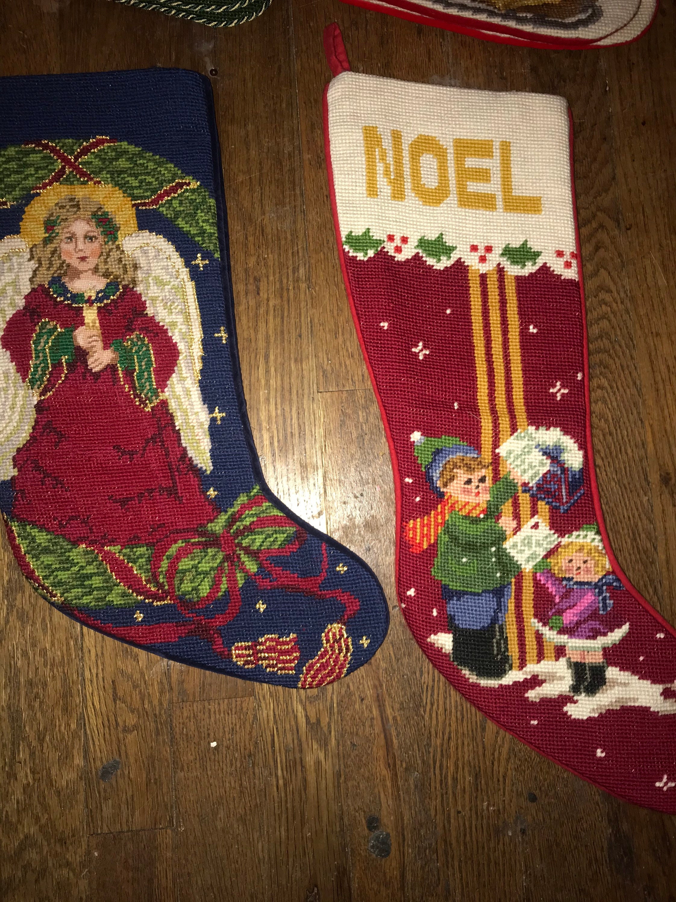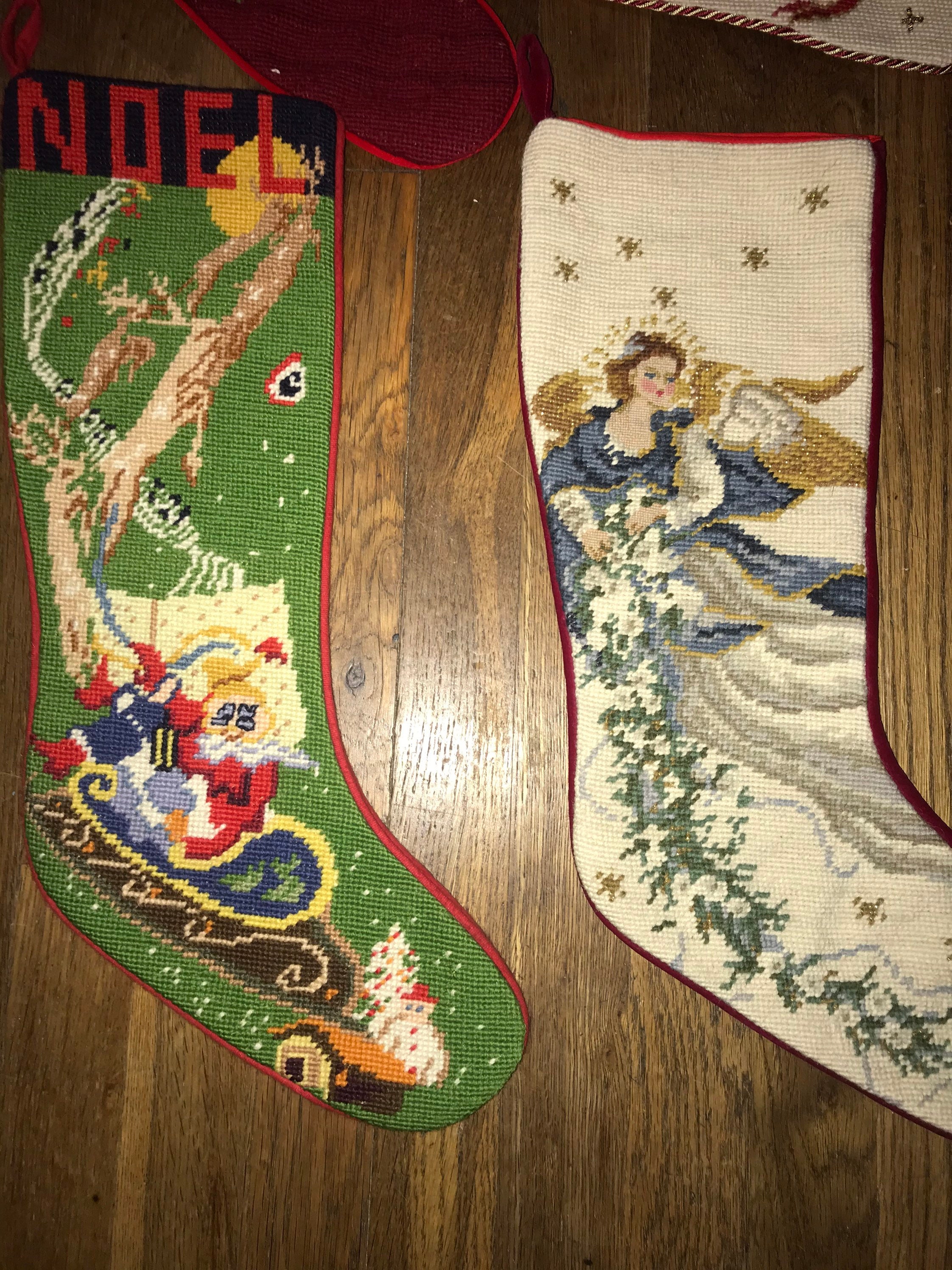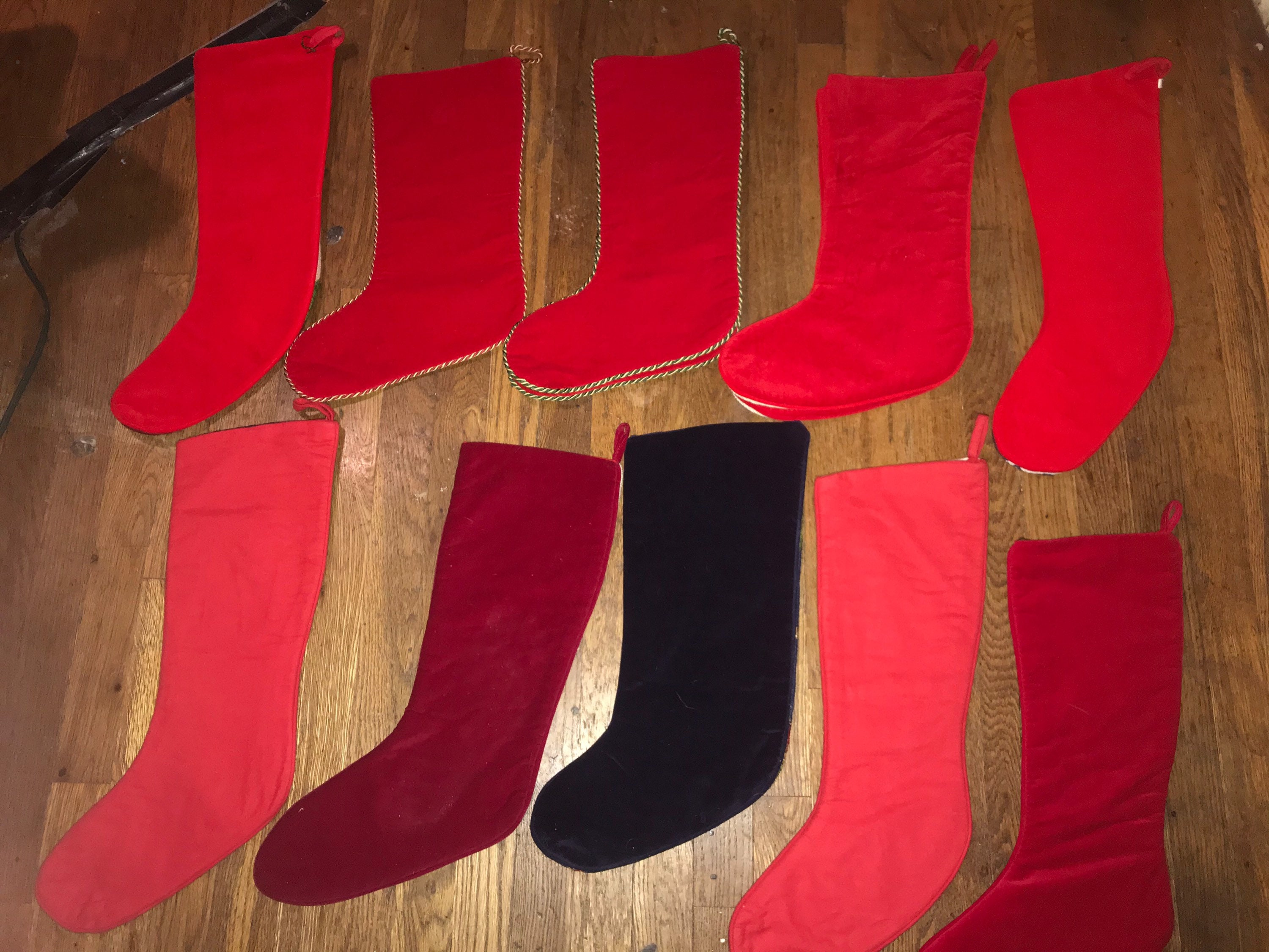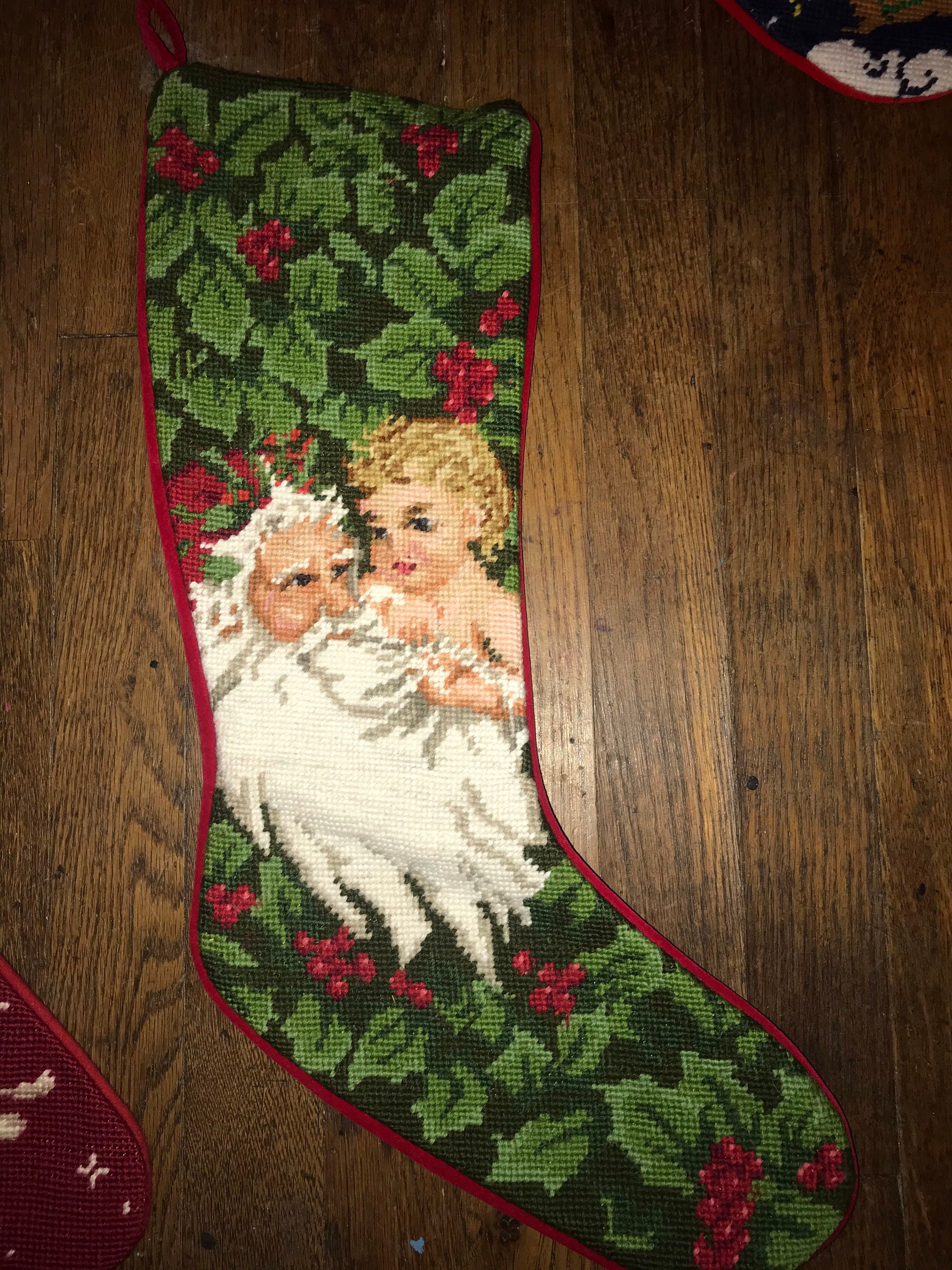We have here 12 Lovely needlepoint Christmas stockings. Ten of them are different and we have two that each have a matching one.