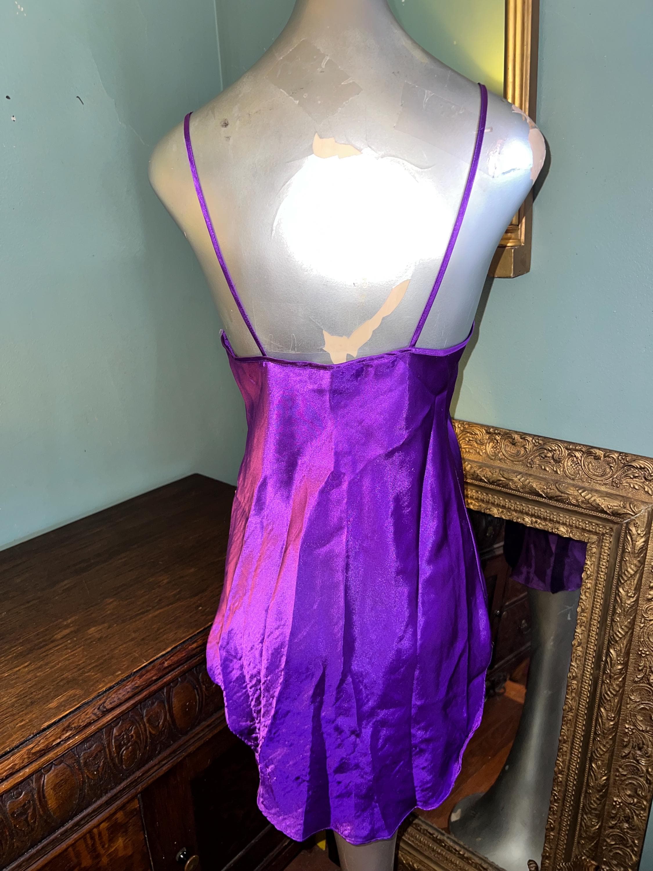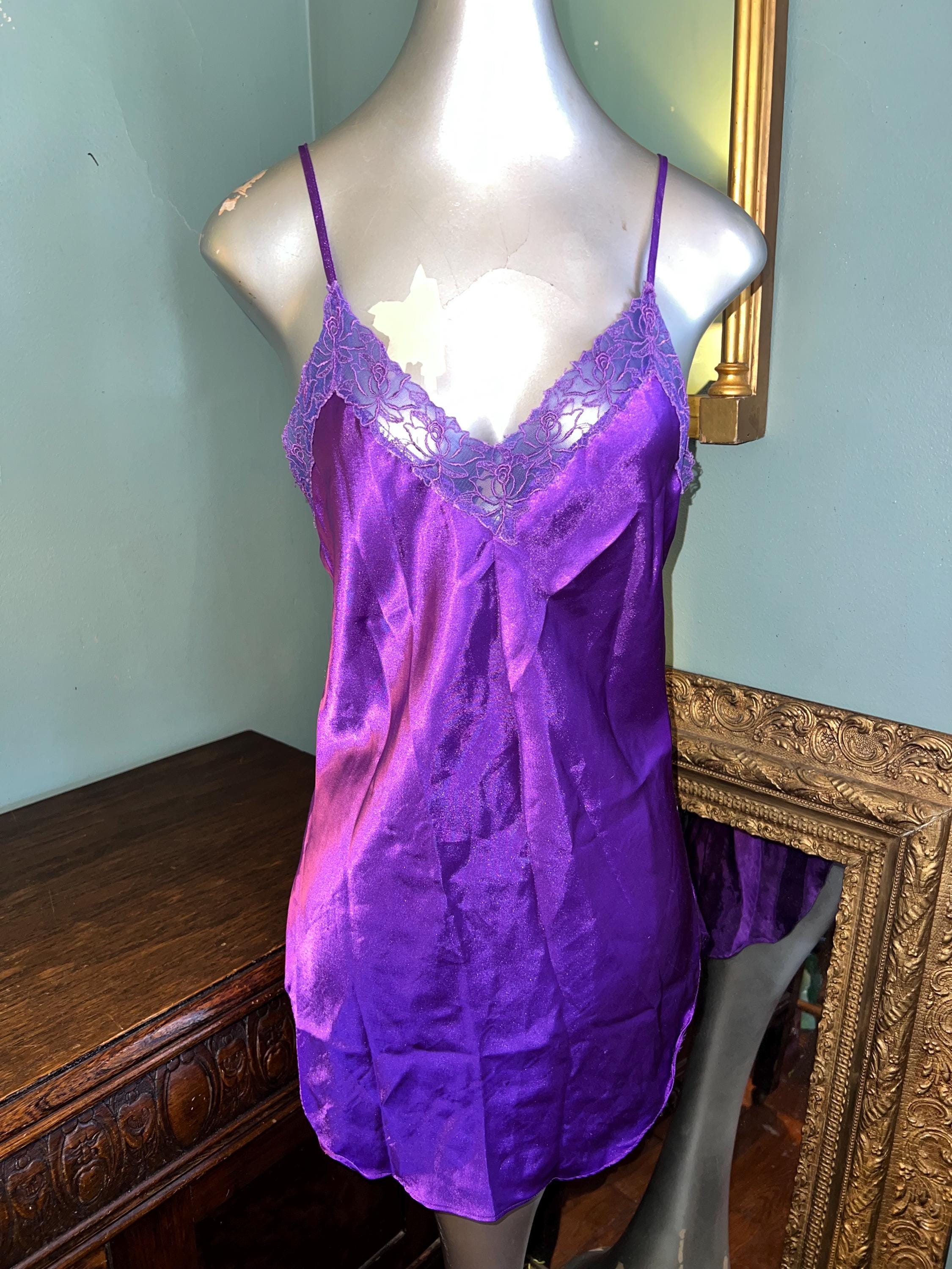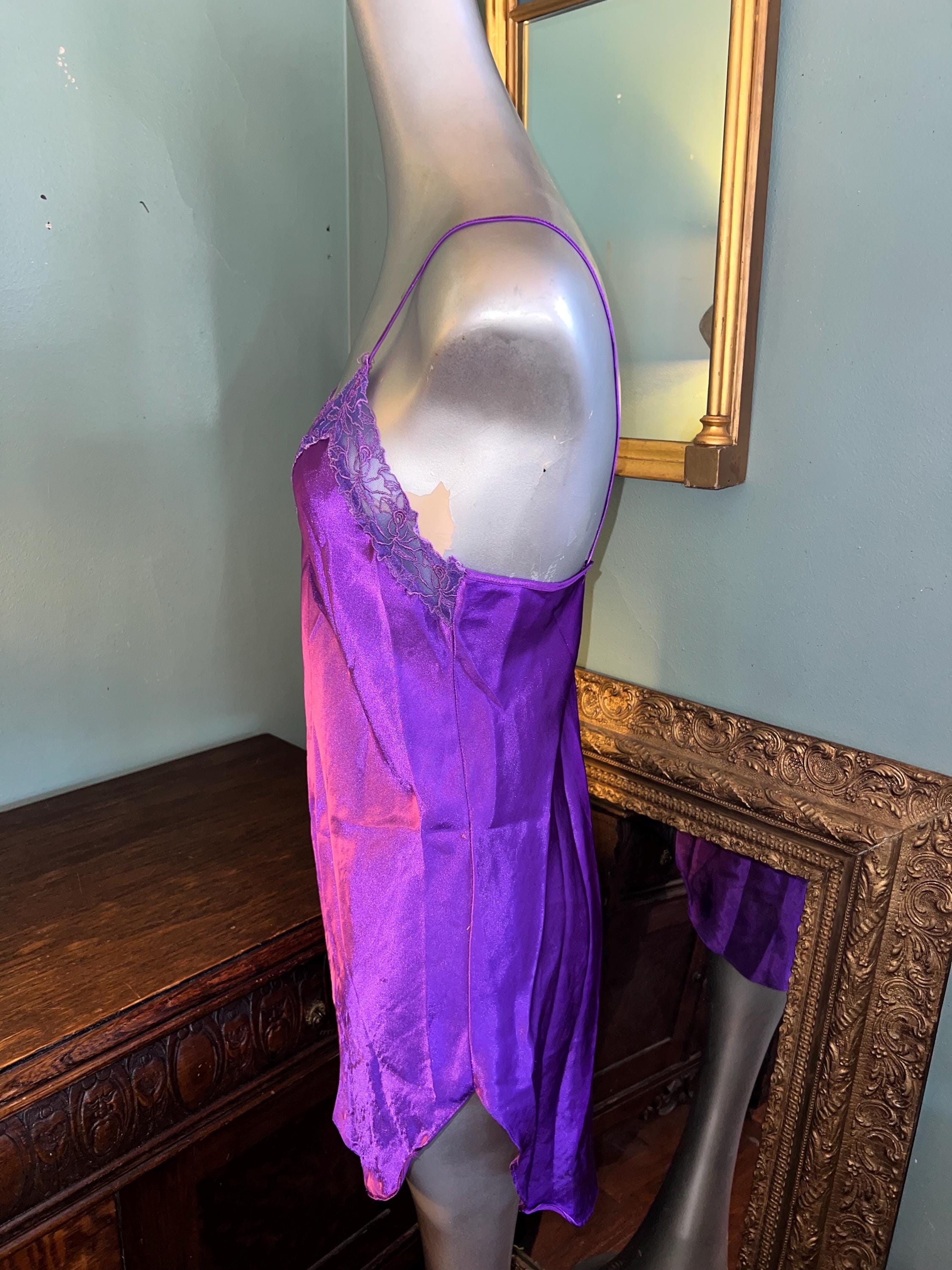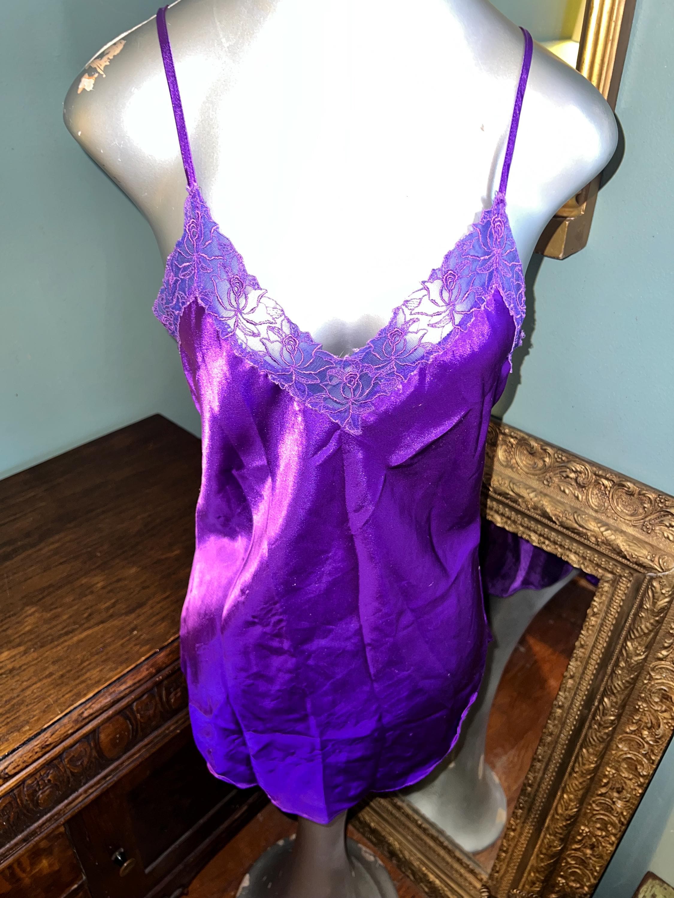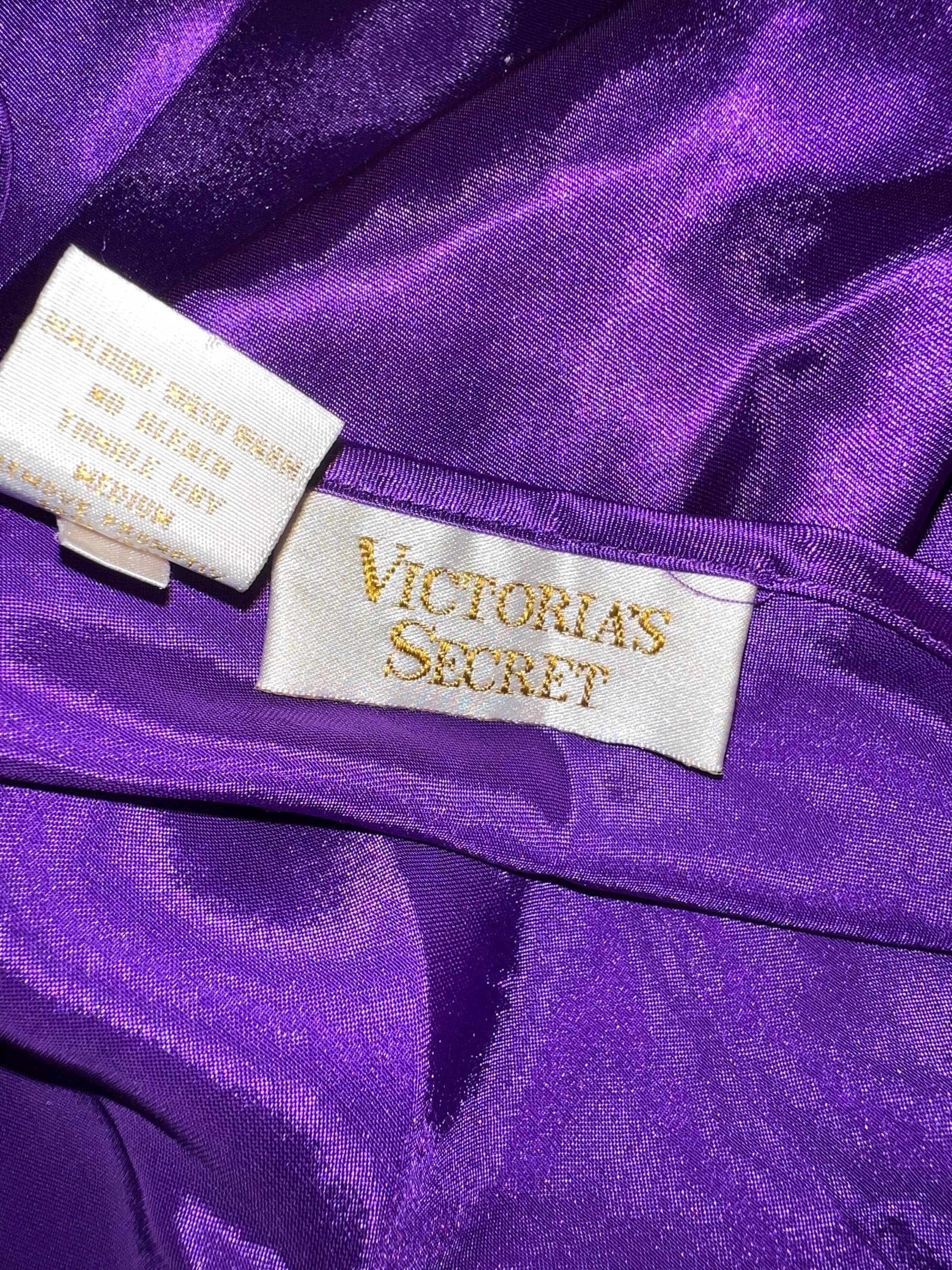 This is a cute short purple satin and lace nightie by Victoria’s Secret. It has non-adjustable straps. It’s in well worn but good condition.