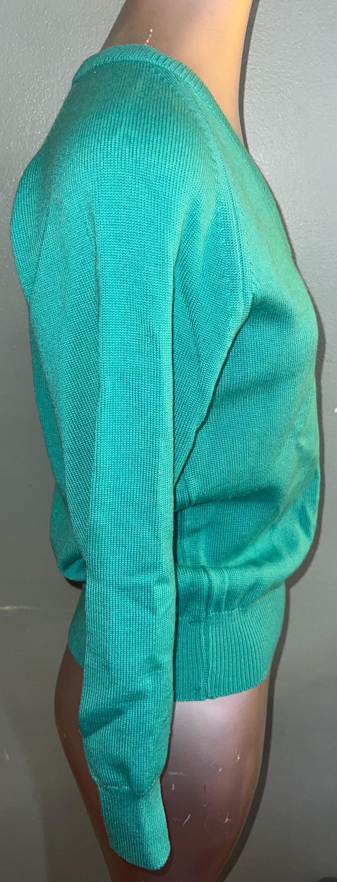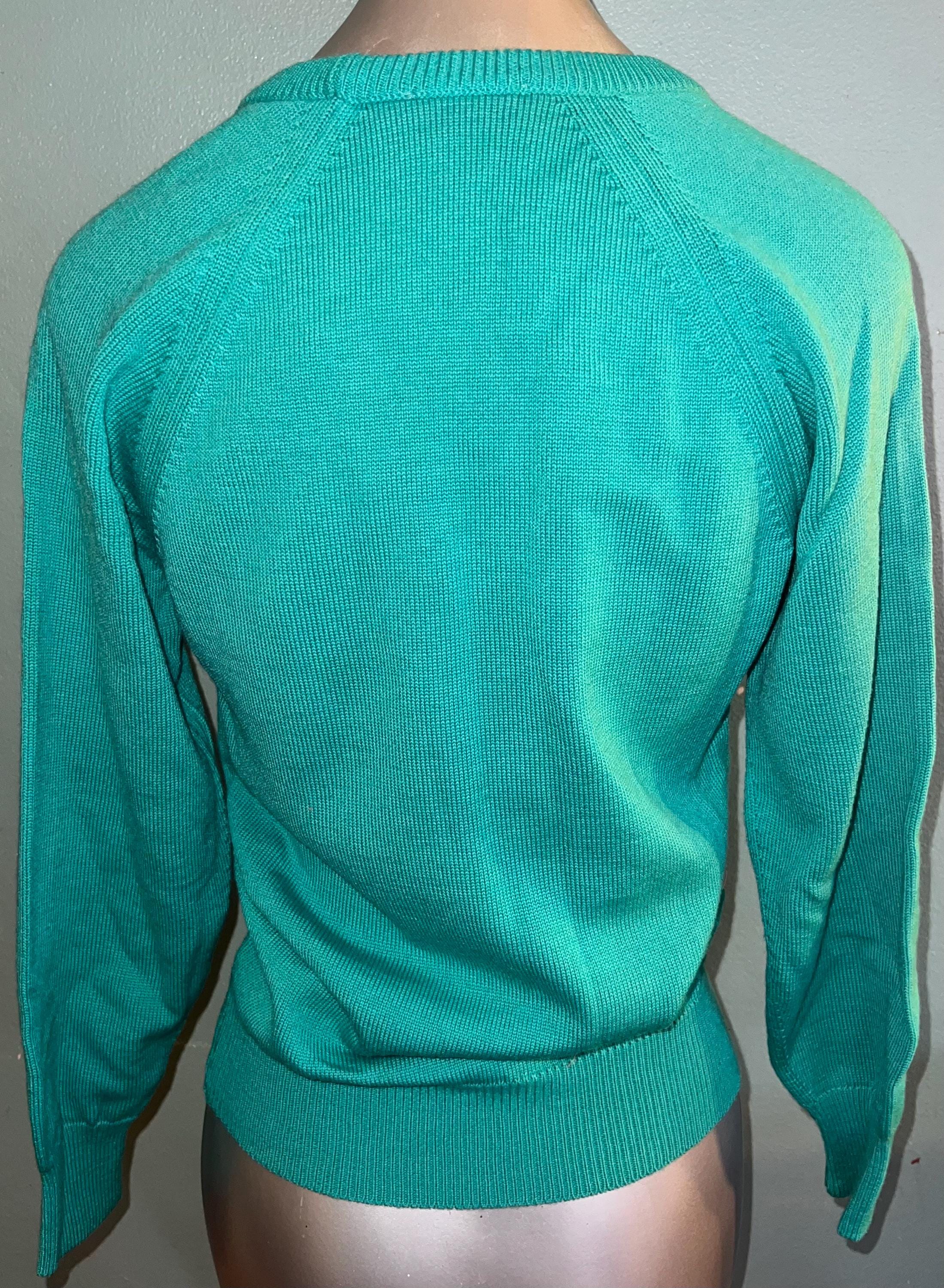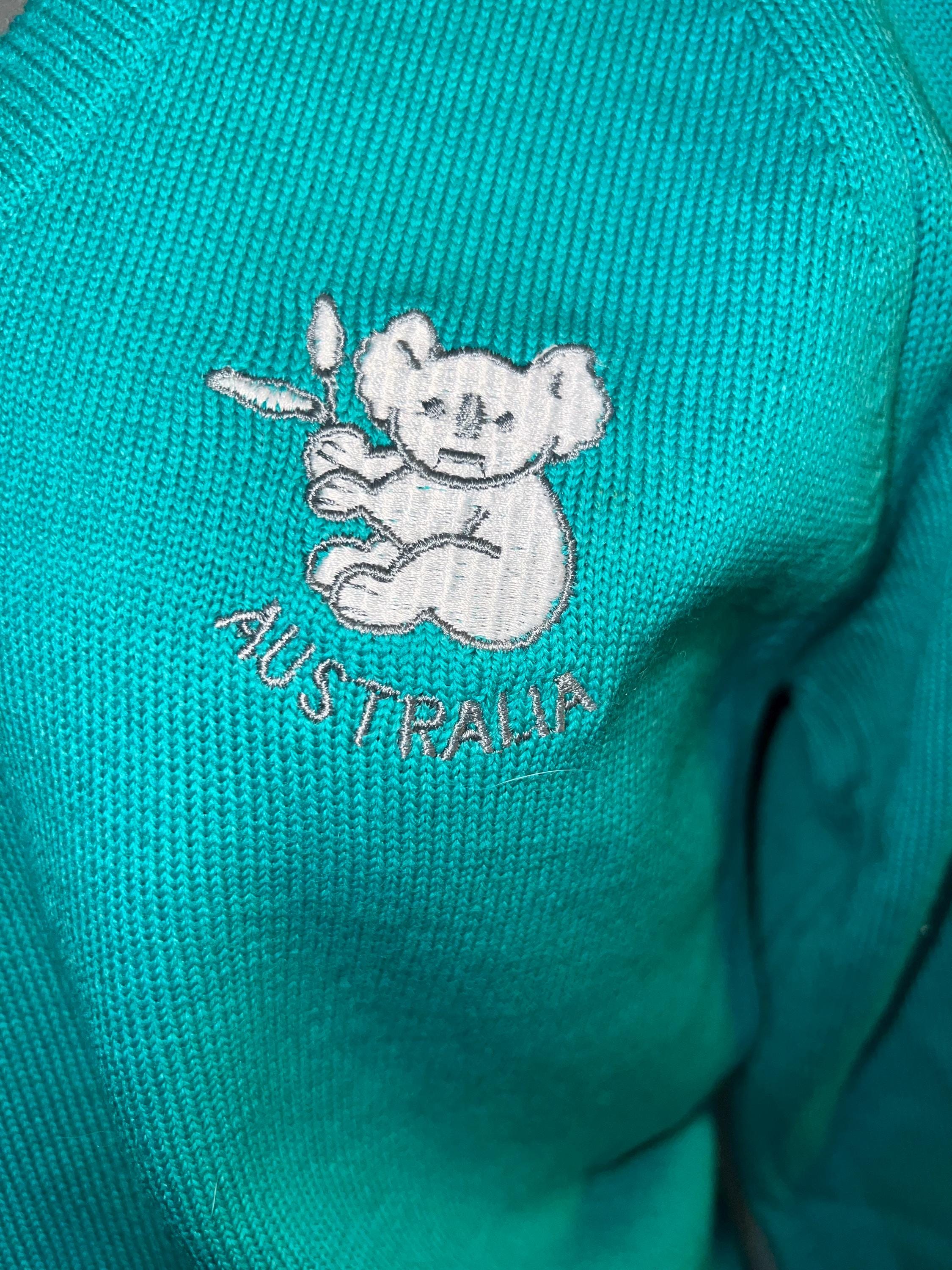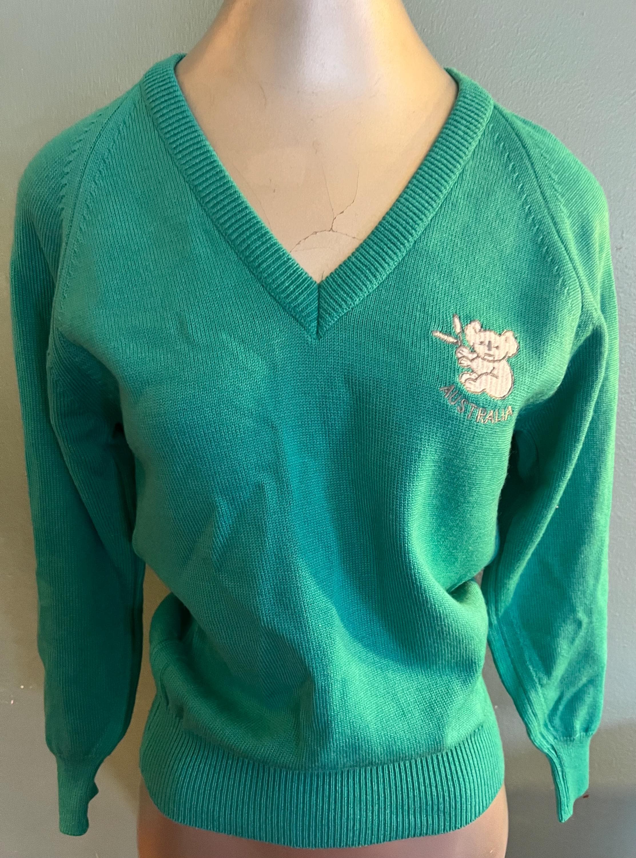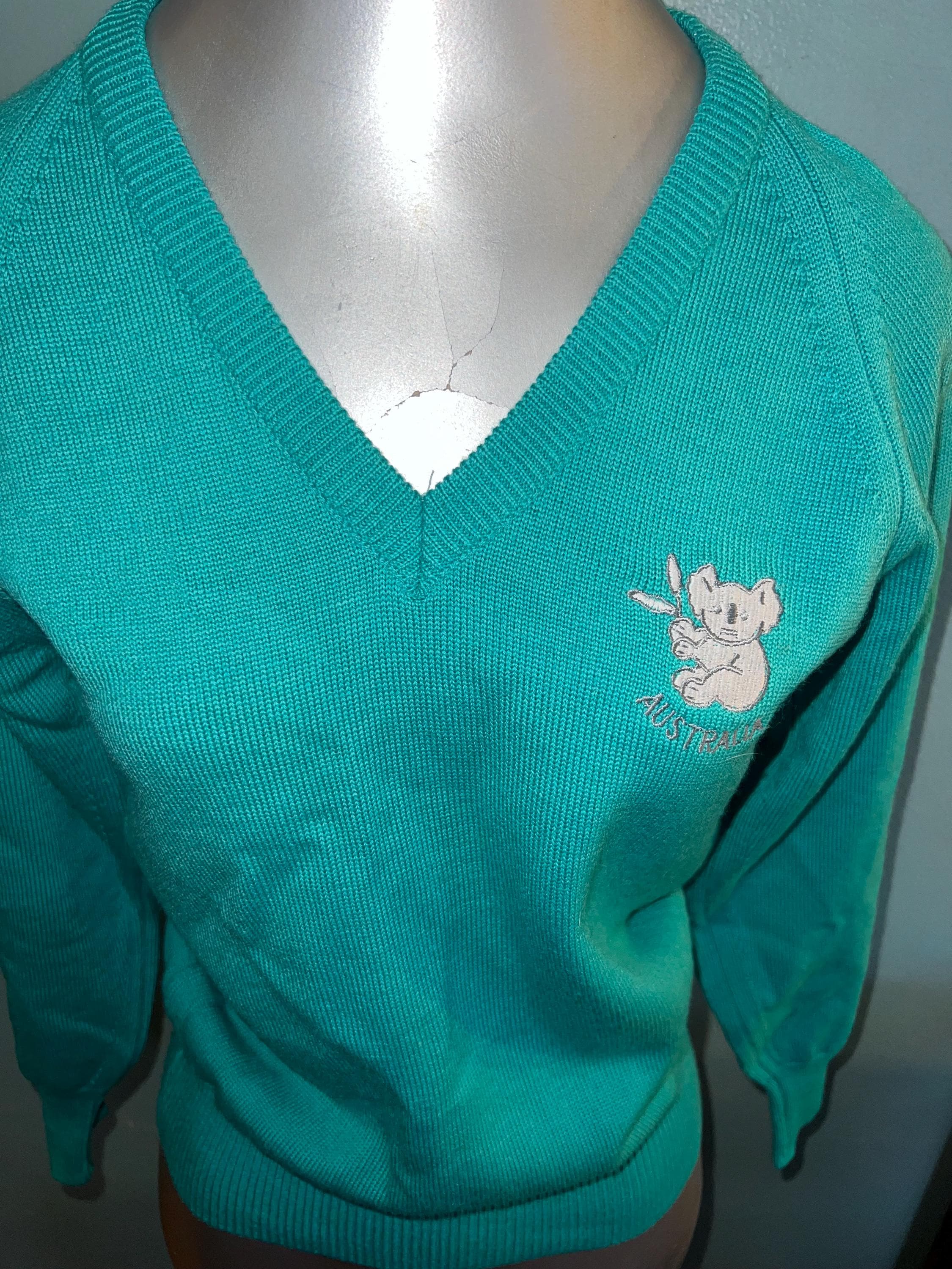 This is an excellent aqua v-neck all wool sweater made by Bromley in Australia. It has the cutest little koala bear on the chest and says “Australia” under the beat. It’s in great vintage condition.