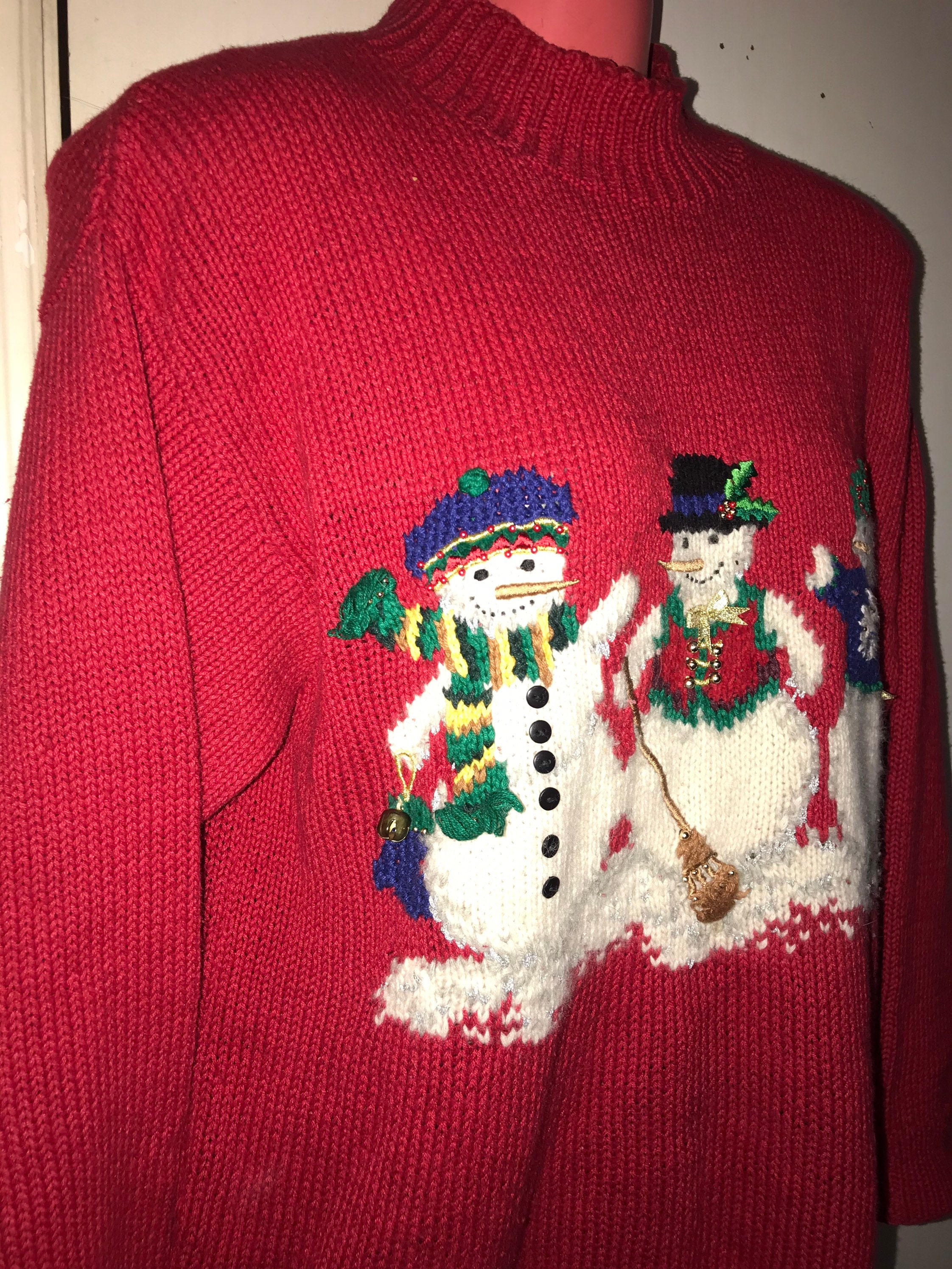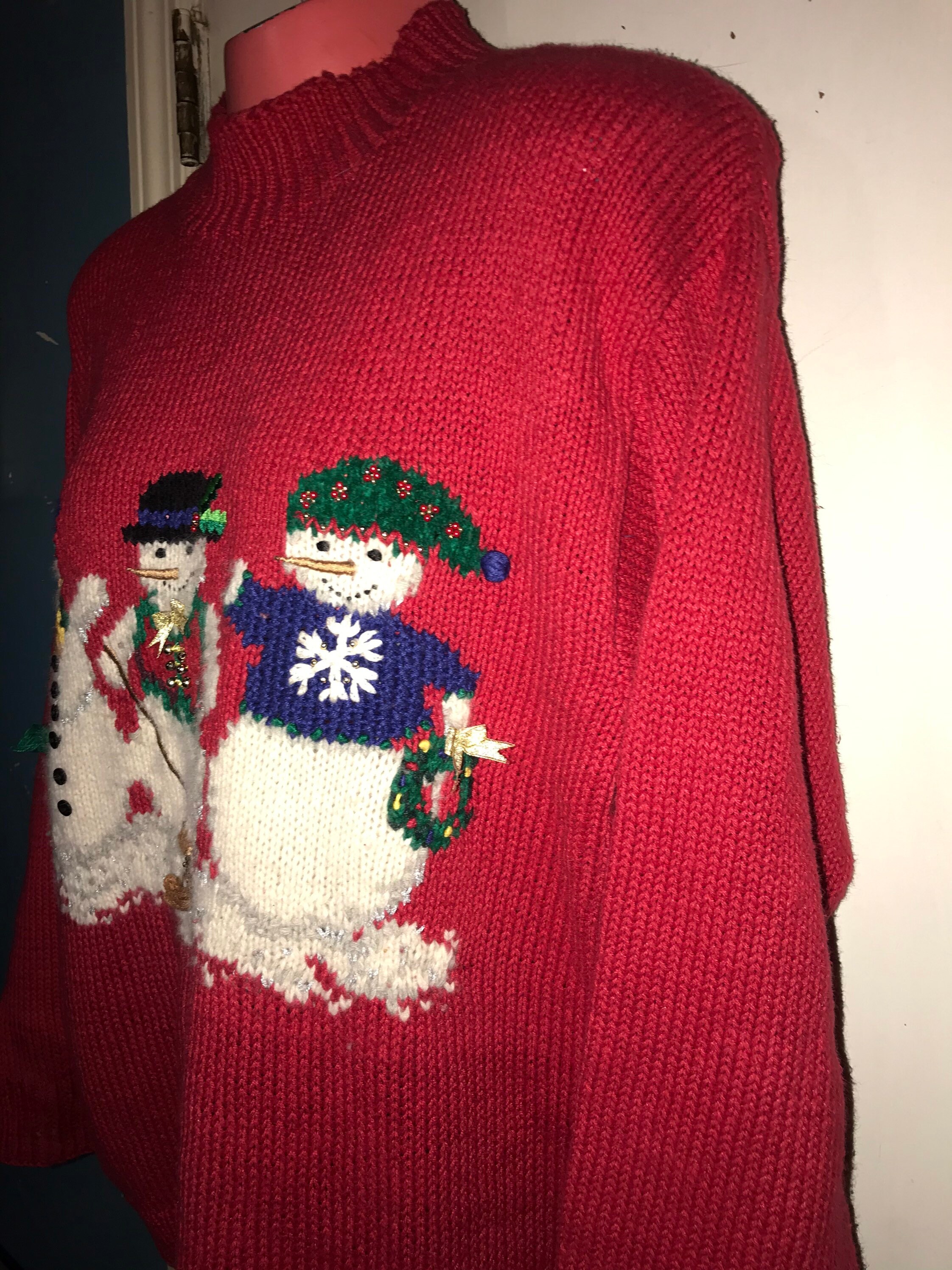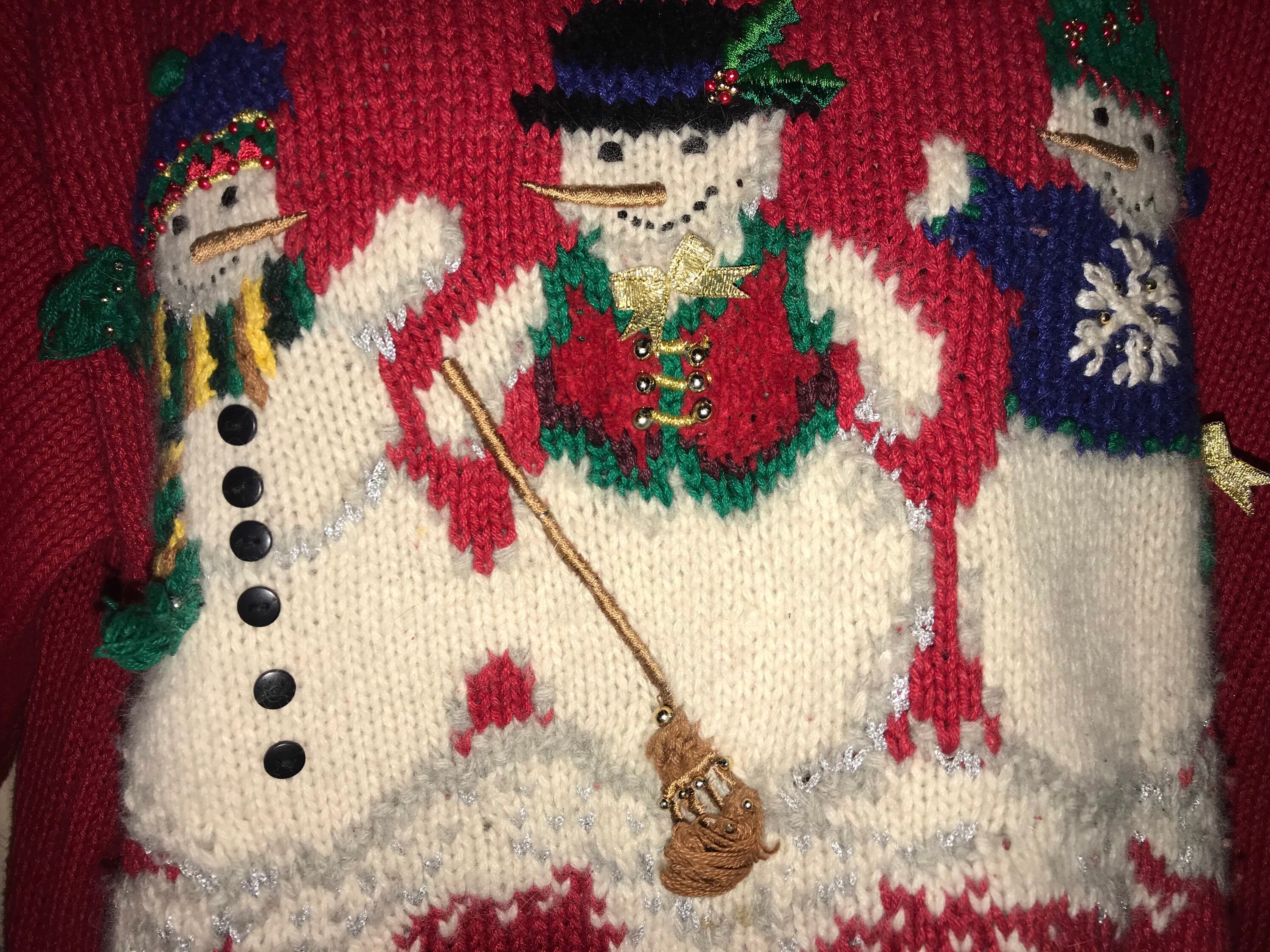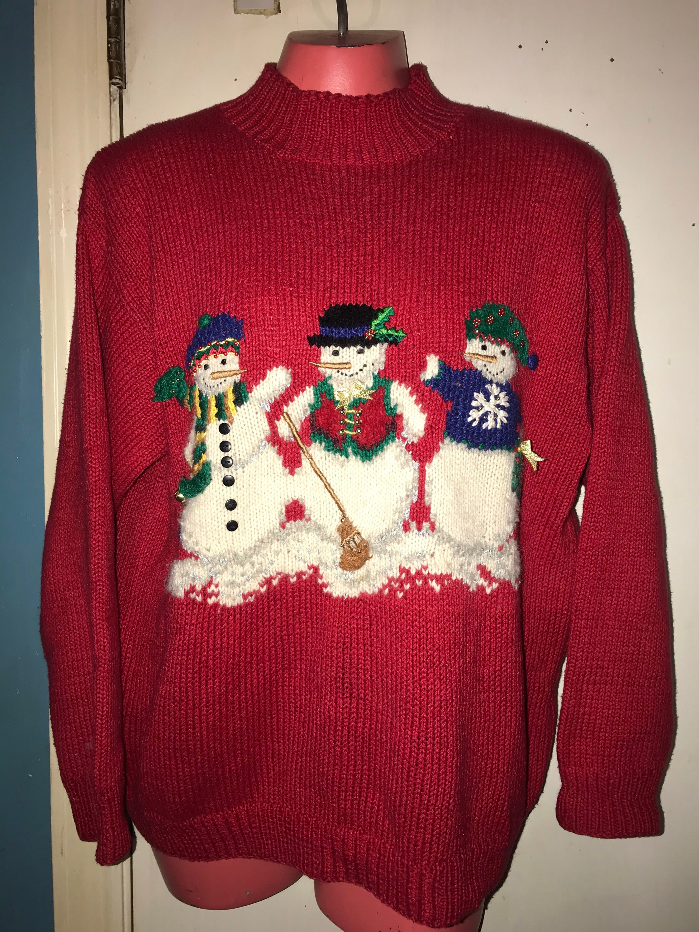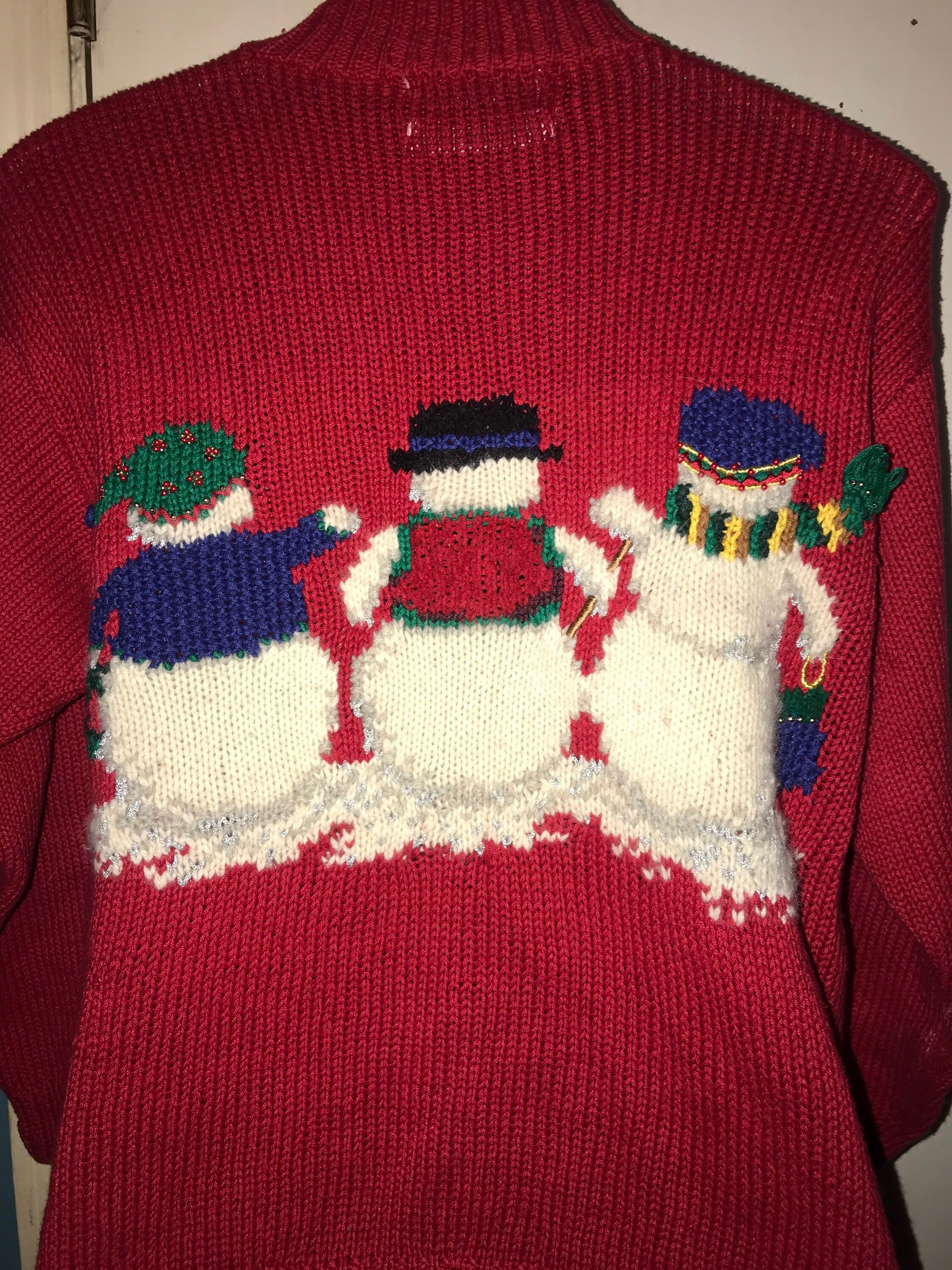 Cute little "ugly" Christmas sweater! Red with three snowmen on the front and the back of three snowman on the back of it. It's very cute!