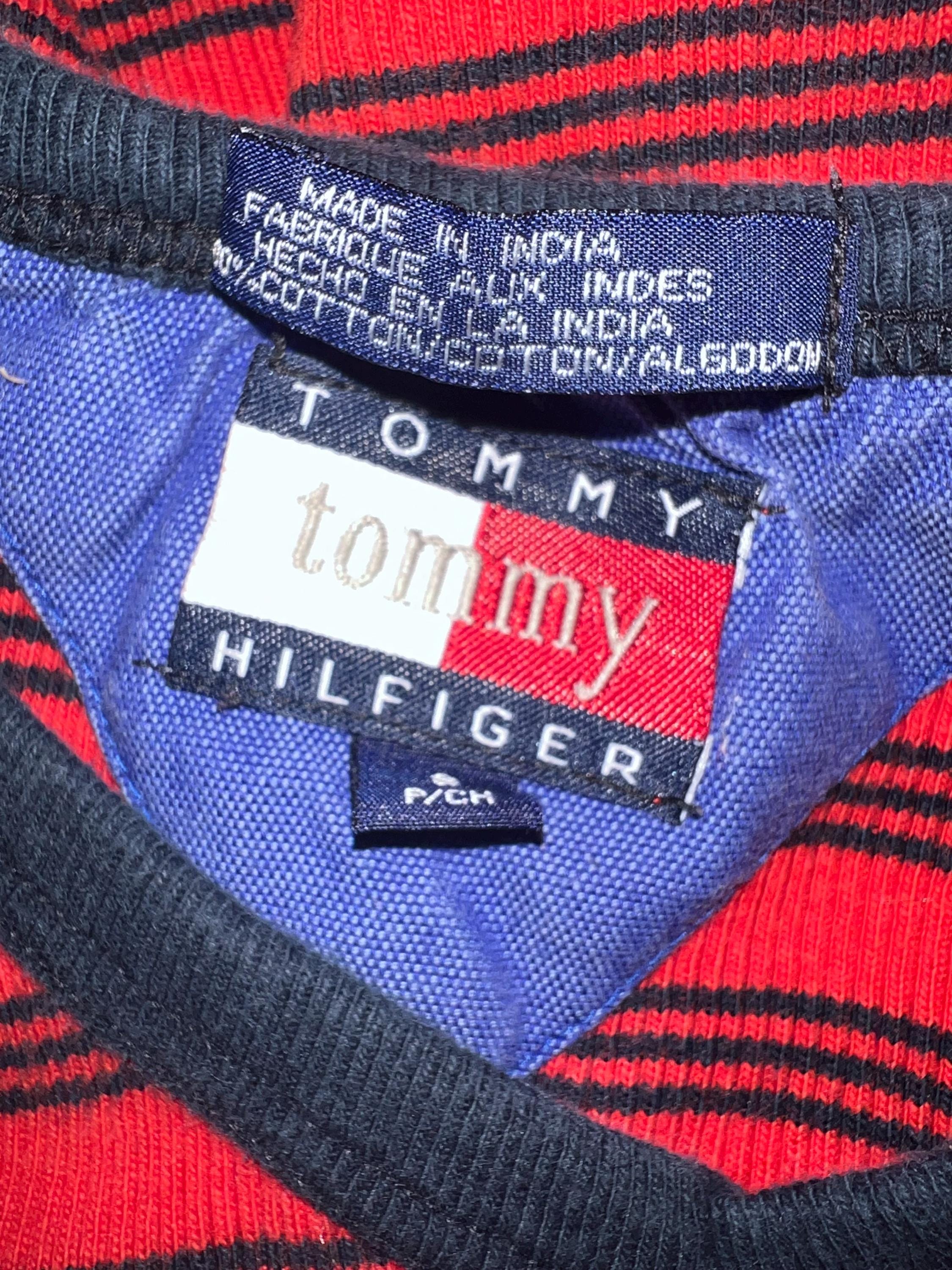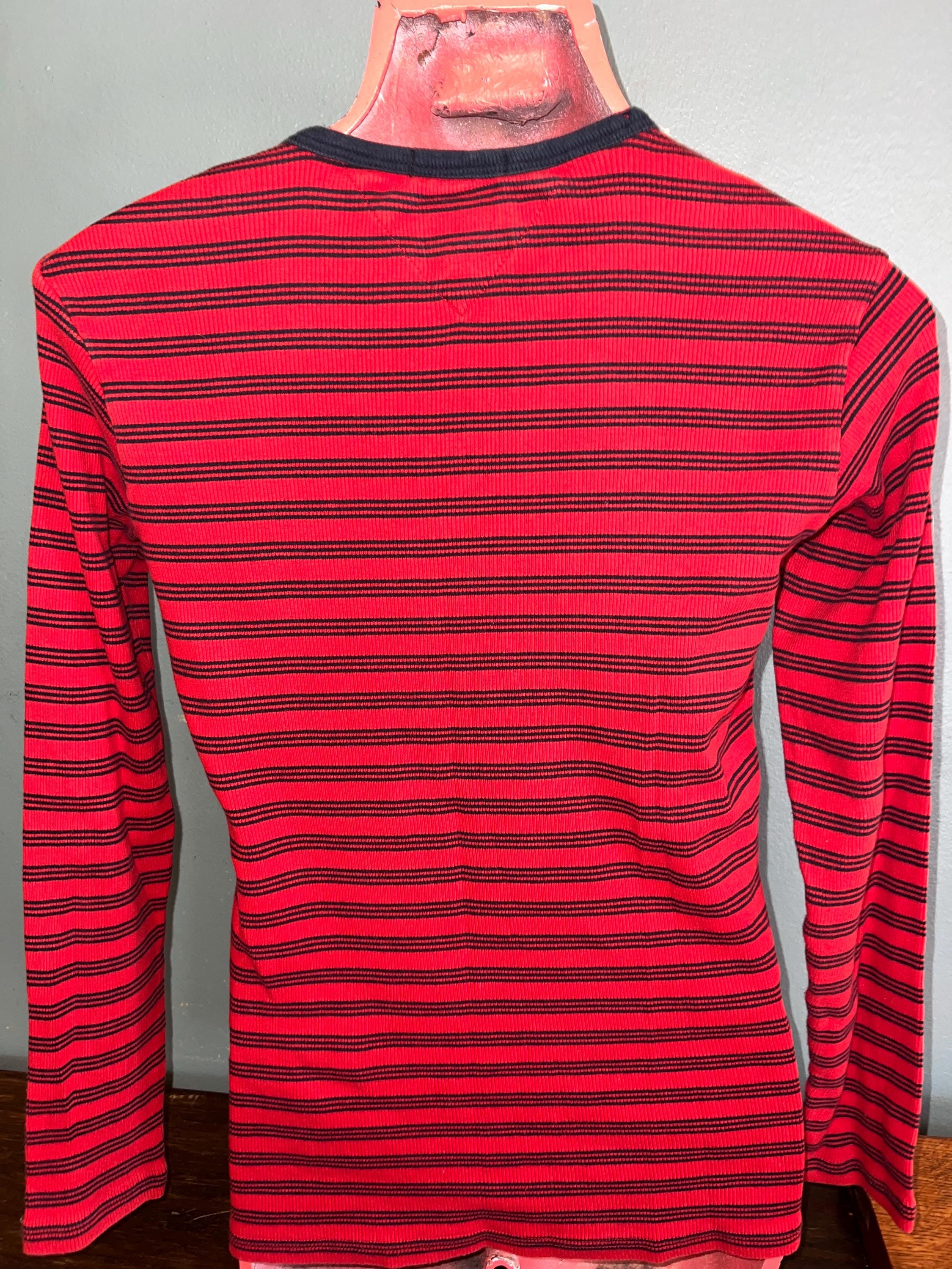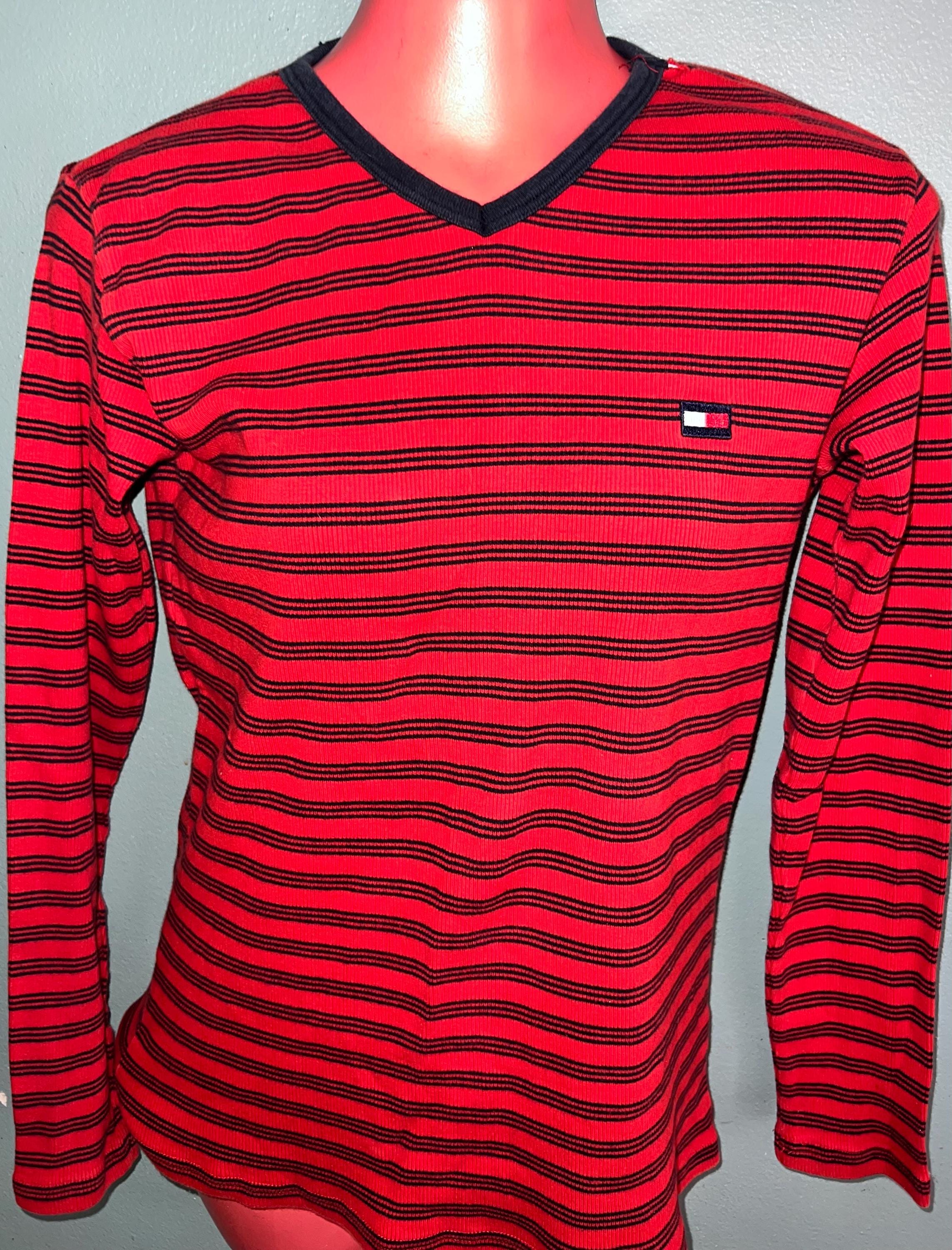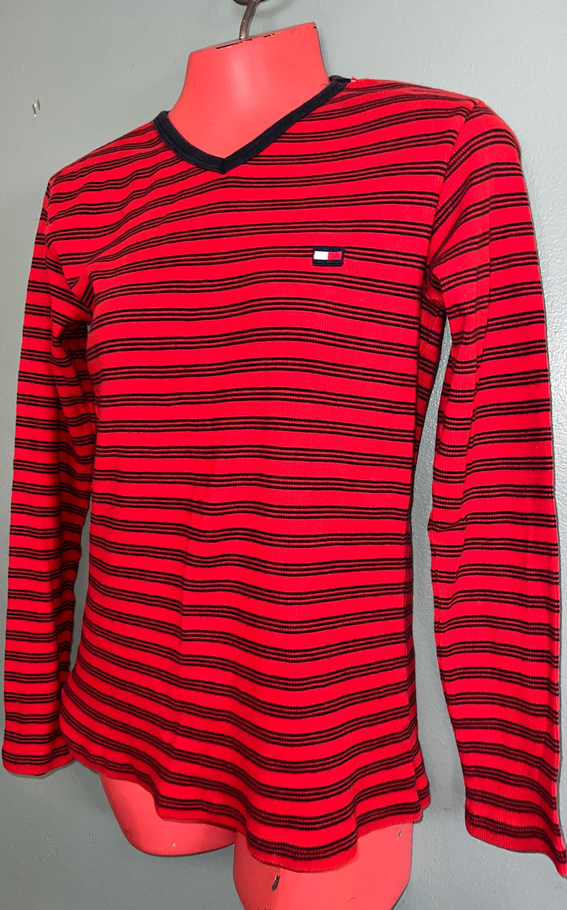 Super nice long sleeve womens stretchy red shirt with blue triple stripes Tommy Hilfiger shirt. It’s in good vintage condition!