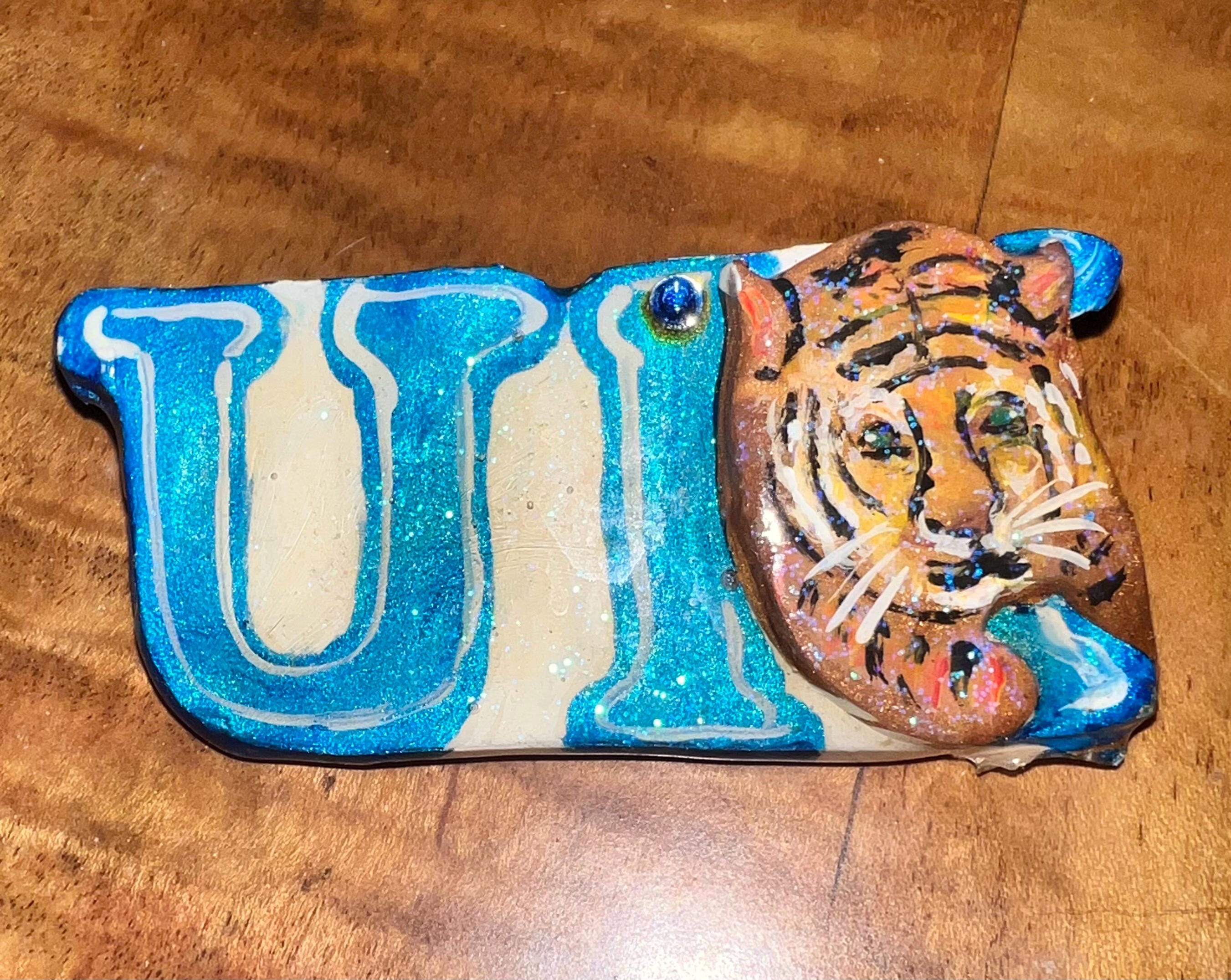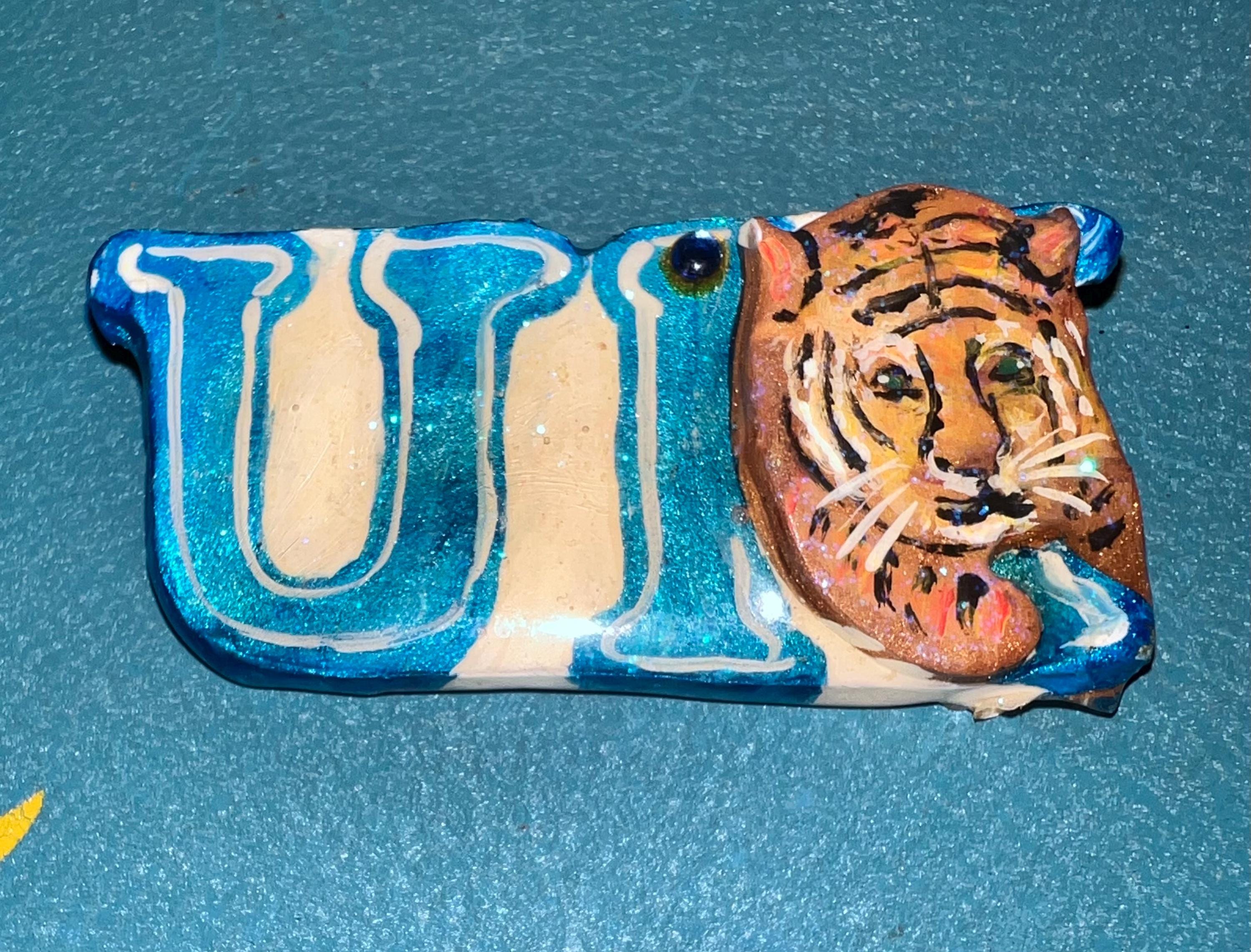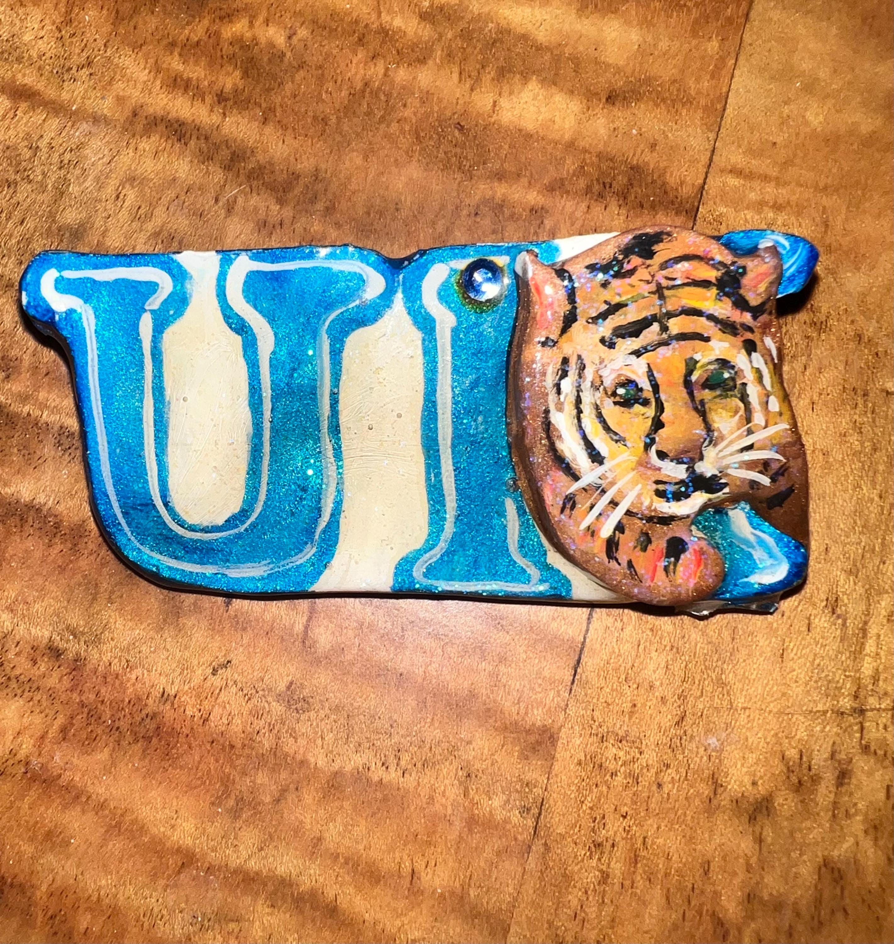 I love this UK (University of Kentucky) handmade brooch. It’s made from plaster or some other material and has a little blue gemstone up at the top. It also has a nice shine that glistens. It is in good vintage condition.