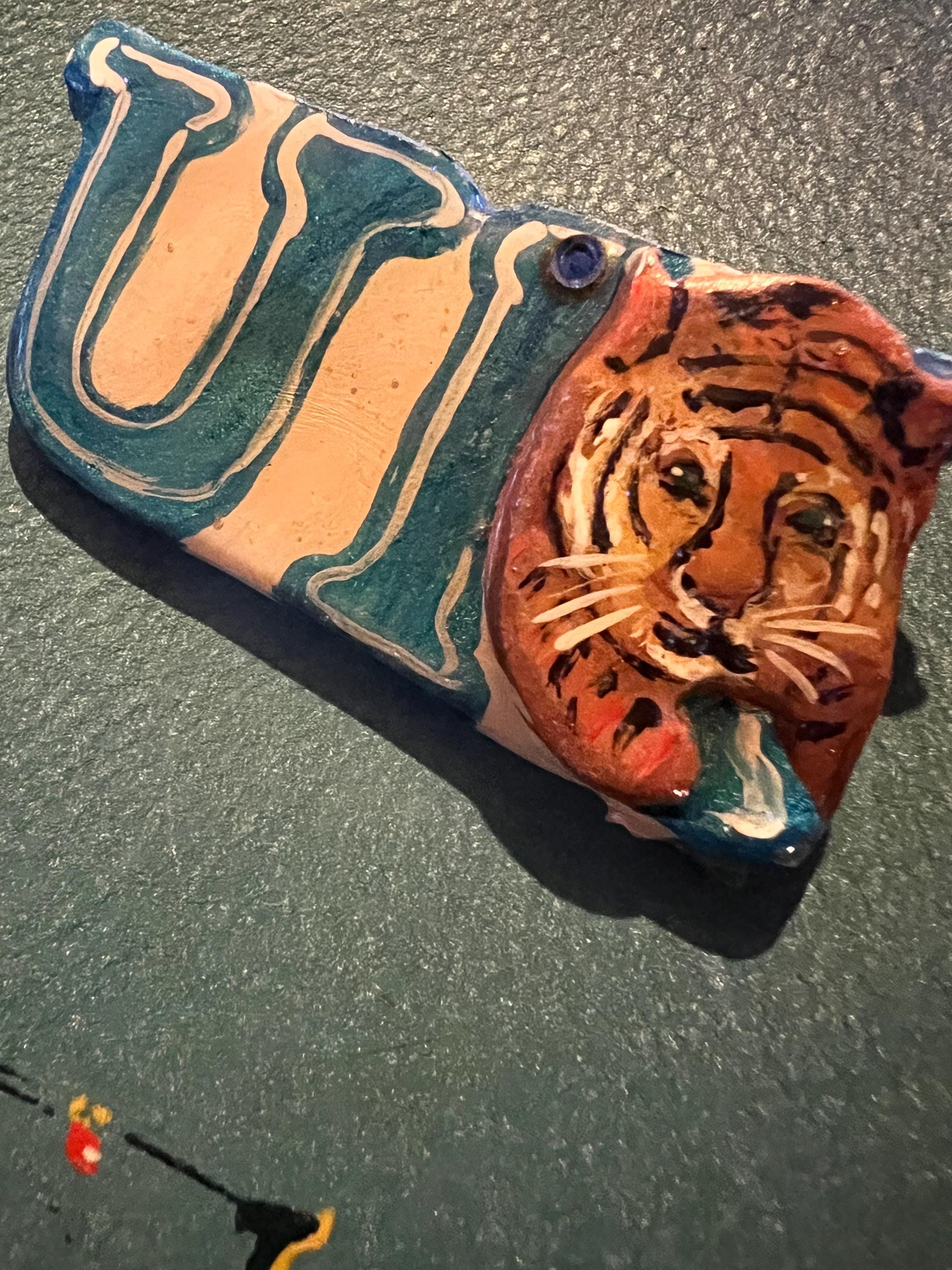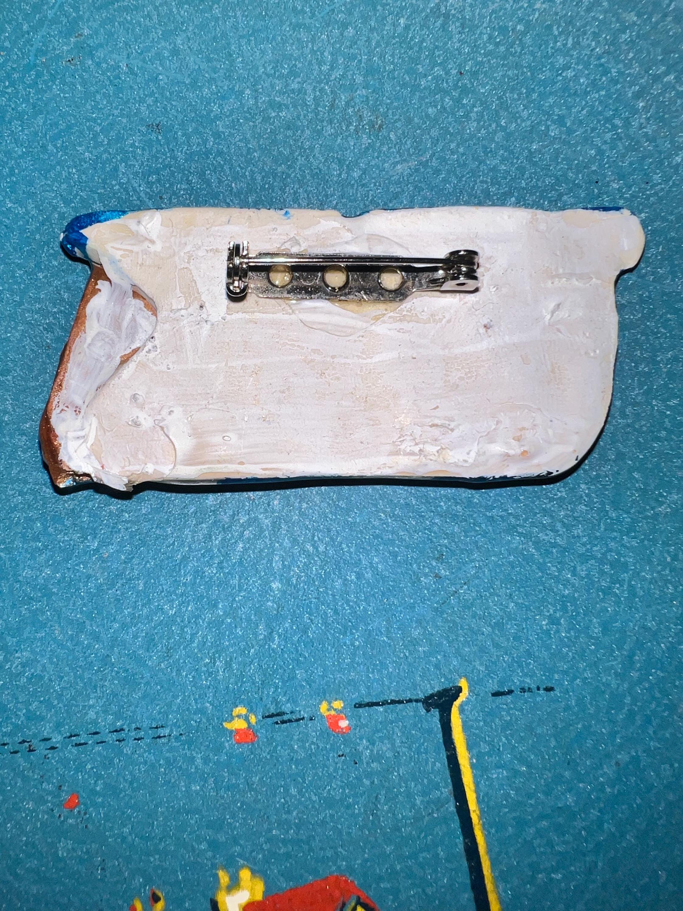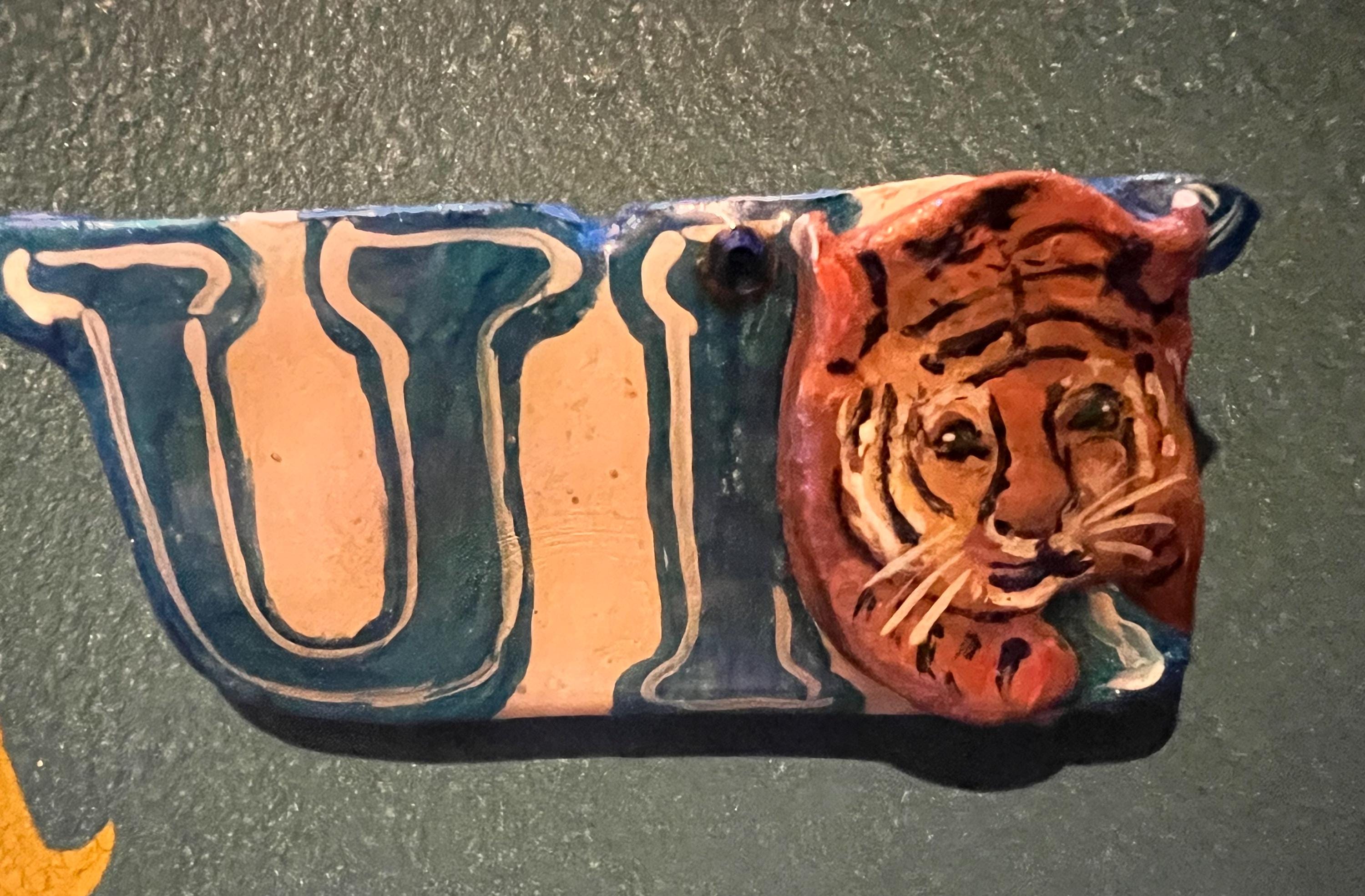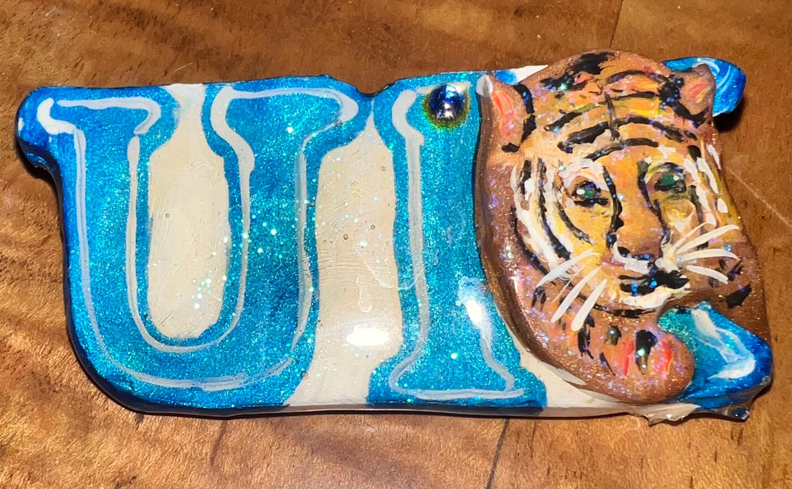 I love this UK (University of Kentucky) handmade brooch. It’s made from plaster or some other material and has a little blue gemstone up at the top. It also has a nice shine that glistens. It is in good vintage condition.