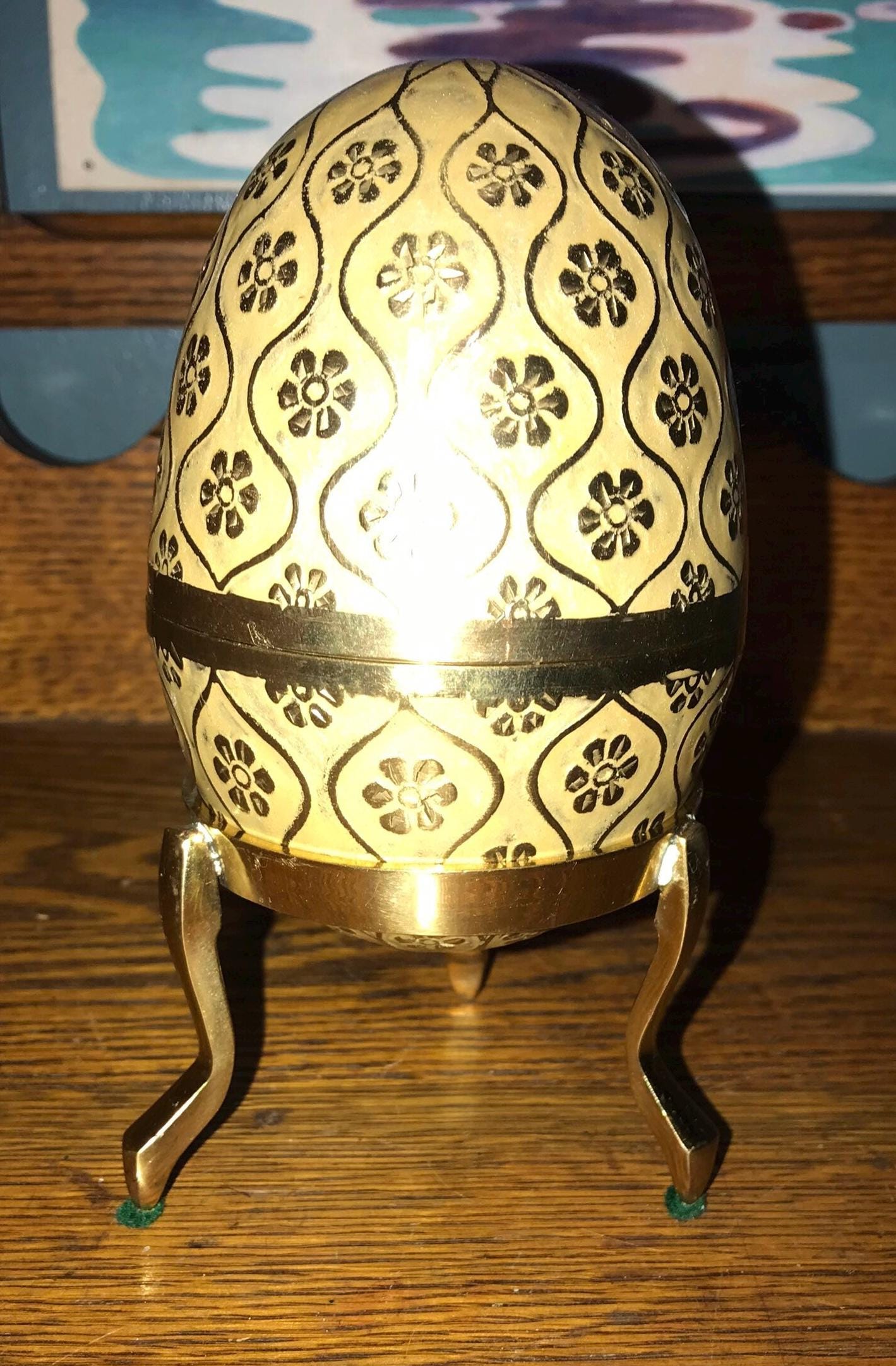This is a heavy brass and enamel egg that opens up but does not sit on its own. It has a brass stand it sits in! it’s in good vintage condition.