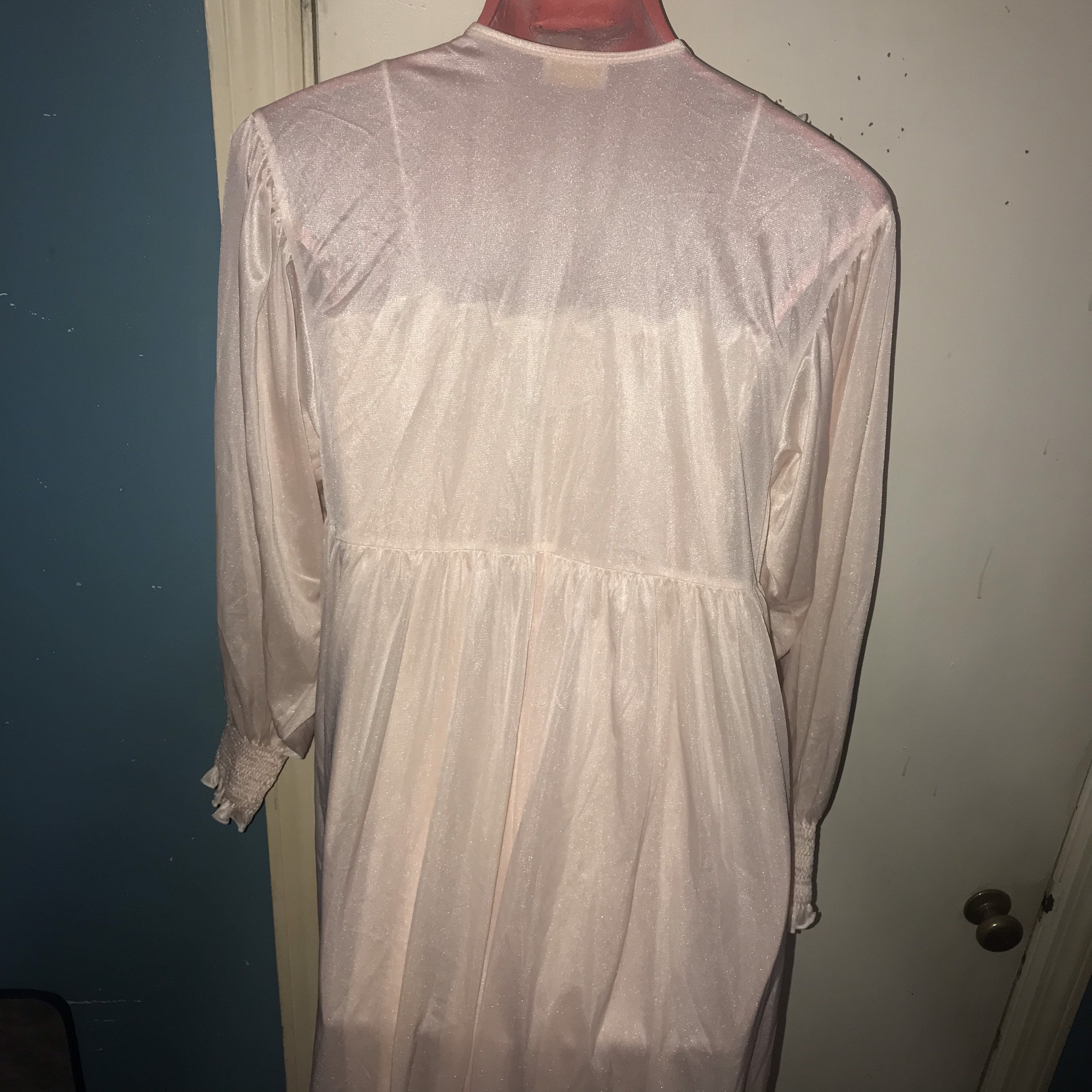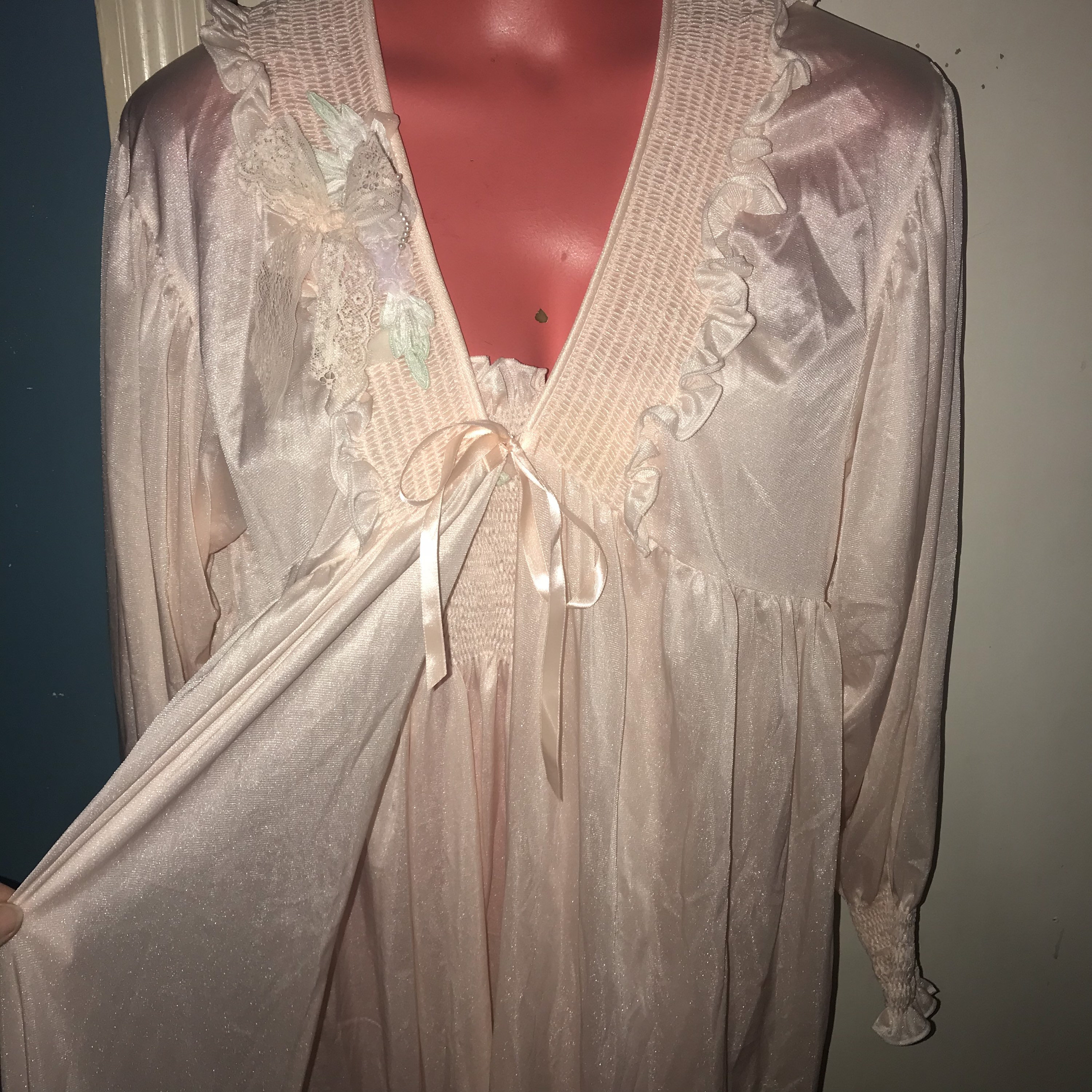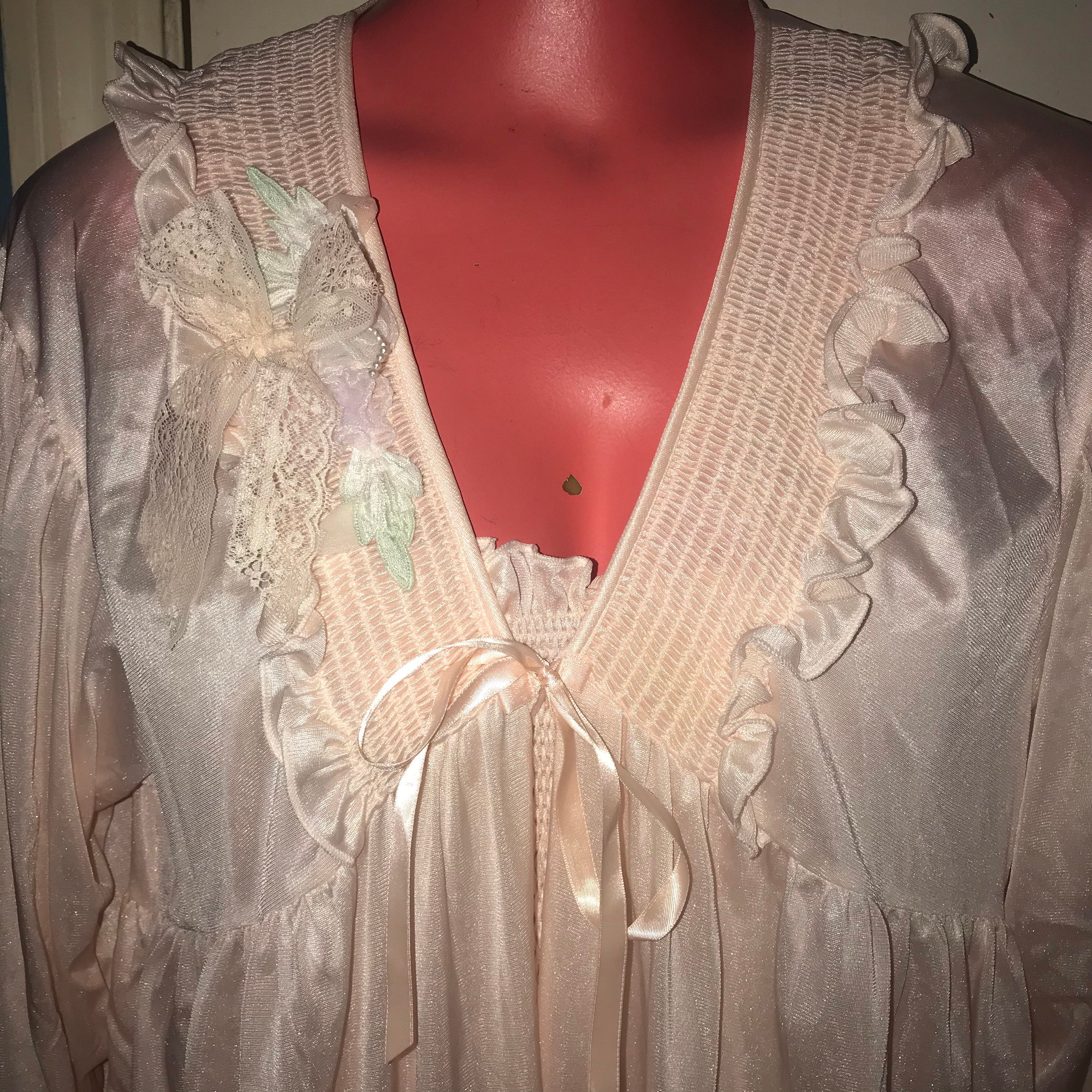 This is a really pretty 1970’s nylon peignoir set, made by Angelica by Cinzia. It’s a long baby pink nightgown with a very cool cut along the bottom and a matching robe/dressing gown. It is a super cute set and in good vintage condition.