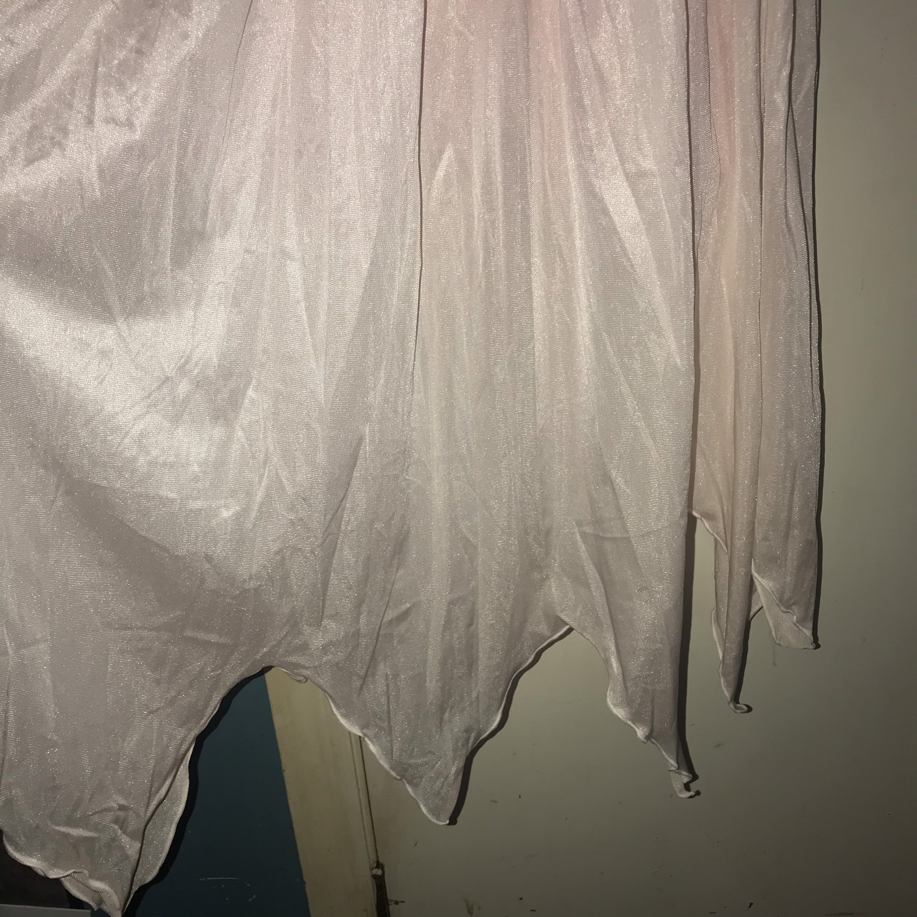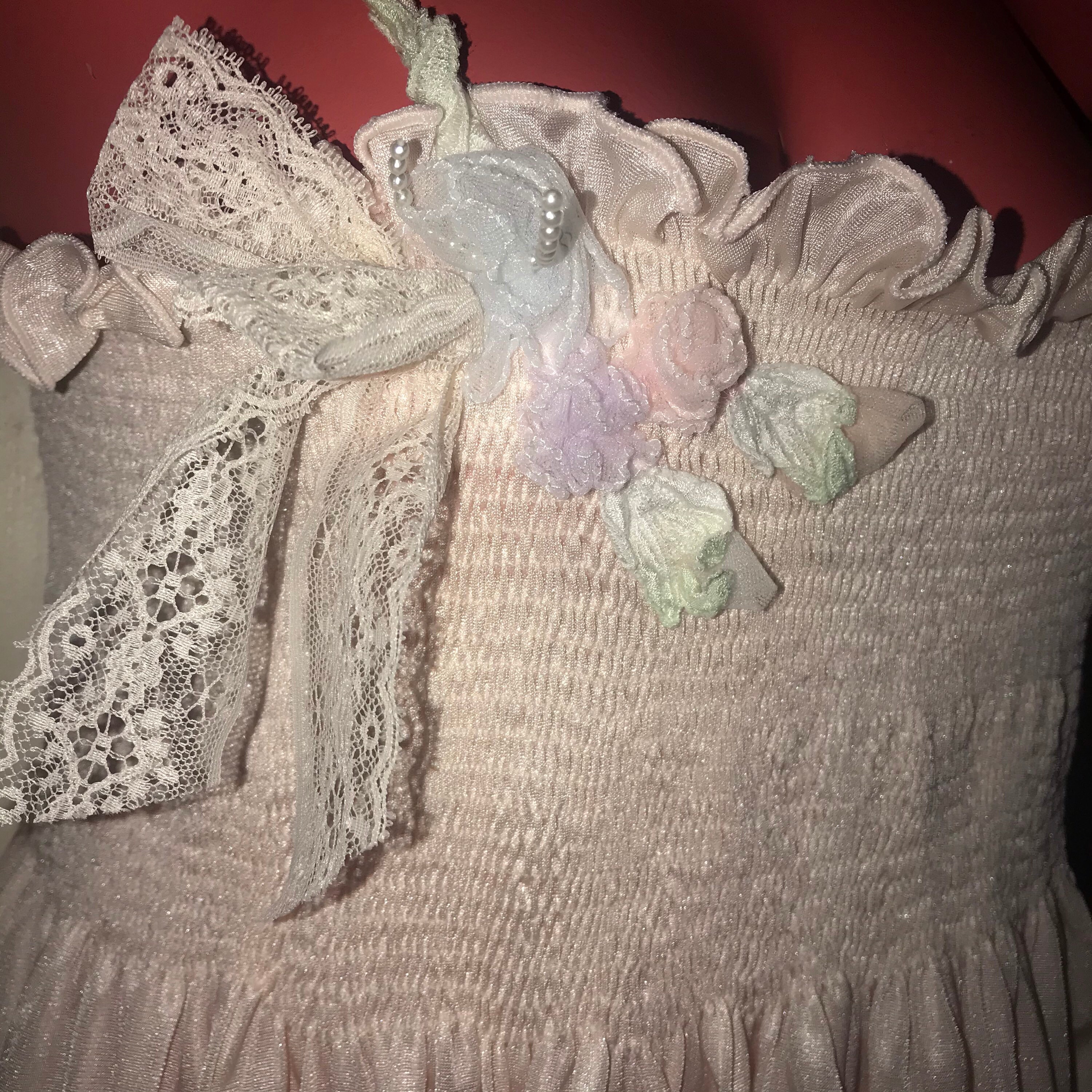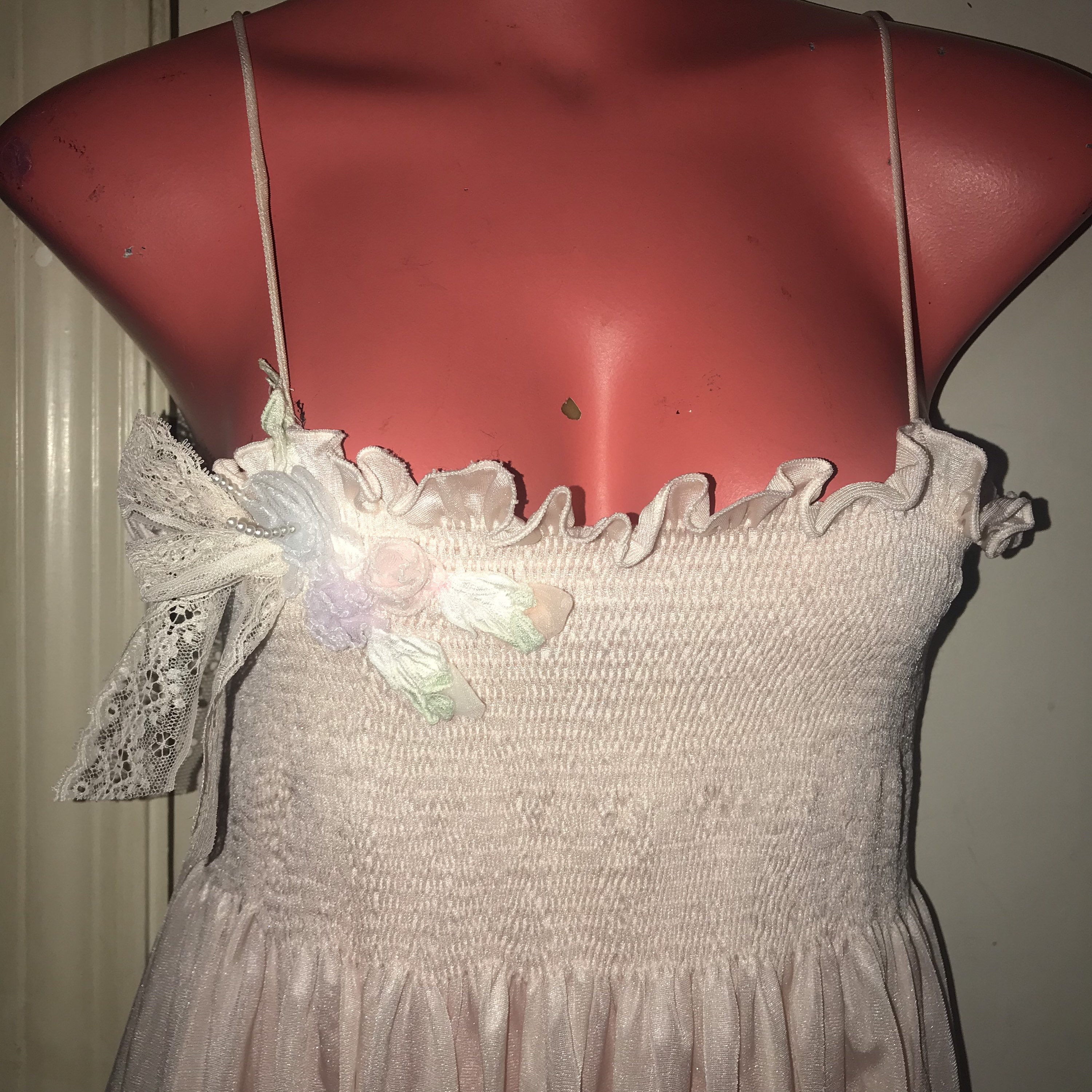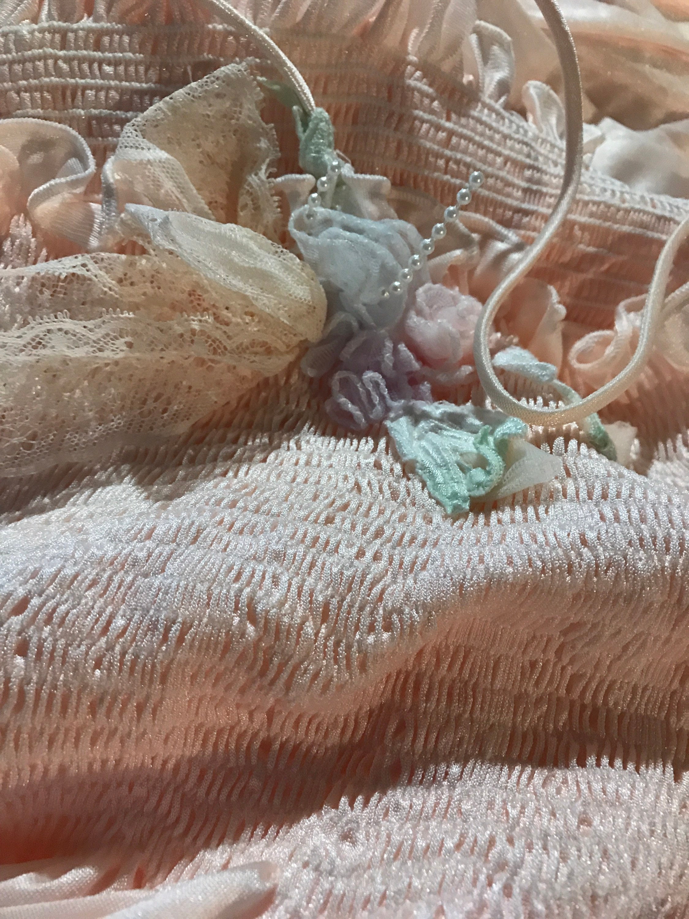 This is a really pretty 1970’s nylon peignoir set, made by Angelica by Cinzia. It’s a long baby pink nightgown with a very cool cut along the bottom and a matching robe/dressing gown. It is a super cute set and in good vintage condition.